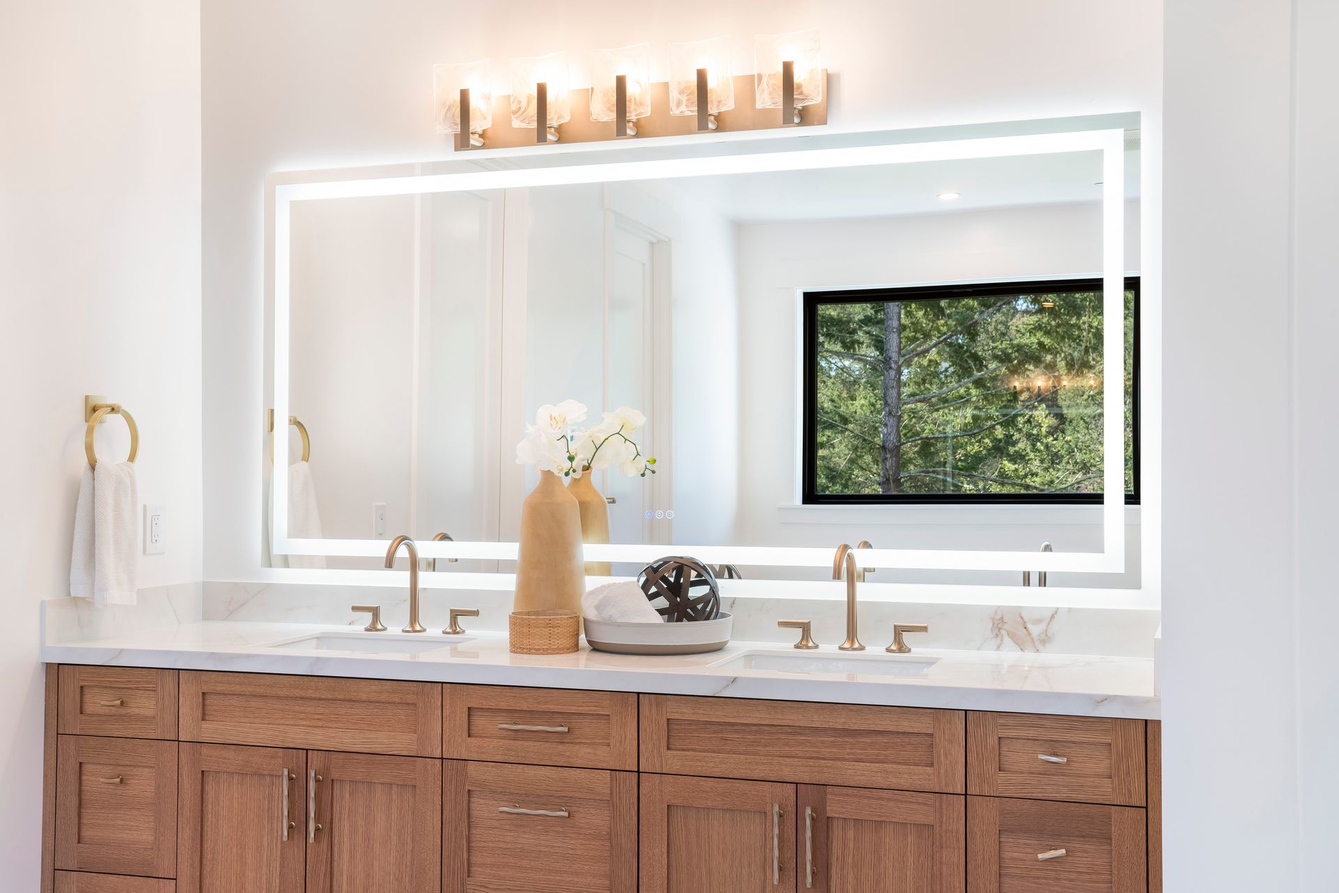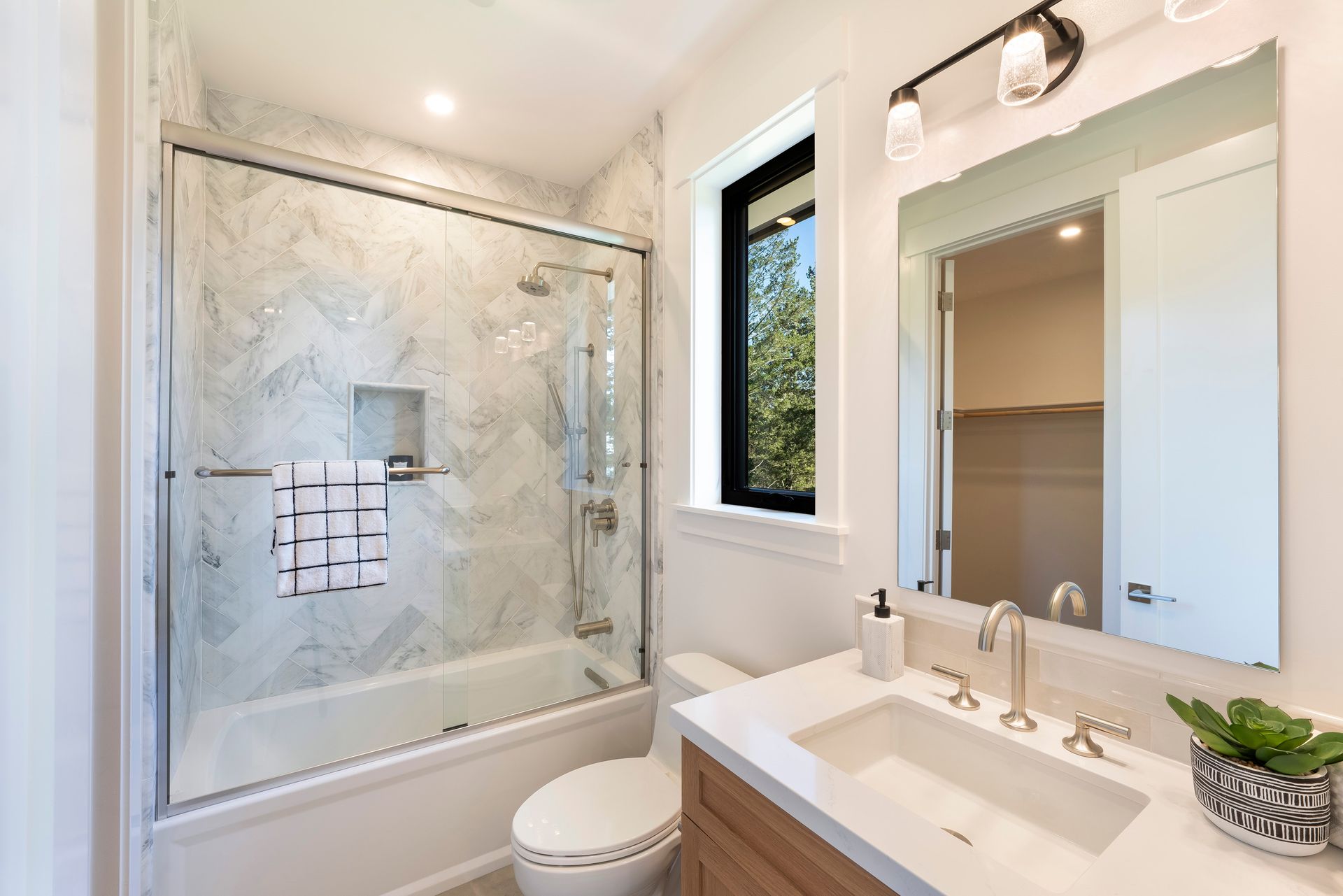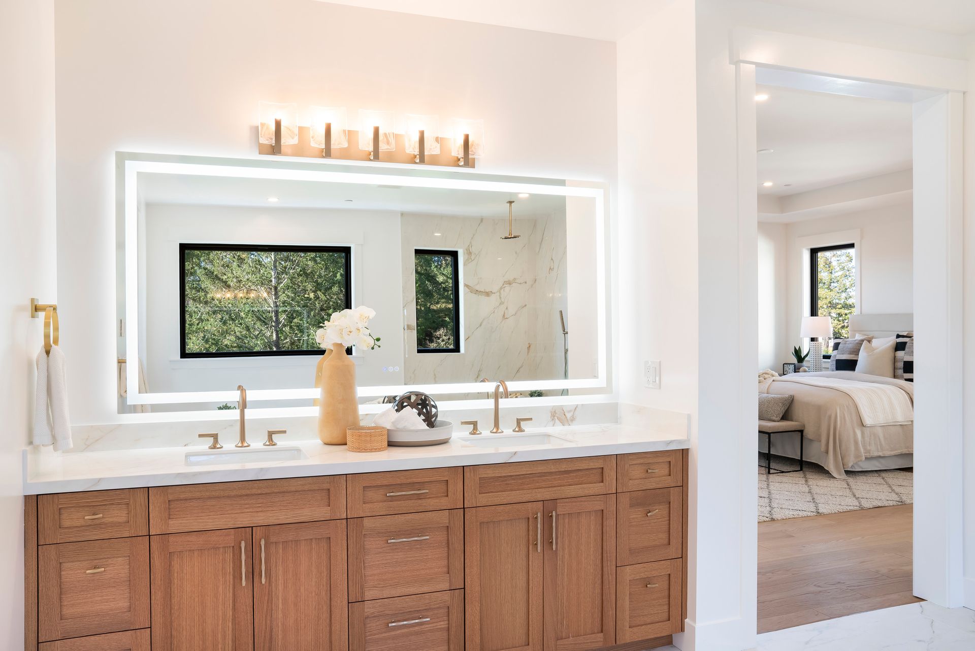 Primary bath with dual sinks, quartz counter, soaking tub, large shower stall with bench seating, dual rain heads and 2 handheld wands, heated tile floor through bathroom, walk-in closet, direct access to laundry room