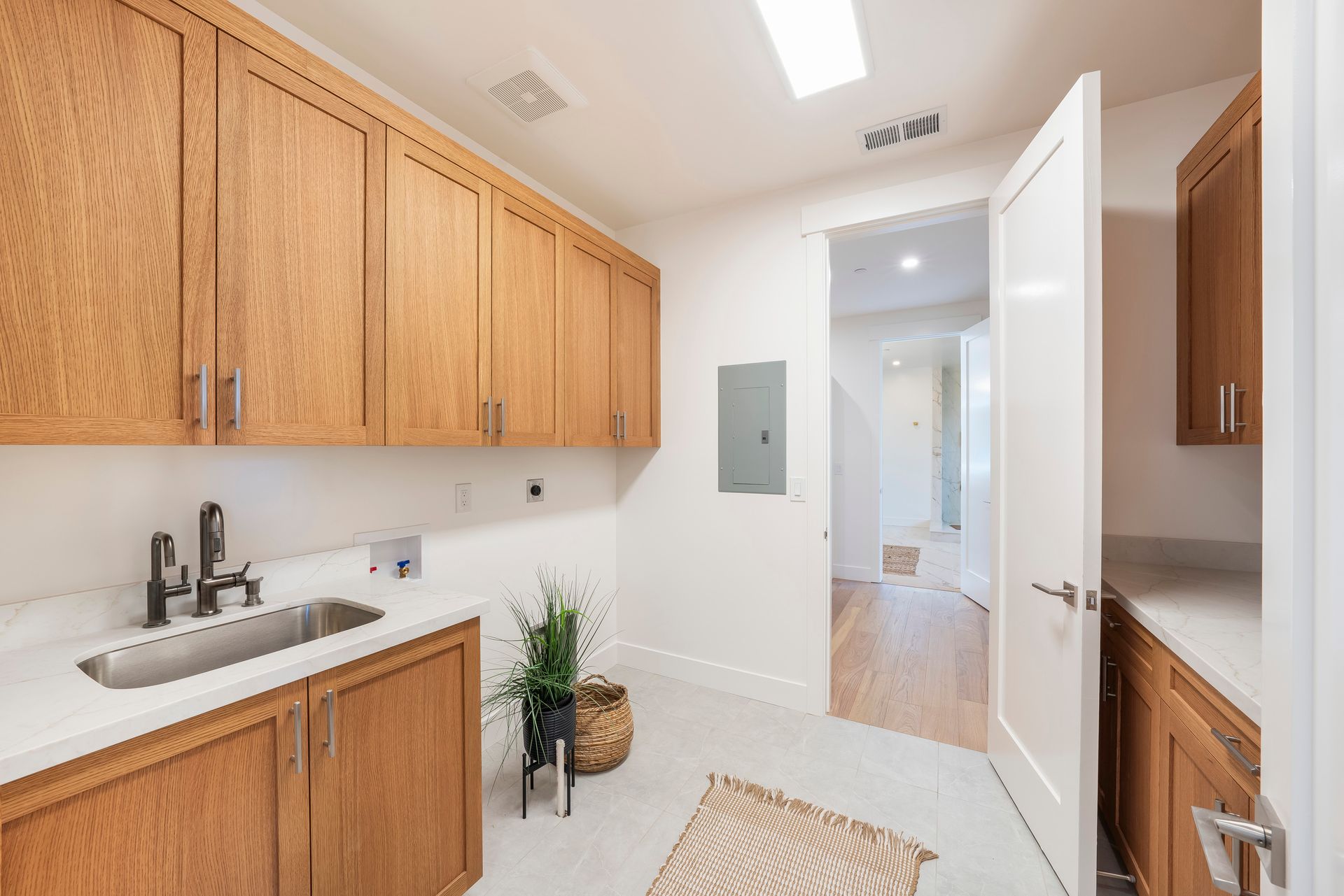 Upper level laundry room with wash basin, storage cabinets, folding counter and reverse osmosis water purification system