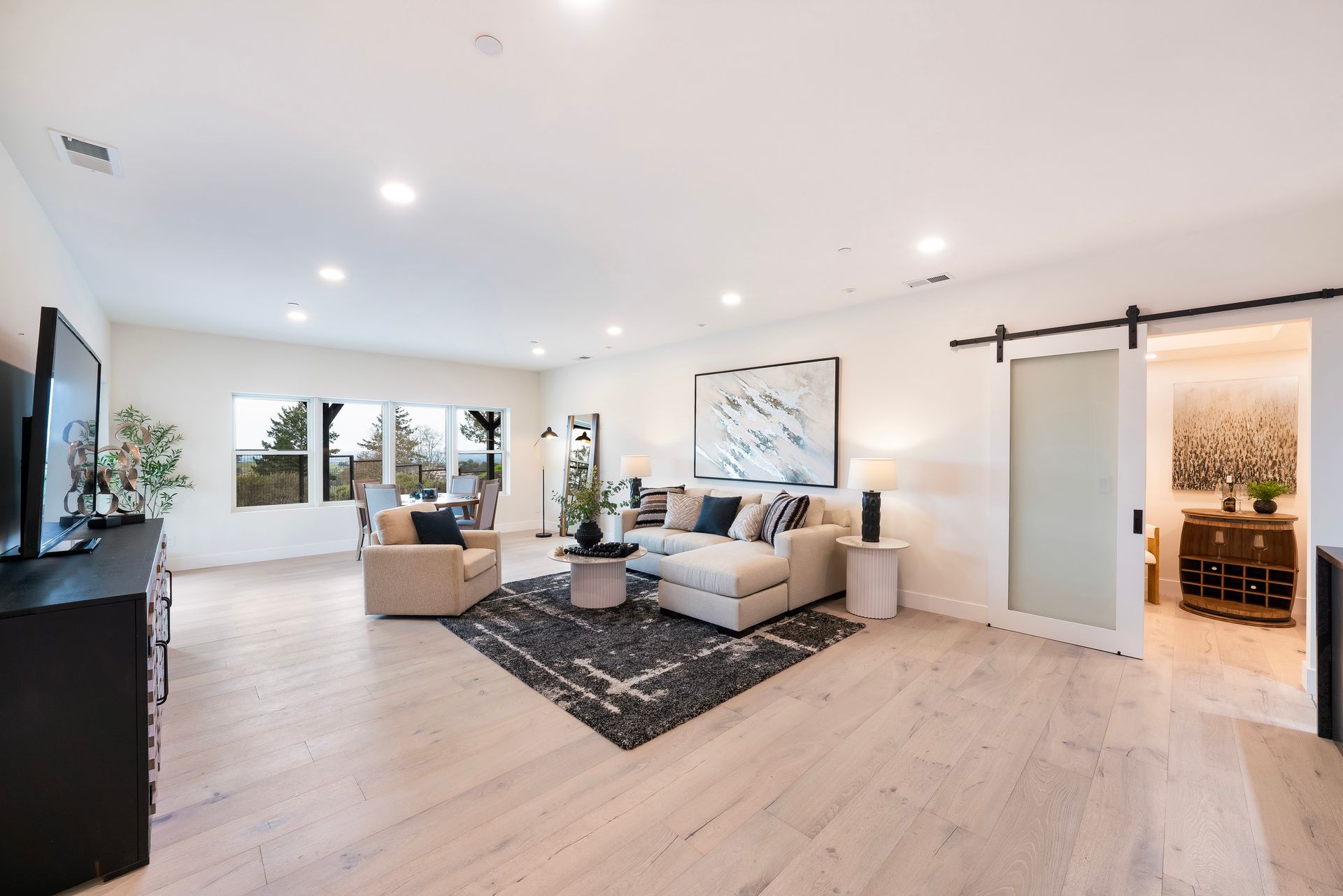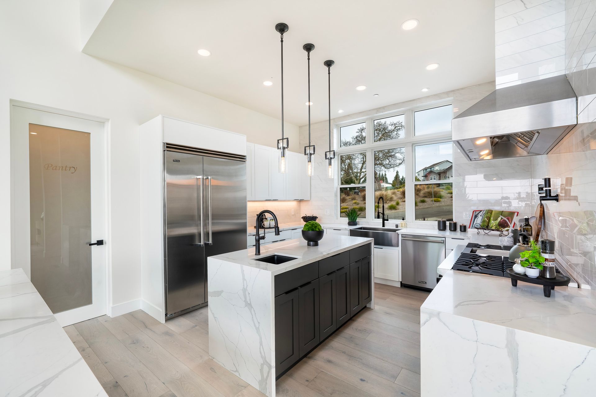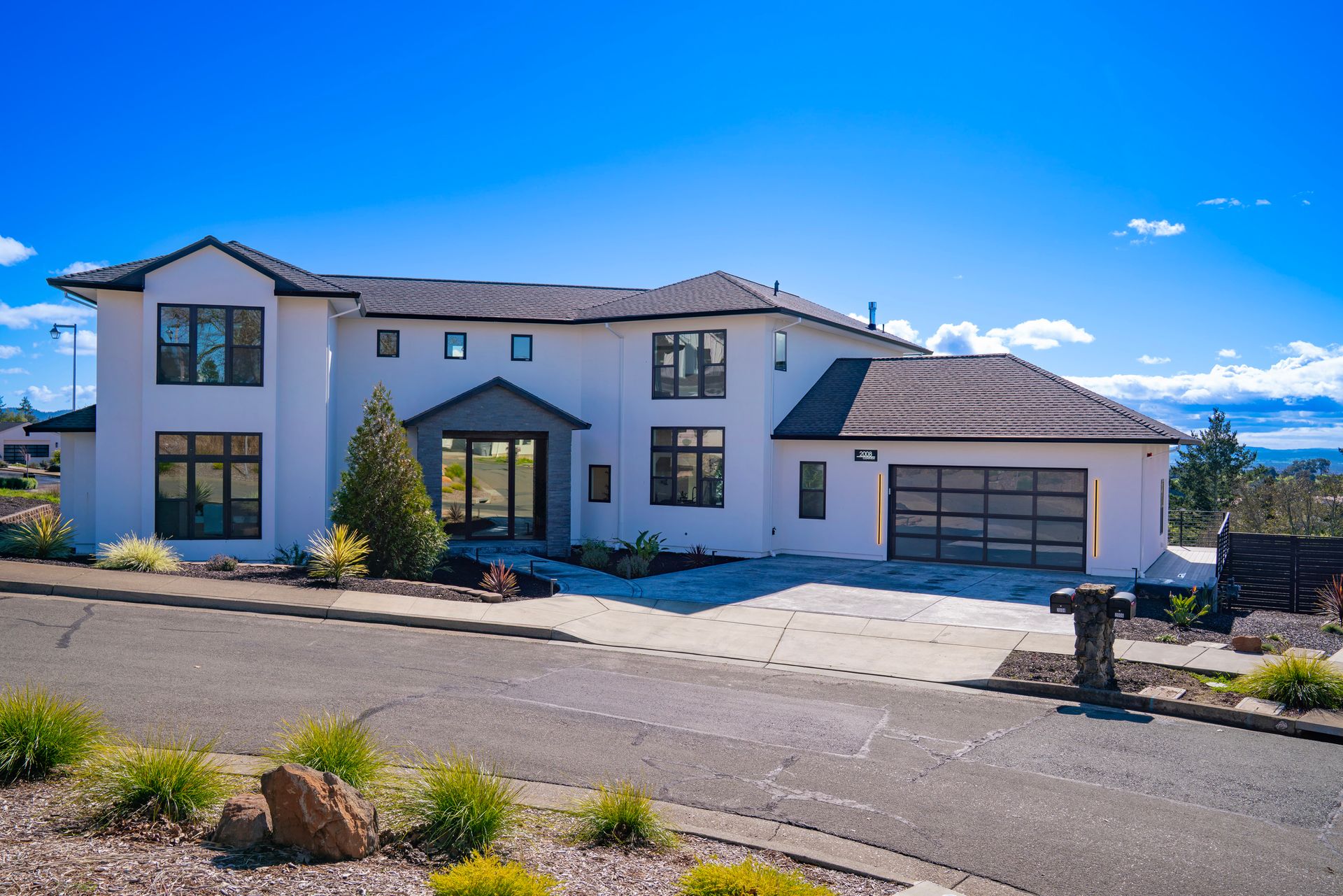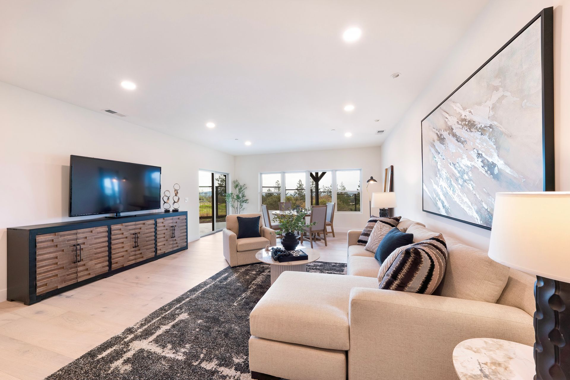 Situated in the sought-after Fountaingrove neighborhood, this modern home blends elegance, functionality, and high-end finishes. A striking glass front door opens to a dramatic formal entry, highlighted by a statement light fixture. The expansive great room features soaring ceilings, a sleek linear fireplace, and large sliders that extend to a deck with views of the open space beyond. The chef's kitchen is designed for both style and efficiency, featuring stone countertops, dual islands including one with a prep sink, a spacious walk-in pantry, and Viking appliances, including a 6-burner range with griddle, double ovens, and a pot filler. A formal dining area sits adjacent, perfect for entertaining. The primary suite offers deck access, a generous walk-in closet with a dressing mirror, and a spa-like ensuite bath complete with a soaking tub, multi-head shower, dual sinks, and radiant heated floors. An additional light-filled bedroom or office with its own bathroom completes this level. Upstairs you'll find two additional ensuite bedrooms. The lower level features a spacious family room with a wet bar, backyard access, a workout room, a full bath, and ample built-in storage. This home is an exceptional opportunity in one of Santa Rosa's premier communities.