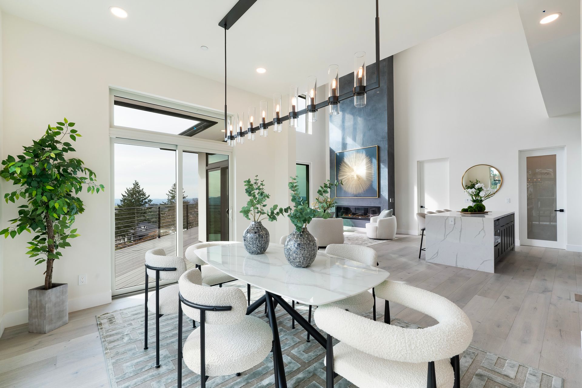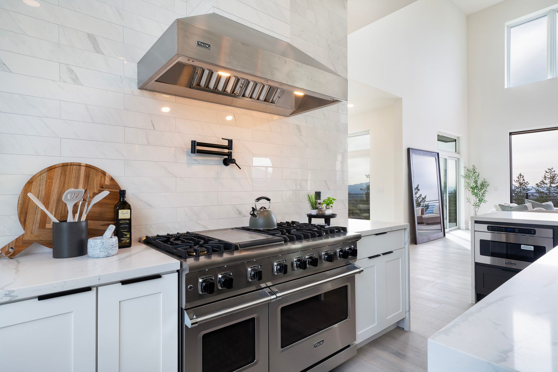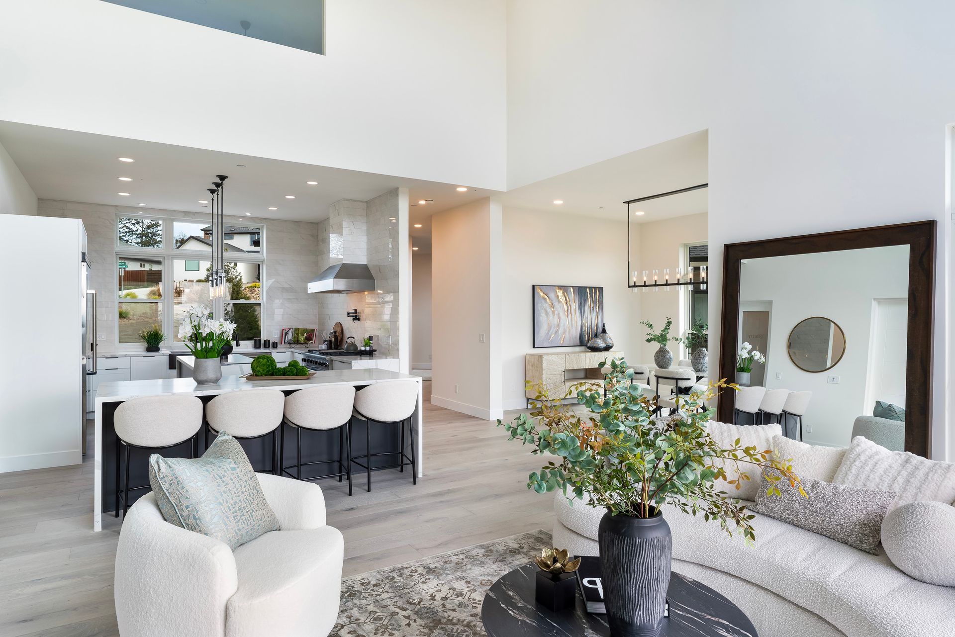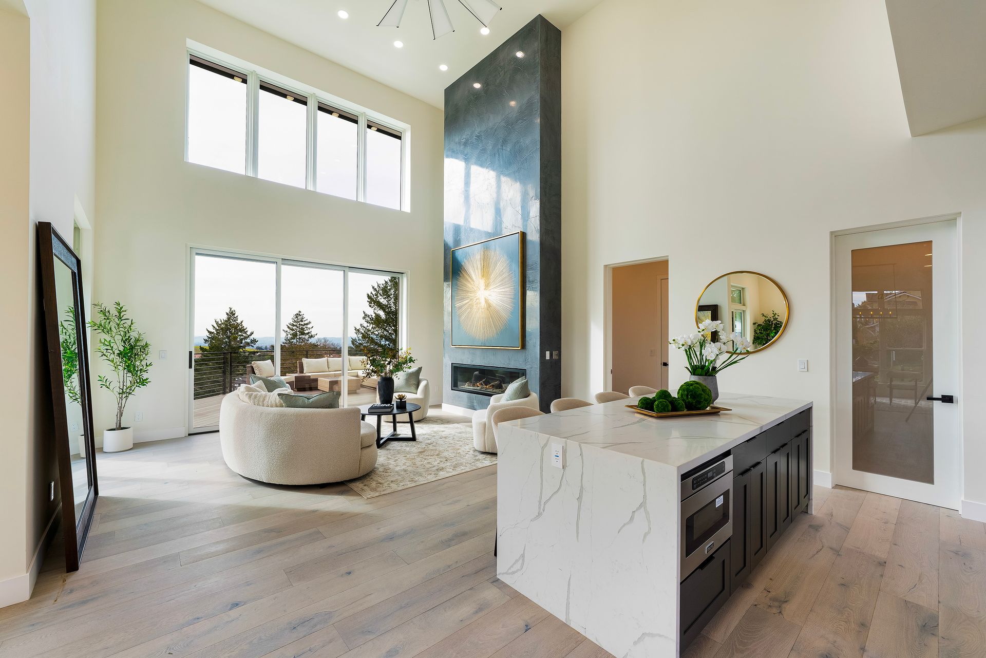 Situated in the sought-after Fountaingrove neighborhood, this modern home blends elegance, functionality, and high-end finishes. A striking glass front door opens to a dramatic formal entry, highlighted by a statement light fixture. The expansive great room features soaring ceilings, a sleek linear fireplace, and large sliders that extend to a deck with views of the open space beyond. The chef's kitchen is designed for both style and efficiency, featuring stone countertops, dual islands including one with a prep sink, a spacious walk-in pantry, and Viking appliances, including a 6-burner range with griddle, double ovens, and a pot filler. A formal dining area sits adjacent, perfect for entertaining. The primary suite offers deck access, a generous walk-in closet with a dressing mirror, and a spa-like ensuite bath complete with a soaking tub, multi-head shower, dual sinks, and radiant heated floors. An additional light-filled bedroom or office with its own bathroom completes this level. Upstairs you'll find two additional ensuite bedrooms. The lower level features a spacious family room with a wet bar, backyard access, a workout room, a full bath, and ample built-in storage. This home is an exceptional opportunity in one of Santa Rosa's premier communities.