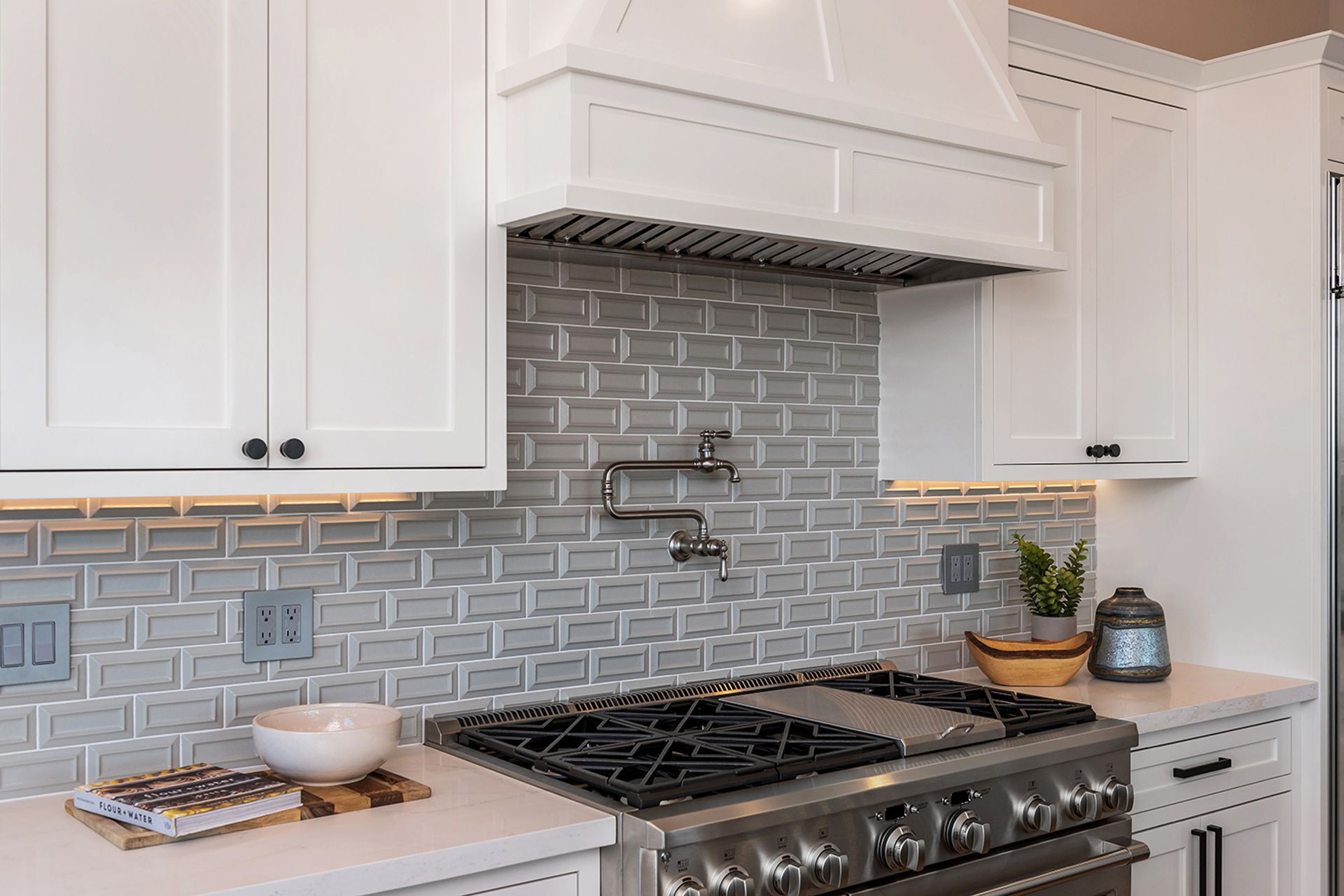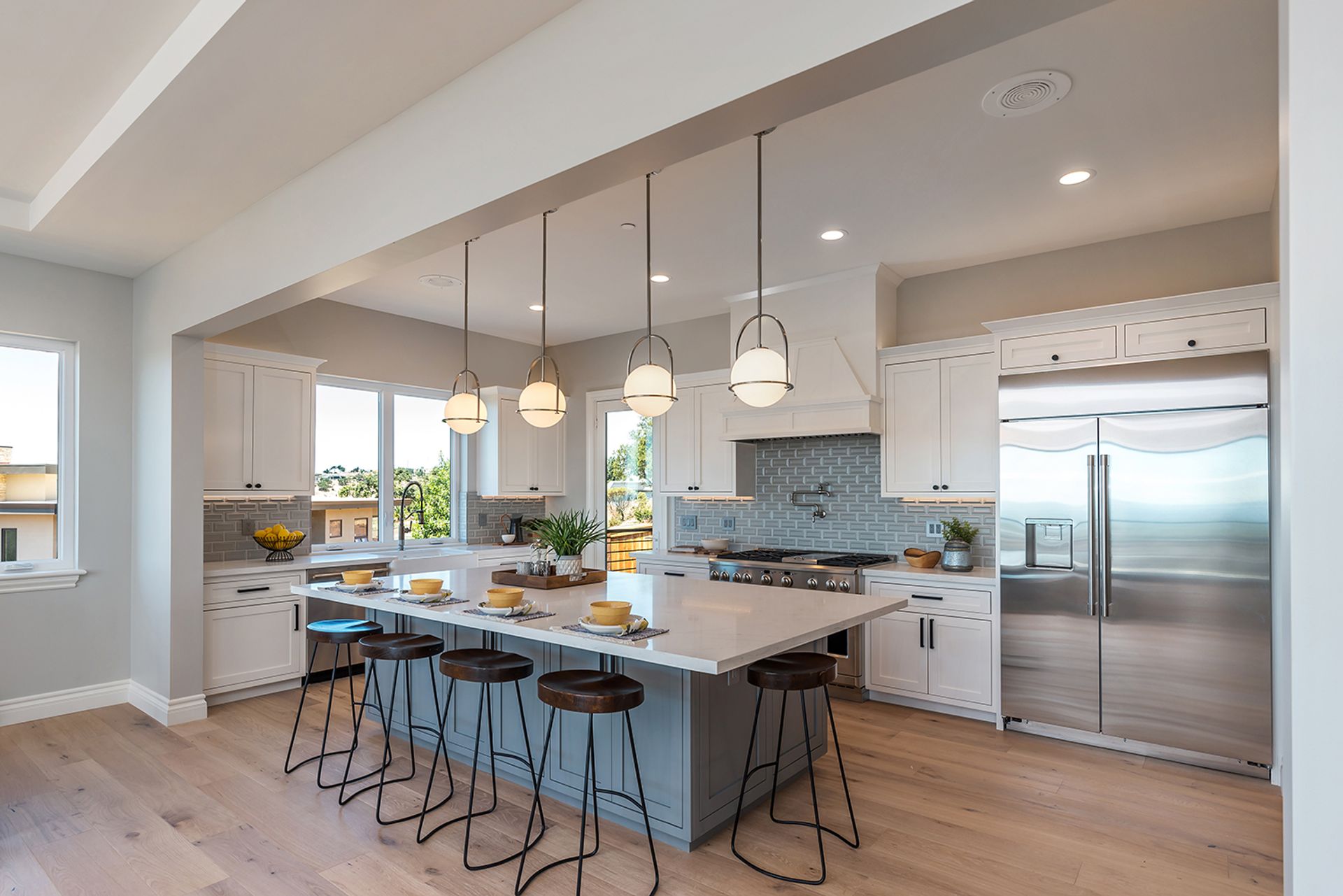 Kitchen boasts Calacatta Alto quartz stone counters, center island with breakfast bar, built-in refrigerator, Monogram 6 burner gas range with griddle, pot filler faucet, hood over range, Monogram dishwasher, Monogram microwave drawer, farm style sink, soft close drawers and cabinets