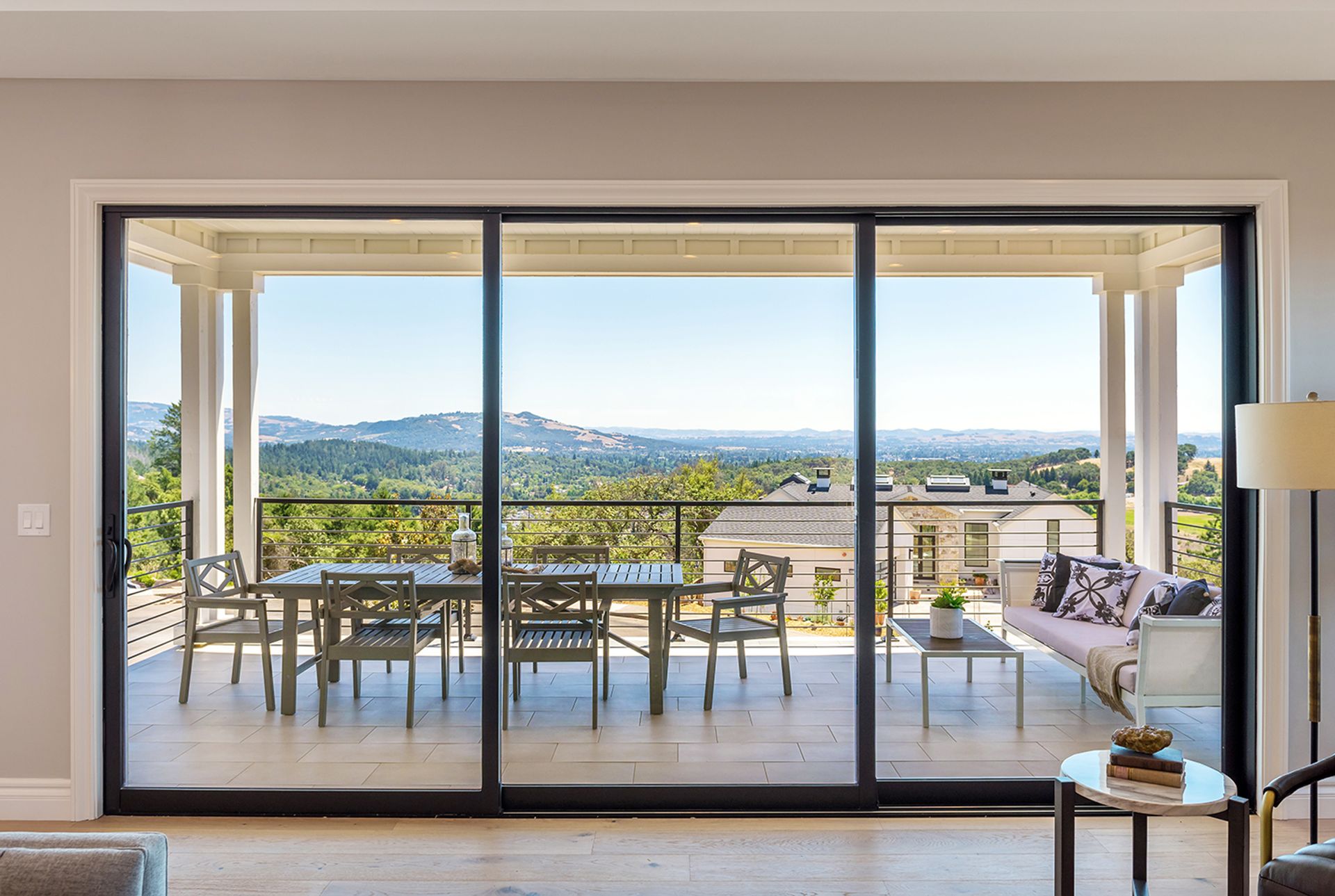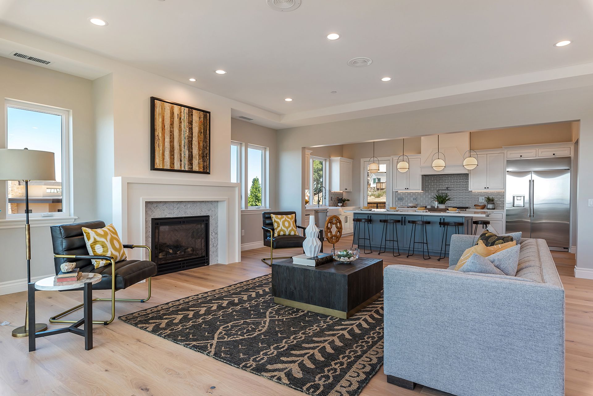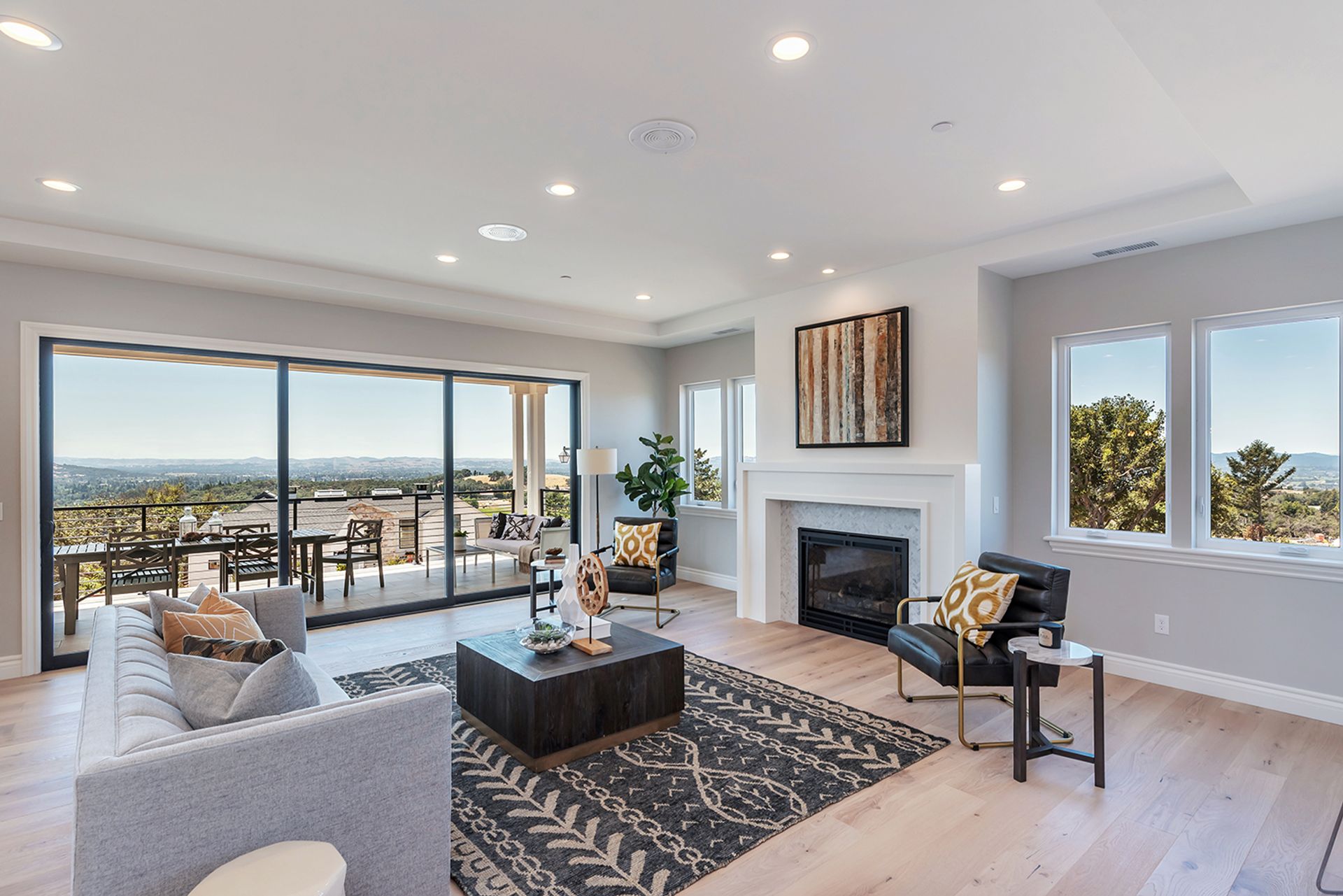 Great room with gas fireplace, hardwood flooring and expansive loggia with views