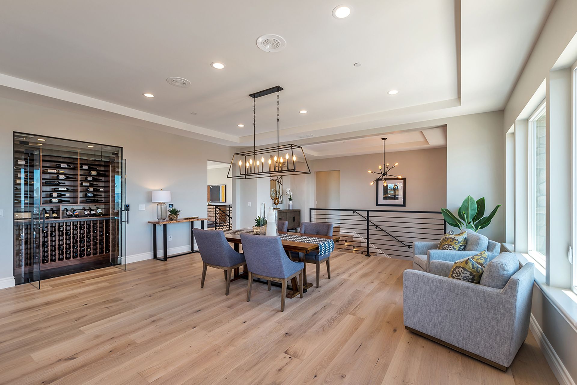 Open concept dining area has hardwood flooring and chic lighting fixture