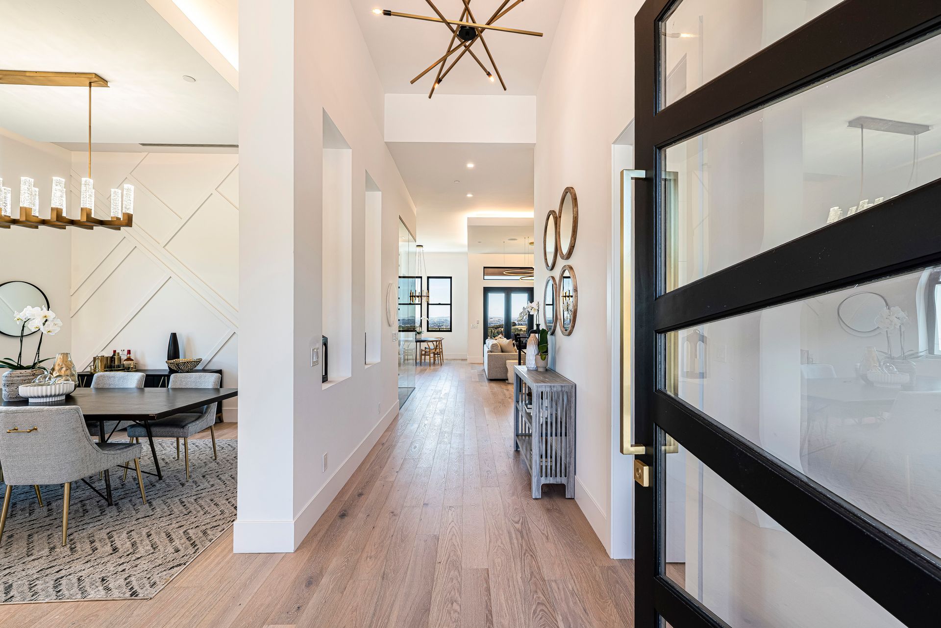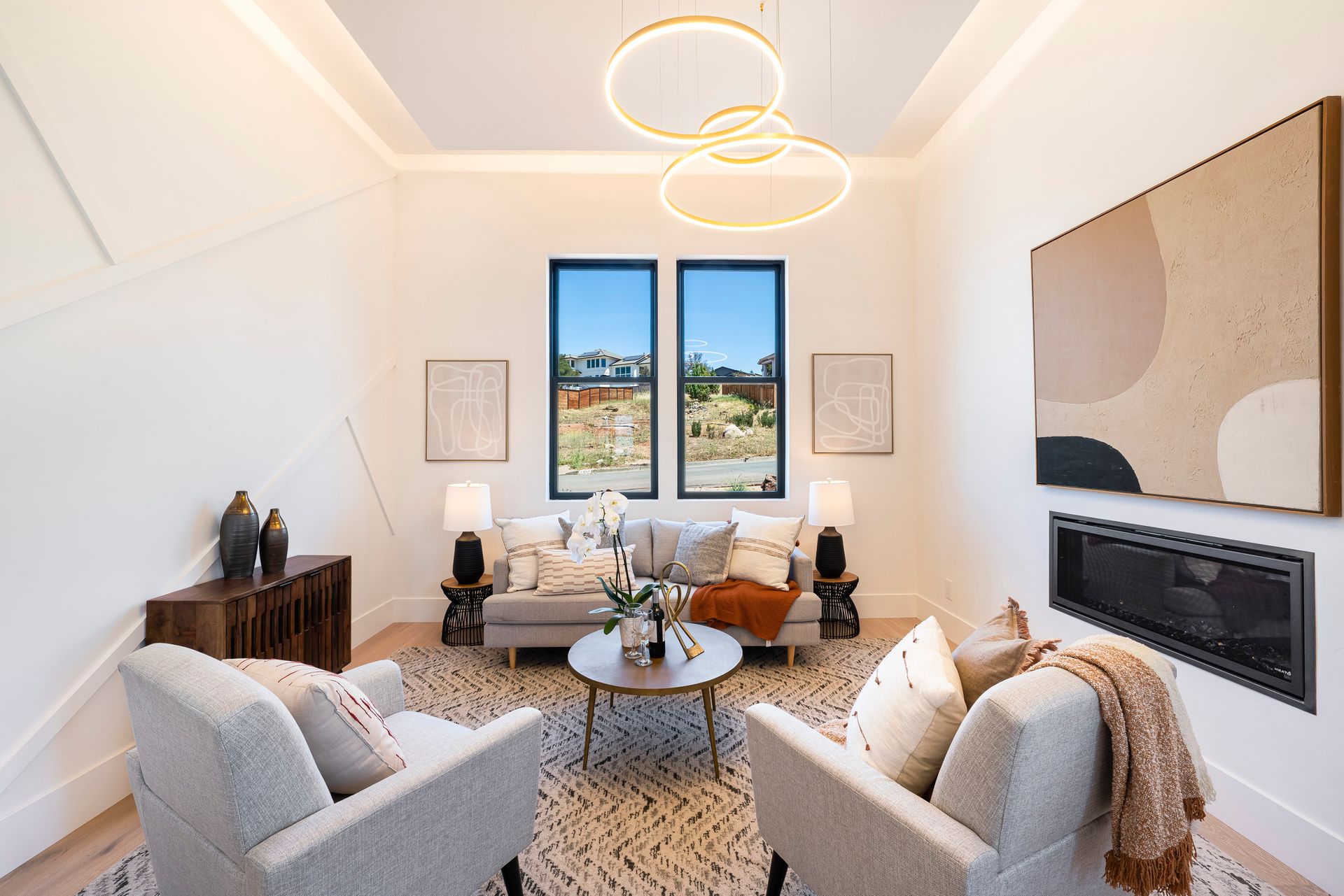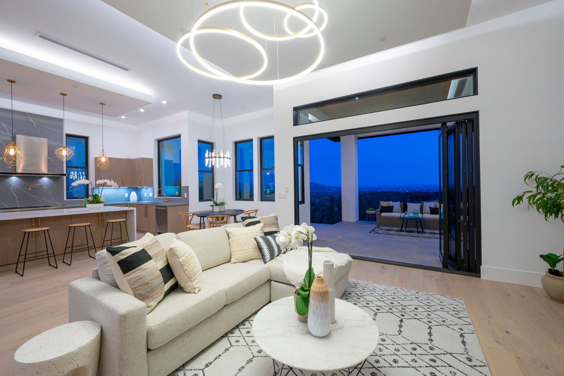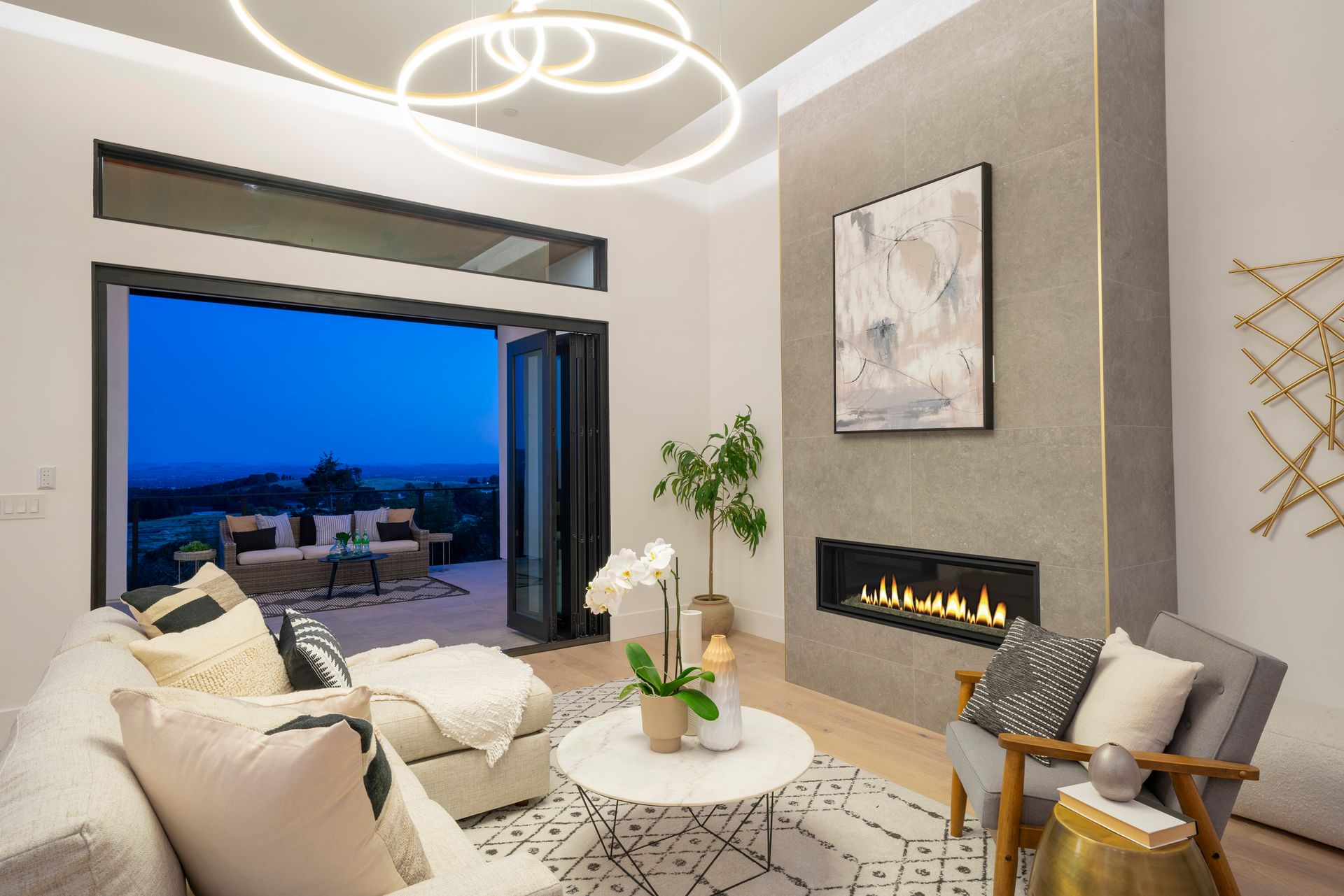 Great room living with 12’ ceiling and in-direct lighting, gas fireplace with floor to ceiling porcelain surround, hardwood flooring and folding doors to the view terrace includes gas fireplace for intimate gatherings