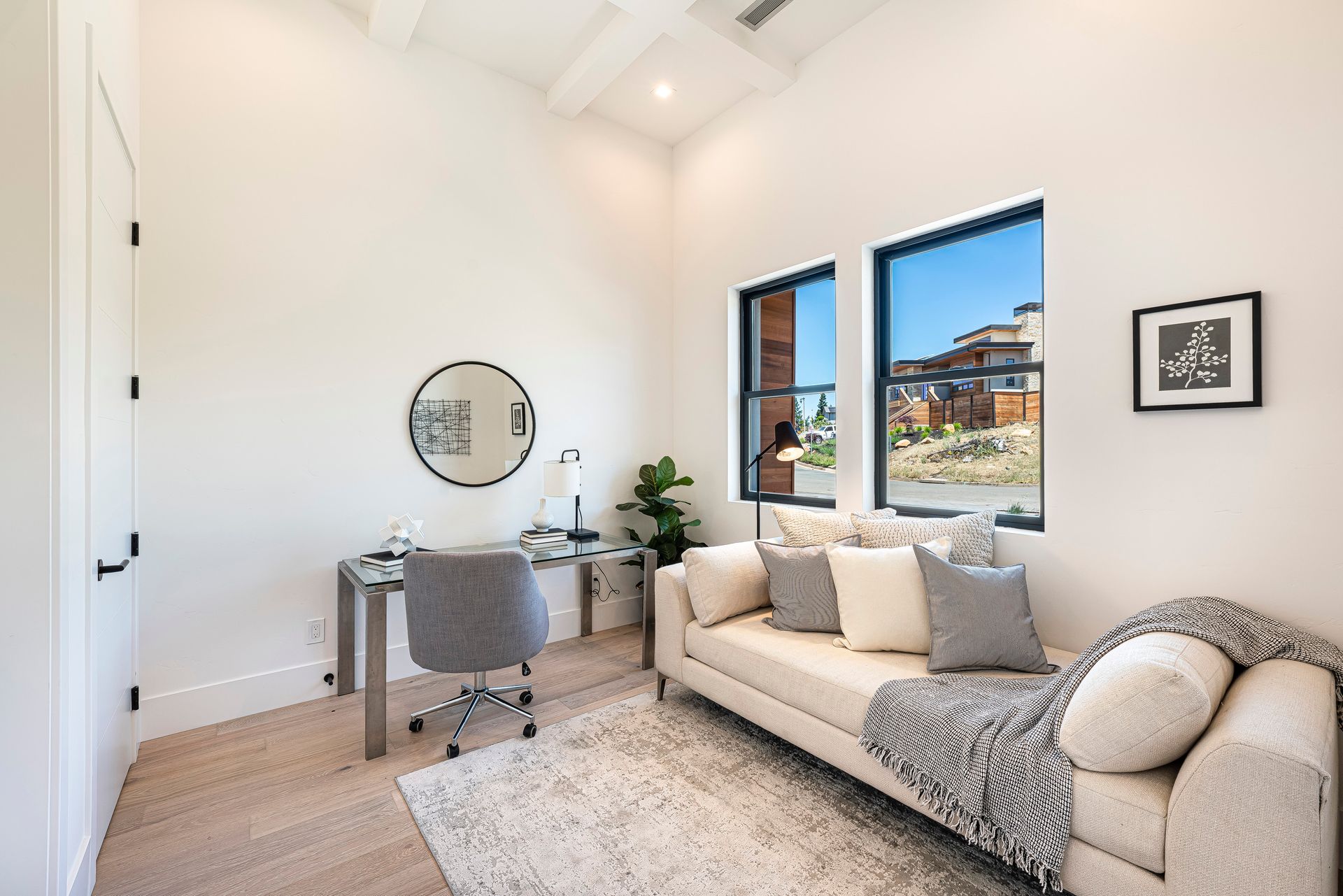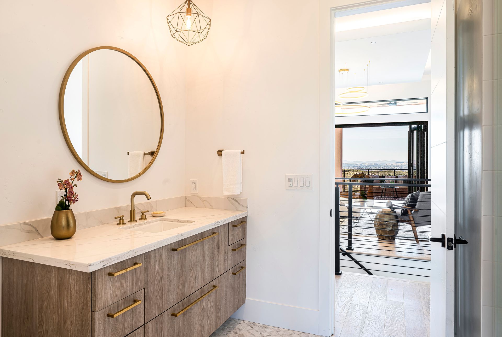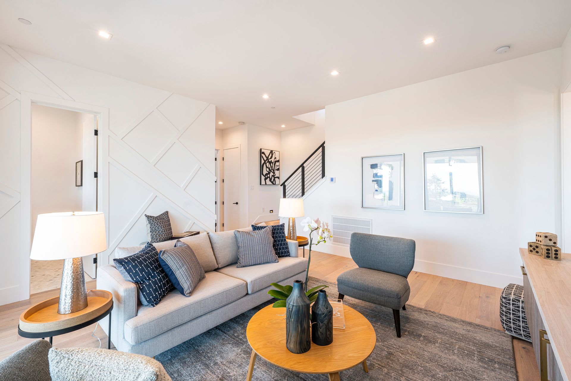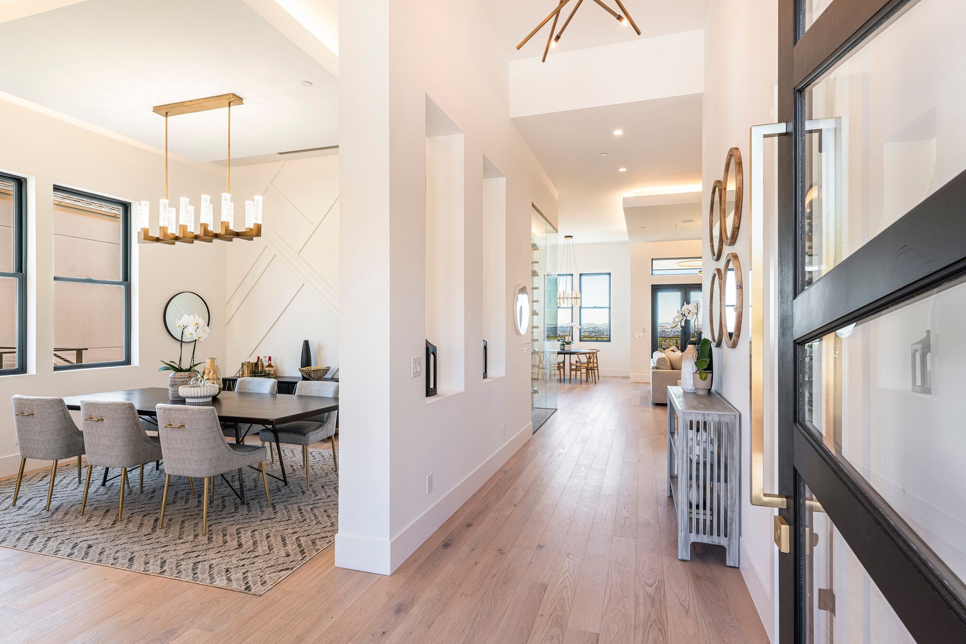 Great room living with 12’ ceiling and in-direct lighting, gas fireplace with floor to ceiling porcelain surround, hardwood flooring and folding doors to the view terrace includes gas fireplace for intimate gatherings