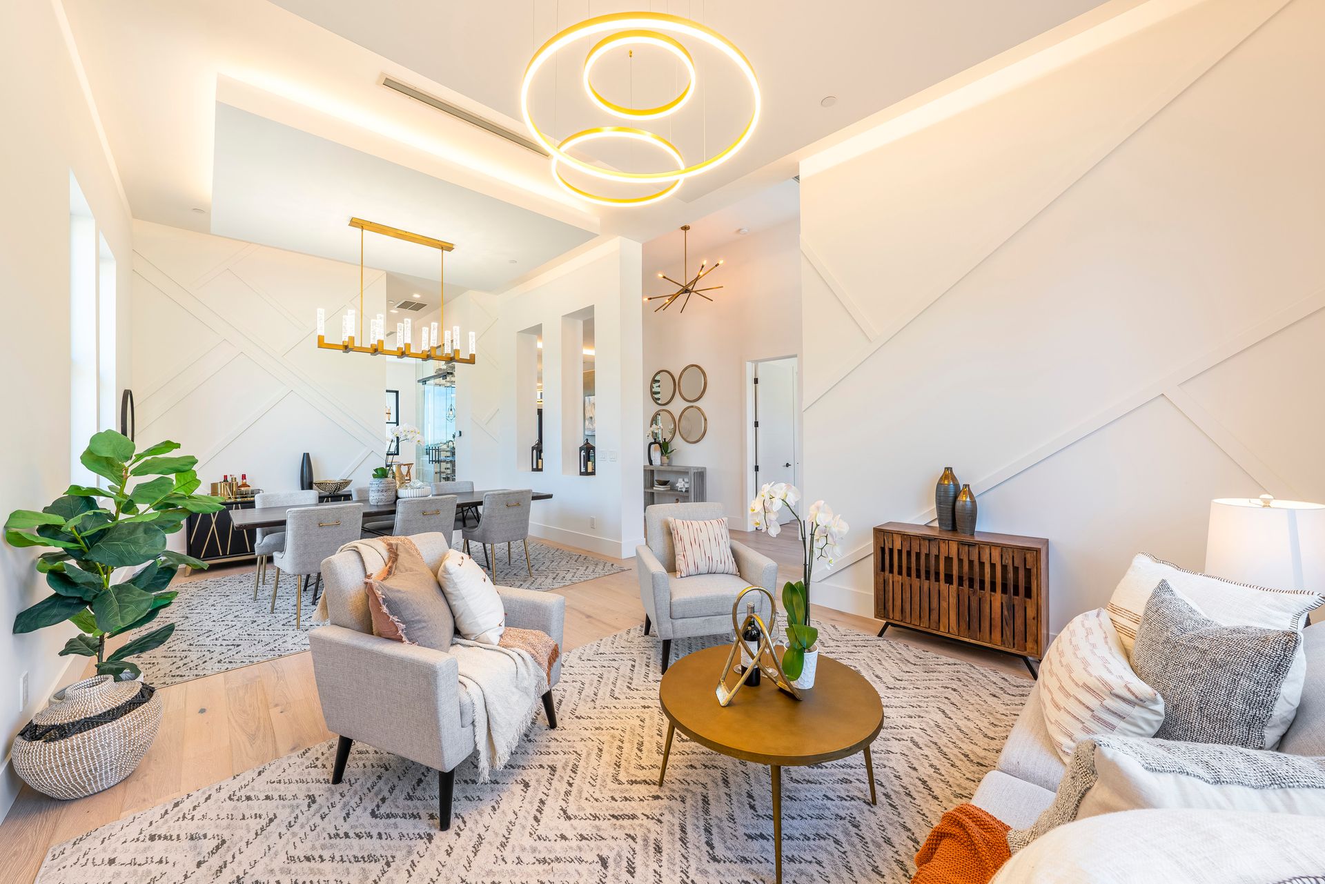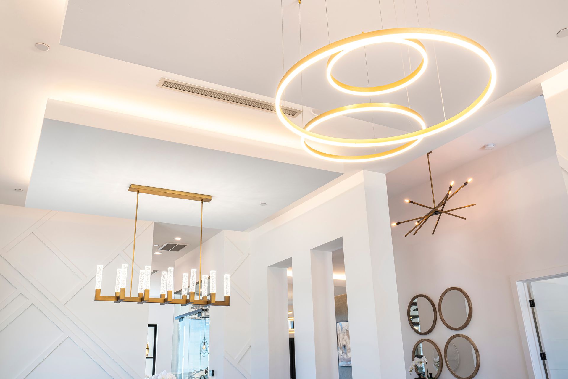Living/dining combo with fireplace and eye-catching drop ceiling panels with indirect lighting