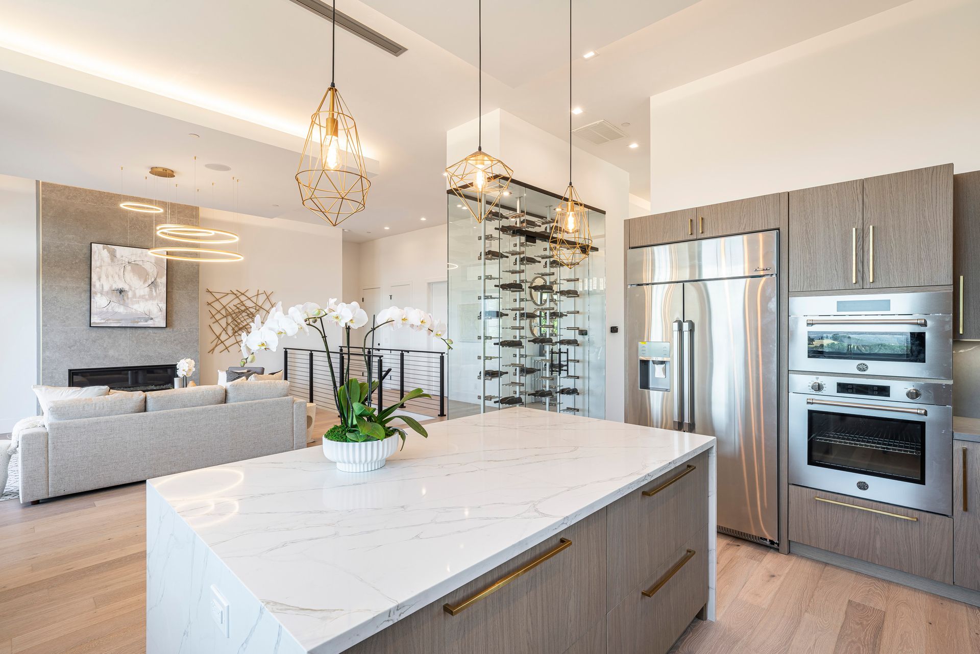 Kitchen boasts a large center island with quartz counters and pendant lighting, built-in refrigerator/freezer, Bertazzoni Italia 6 burner gas range with double ovens and griddle, pot filler faucet, additional built-in oven, hood over range, Bertazzoni dishwasher, microwave, large stainless sink, soft close drawers and cabinets imported from Italy, walk-in pantry, breakfast nook overlooking the views