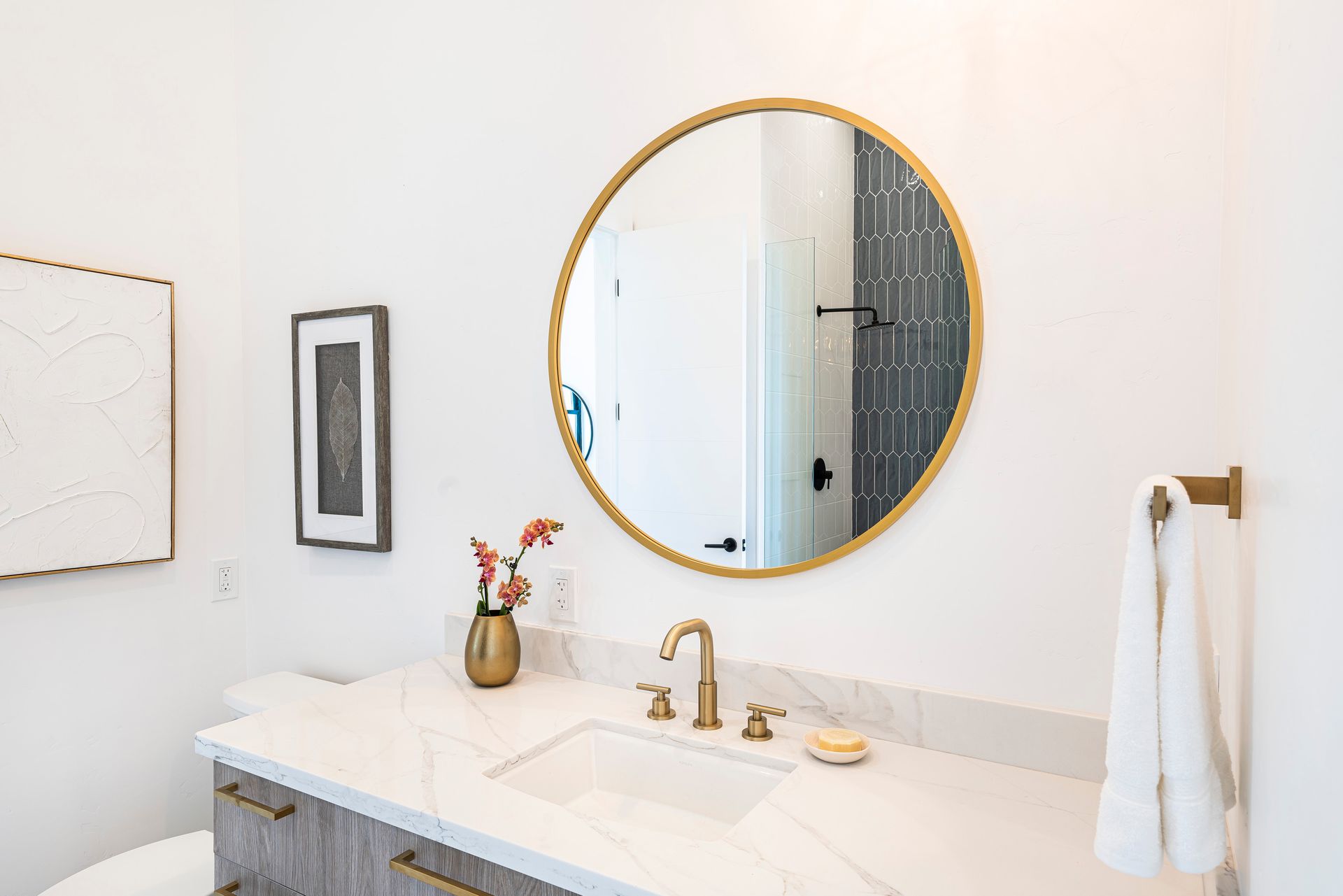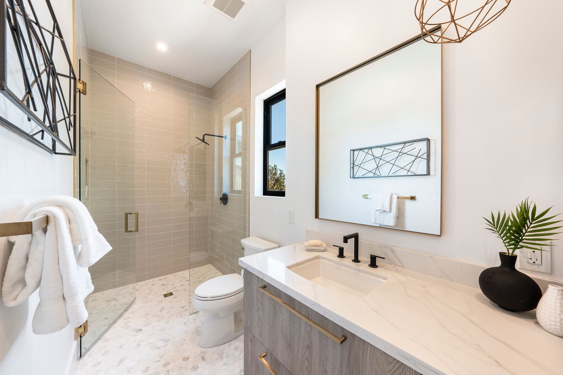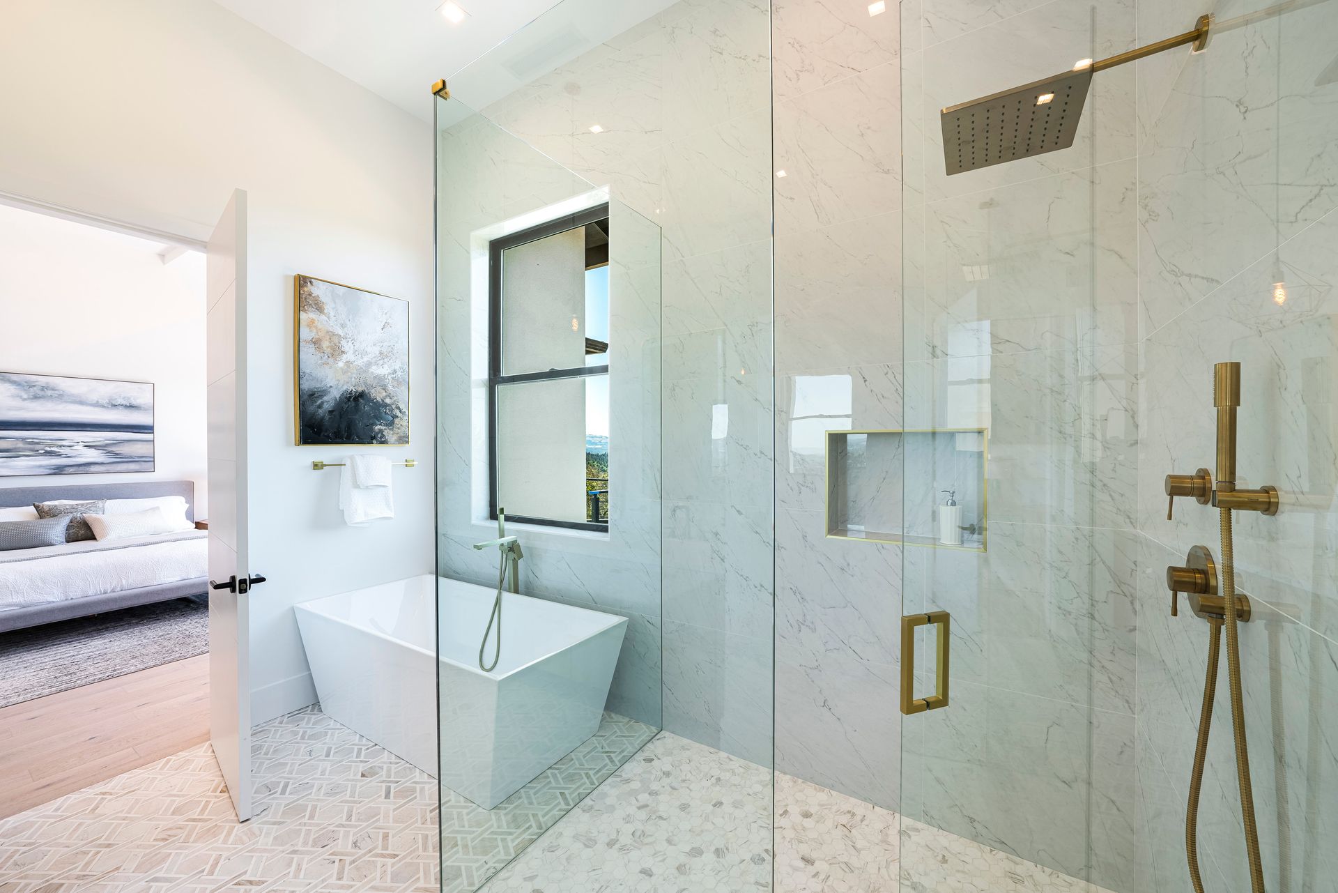 Primary bath has dual sinks, soaking tub, large quartz and marble stall shower with rain shower head and handheld wand