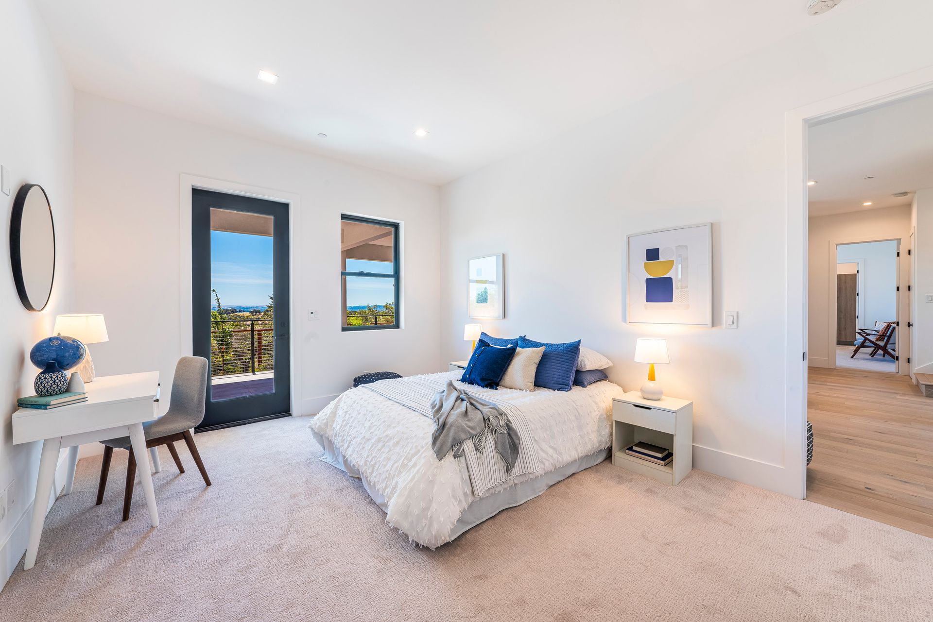 Primary bedroom on main level features folding glass doors to view terrace, box beam ceiling, walk-in closet with built-in organizers
