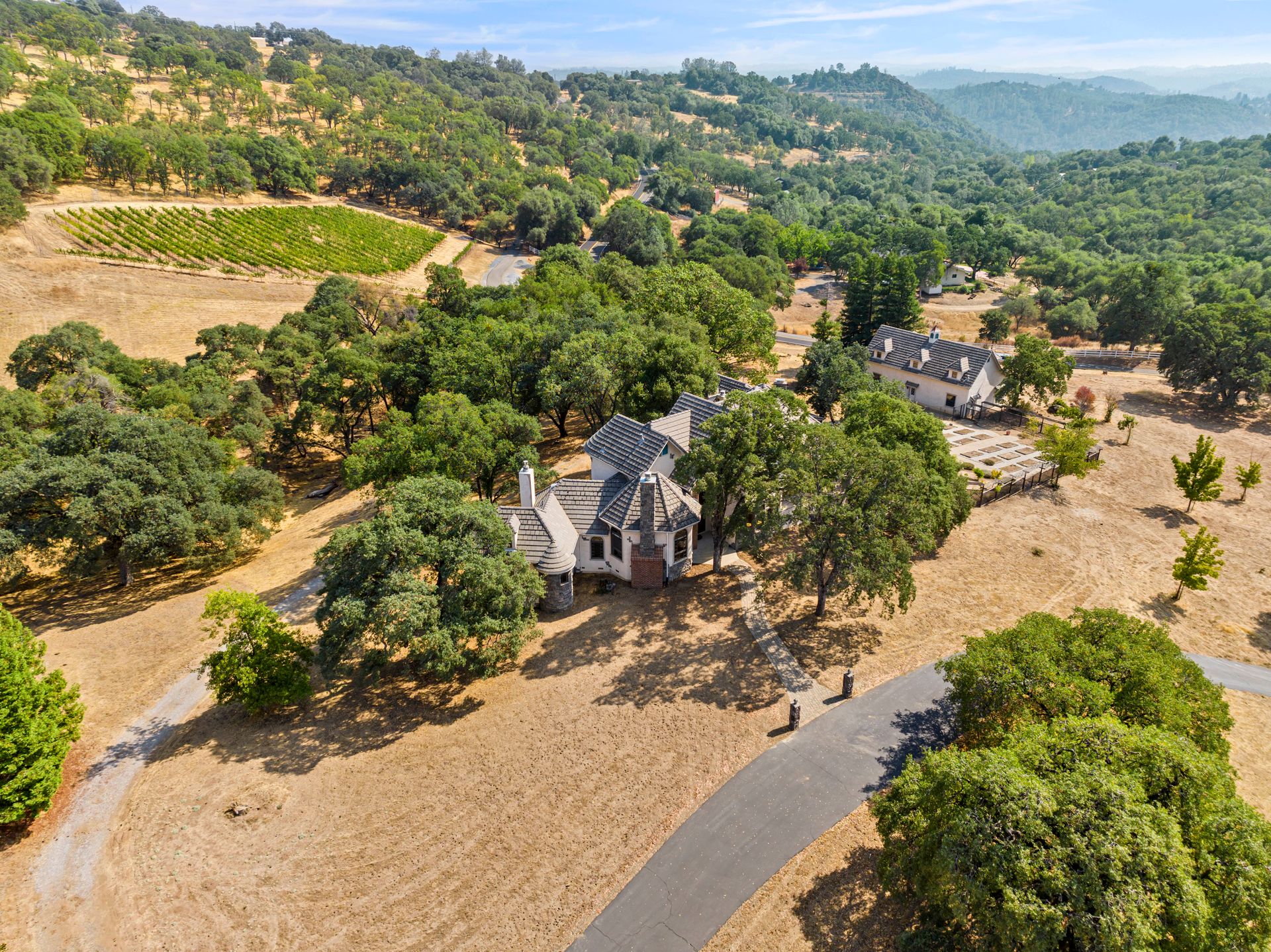 Embrace approximately 5.49 acres of natural beauty dotted with oaks and a seasonal creek that surrounds this TIMELESS TUDOR GEM! This custom home features a main level primary suite with a fireplace, a chef's kitchen with top-of-line appliances and includes a walk-in pantry and large wood bar with a wine refrigerator. The family room has open beam ceilings and a wood-burning fireplace. There is a formal dining room plus a cozy breakfast nook. The inviting living room has a gas log fireplace. Wood floors, special ceiling features, Eagle windows and levolor shades fill the interior. Many French doors open to over 900 square feet of concrete patios, both front and rear. The guest quarters/library offers privacy while the upstairs bedrooms and bath provide retreats. A pet friendly laundry room features a wash tub for convenience. The approximately 700 square foot shop is a real plus! Don’t miss the two-car garage nor the large, fenced garden area and dog kennel! The DREAM approximately 1,500 square feet detached RV garage/barn with a loft is AMAZING and great for a car enthusiast too! Other features include a Generac generator, central vac, a security system and a whole house fan. All firewood stays. There is so much opportunity here. Enjoy plenty of room for all your toys! The home is minutes to Highway 50 for commuting yet is convenient to Coloma for outdoor recreation! LOVE WHERE YOU LIVE!
