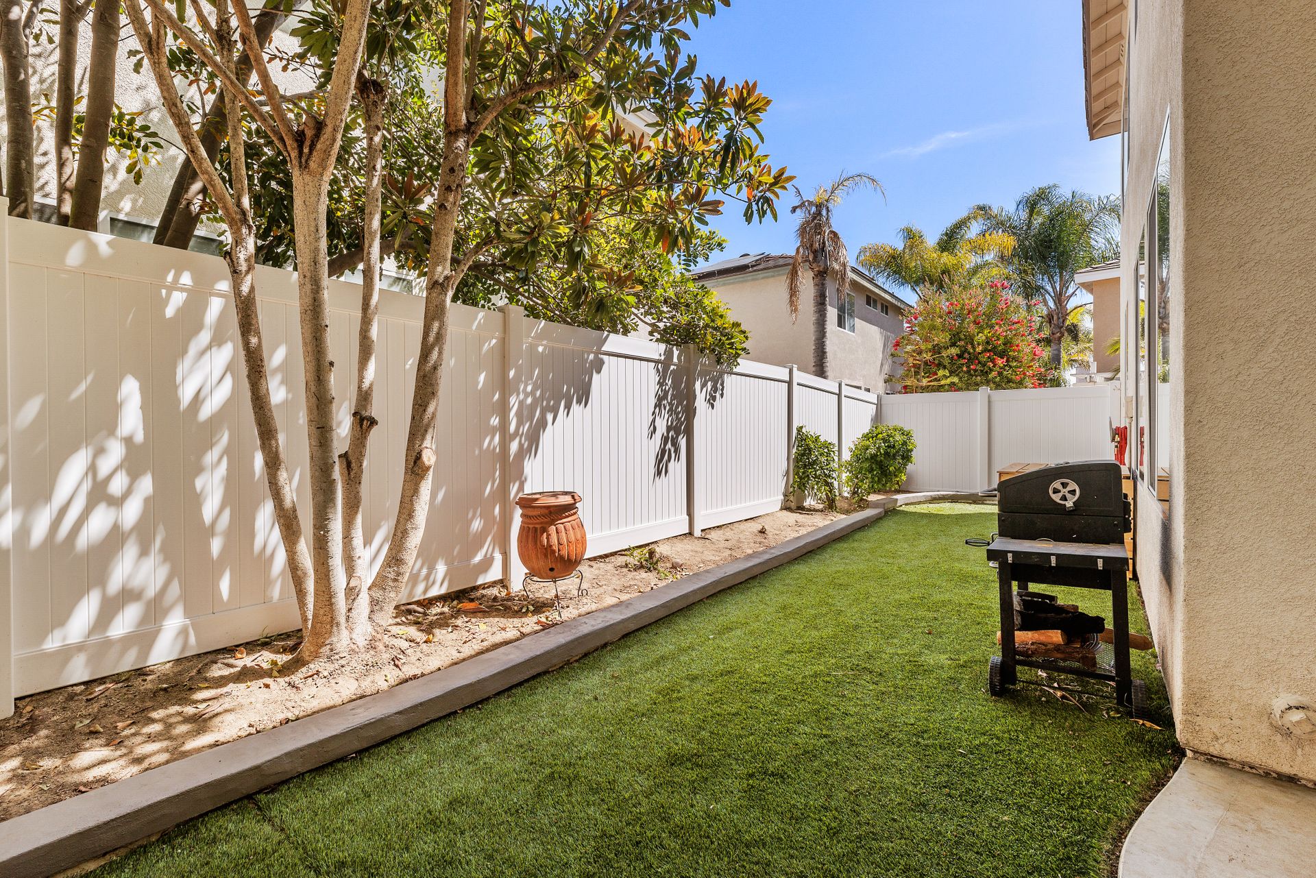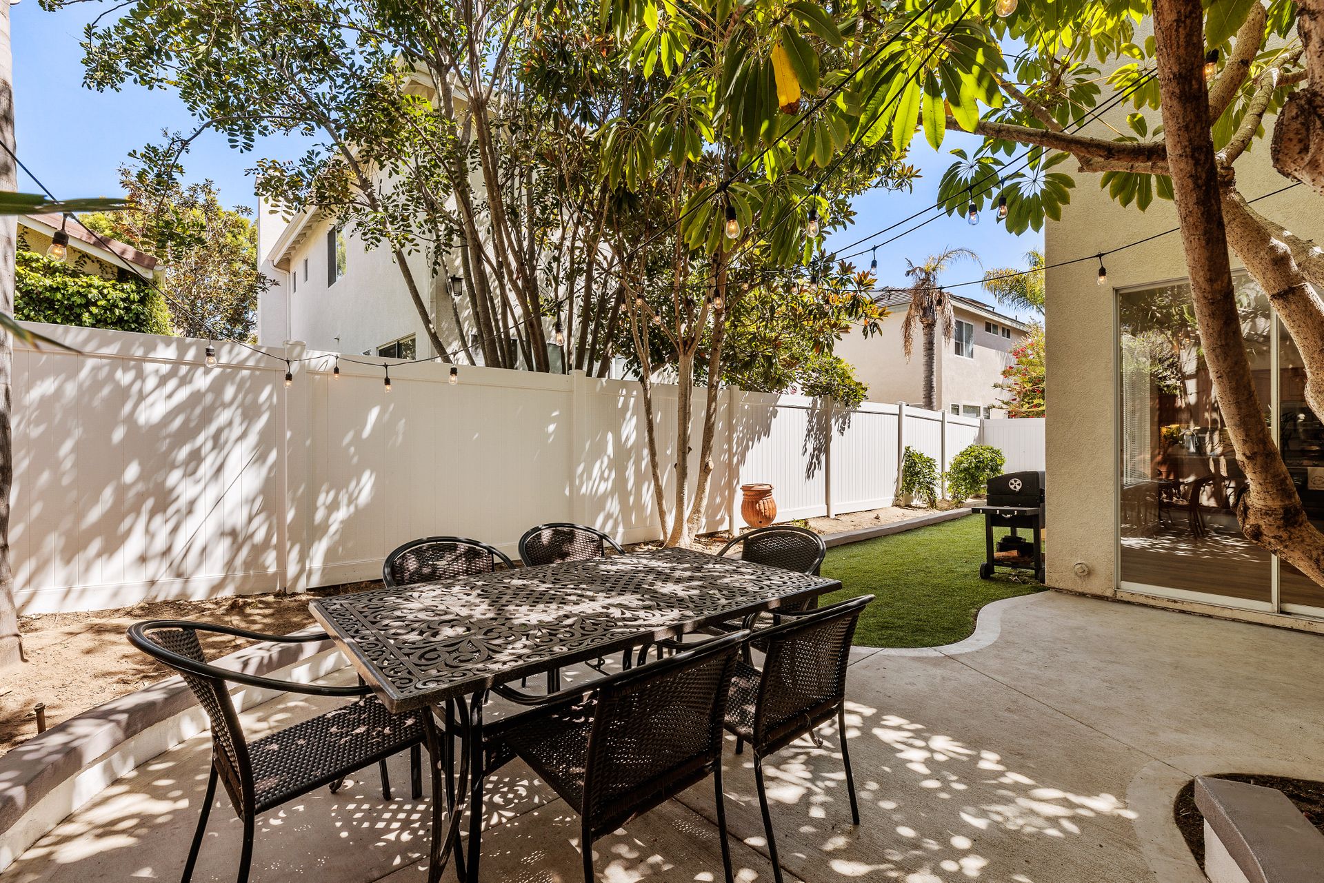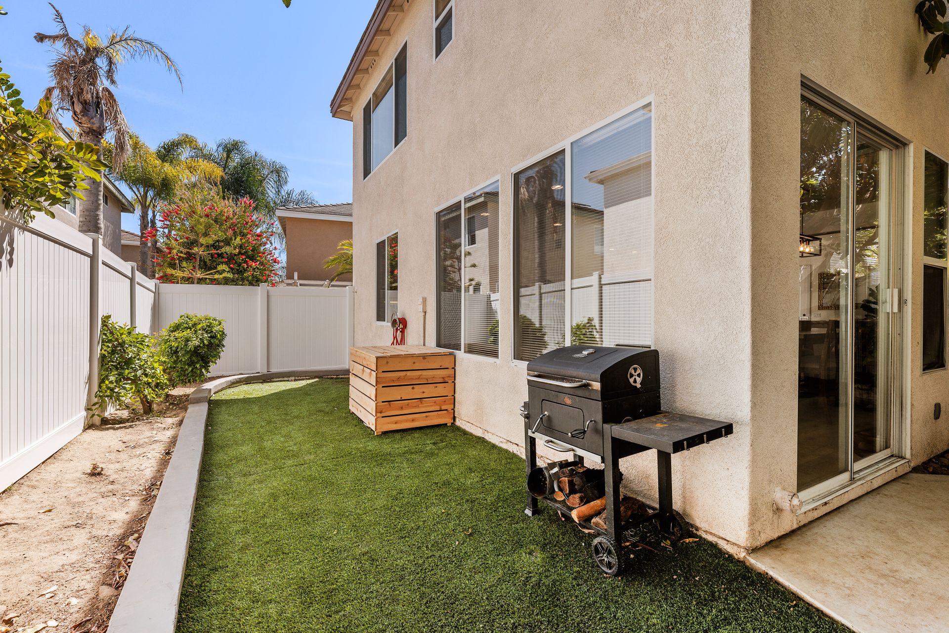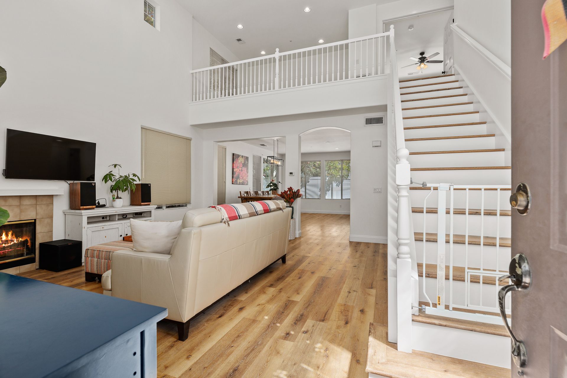 Located inside the gated community of Heritage/Legends in Shadowridge, this move-in-ready home offers three bedrooms plus a loft, two and one-half baths and approximately 1,714 square feet. The open-concept first floor features a living room with a cozy fireplace and vaulted ceilings, a large dining area big enough to fit a table that seats 10, a custom-built bar cabinet with shelves and lighting, a recently upgraded half bath, and a beautiful kitchen featuring granite counters, glass tile backsplash, large center island with storage, and a separate pantry. Luxury vinyl plank flooring was recently installed throughout most of the home with newer carpet in the upstairs primary bedroom and one of the guest rooms. The loft is excellent for a second living area, a workout room, a home office or as a 4th bedroom. If you're not a fan of orange peel texture on the walls, then you will LOVE that the walls and ceilings in this home have a level four skim coat finish which was done to perfection! Other features include an accent tile wall in the living room, ceiling fans in all bedrooms, newer baseboards and door casings, and A/C. The low maintenance backyard features newer fencing, recently installed turf, and an inviting concrete patio area enhanced by market lights creating a wonderful backdrop for outdoor dining. With quick access to the 78 freeway, this home is located approximately 8 miles from the beach and is within a short distance of shops, restaurants, schools, and parks. Just across the street is the Buena Vista Park Pond and Open Space where you can feed the ducks, walk the dog, or enjoy the many hiking trails. Low HOA dues of $148/mo and no Mello Roos!
