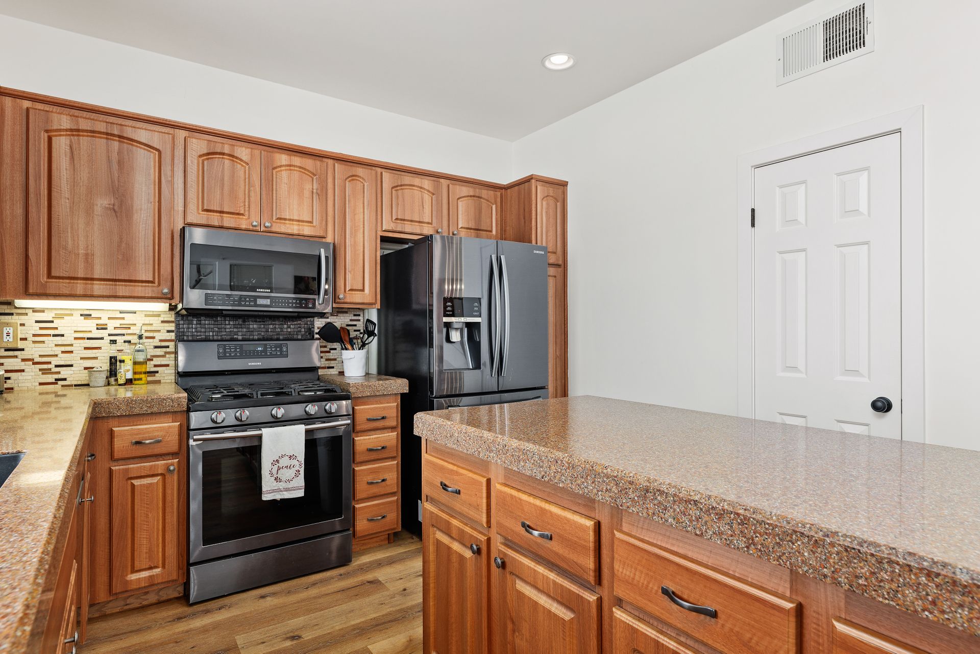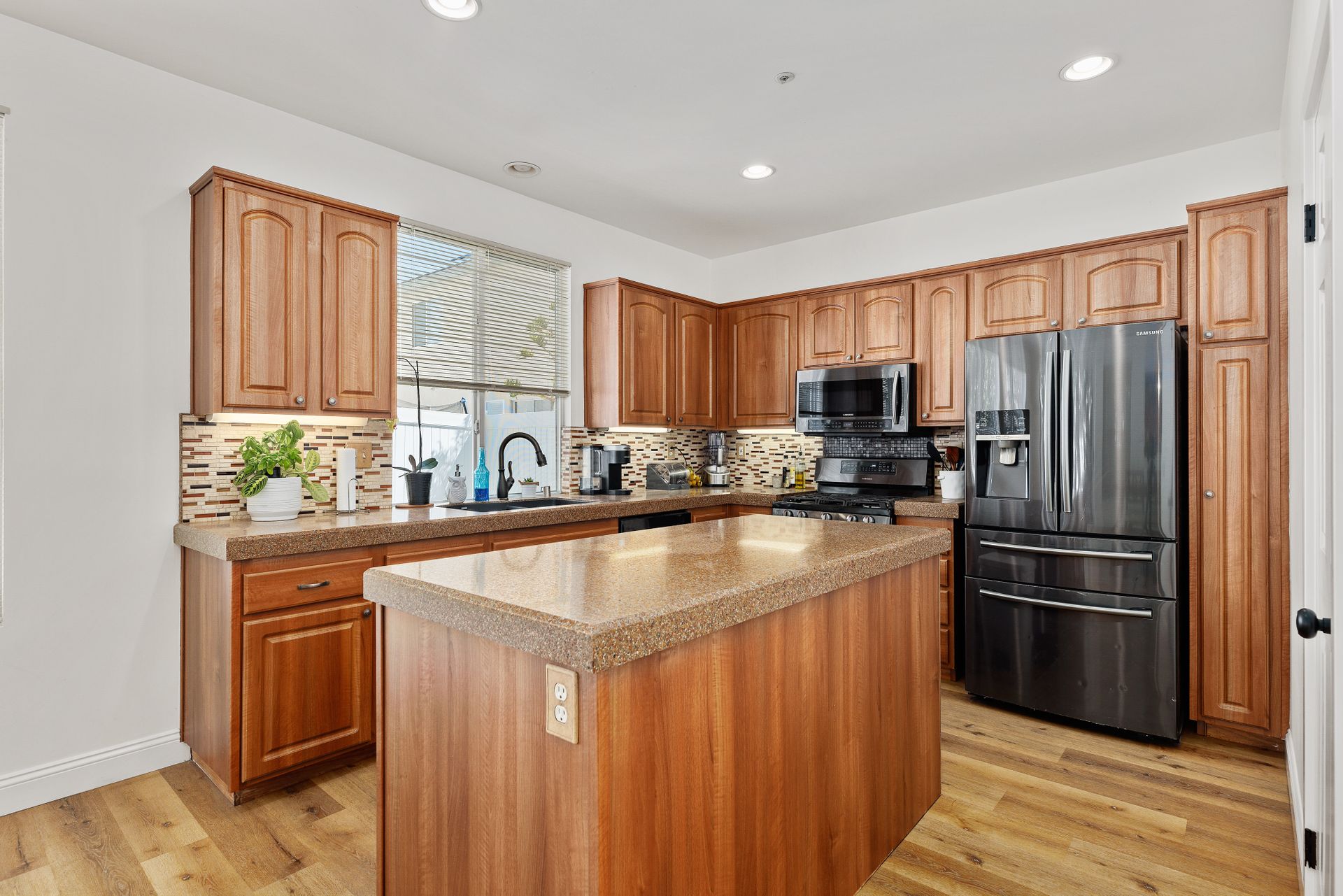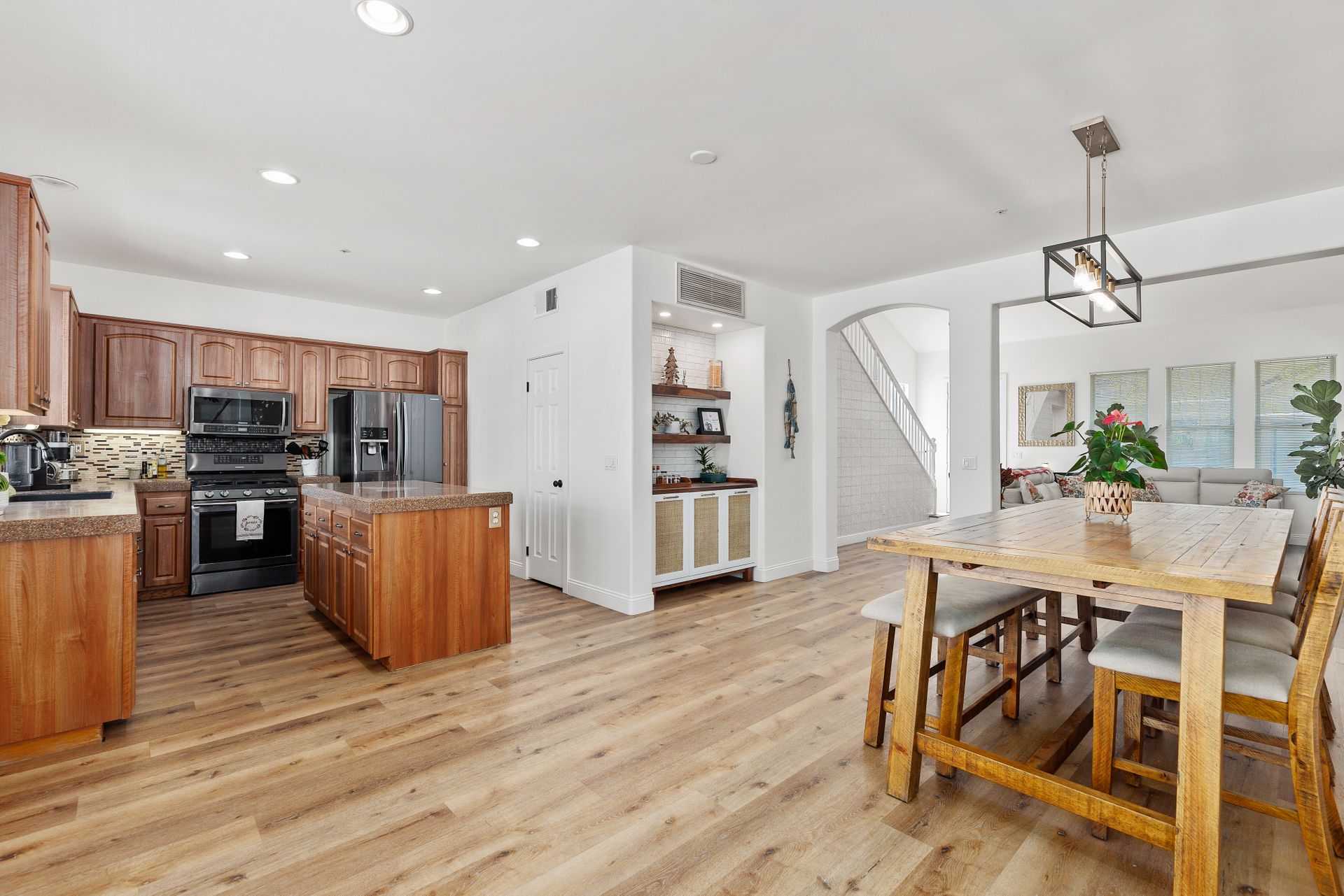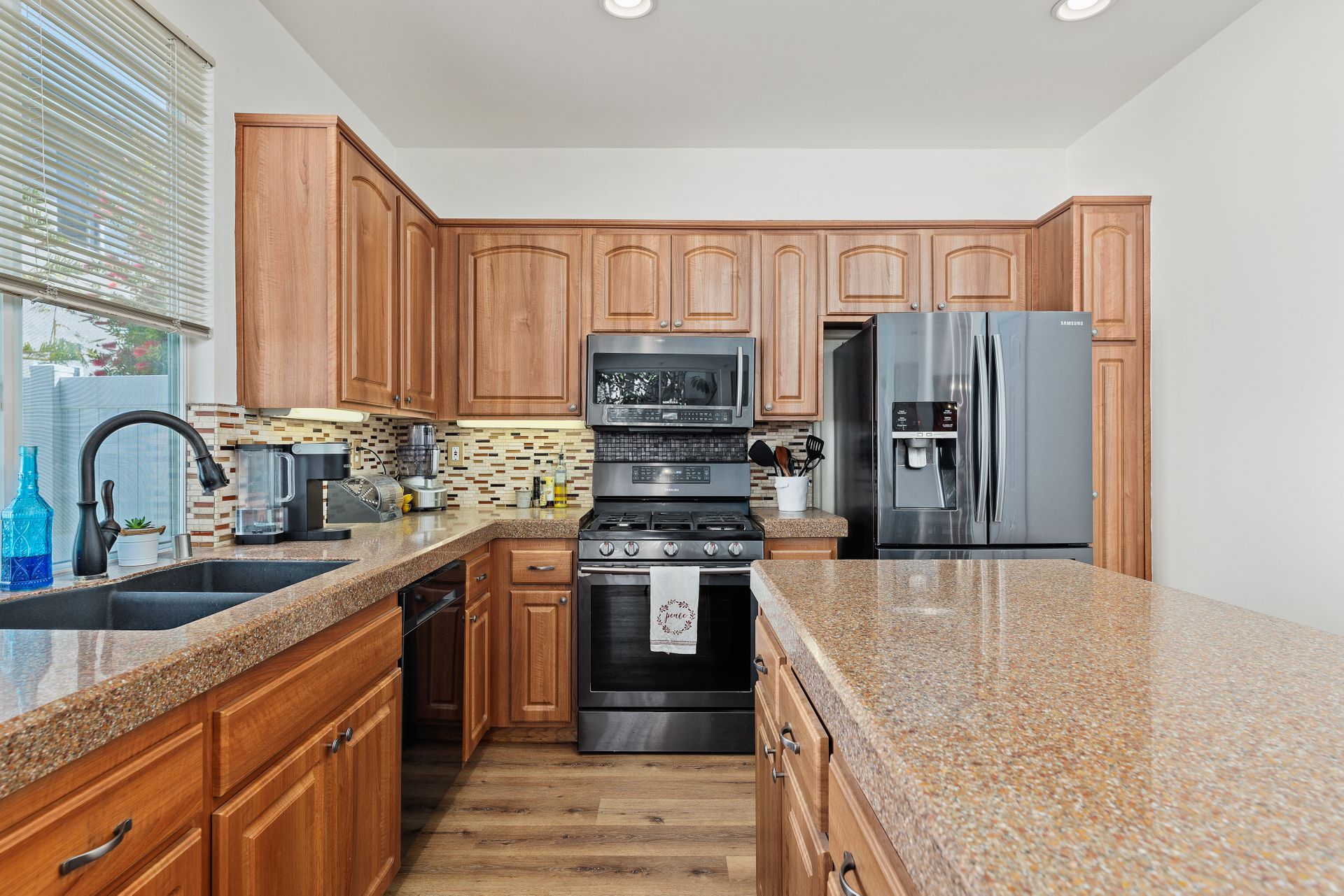 Located inside the gated community of Heritage/Legends in Shadowridge, this move-in-ready home offers three bedrooms plus a loft, two and one-half baths and approximately 1,714 square feet. The open-concept first floor features a living room with a cozy fireplace and vaulted ceilings, a large dining area big enough to fit a table that seats 10, a custom-built bar cabinet with shelves and lighting, a recently upgraded half bath, and a beautiful kitchen featuring granite counters, glass tile backsplash, large center island with storage, and a separate pantry. Luxury vinyl plank flooring was recently installed throughout most of the home with newer carpet in the upstairs primary bedroom and one of the guest rooms. The loft is excellent for a second living area, a workout room, a home office or as a 4th bedroom. If you're not a fan of orange peel texture on the walls, then you will LOVE that the walls and ceilings in this home have a level four skim coat finish which was done to perfection! Other features include an accent tile wall in the living room, ceiling fans in all bedrooms, newer baseboards and door casings, and A/C. The low maintenance backyard features newer fencing, recently installed turf, and an inviting concrete patio area enhanced by market lights creating a wonderful backdrop for outdoor dining. With quick access to the 78 freeway, this home is located approximately 8 miles from the beach and is within a short distance of shops, restaurants, schools, and parks. Just across the street is the Buena Vista Park Pond and Open Space where you can feed the ducks, walk the dog, or enjoy the many hiking trails. Low HOA dues of $148/mo and no Mello Roos!