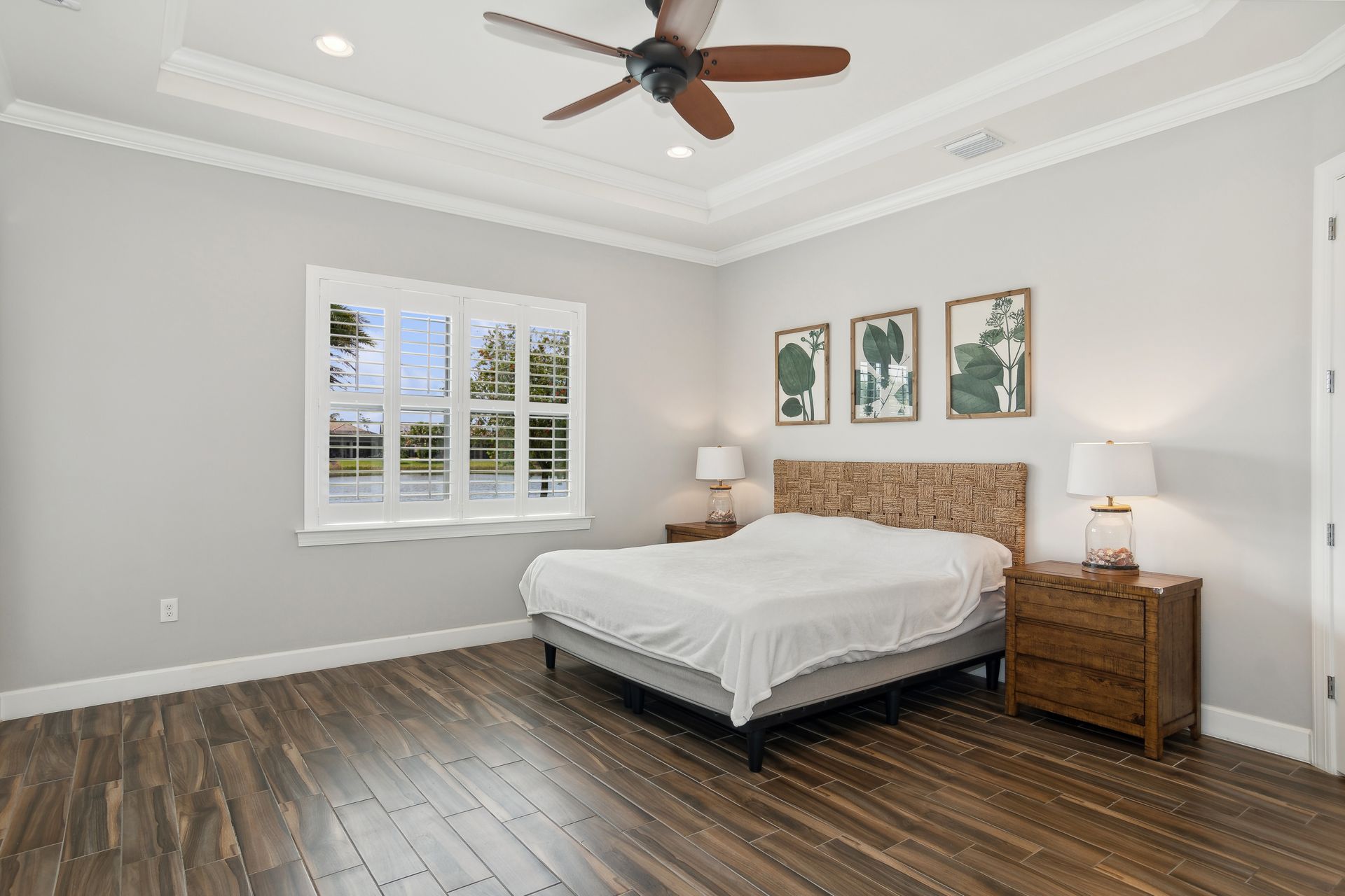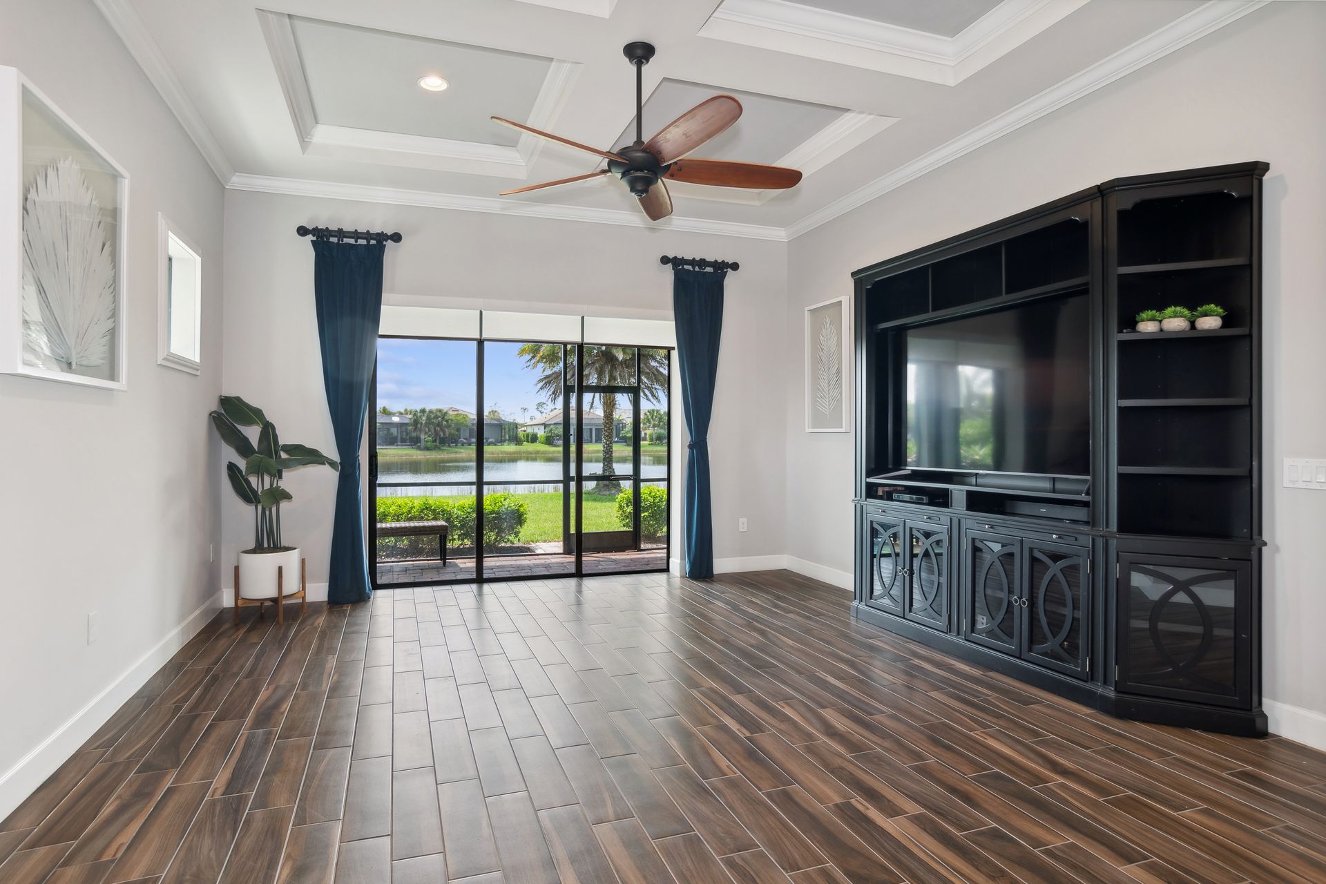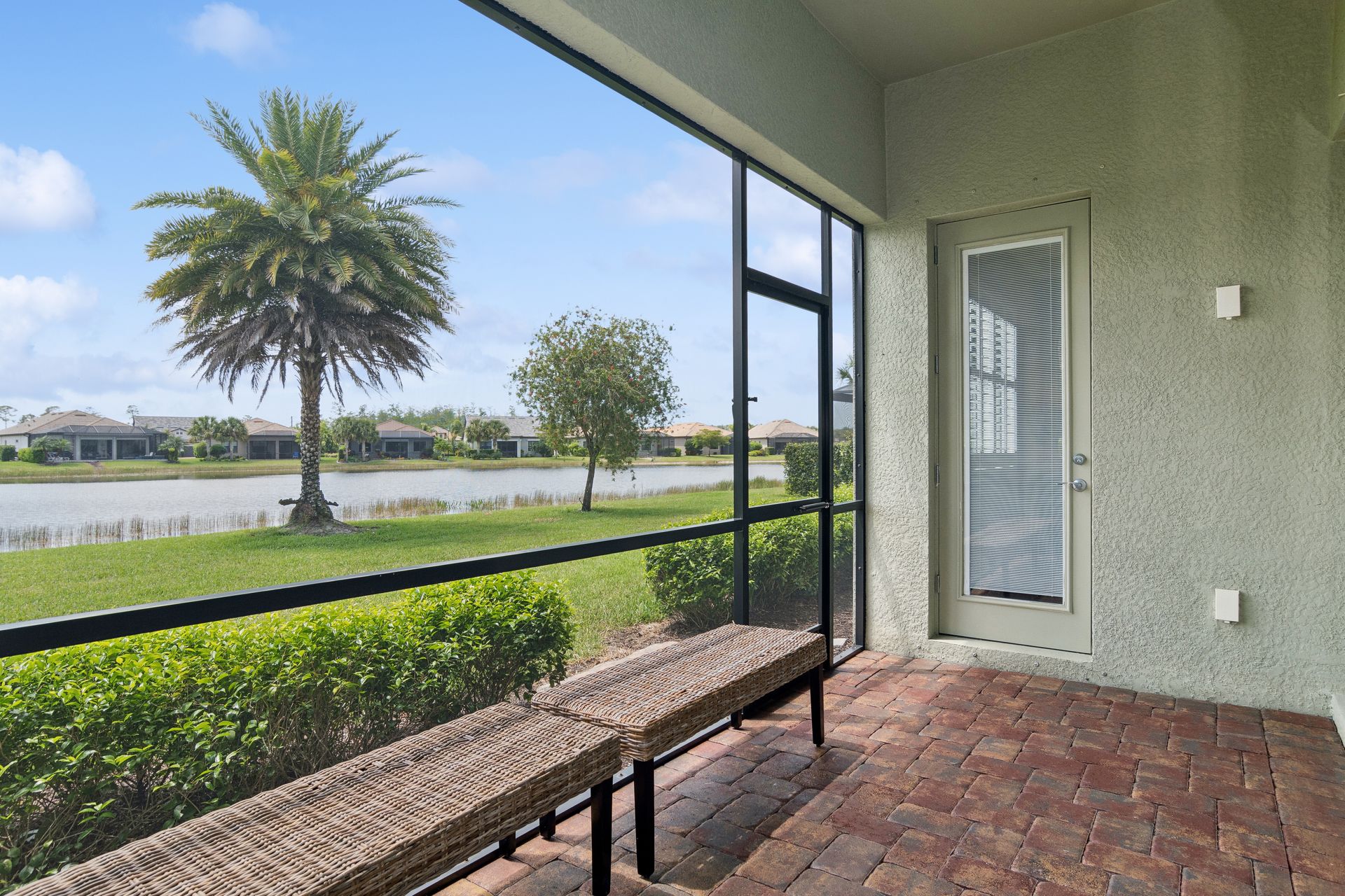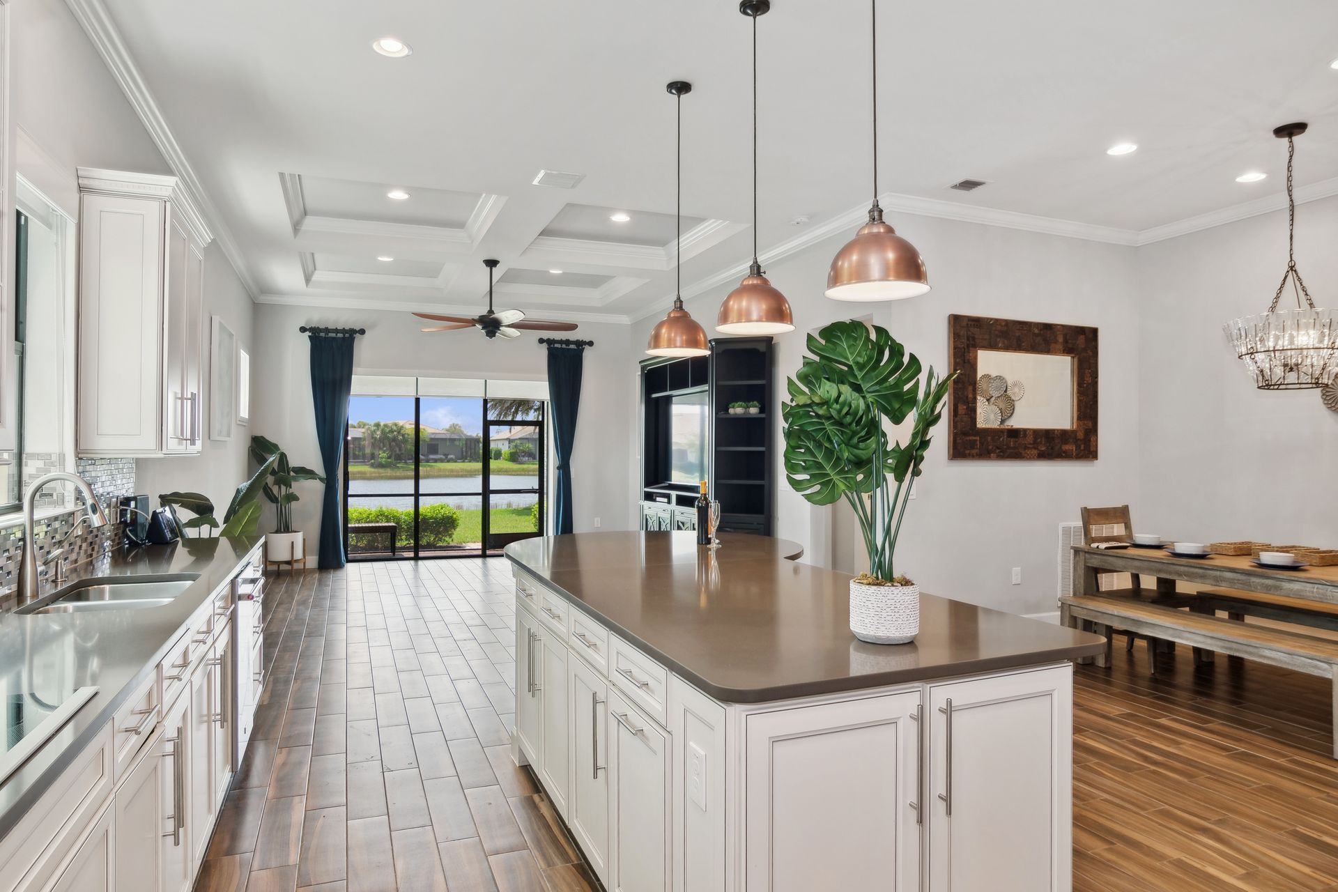 CORKSCREW SHORES RESORT STYLE LIVING ON THE WATER! Nestled in between two lakes, with immediate water views the moment you step inside. Open floor plan leads you to the wide-opening sliding glass doors intermingling the indoors/outdoors with the screened-in lanai with breathtaking SUNSETS! Covered front porch welcomes you to this three bedroom with office/den, two full baths and attached garage. Priced 'right' & ready for you NOW! Gourmet kitchen boasts a walk-in custom pantry, perfect spot for your coffee/wine nook including a beverage cooler, gorgeous white glazed cabinets, contrasting quartz counter tops, modern glass backsplash, under cabinet lighting, extended island with storage and seating. Informal and formal dining. Wood-look plank tile flooring (no carpet), crown molding, plantation shutters and professional closet systems. Eight foot beadboard doors, coffered/tray ceilings. Custom storage in the laundry room with newer washer/dryer. Oversized Owners retreat with sitting area and door leading to the patio. Ensuite bathroom features both a shower and separete bathtub in addition to large walk-in closet. Home office with French doors. This Martin Ray PULTE floor plan is move in ready!