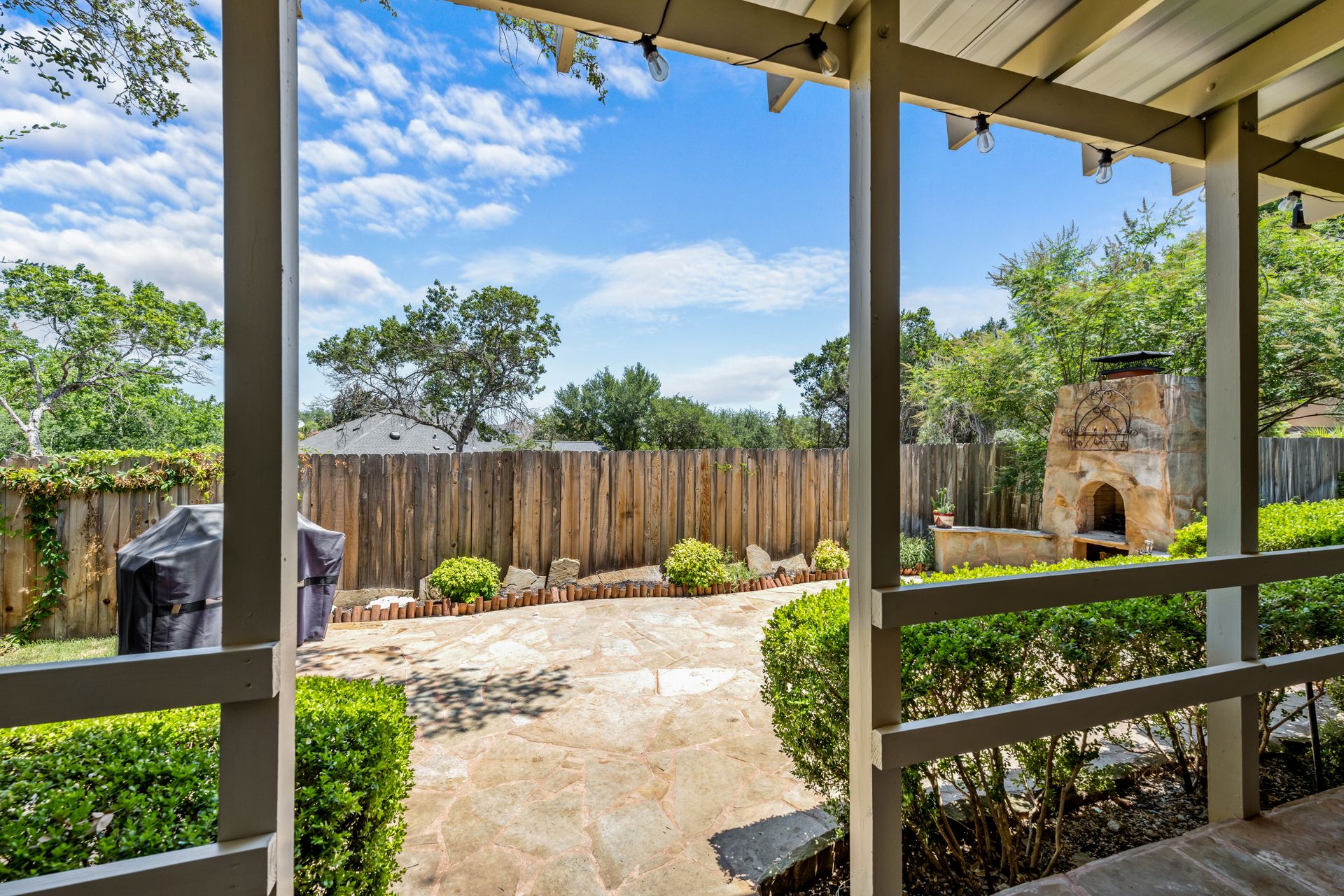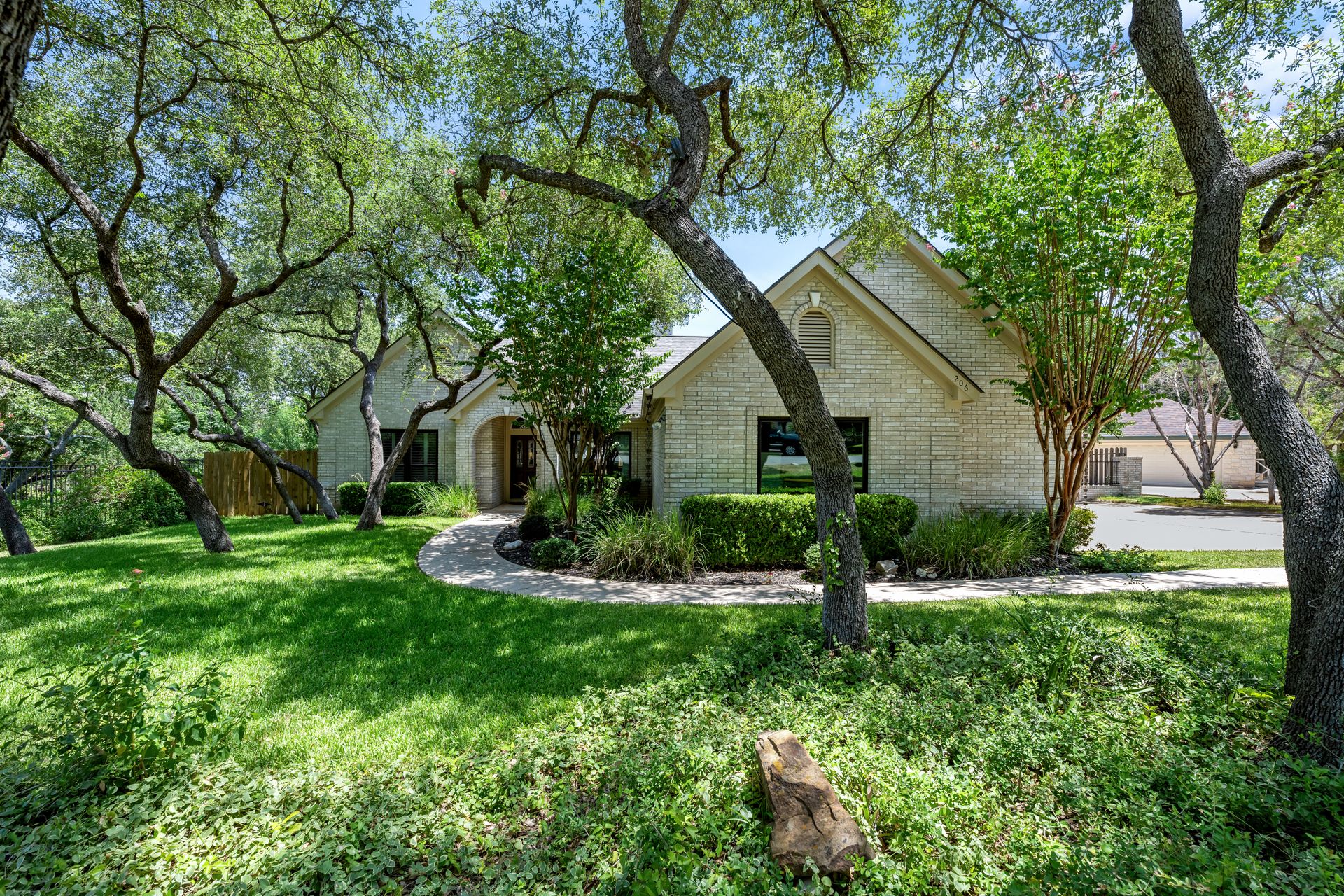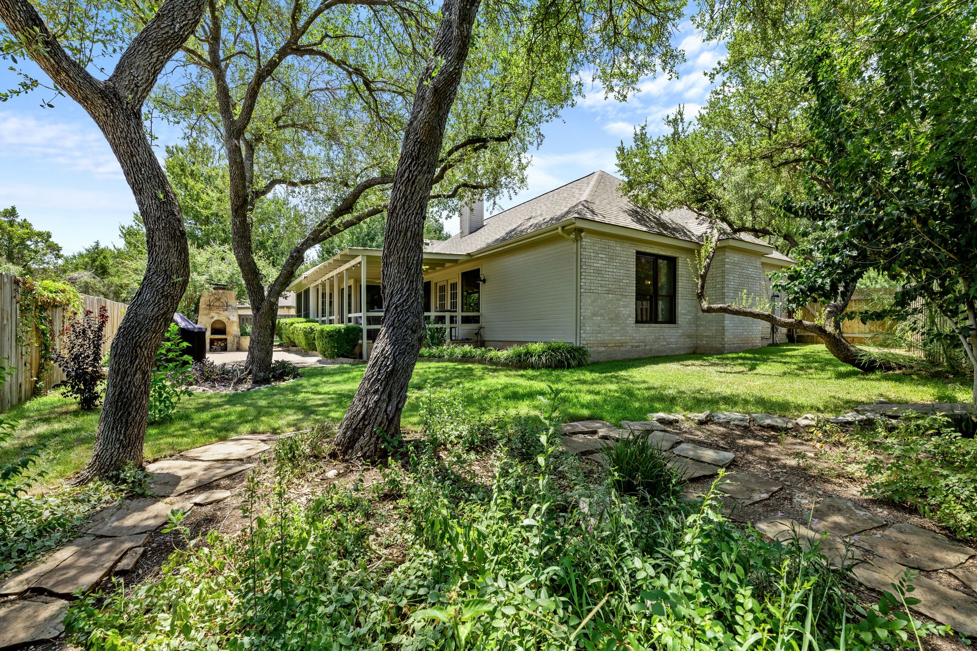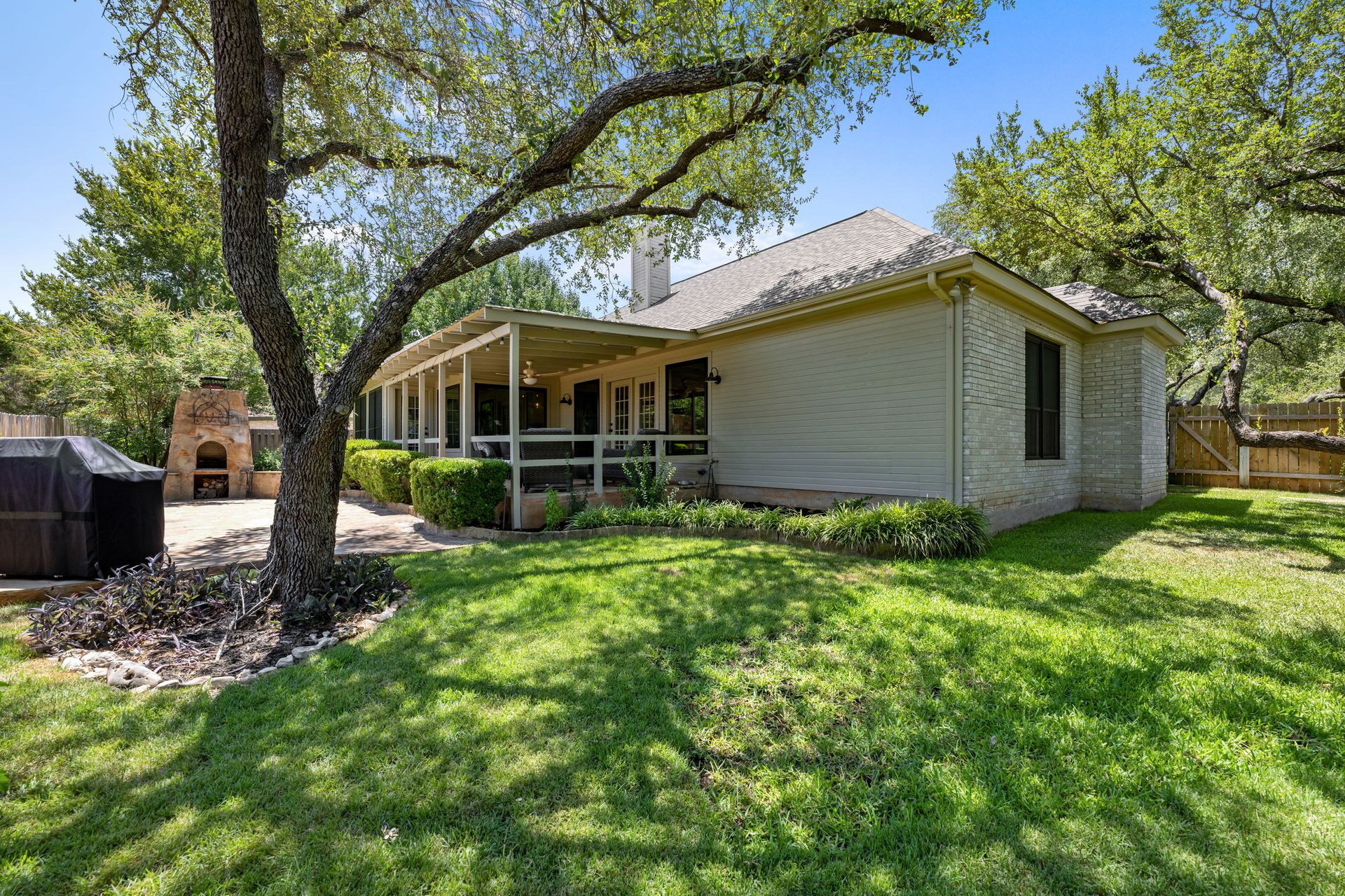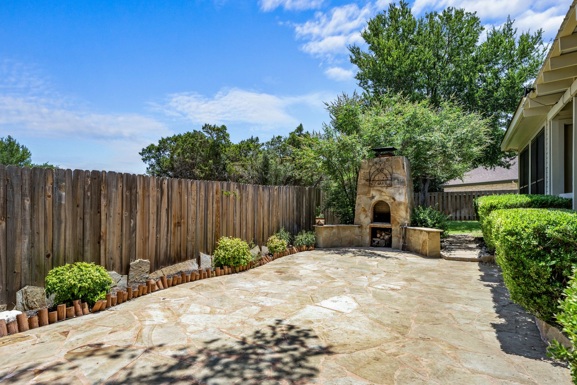 This charming, single-story three bedroom, two full and one-half-bath home is tucked in a quiet cul-de-sac in Lakeway that sits on a spacious lot with privacy. Home features wood floors, an updated kitchen with granite countertops, subway tile backsplash, gas cooking, a breakfast bar, an eat-in kitchen and a formal dining area open to the living room. The kitchen is open to another living area with a built-in cabinet. The primary room offers high ceilings and an ensuite with a garden tub and separate shower, double vanities and a large walk-in closet. There is a door leading out to a private sitting area perfect for a hot tub or private space. The home offers a beautiful covered outdoor living space, with an outdoor fireplace. This property is surrounded by gorgeous live oaks with room for a pool, garden and more. All the windows have been updated. Located near Lakeway City Park, Cross Water Marina, hike and bike trails and the Hamilton Green Belt and is in Lake Travis ISD. Move-in ready!