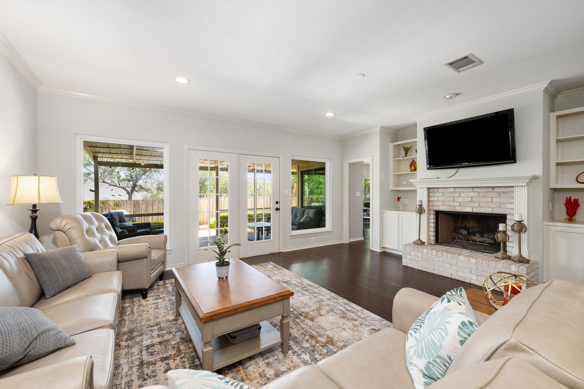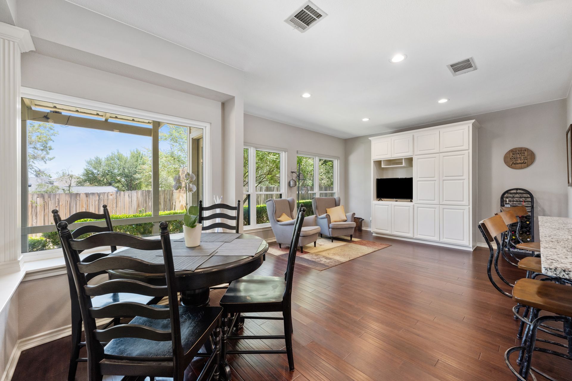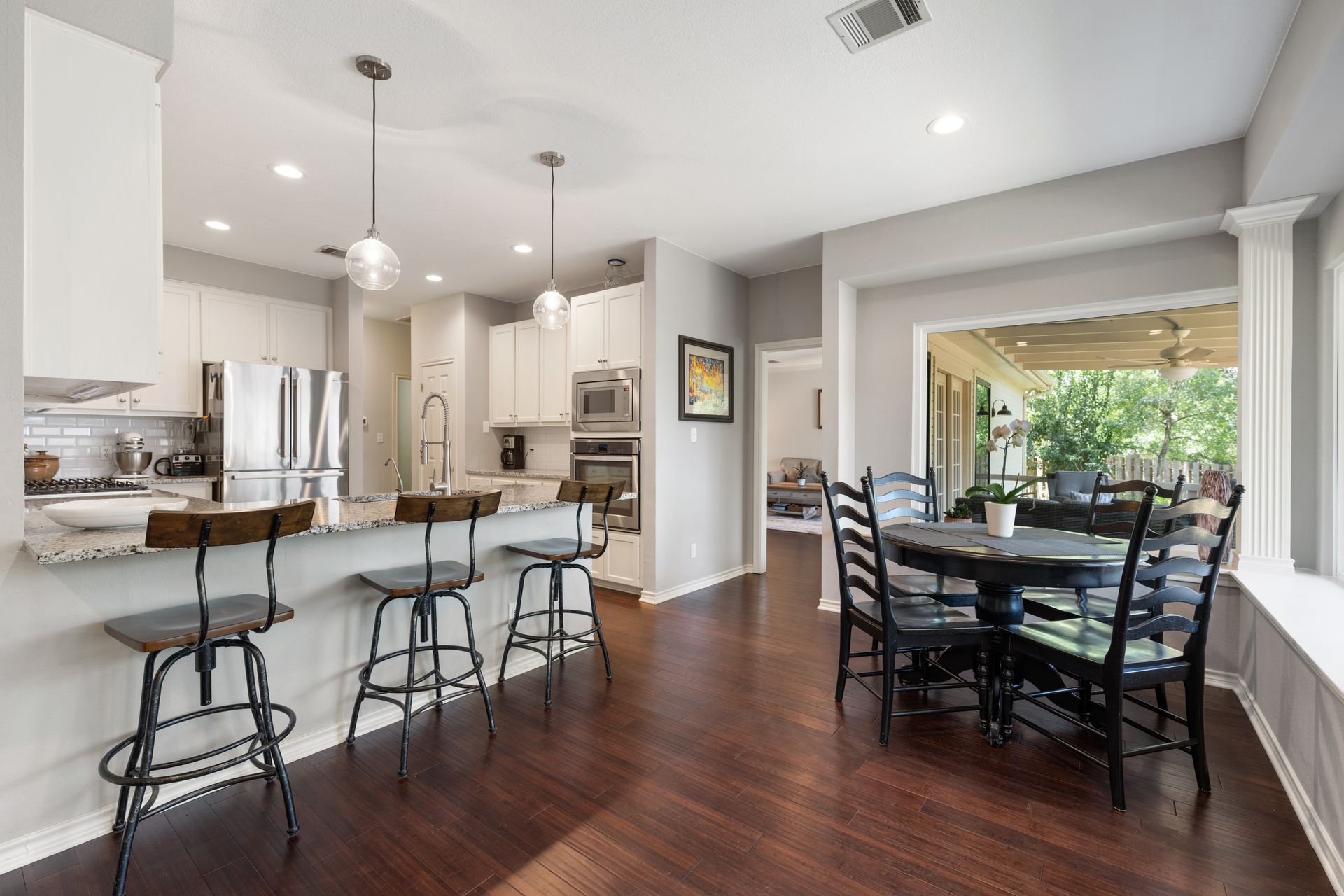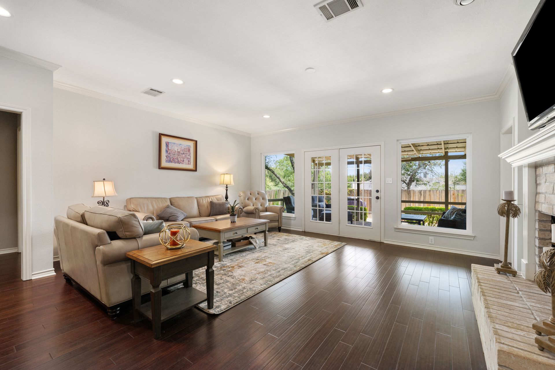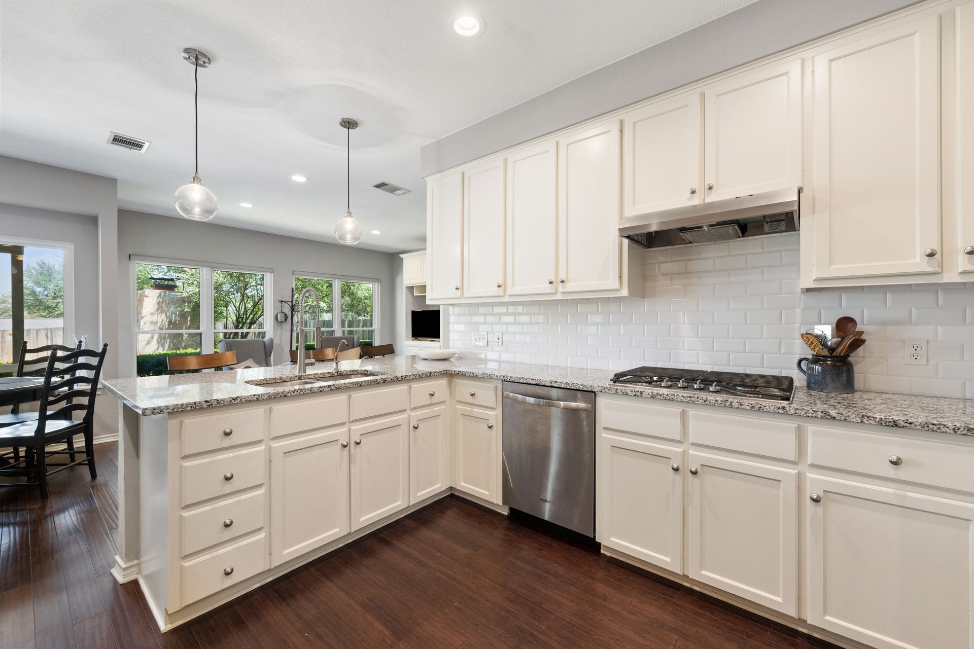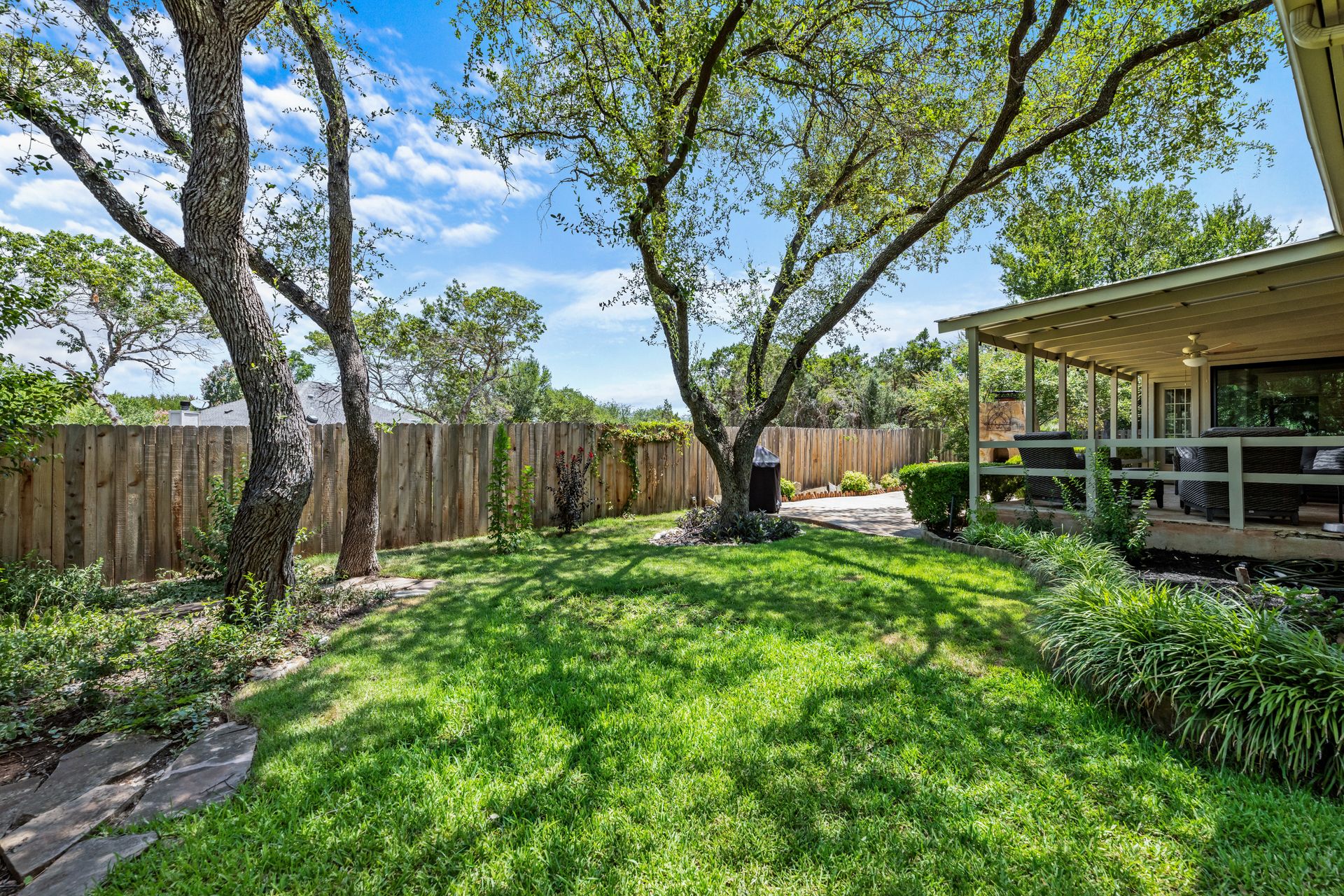 This charming, single-story three bedroom, two full and one-half-bath home is tucked in a quiet cul-de-sac in Lakeway that sits on a spacious lot with privacy. Home features wood floors, an updated kitchen with granite countertops, subway tile backsplash, gas cooking, a breakfast bar, an eat-in kitchen and a formal dining area open to the living room. The kitchen is open to another living area with a built-in cabinet. The primary room offers high ceilings and an ensuite with a garden tub and separate shower, double vanities and a large walk-in closet. There is a door leading out to a private sitting area perfect for a hot tub or private space. The home offers a beautiful covered outdoor living space, with an outdoor fireplace. This property is surrounded by gorgeous live oaks with room for a pool, garden and more. All the windows have been updated. Located near Lakeway City Park, Cross Water Marina, hike and bike trails and the Hamilton Green Belt and is in Lake Travis ISD. Move-in ready!