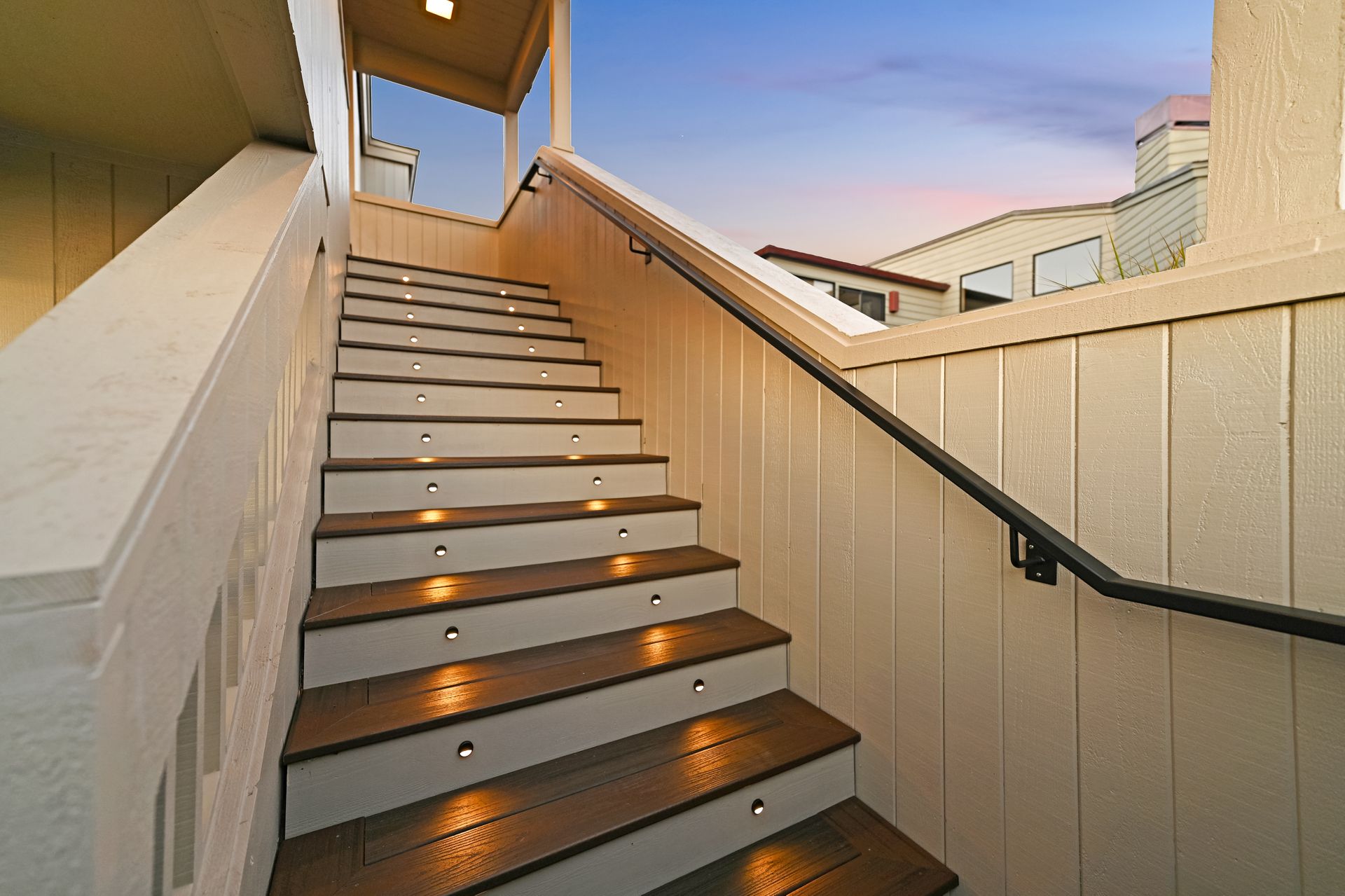 - **Outdoor Living**: A paver driveway and newly built front stairwell with lighting, custom handrail and security gate. Enjoy rear exterior deck with couch seating and fire table and lower patio with privacy, stamped concrete and hot tub.