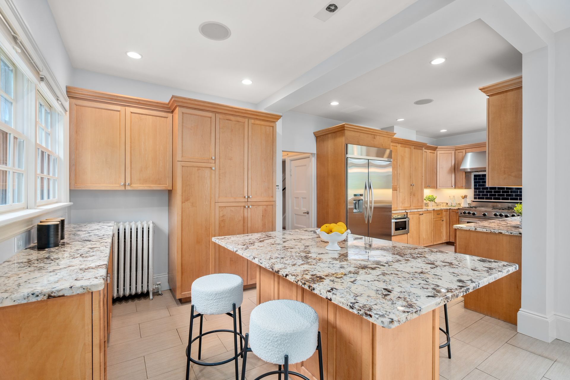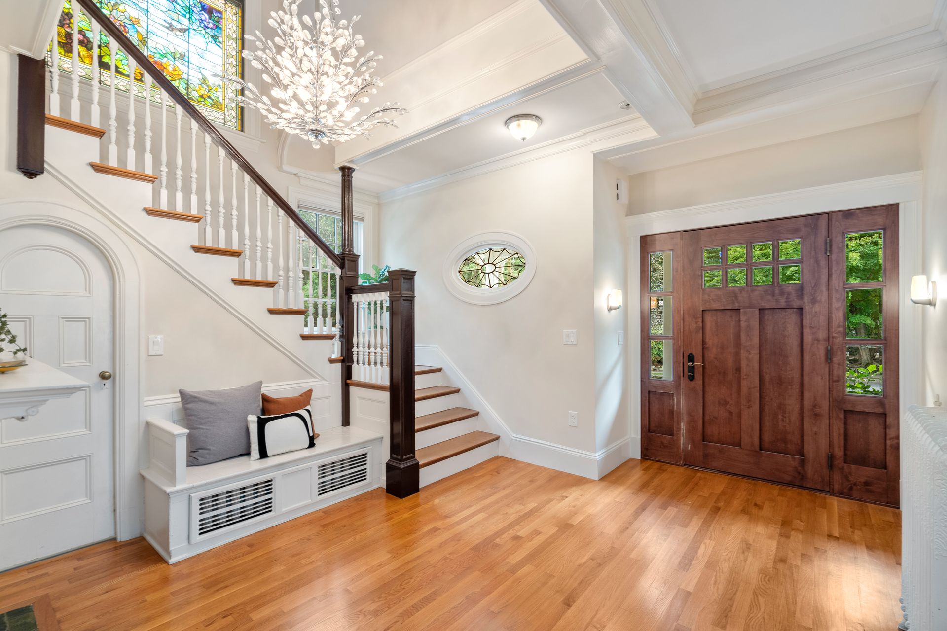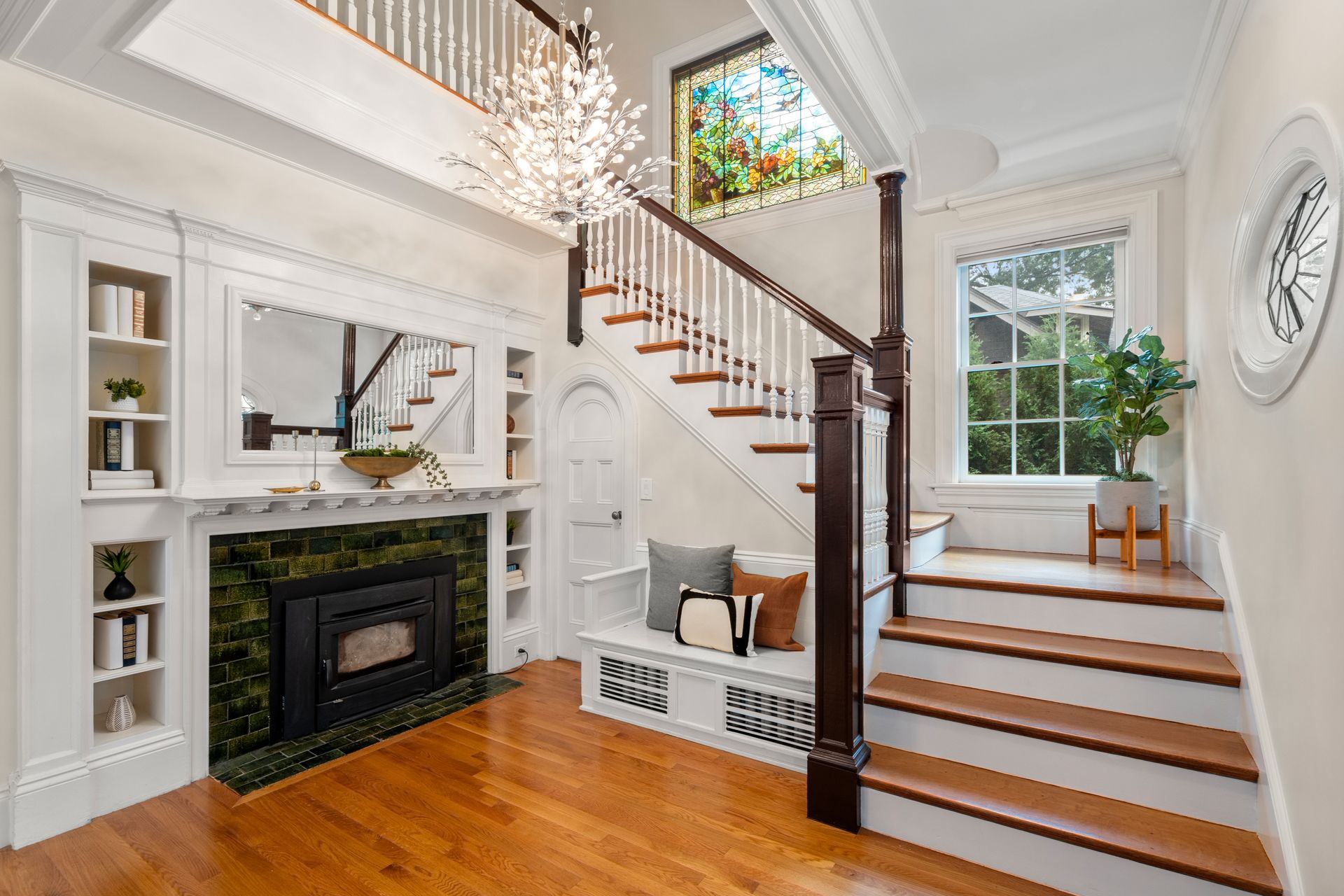 The first floor is designed with entertaining in mind. Step into the inviting foyer with a warm fireplace, setting the tone for the rest of the home. A spacious double room, currently used as a large dining area, can easily be reimagined as a formal living room. The cozy family room offers a comfortable spot to unwind, but it could also function as a more intimate dining room if you prefer. Hardwood floors run throughout the home and a convenient powder room completes the first level. A formal staircase with a beautiful stained glass window leads to the second floor, where you'll find three bedrooms and an oversized primary suite with a full bathroom and walk in closet. A back staircase offers easy access to the first floor and a second staircase takes you up to the expansive third floor. Here, the possibilities are endless: a fifth bedroom, craft or art studio, a game or lounging room and a peaceful yoga or meditation space, complemented by a full bath.