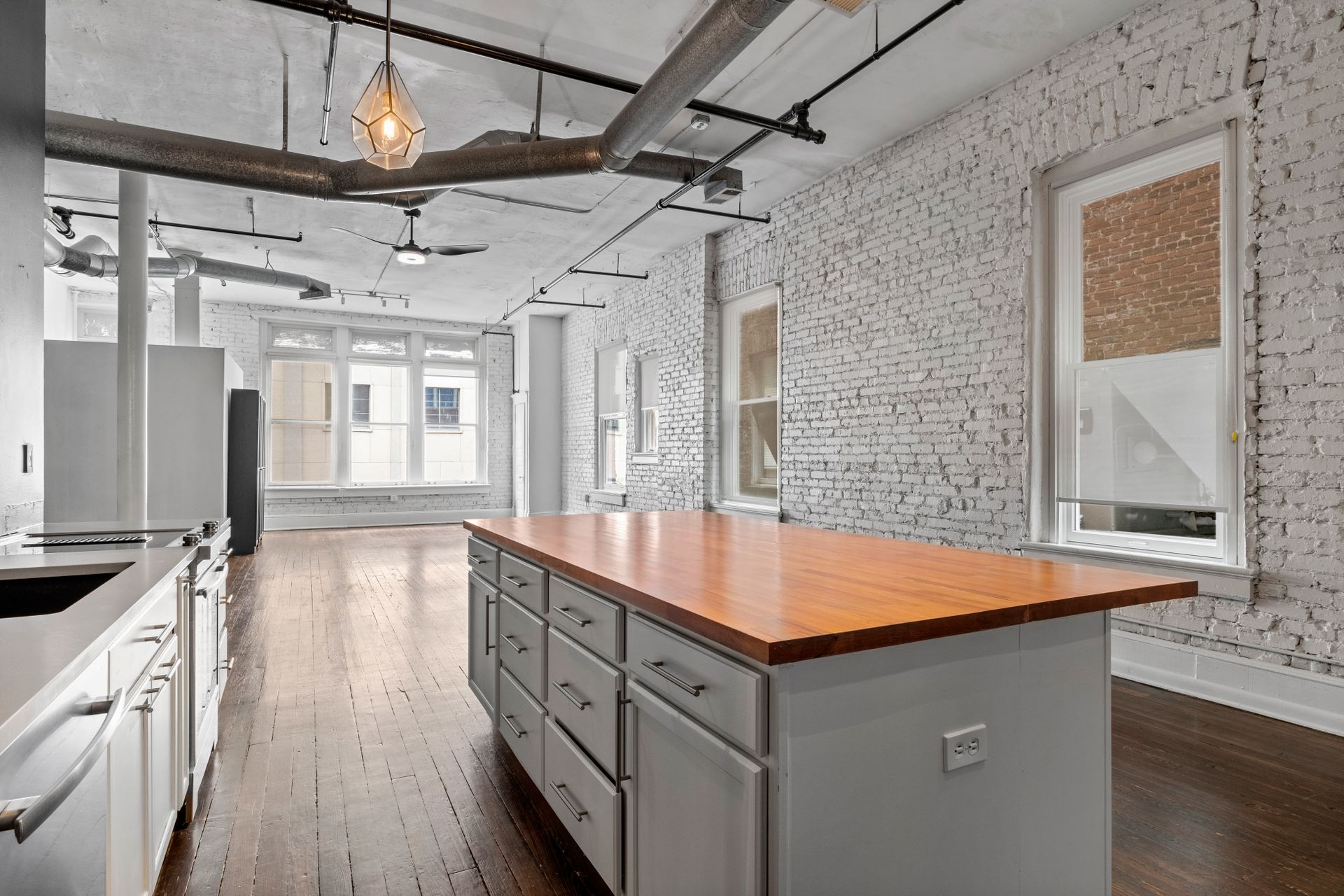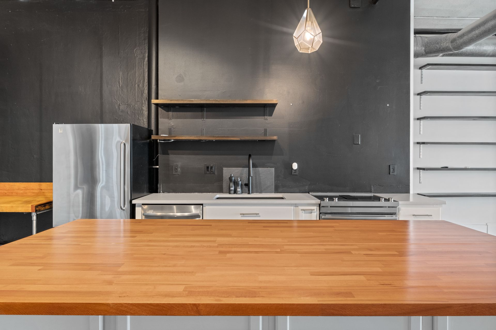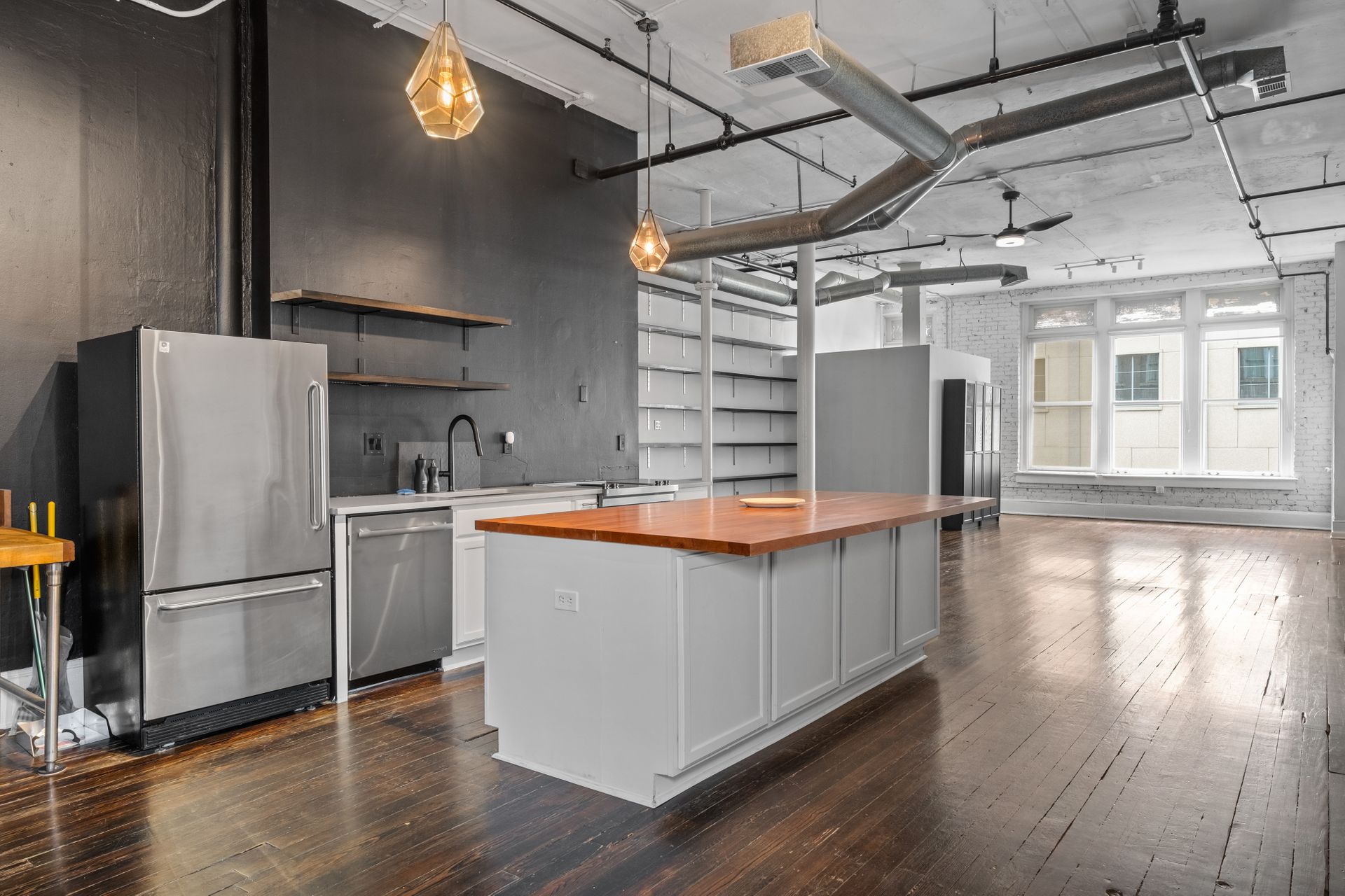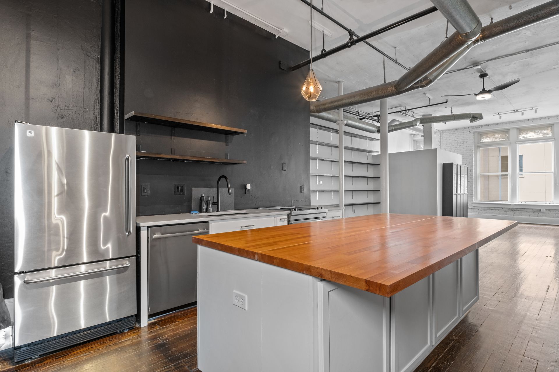 The loft boasts a spacious open floor plan with a chef's kitchen that includes solid surface counters, ample cabinet and counter space, high-end appliances, and an island with bar seating. A bonus loft area with a mobile staircase offers additional storage for infrequently used items. There is an off-street single parking space in a gated, secure lot conveniently located near the unit.