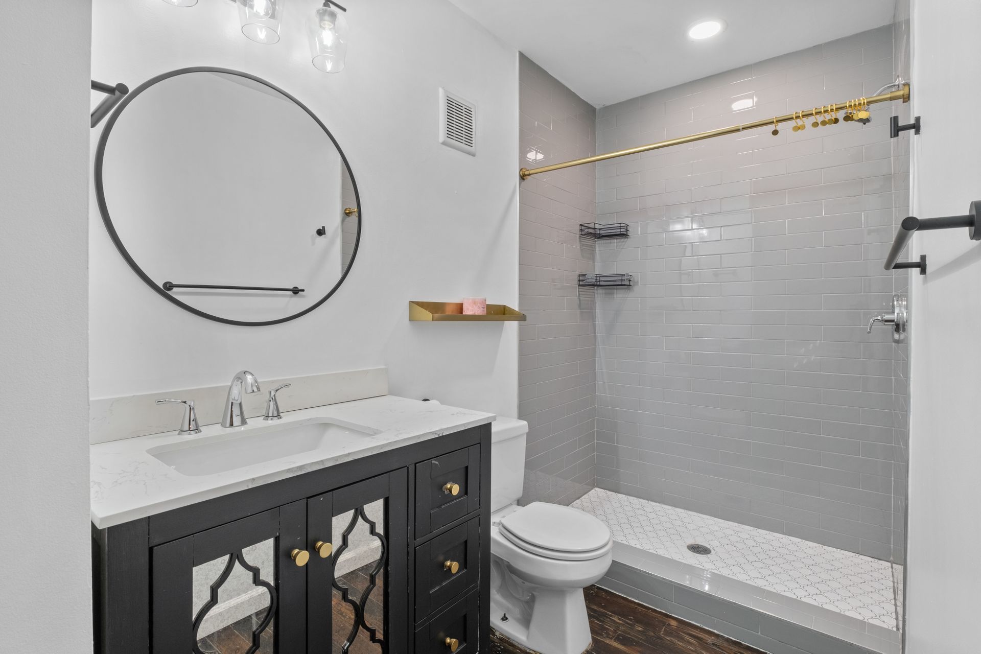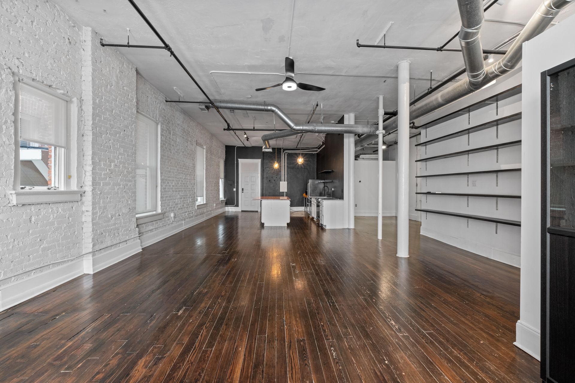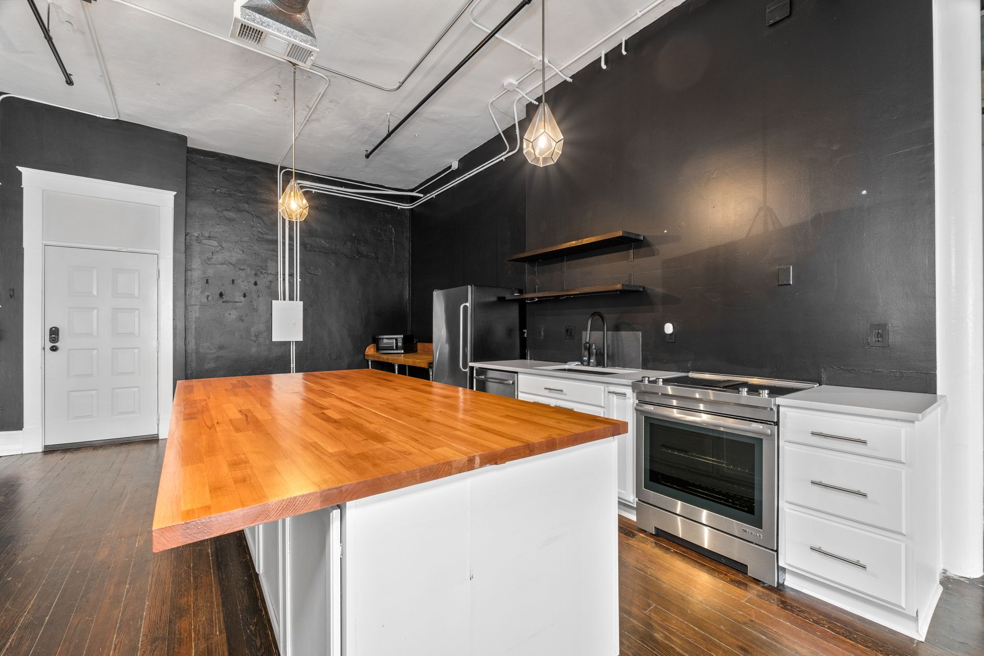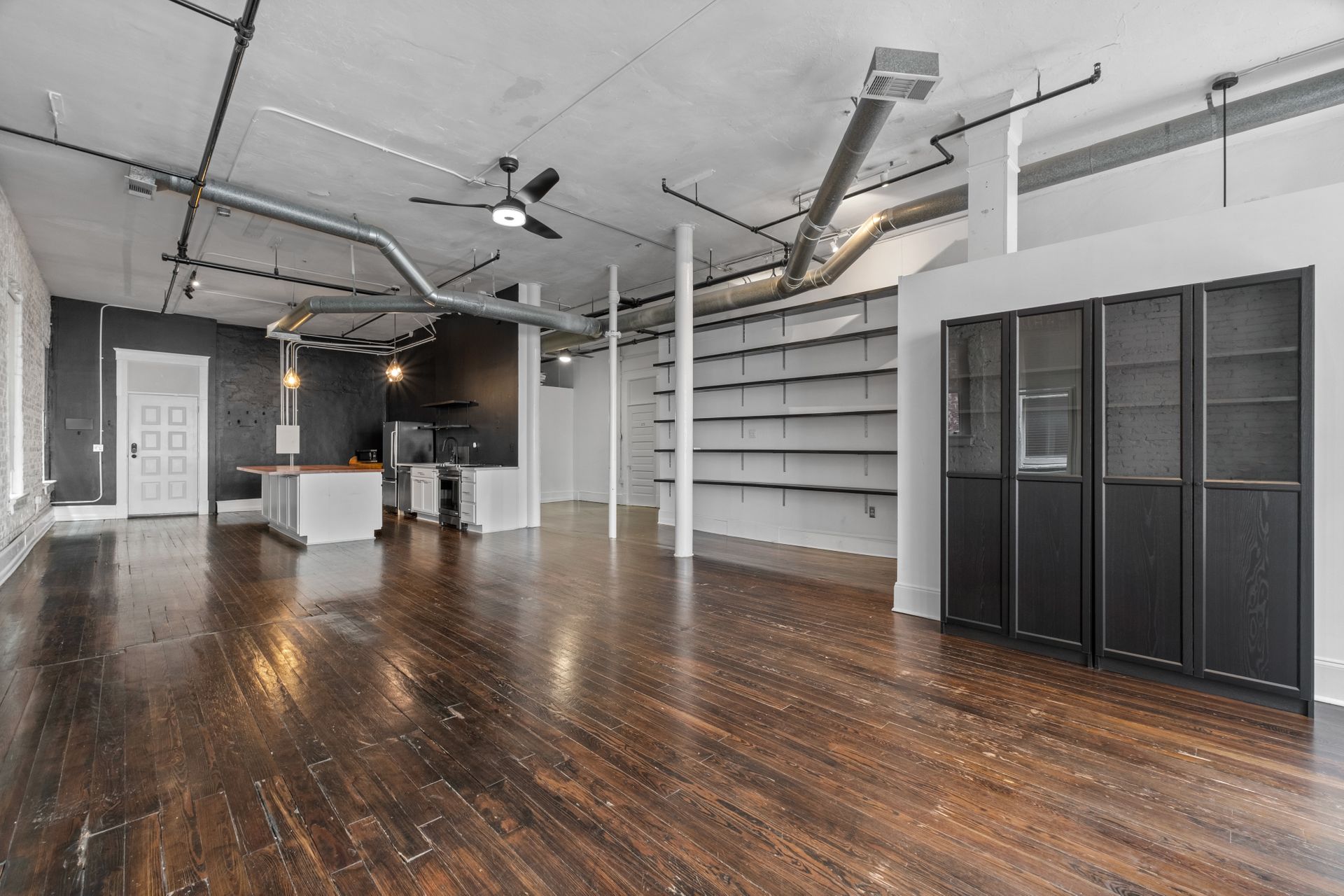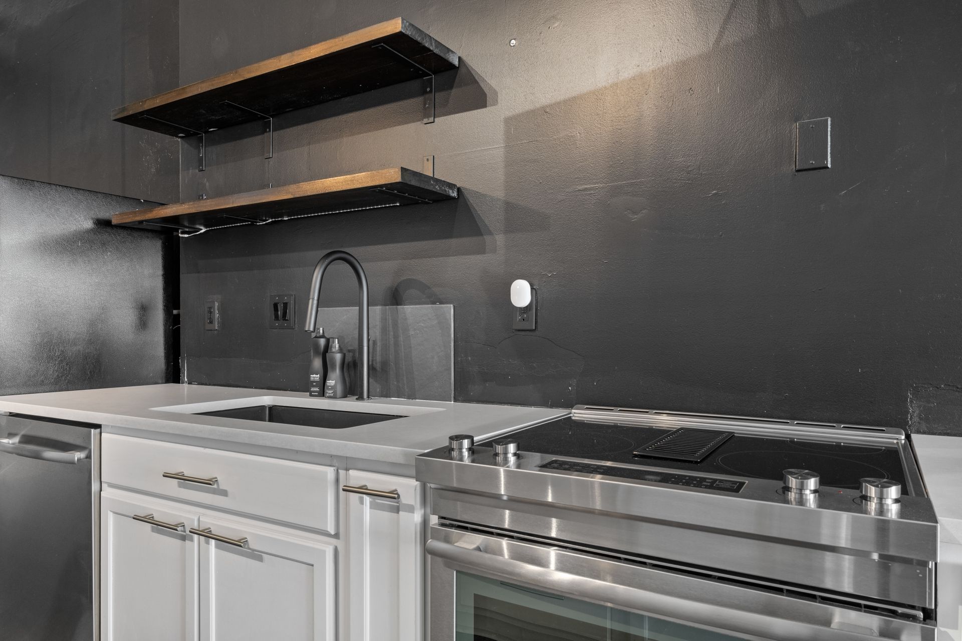 The loft boasts a spacious open floor plan with a chef's kitchen that includes solid surface counters, ample cabinet and counter space, high-end appliances, and an island with bar seating. A bonus loft area with a mobile staircase offers additional storage for infrequently used items. There is an off-street single parking space in a gated, secure lot conveniently located near the unit.