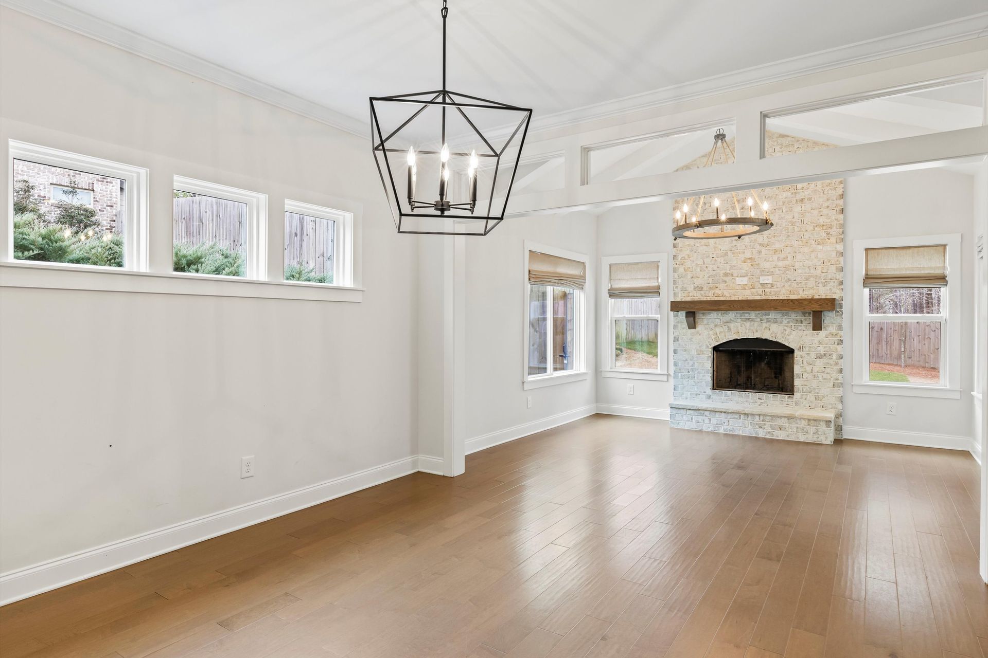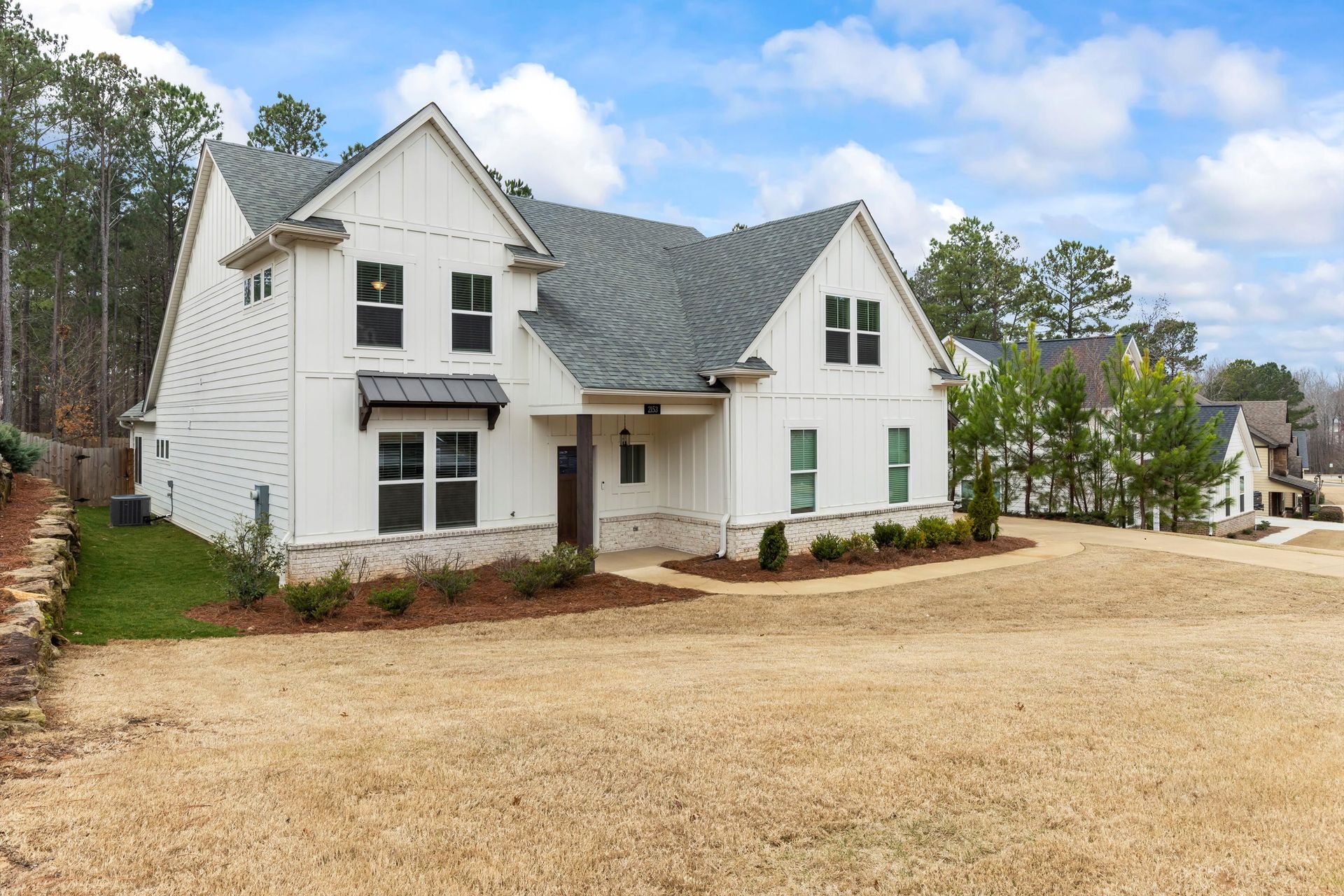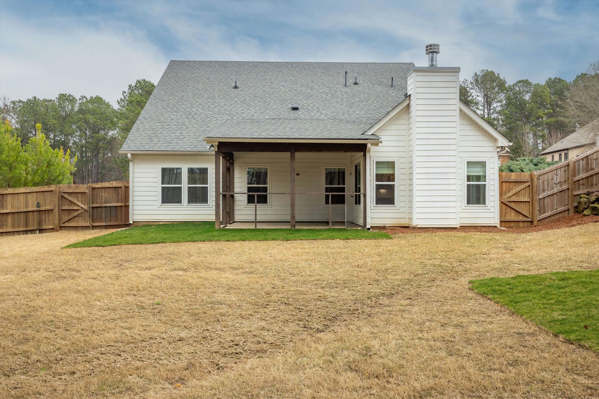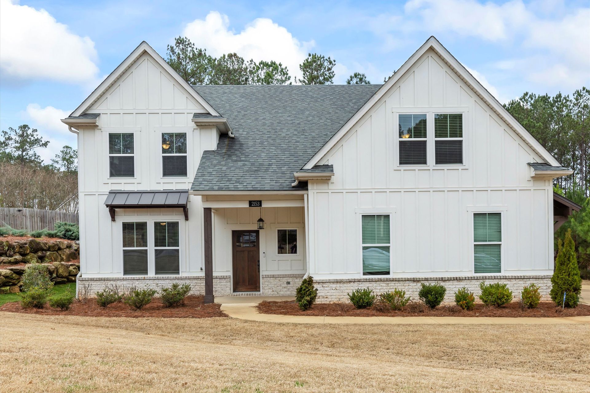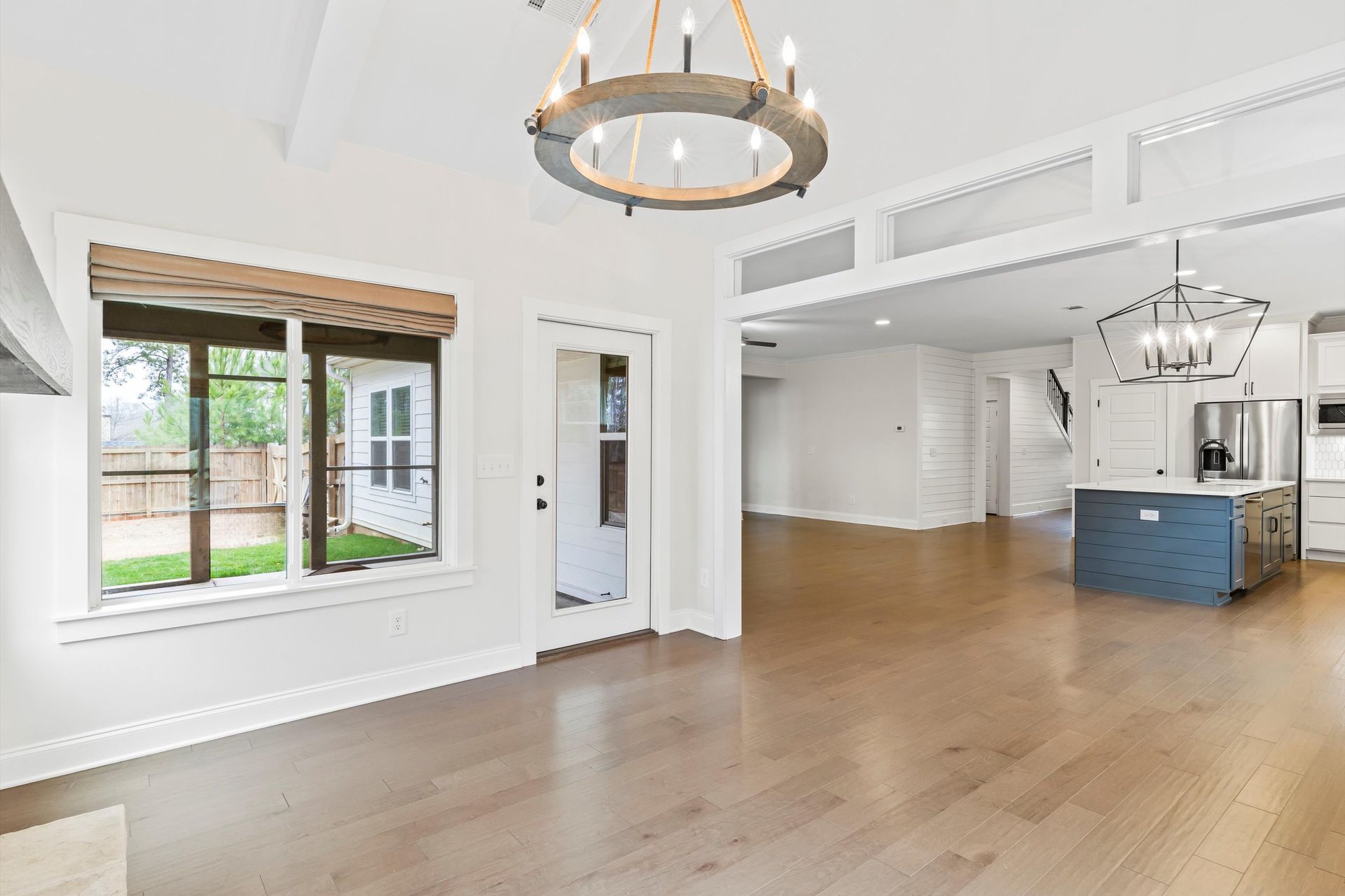 This approximately 2,760 square foot house offers four bedrooms and three bathrooms. The spacious exterior features charming landscaping, while the inviting entryway leads to a bright, open layout with hardwood flooring throughout. The primary bedroom on the main level provides ample space, complemented by abundant natural light. The kitchen provides sleek countertops, modern appliances, and abundant cabinetry for storage. Vaulted ceilings and a spacious patio create a sense of grandeur, while the lush, peaceful wooded setting provides a serene backdrop. The home also includes a covered porch, fenced-in yard, open concept design, a two-car garage, and an elegant staircase with bright lighting.
