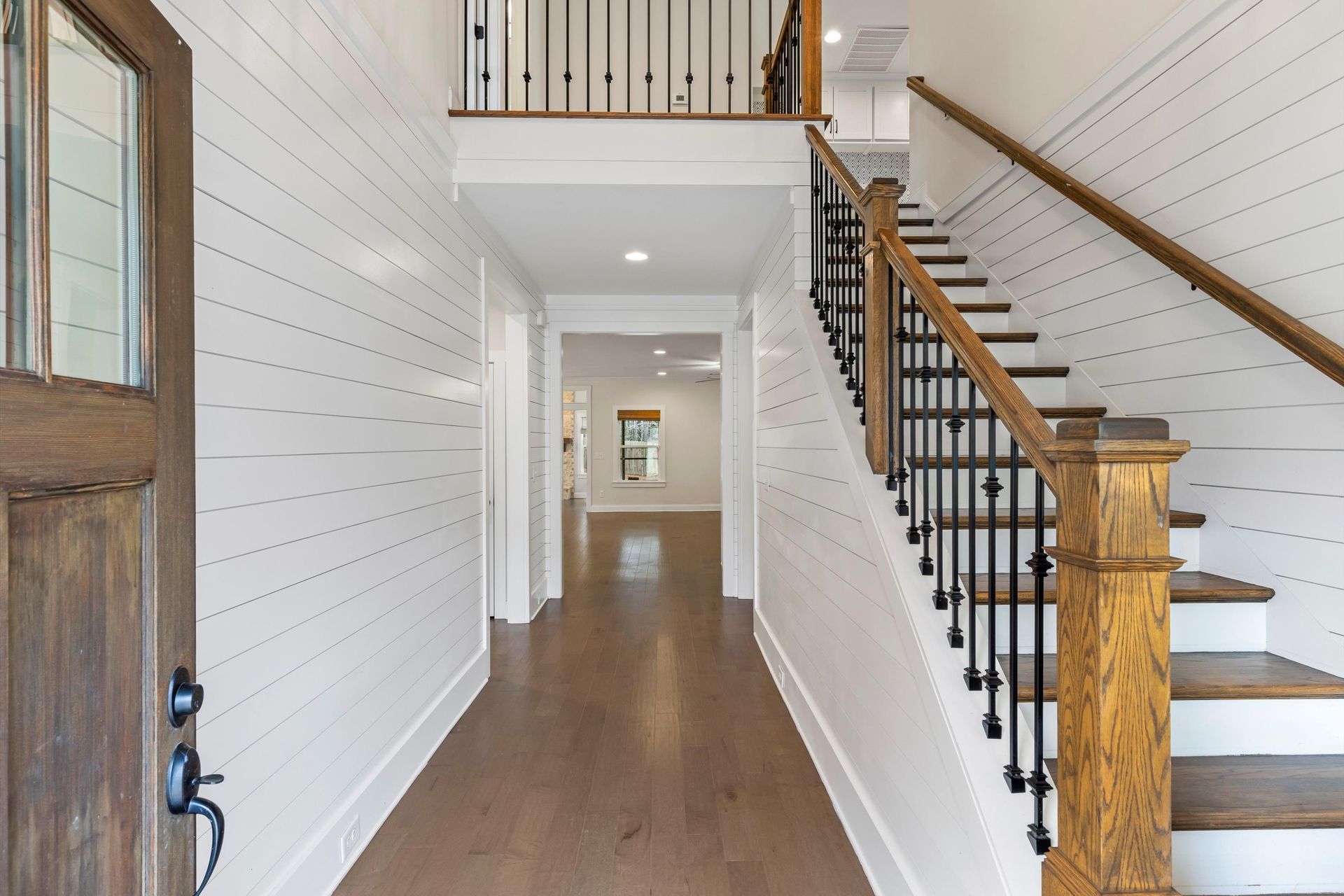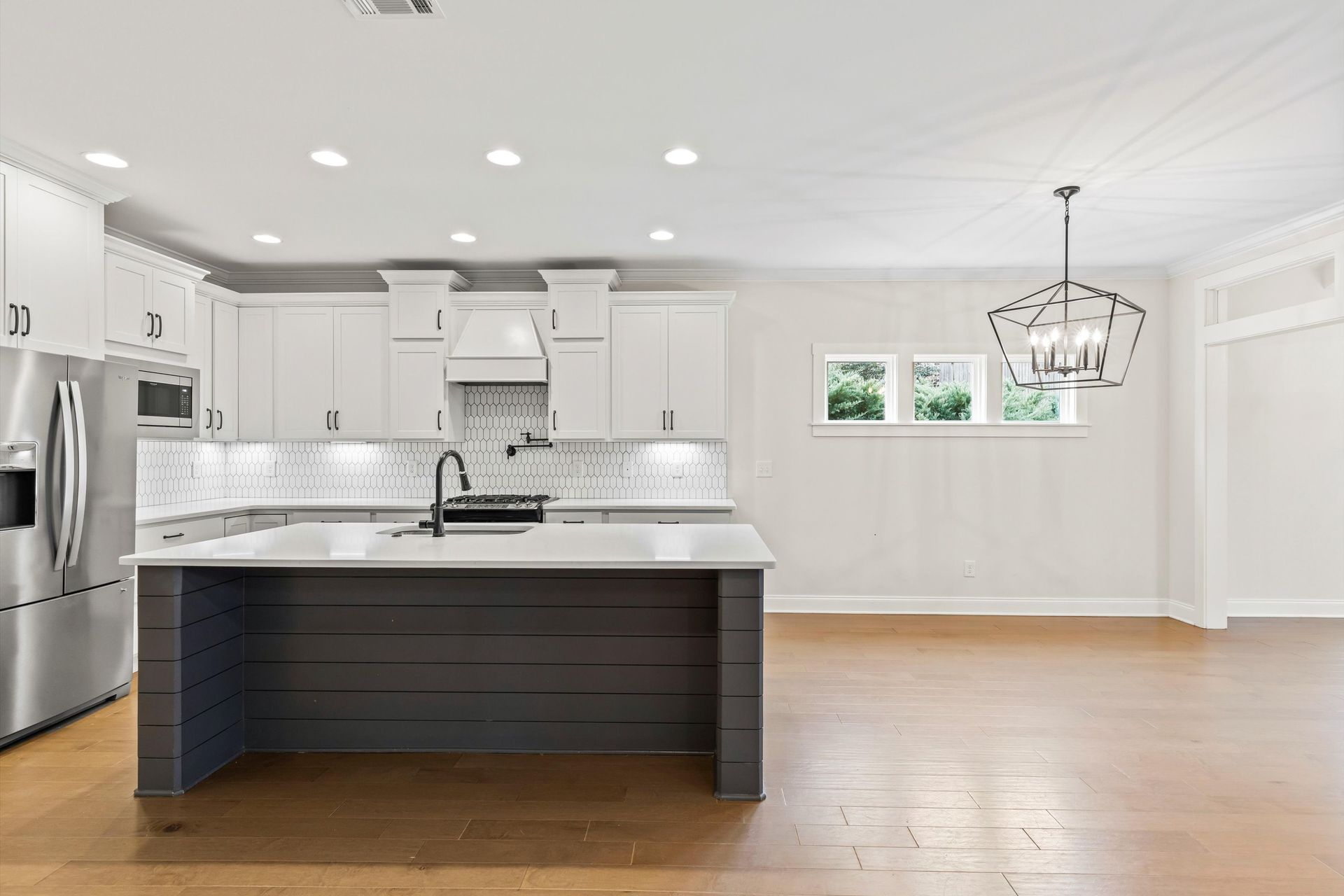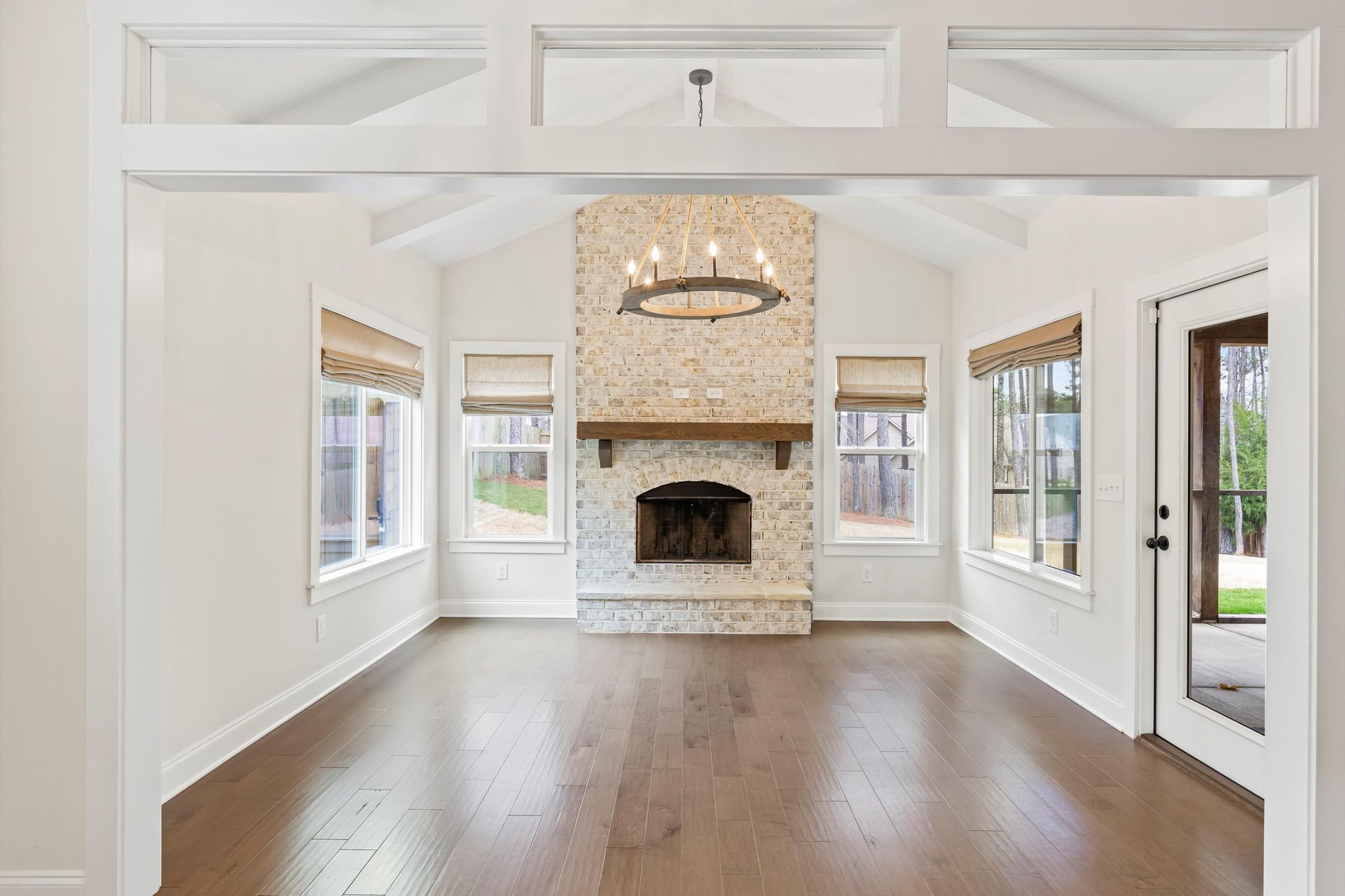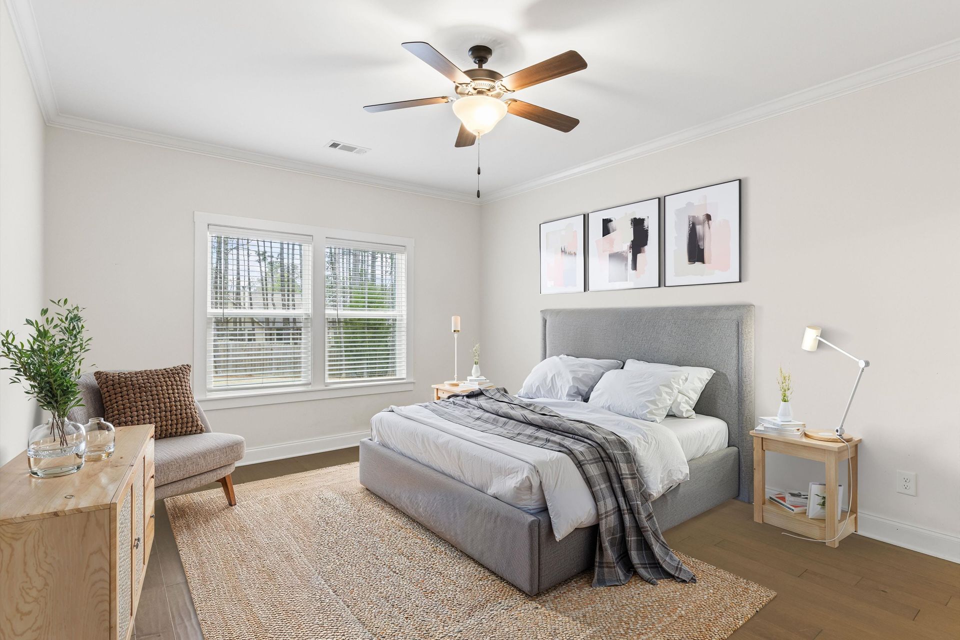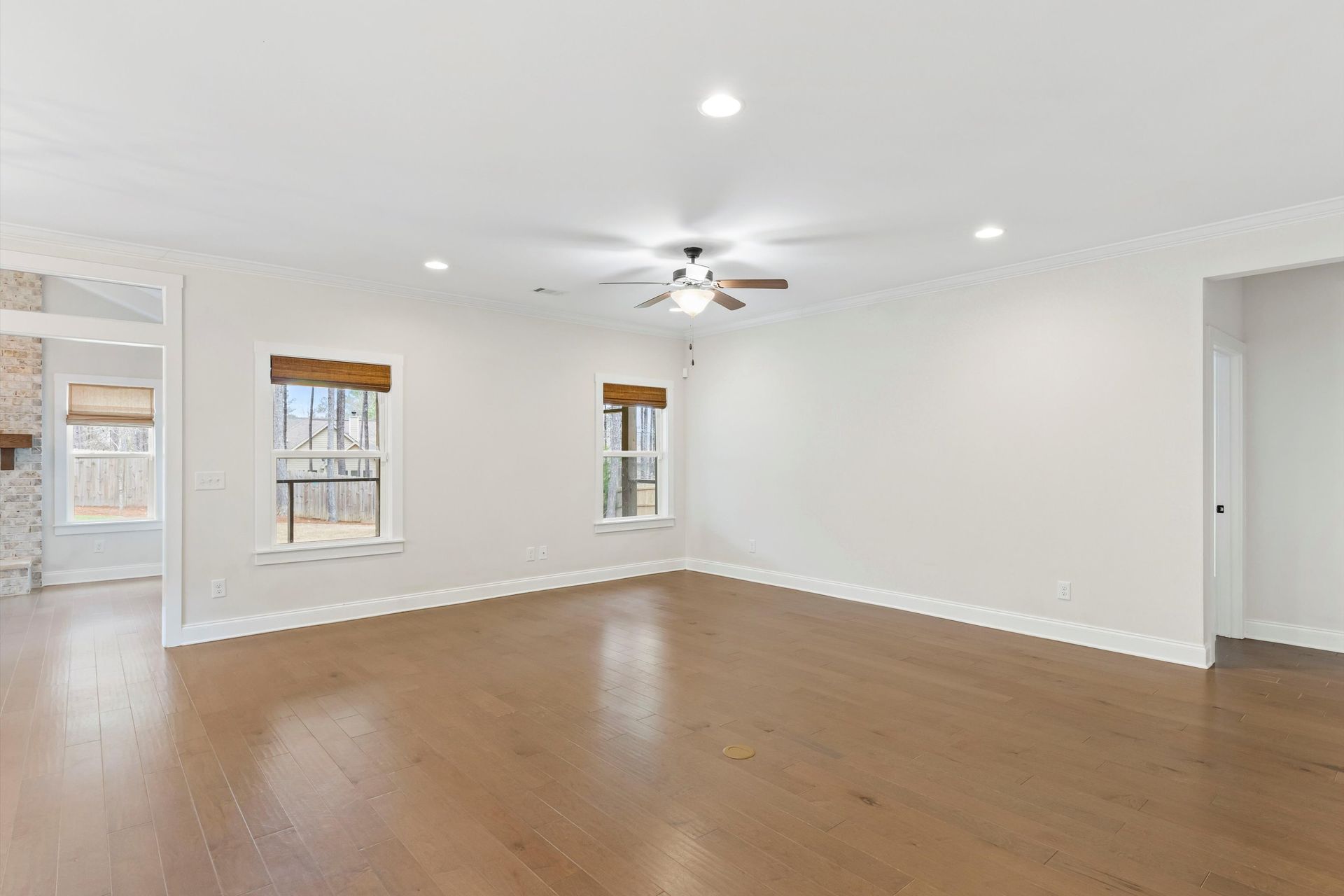 This approximately 2,760 square foot house offers four bedrooms and three bathrooms. The spacious exterior features charming landscaping, while the inviting entryway leads to a bright, open layout with hardwood flooring throughout. The primary bedroom on the main level provides ample space, complemented by abundant natural light. The kitchen provides sleek countertops, modern appliances, and abundant cabinetry for storage. Vaulted ceilings and a spacious patio create a sense of grandeur, while the lush, peaceful wooded setting provides a serene backdrop. The home also includes a covered porch, fenced-in yard, open concept design, a two-car garage, and an elegant staircase with bright lighting.