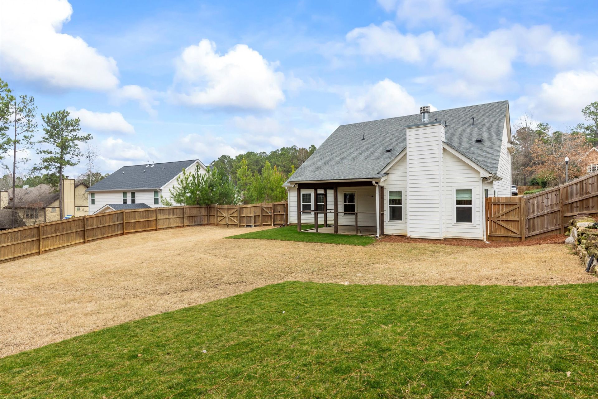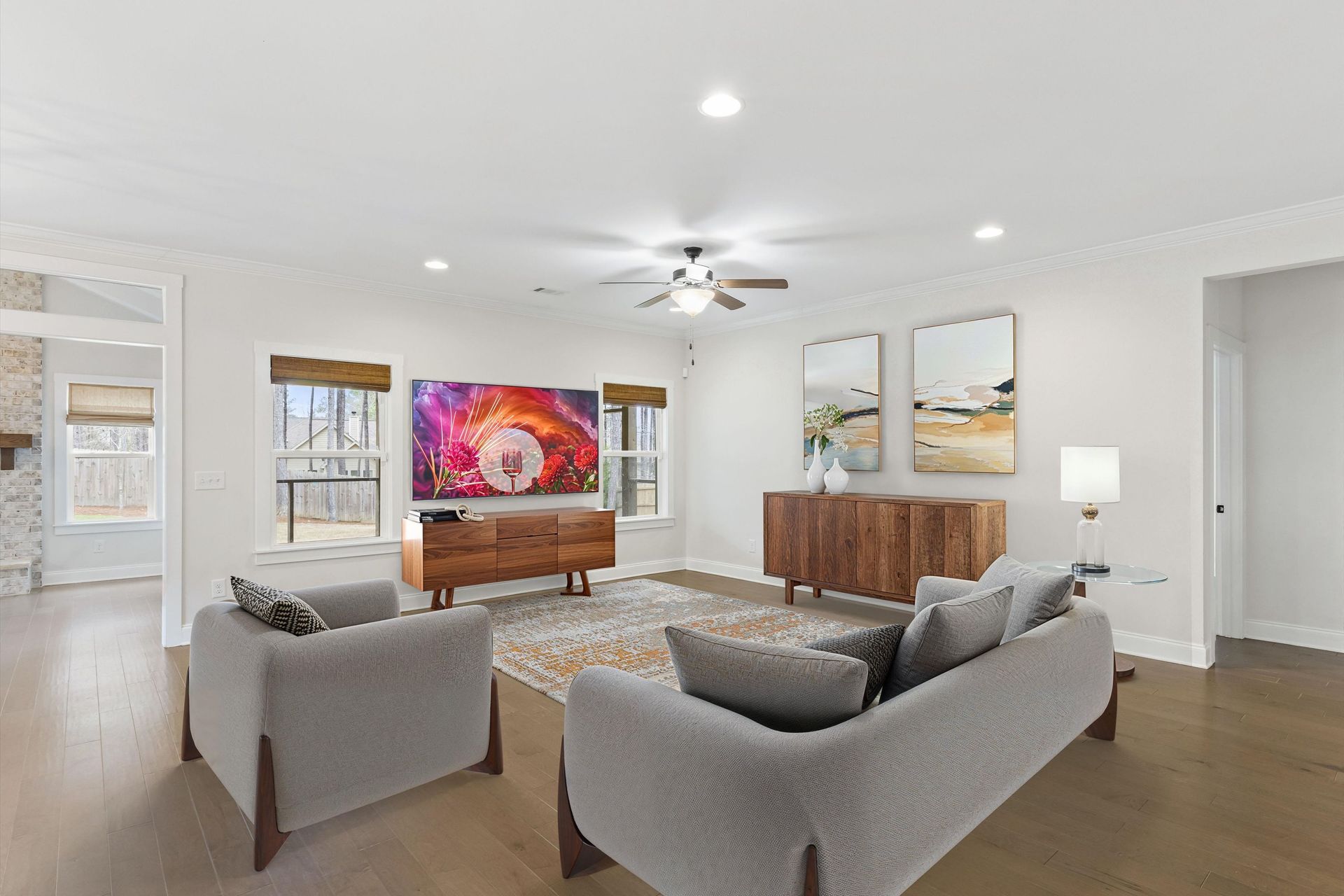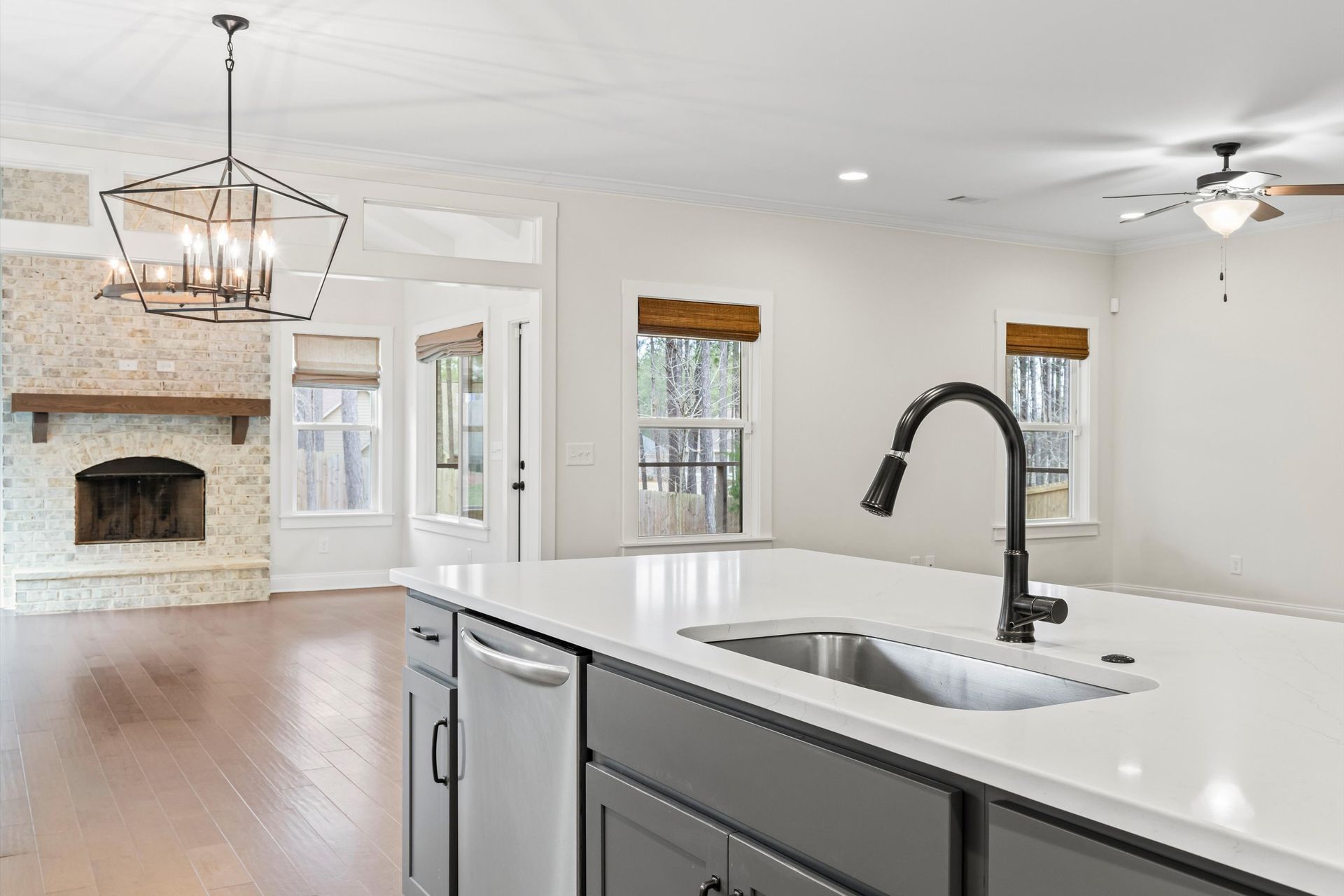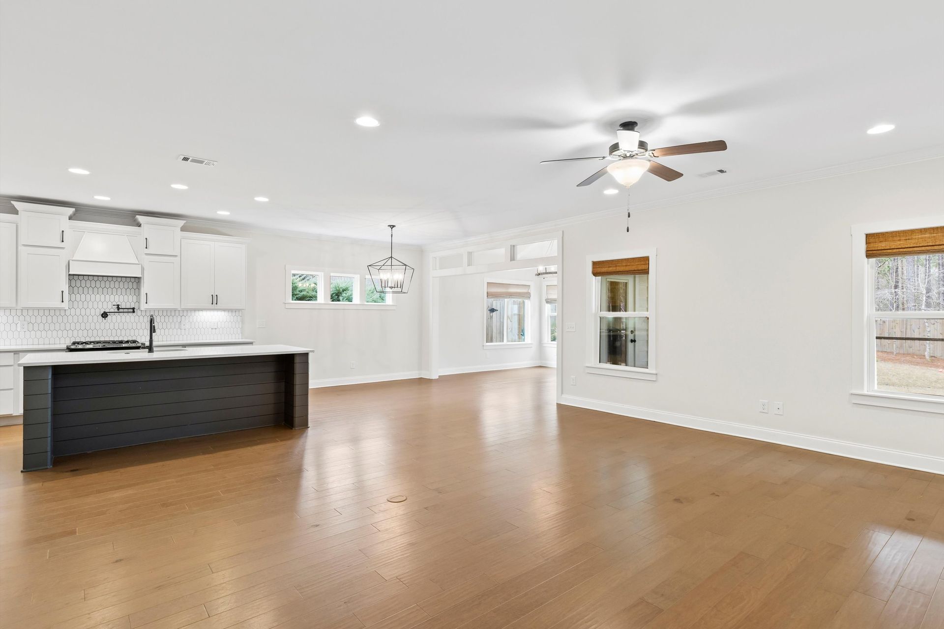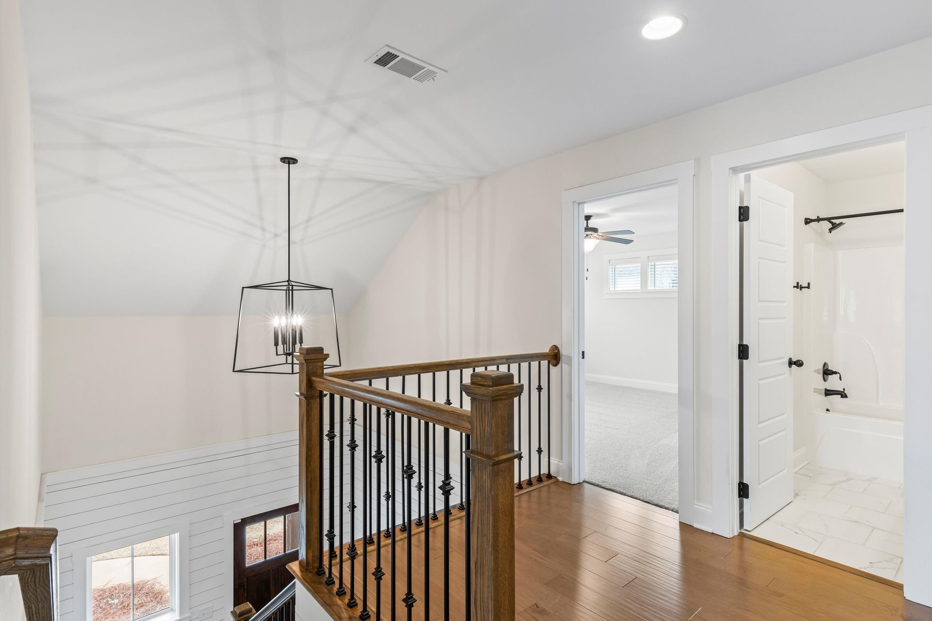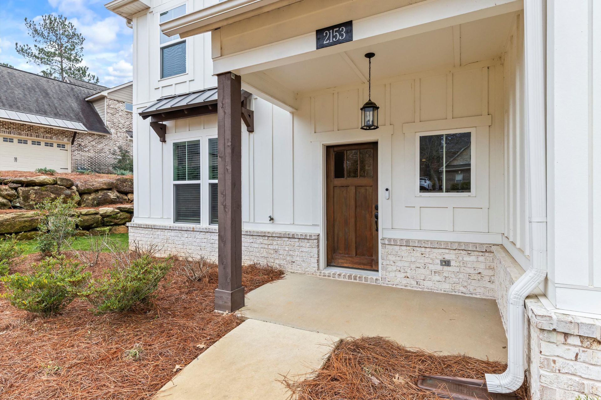 This approximately 2,760 square foot house offers four bedrooms and three bathrooms. The spacious exterior features charming landscaping, while the inviting entryway leads to a bright, open layout with hardwood flooring throughout. The primary bedroom on the main level provides ample space, complemented by abundant natural light. The kitchen provides sleek countertops, modern appliances, and abundant cabinetry for storage. Vaulted ceilings and a spacious patio create a sense of grandeur, while the lush, peaceful wooded setting provides a serene backdrop. The home also includes a covered porch, fenced-in yard, open concept design, a two-car garage, and an elegant staircase with bright lighting.