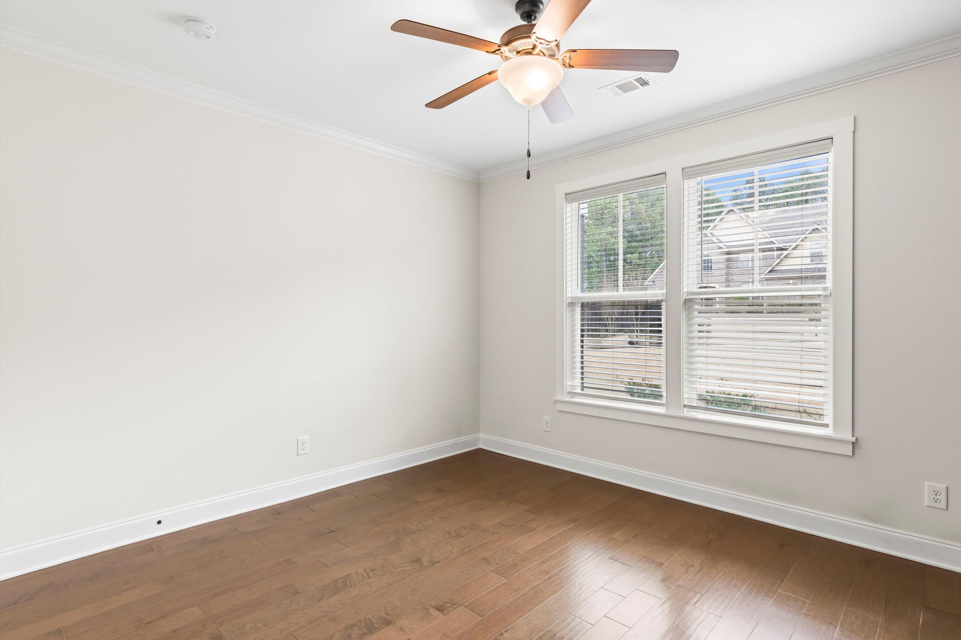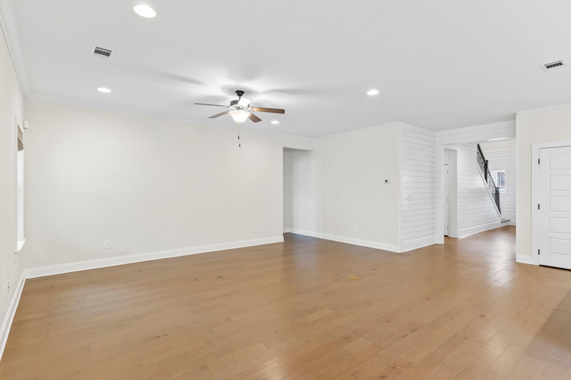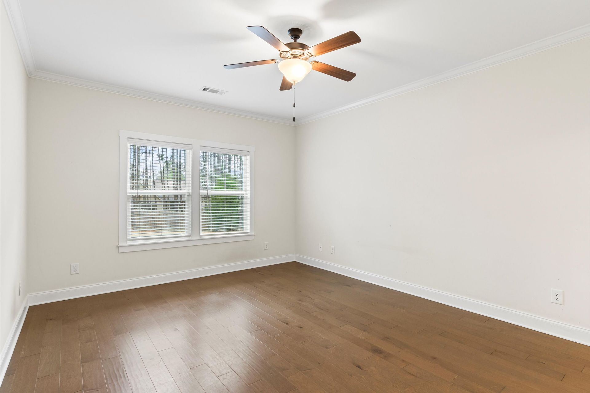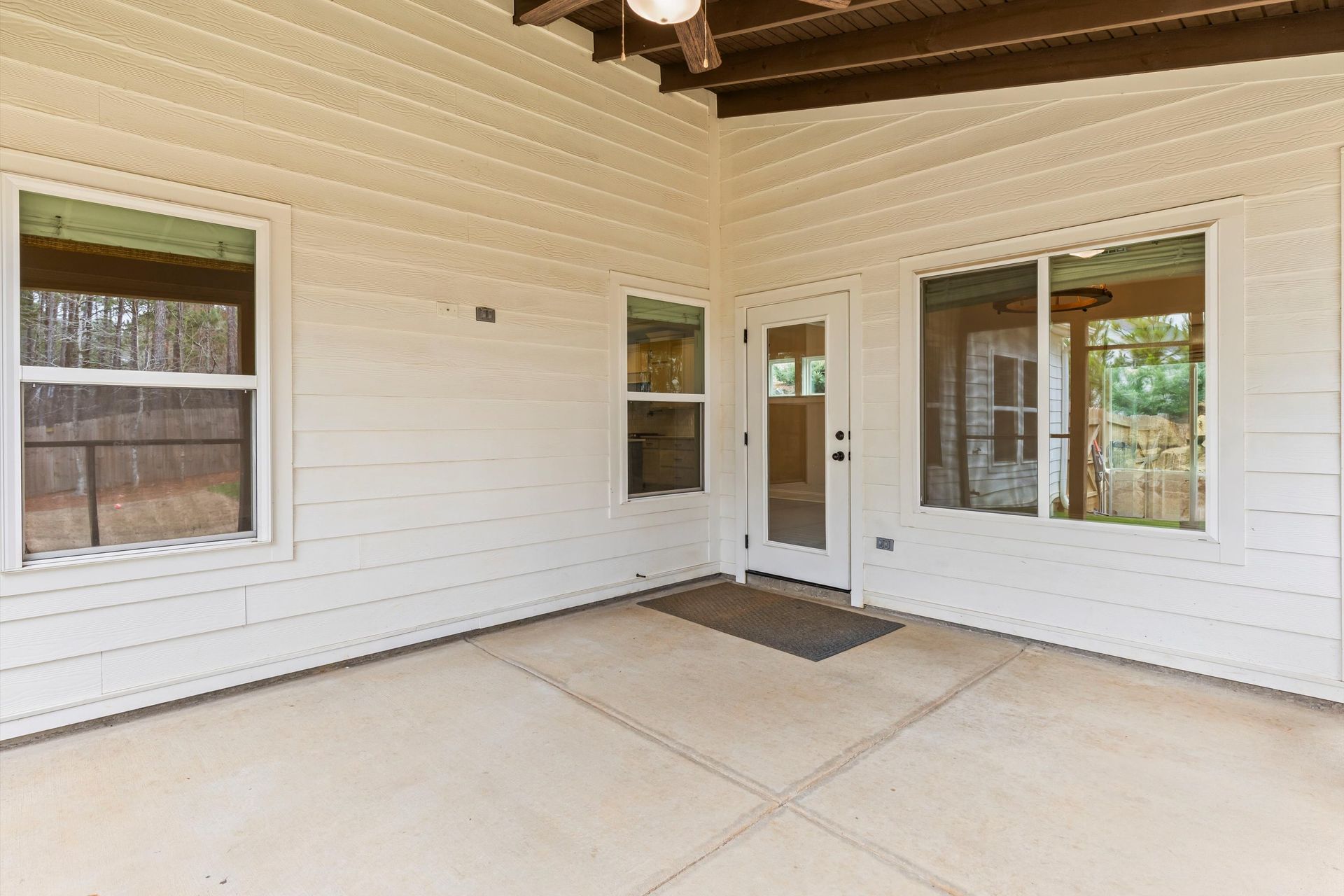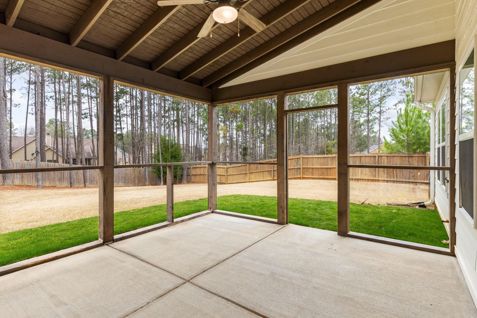 This approximately 2,760 square foot house offers four bedrooms and three bathrooms. The spacious exterior features charming landscaping, while the inviting entryway leads to a bright, open layout with hardwood flooring throughout. The primary bedroom on the main level provides ample space, complemented by abundant natural light. The kitchen provides sleek countertops, modern appliances, and abundant cabinetry for storage. Vaulted ceilings and a spacious patio create a sense of grandeur, while the lush, peaceful wooded setting provides a serene backdrop. The home also includes a covered porch, fenced-in yard, open concept design, a two-car garage, and an elegant staircase with bright lighting.