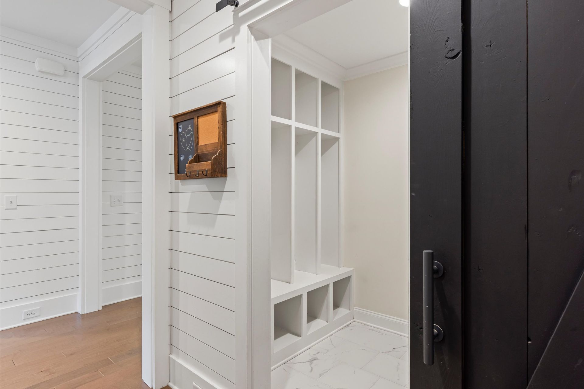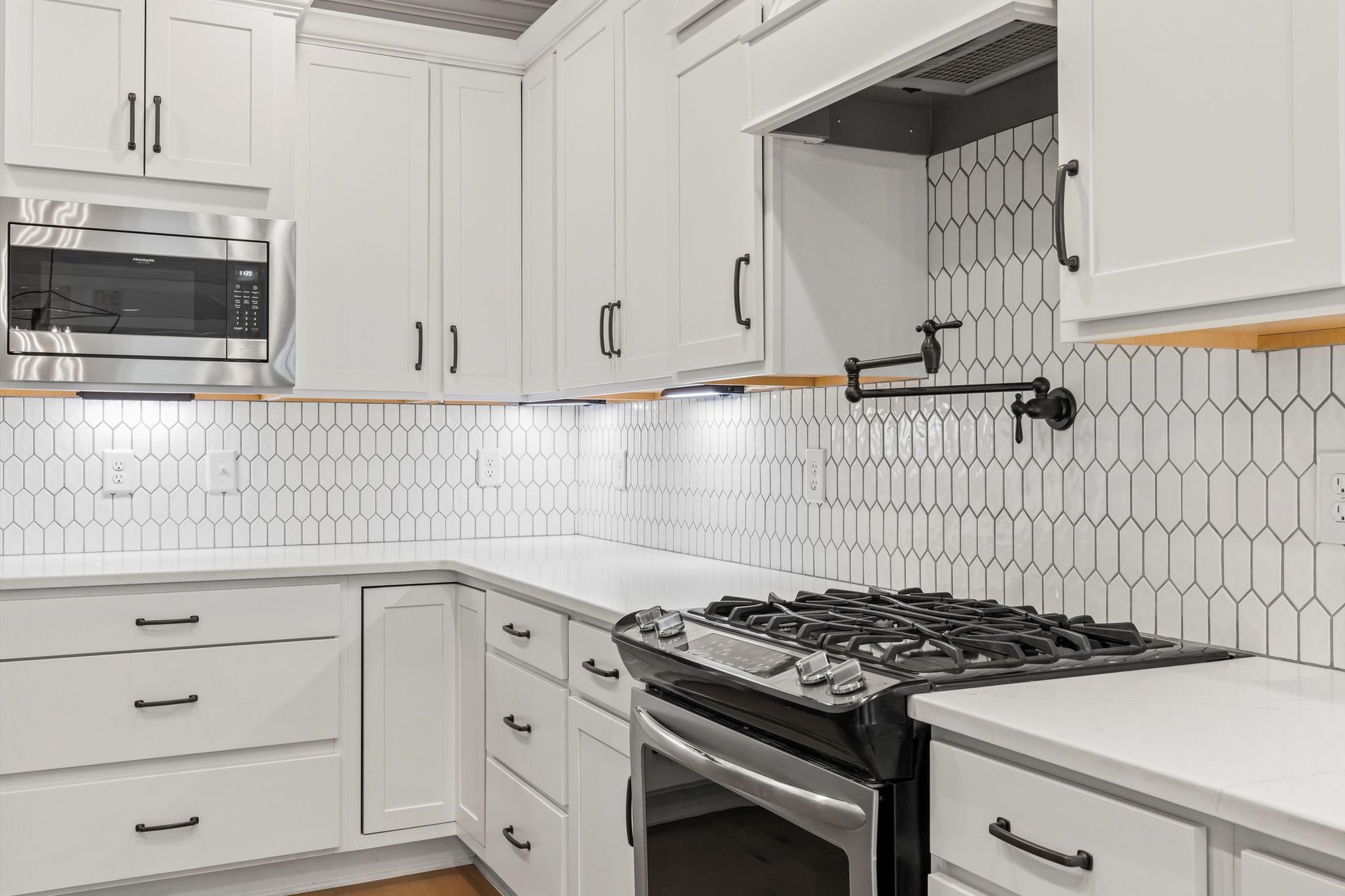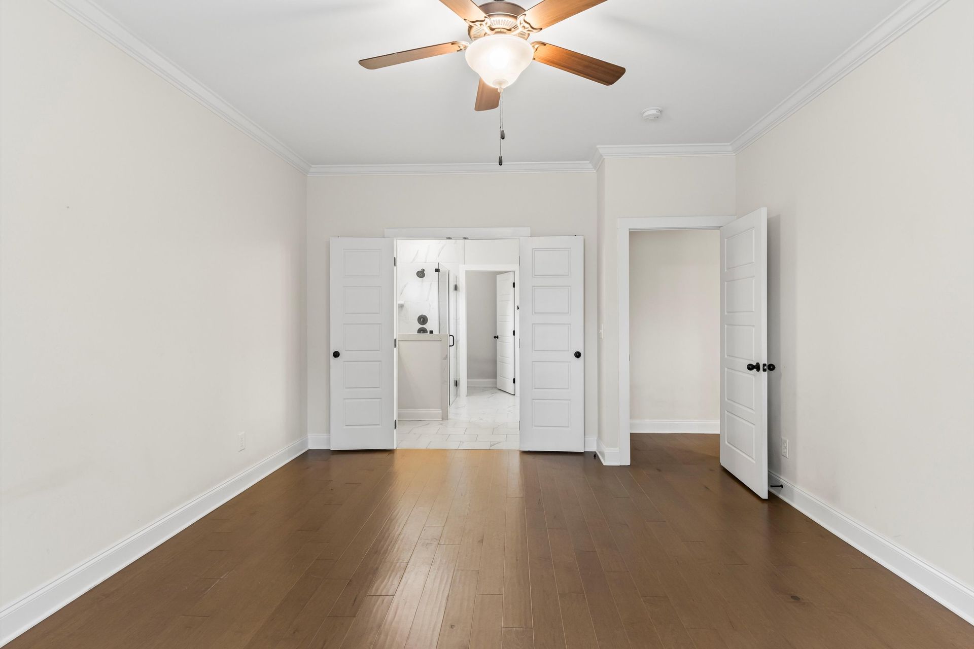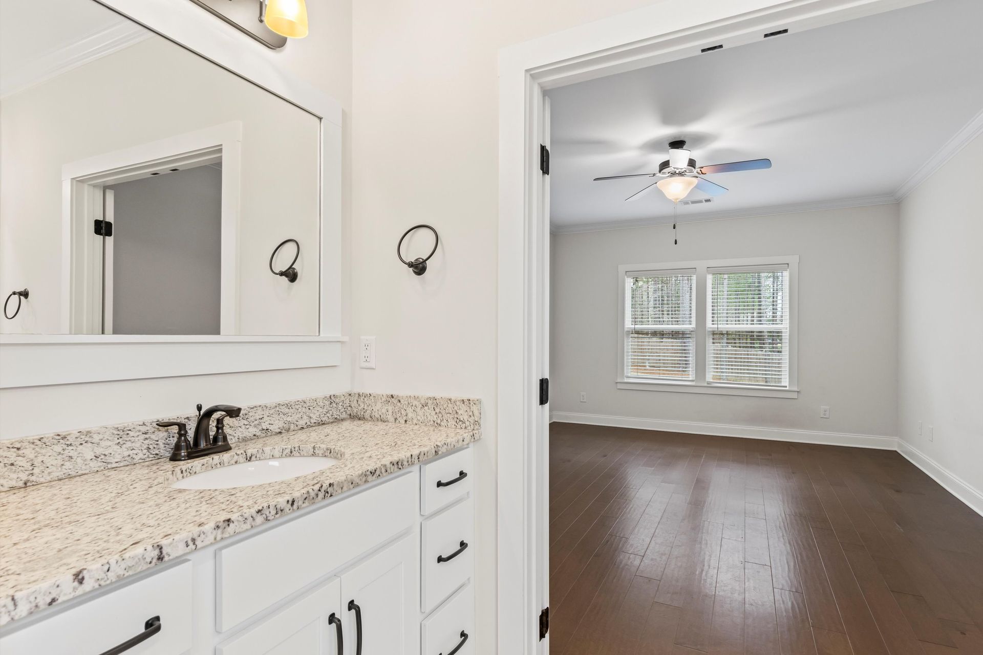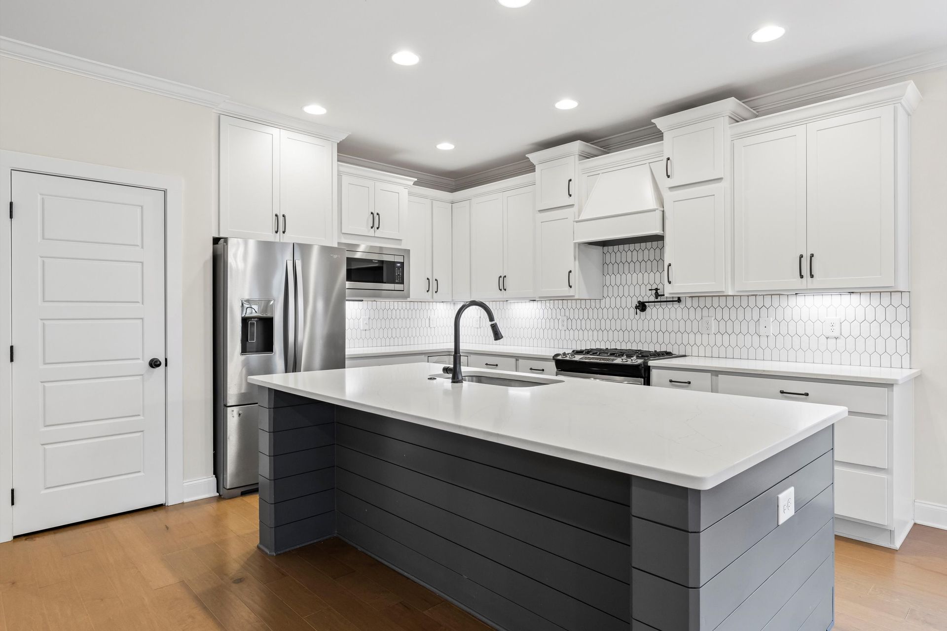 This approximately 2,760 square foot house offers four bedrooms and three bathrooms. The spacious exterior features charming landscaping, while the inviting entryway leads to a bright, open layout with hardwood flooring throughout. The primary bedroom on the main level provides ample space, complemented by abundant natural light. The kitchen provides sleek countertops, modern appliances, and abundant cabinetry for storage. Vaulted ceilings and a spacious patio create a sense of grandeur, while the lush, peaceful wooded setting provides a serene backdrop. The home also includes a covered porch, fenced-in yard, open concept design, a two-car garage, and an elegant staircase with bright lighting.