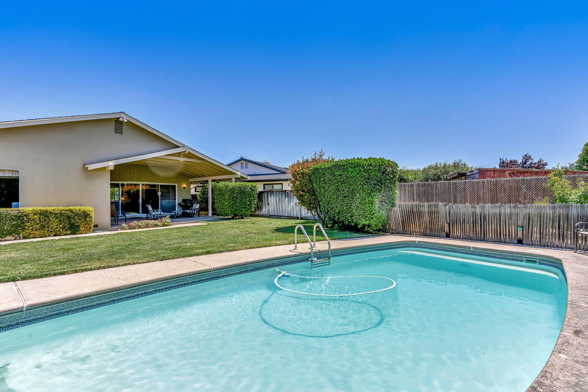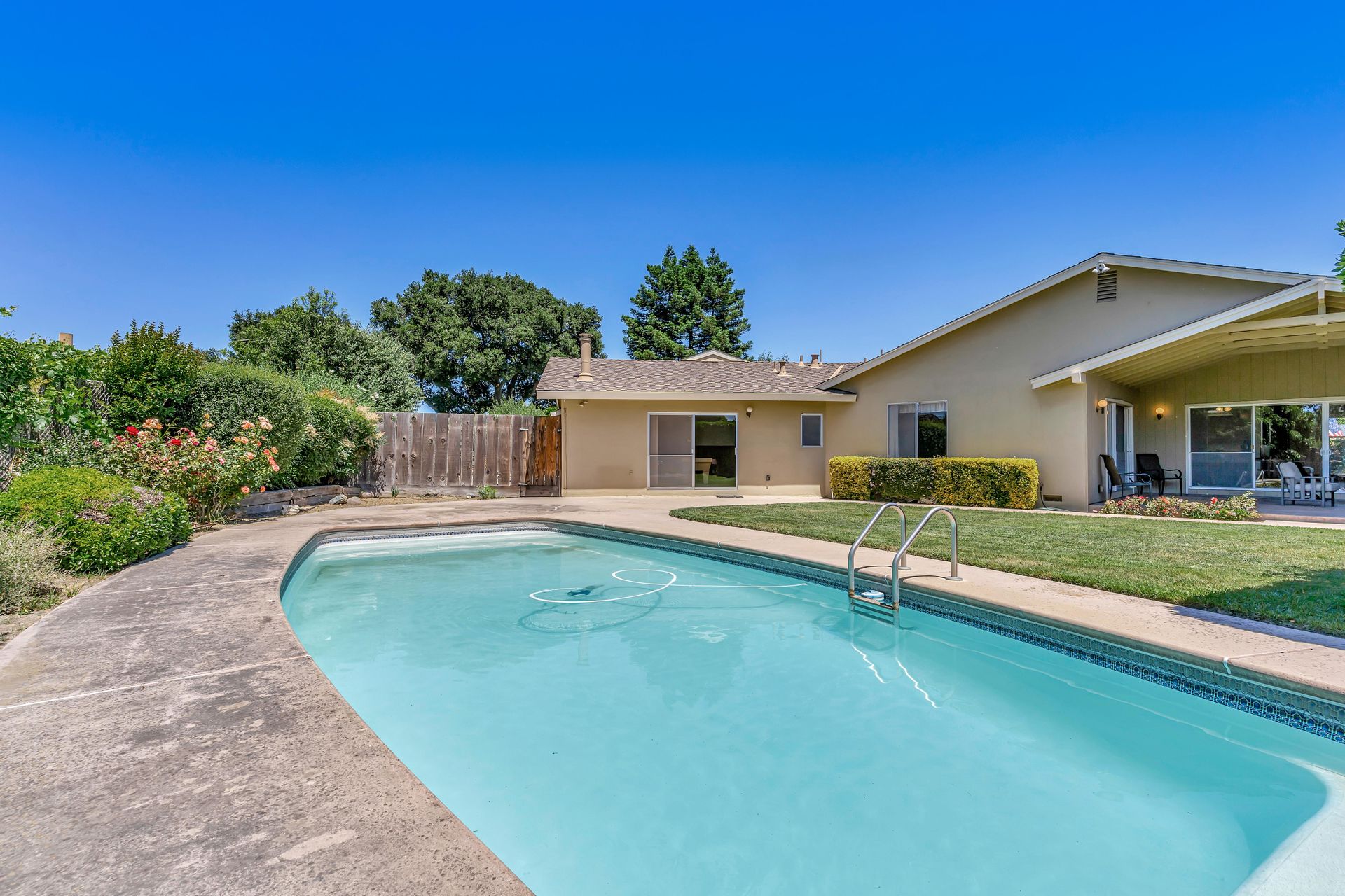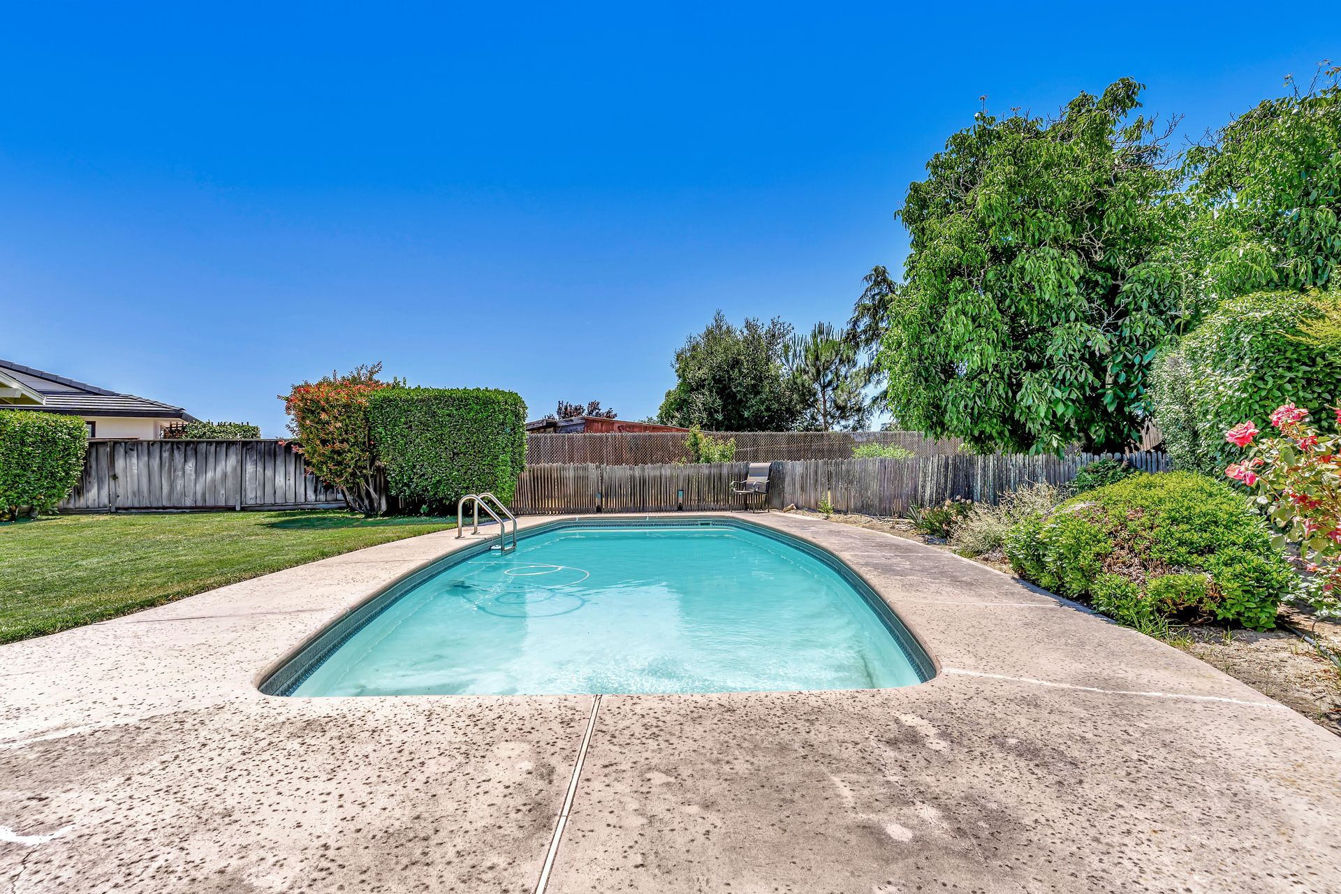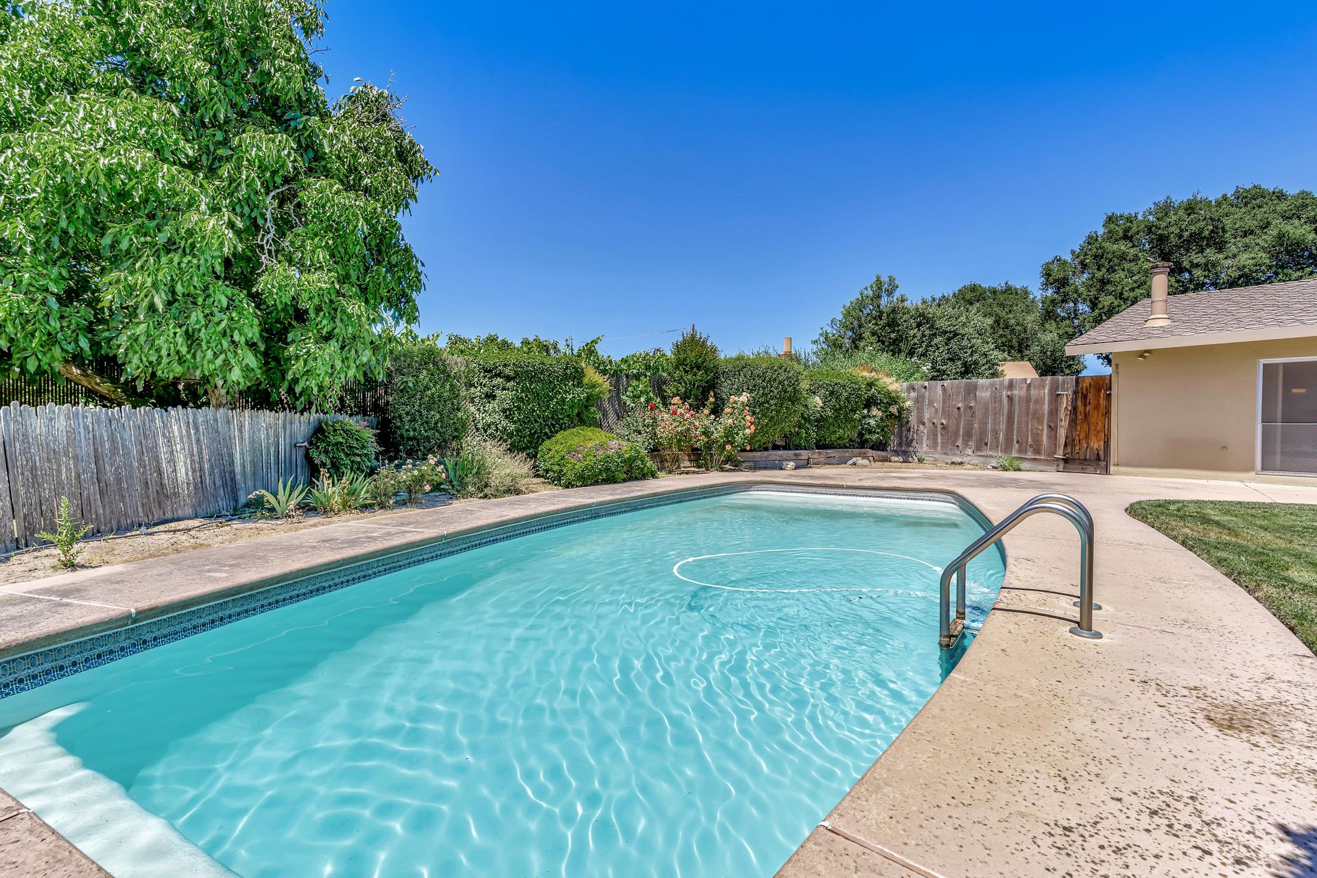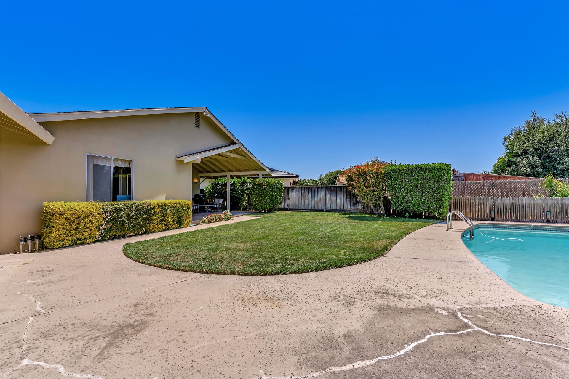 Welcome to Grove Place, a cul-de-sac in the heart of King City known for its curb appeal! On a large 12,000 square foot lot at the end of the street, this three-bed, three-bath single-story home is a roomy 2,573 square foot home with a pool! The large living room features a gas-insert fireplace and floor-to-ceiling windows that flow into the backyard. The primary bedroom has room for a sitting area, reading nook, or desk space. The roomy second bedroom and third front bedroom enjoy plenty of natural light. The spacious permitted bonus room is ideal for parties, recreation, or a separate living area. The covered patio is primed for entertaining during your pool parties, barbecues, and horseshoe games. The side yard is a blank slate for raised beds, a greenhouse, or even a small ADU (buyer to verify). The exterior is tastefully landscaped with front and back lawns, foliage, colorful roses, and fruit trees. The two-car garage features ample wall storage, a work bench area, and a separate storage room. Solar saves you money on electric bills!