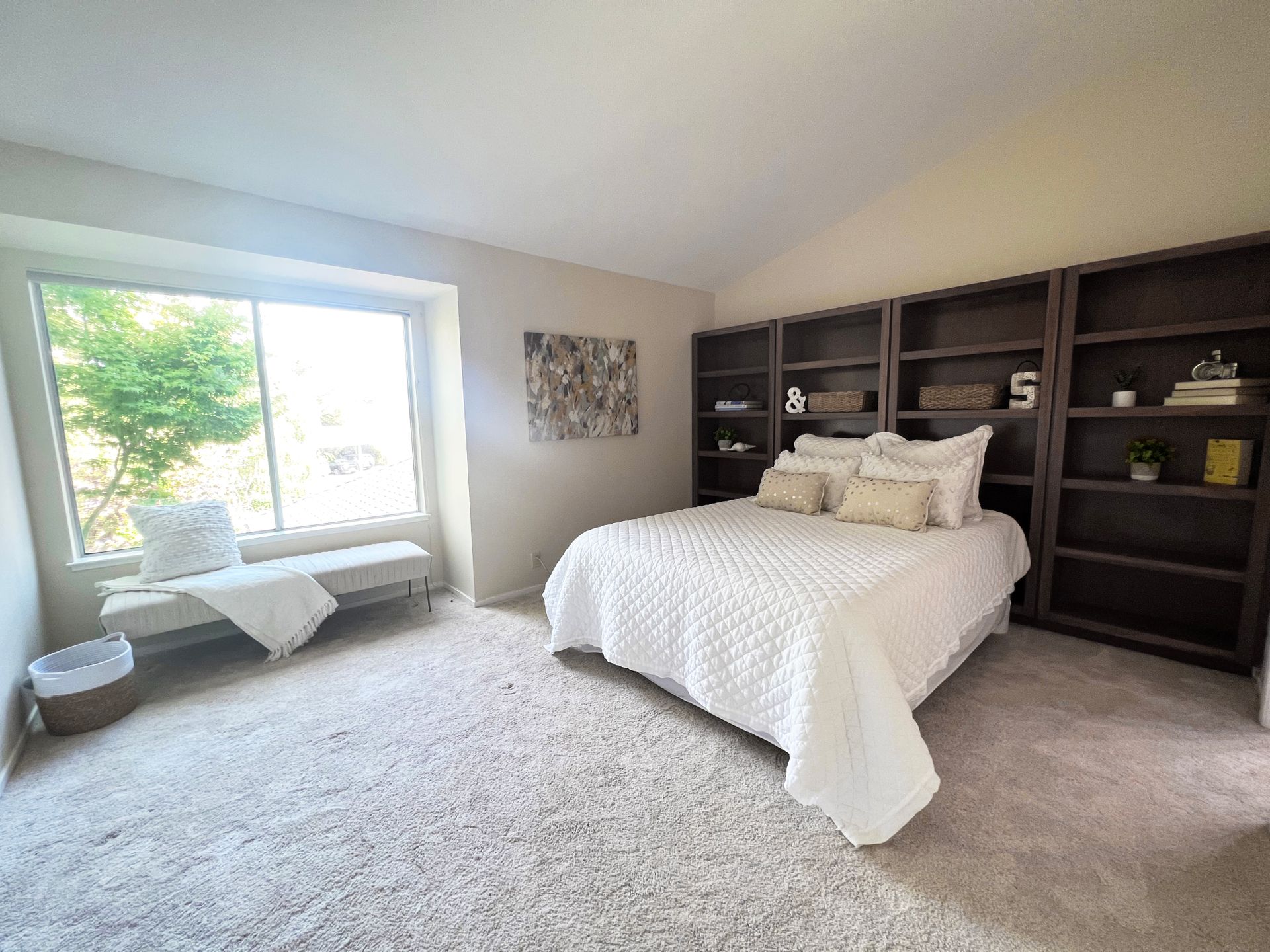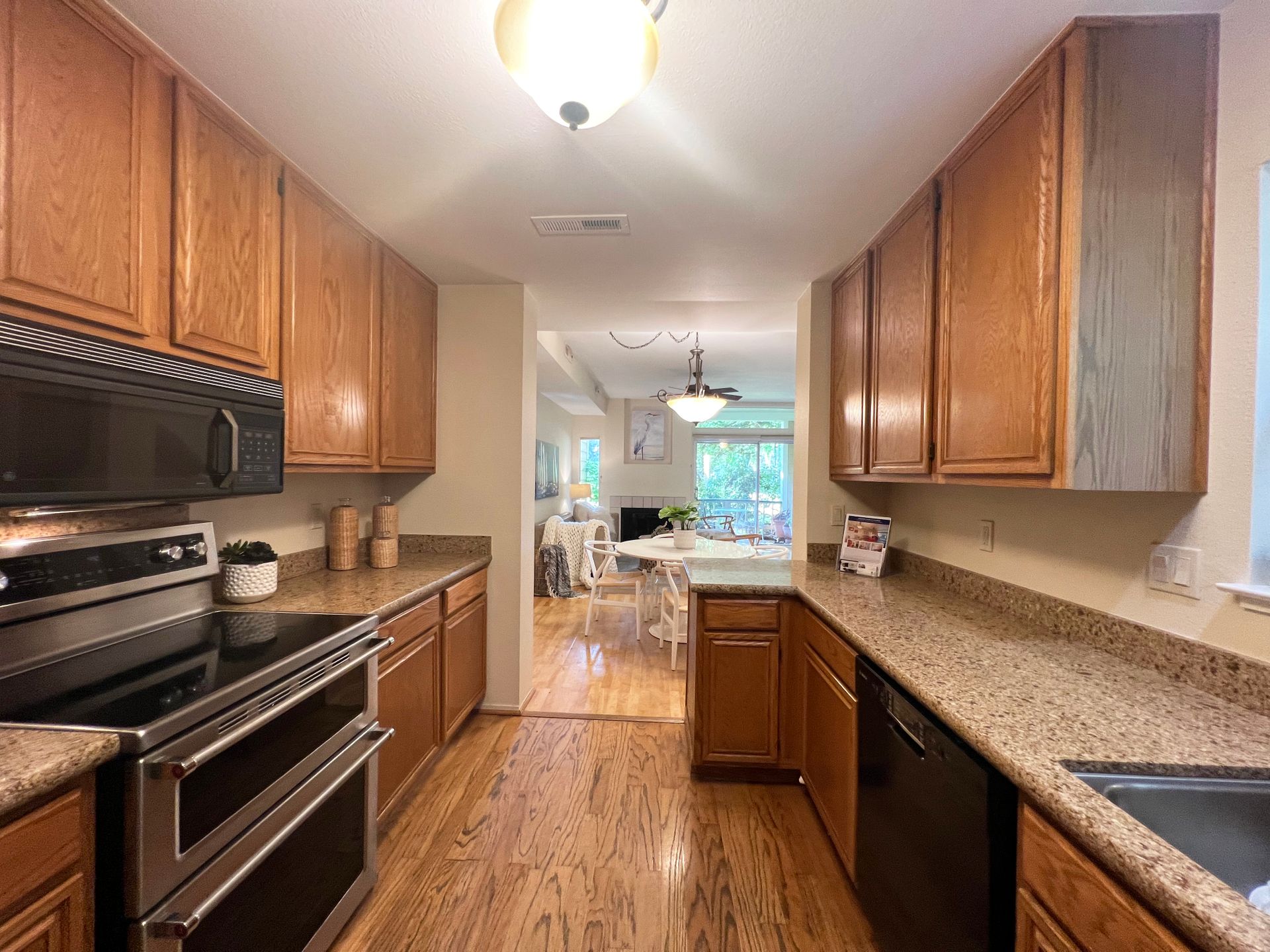 Updated kitchen with Caesar stone counter tops, newer stainless-steel appliances and direct access to garage for easy unloading! Upstairs, two spacious bedrooms suites, that include a primary suite with walk-in closet, private bath and balcony. Both suites have updated bathrooms that feature Stylish Swan stone vanities and shower surrounds. Upstairs laundry space with stacked washer dryer unit, shelving and drawers for storage. Attached single car garage with EV charger, level 1 (120 volts), and carport space for 2nd vehicle.