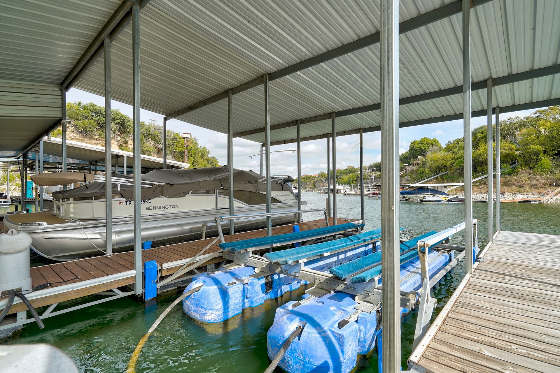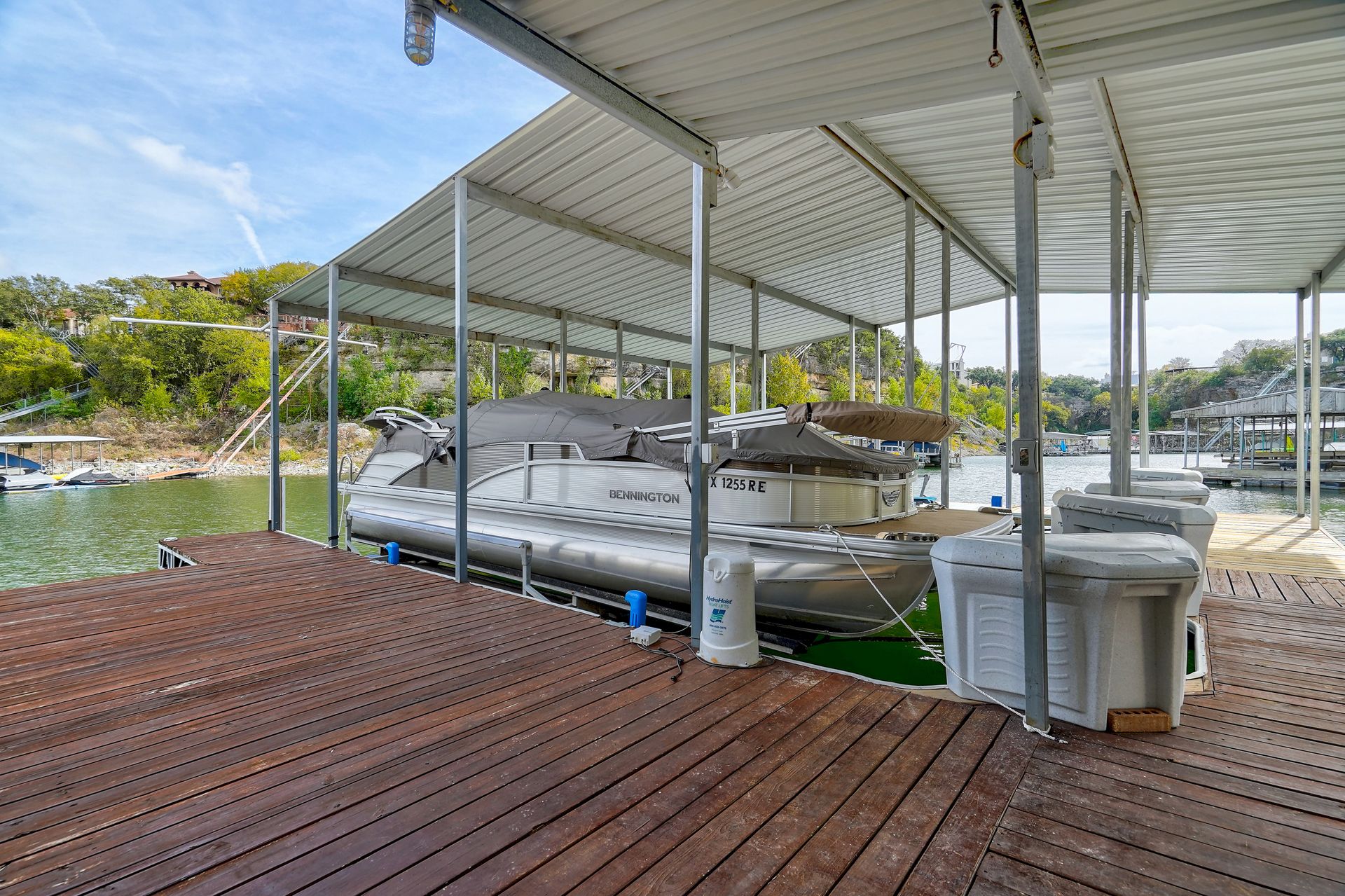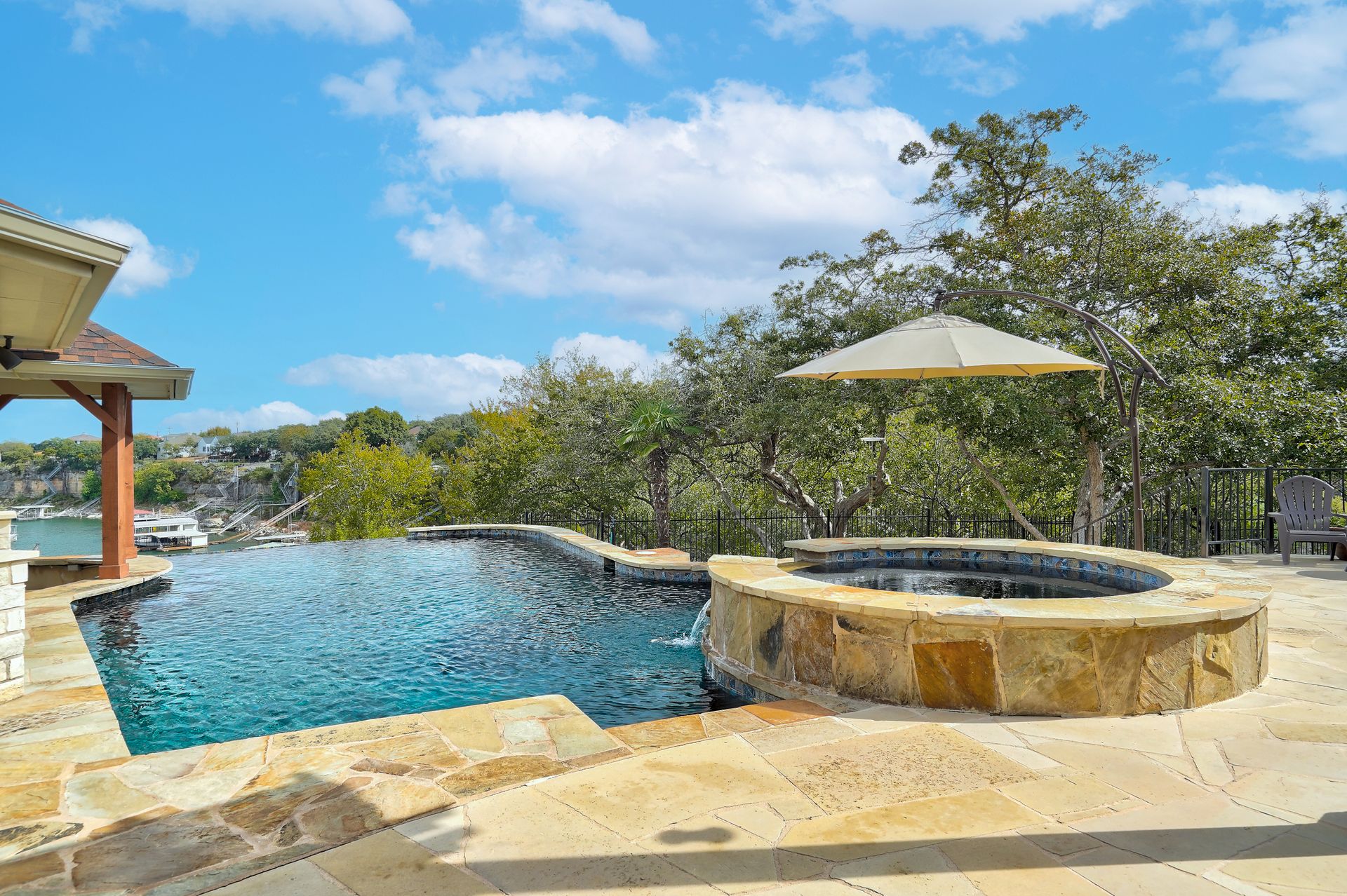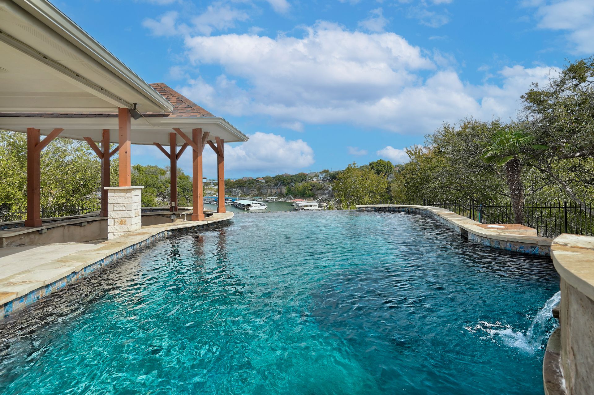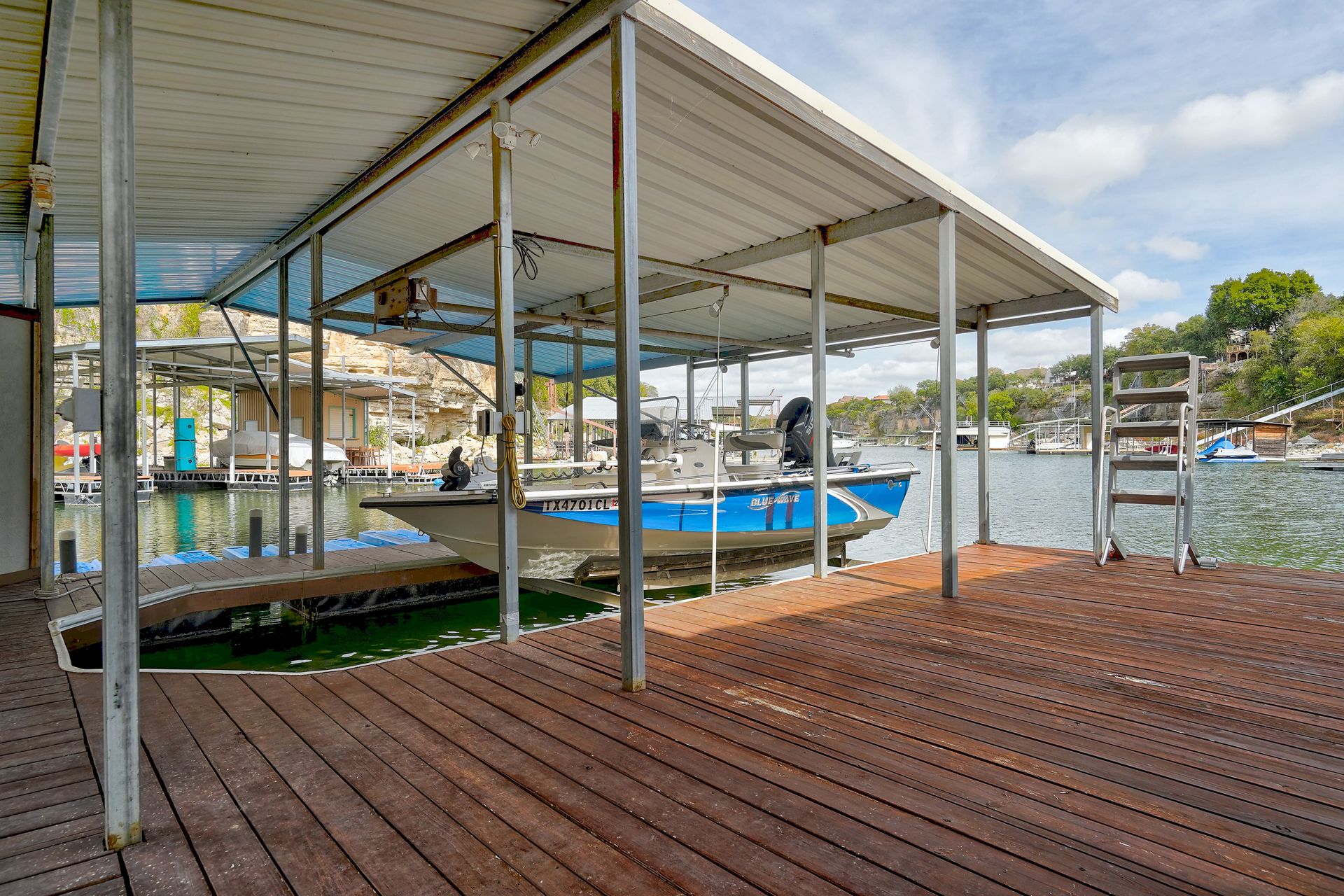 Imagine beginning and ending your days, viewing Lake Travis over your world class resort style pool and spa. You can walk down to your own private marina with two hydro-hoist lifts, five jet-ski slots, and one more slip! This single-story contemporary gem was completely and masterfully renovated with meticulous details inside and out. High ceilings and abundant windows capture the beauty of this waterfront oasis. Inside is a modern relaxed feel with light and white surfaces. The huge kitchen features beautiful white quartz counters, stainless appliances, propane stove, Sub-Zero fridge, secondary pantry, and fridge, and plenty of space to entertain your guests while viewing the amazing outdoor setting. Three bedrooms plus office, plus bonus room with murphy bed, this home can easily accommodate 8-10 guests over a weekend. The master suite, with views of the Lake, has an incredible, large soaking tub adorned with custom tile and chandelier lighting. Two big closets full of custom cabinetry for your finest possessions and apparel. Whole house multi-media sound/video/security system controlled by phone or tablet. Step outside to several seating areas for entertaining. The poolside cabana is oversized, with multiple grilling options, fireplace, swim up bar, outdoor TVs, firepit, and the negative edge pool/spa are heated and chilled! Perfect sun orientation, deep water calm cove, with a marina 2-3 minutes away. Feel like you’re on vacation 365 days of the year. Towering oaks, expansive front lawn, sit on almost one acre in this privately gated compound. This home is the perfect primary or secondary home that provides fun and relaxation all year long. The only thing missing is YOU.