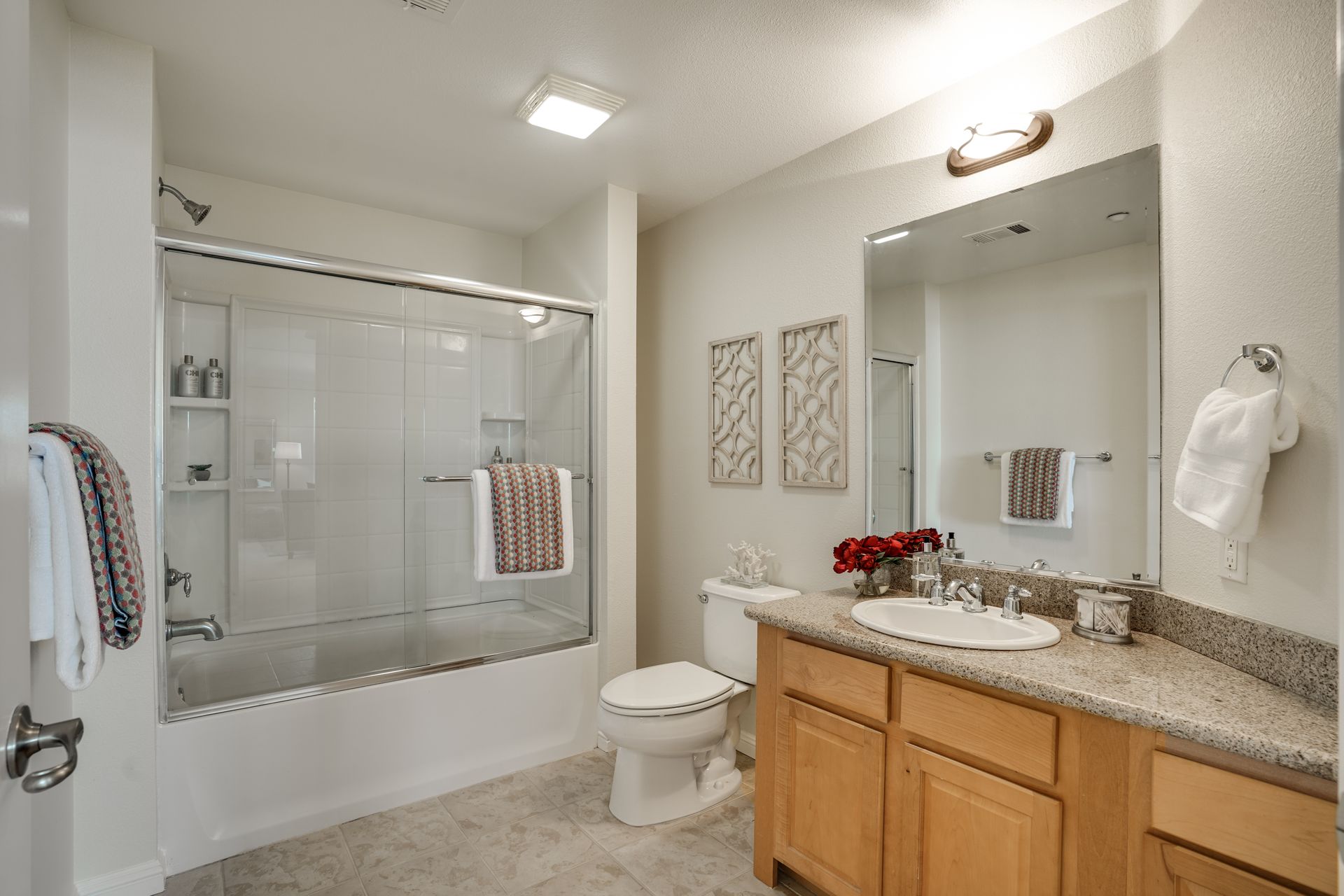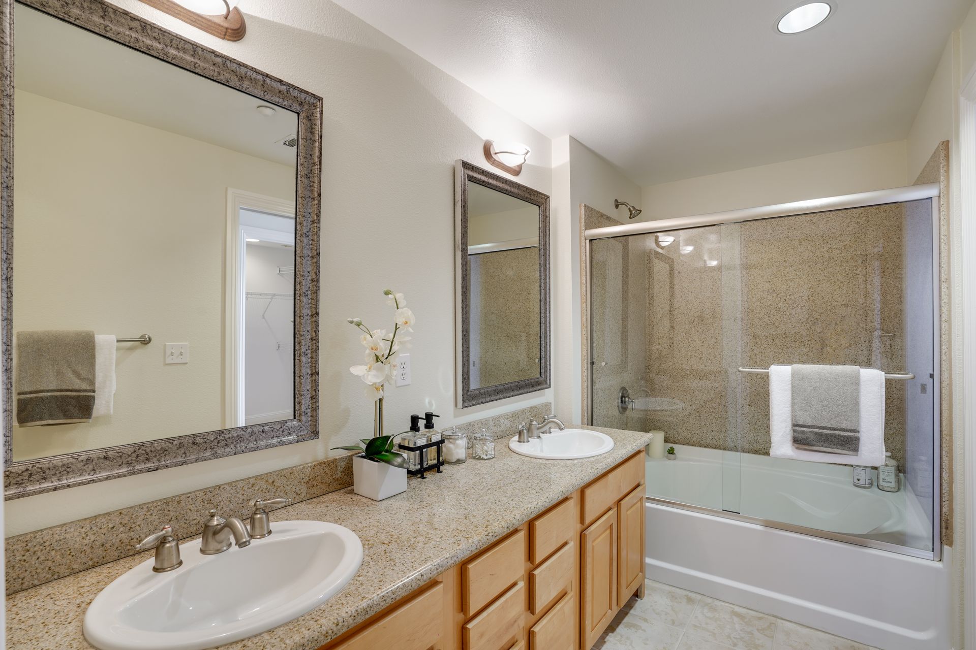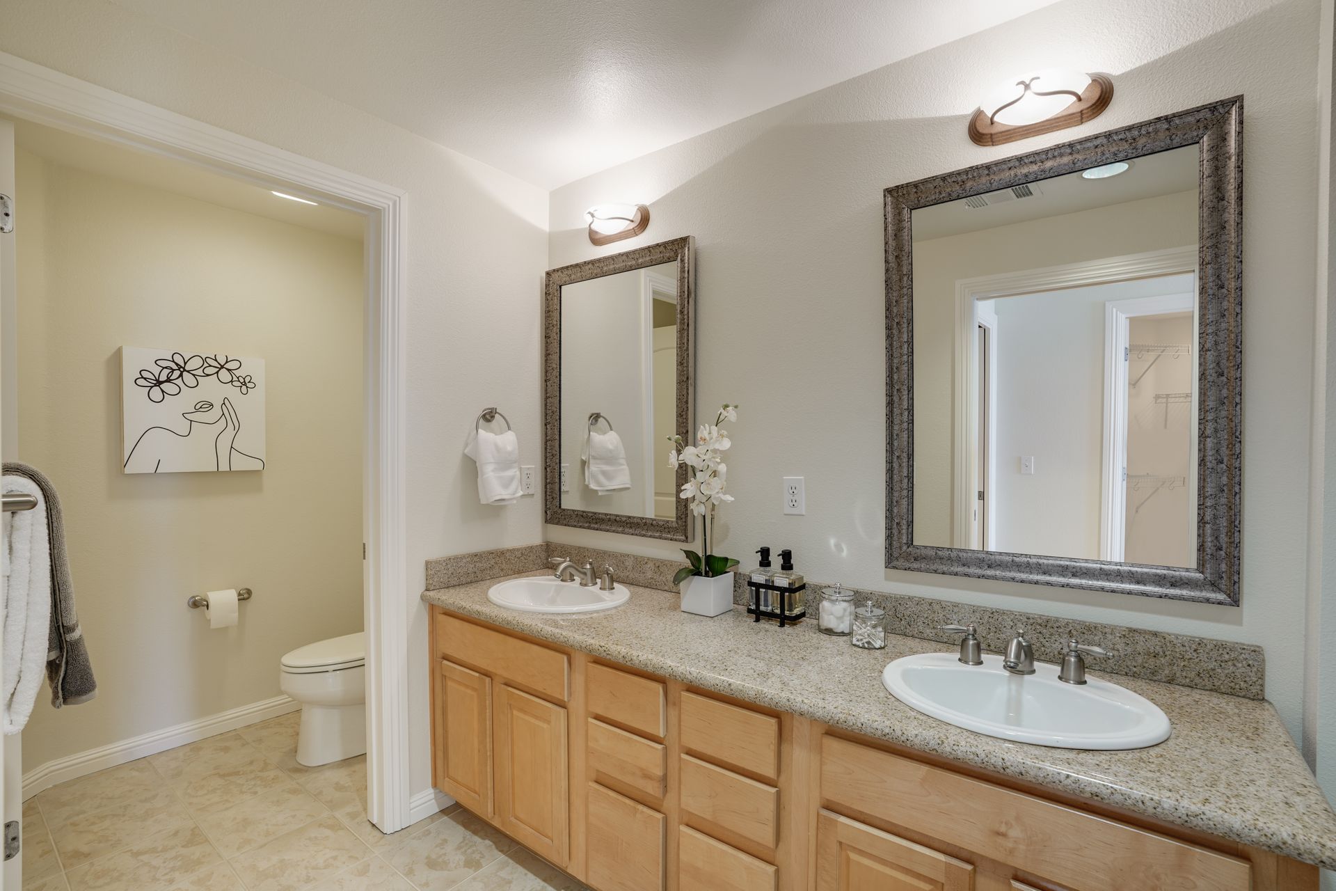 Kitchen opens up to the living room/dining area and features granite counters, SS appliances with a gas stove.  Master suite offers a large walk-in closet, bathroom with granite counters & bath enclosure, dual vanities, and an oversized luxurious tub.