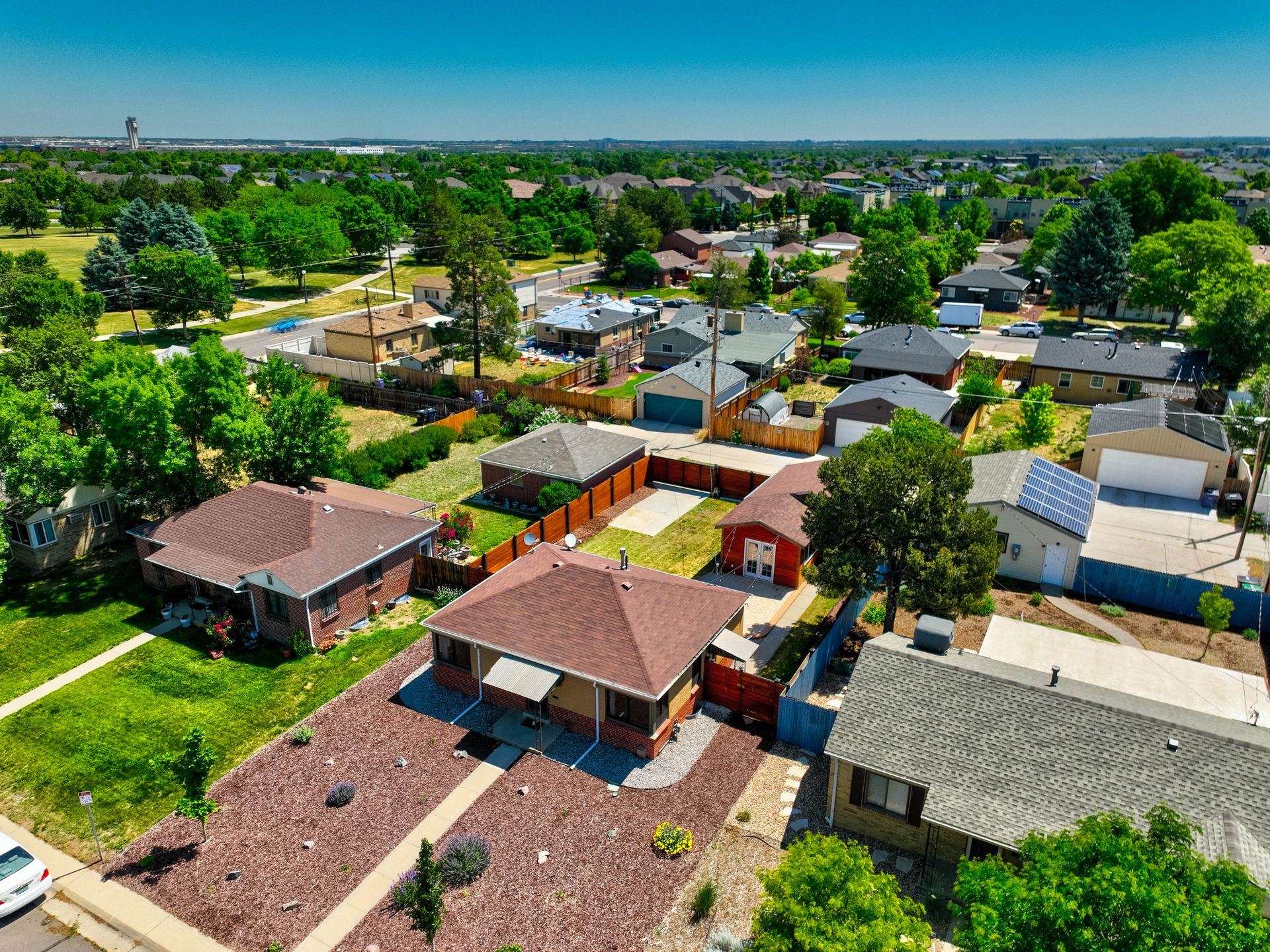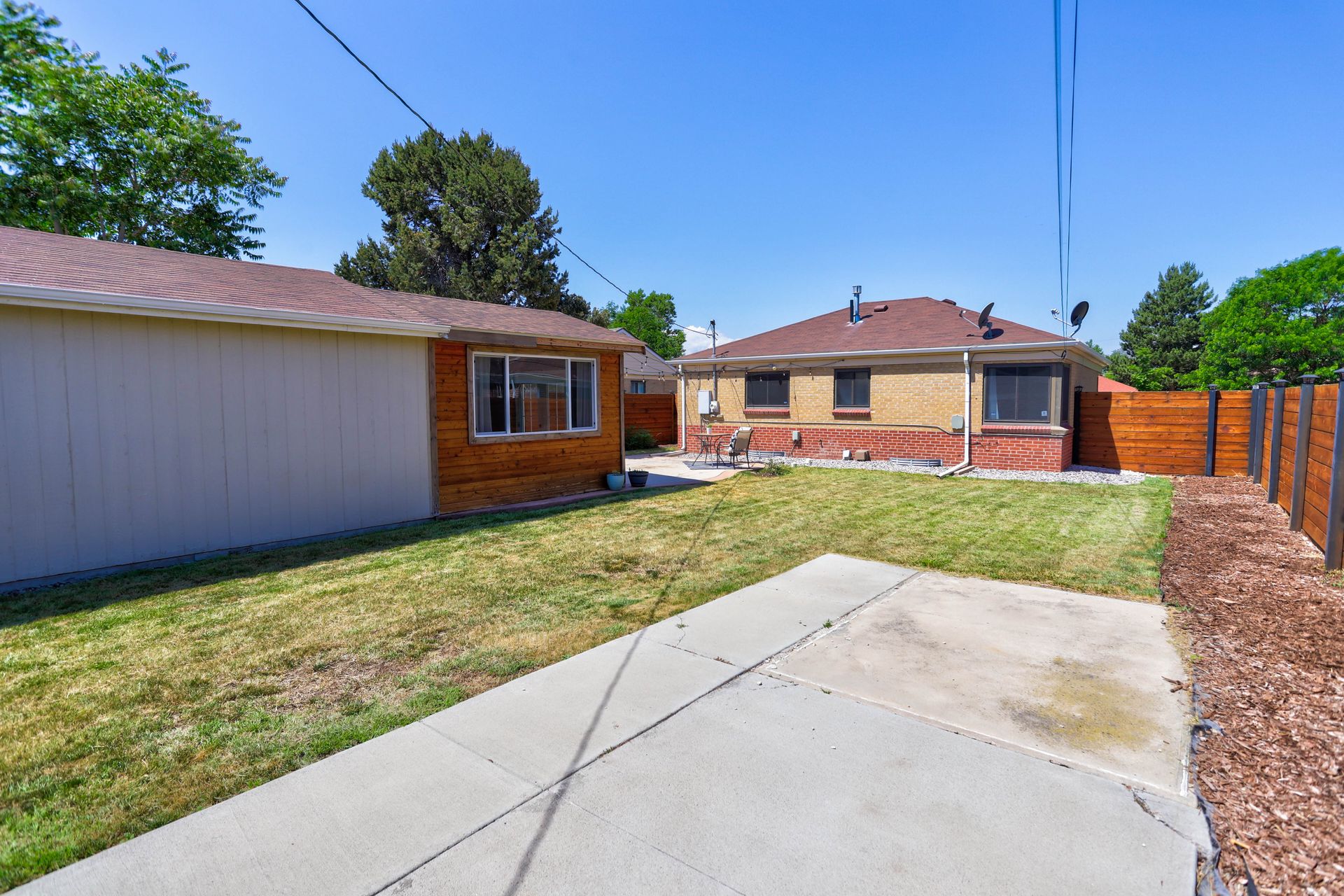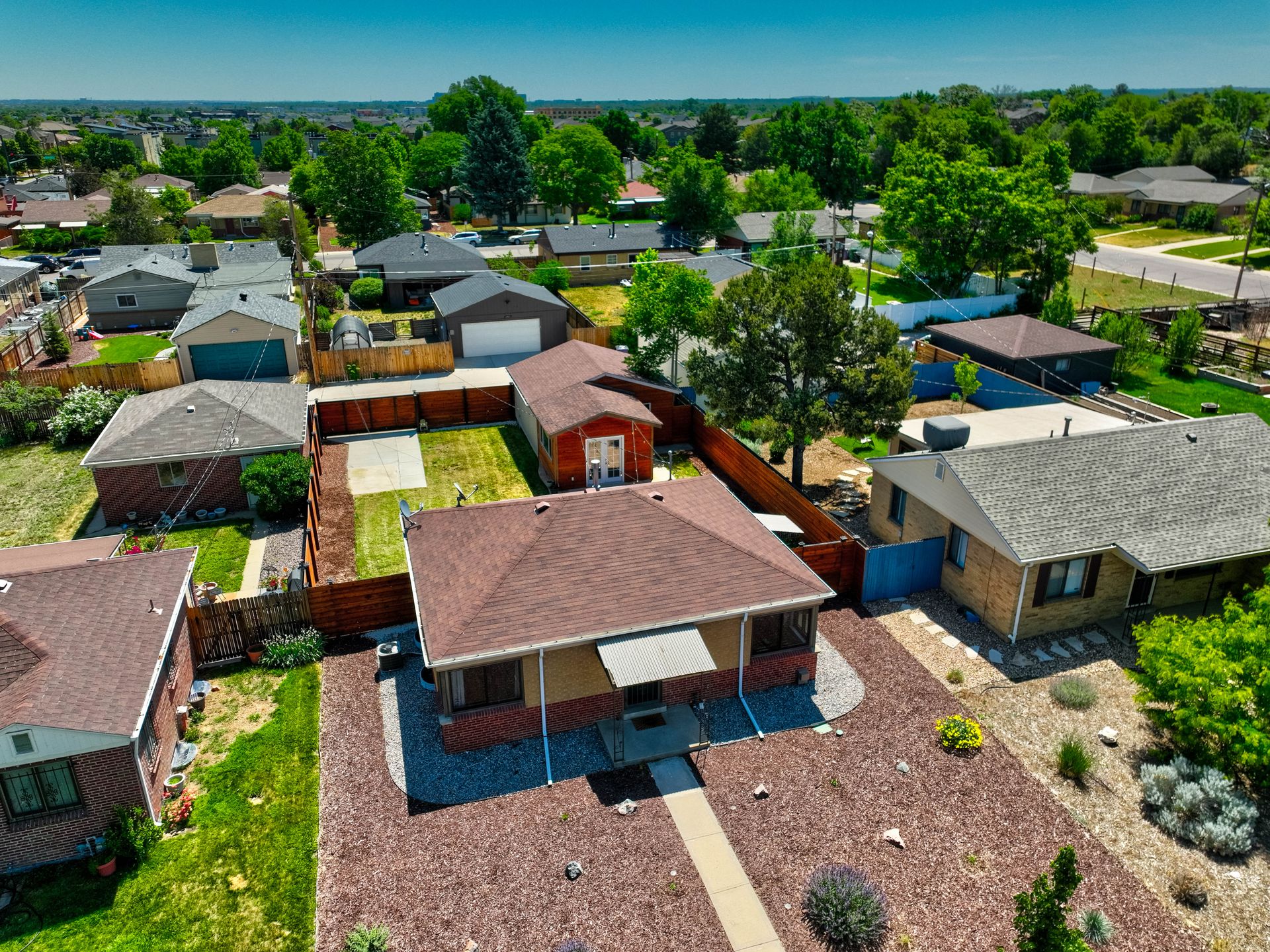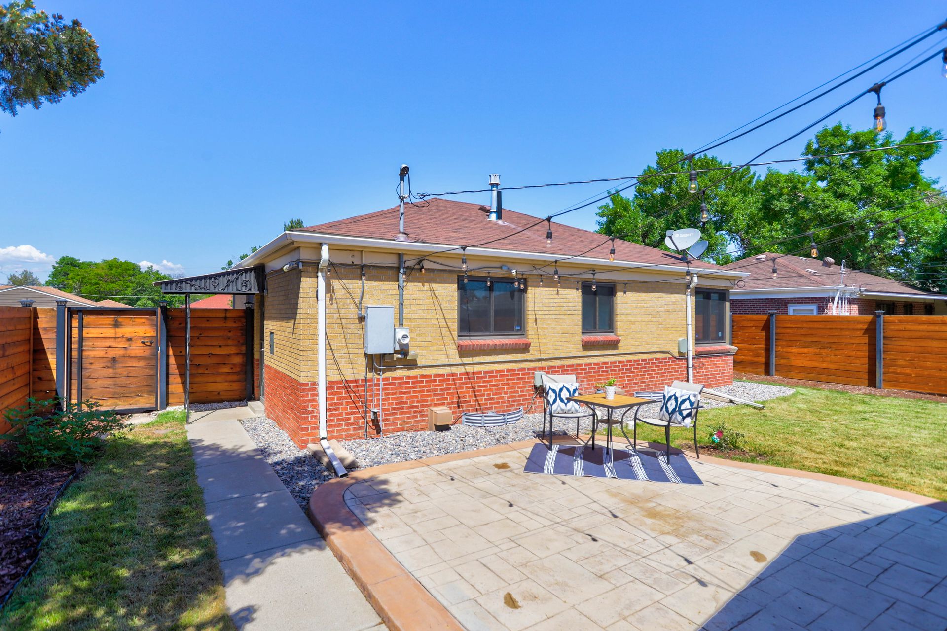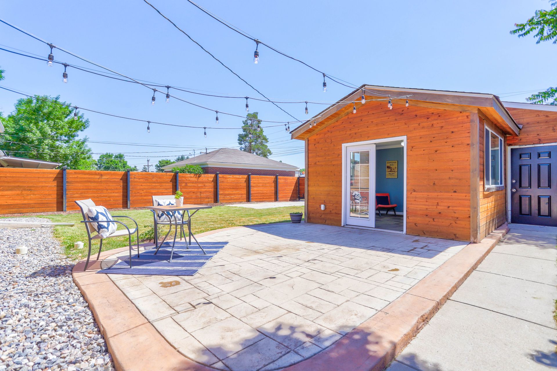 Welcome home to this beautifully updated mid-century brick ranch home located on the southern end of Fred Thomas Park between Park Hill and Central Park boasting four bedrooms, two full bathrooms and an expansive backyard. The front of the property features a newly finished xeriscaped yard with water-conscious plants and trees. In the backyard, a stamped concrete patio is lined with bistro lights that lead you to the finished studio space with glass French doors that is attached to the two-car garage. The yard is protected by a beautifully stained cedar fence with an integrated electronic gate and a pad perfect for any extra or recreational vehicles.