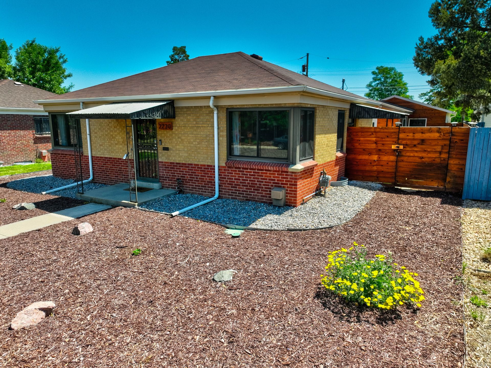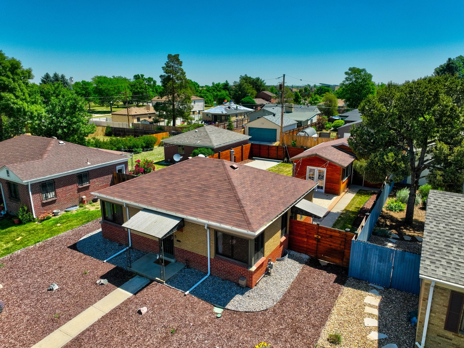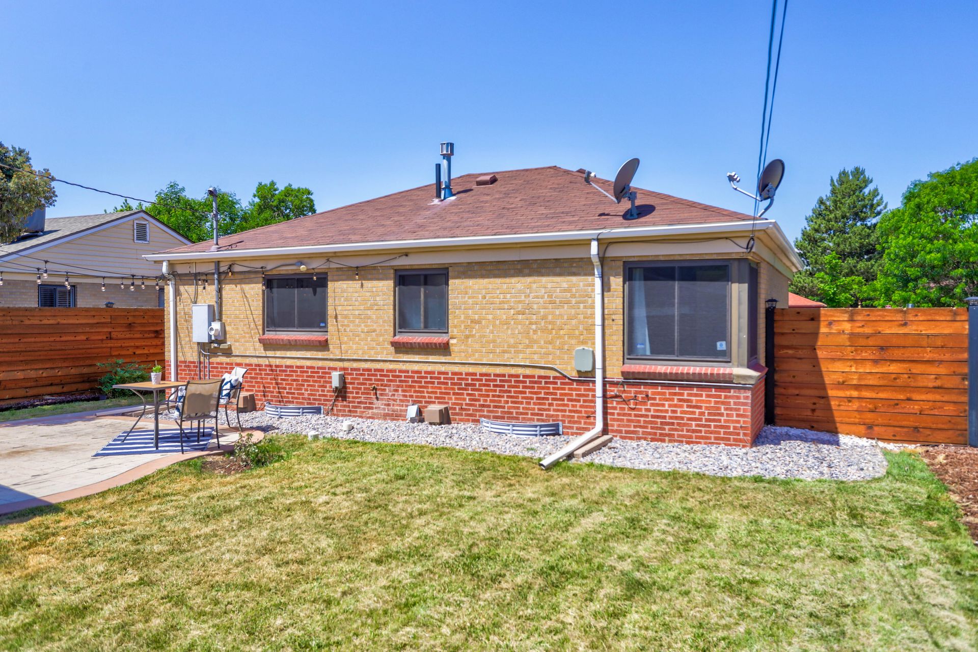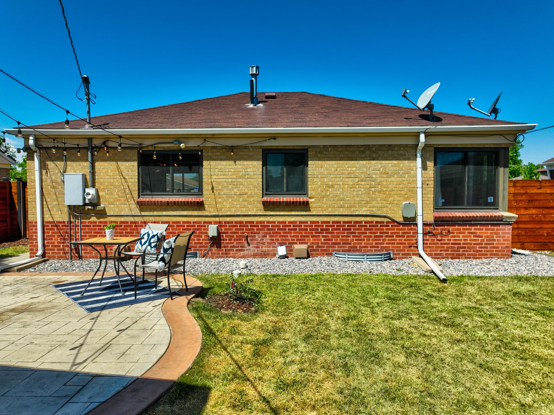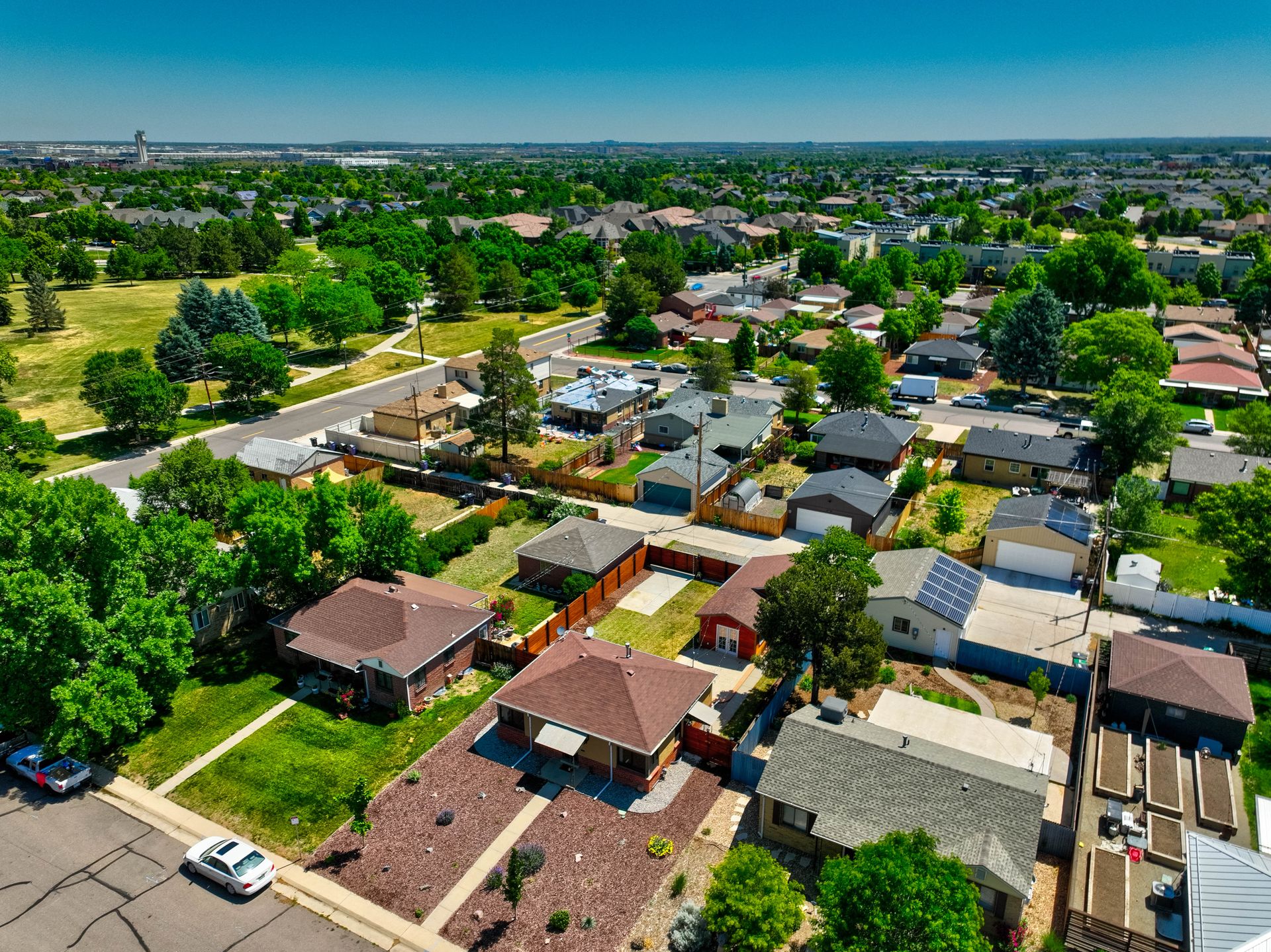 Welcome home to this beautifully updated mid-century brick ranch home located on the southern end of Fred Thomas Park between Park Hill and Central Park boasting four bedrooms, two full bathrooms and an expansive backyard. The front of the property features a newly finished xeriscaped yard with water-conscious plants and trees. In the backyard, a stamped concrete patio is lined with bistro lights that lead you to the finished studio space with glass French doors that is attached to the two-car garage. The yard is protected by a beautifully stained cedar fence with an integrated electronic gate and a pad perfect for any extra or recreational vehicles.