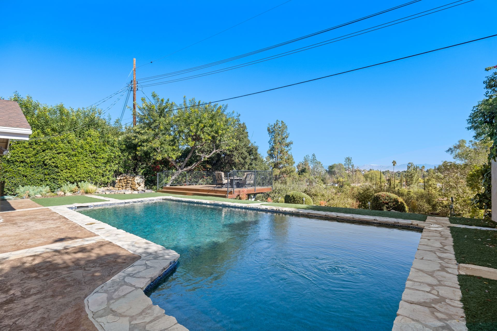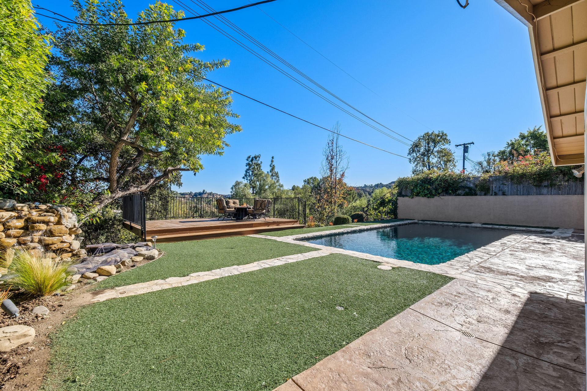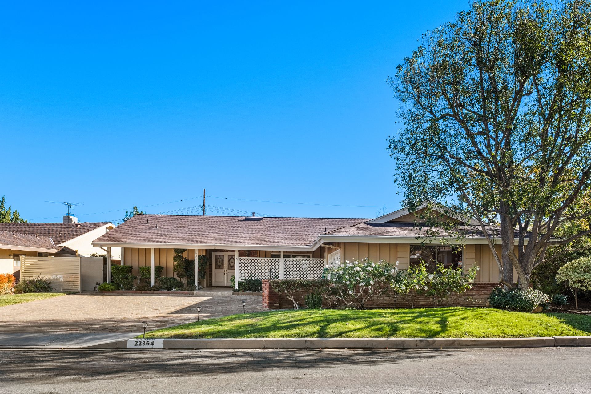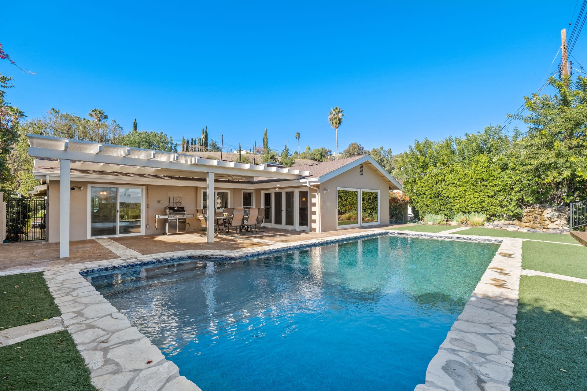 Location , Location, Location is what they say about the most important rules of REAL ESTATE. This beautiful " mid century " a meticulous single story home located on a quiet cul-de-sac is on one of the most desirable streets in Woodland Hills. Featuring over 2100 sq. ft open floor plan with 3 bedrooms and 2 bathrooms on an entertainers VIEW lot. Newer patio overhang, electrical panel, roof, air and heating, water heater and textured ceilings , so many recent improvements to mention ! Upon entry from the foyer you will find a wall of windows allowing for an abundance amount of natural light to flow through and overlooking AREA VIEWS and the picturesque back yard and fountain and pool. The home has a spacious family room open to a beautiful remodeled gourmet chef's kitchen with large center island with counter seating ,viking stainless stove ,microwave, double oven, dishwasher and granite counters.On one side of the house are the 2 good sized auxiliary bedrooms and a redone bathroom/powder room with a custom vanity with a granite counter and picture like frame mirror to match adjacent to the huge walk in shower with sit down bench and inlays. The great room includes a dining area and fireplace with a rock facade, wood beams and that incredible view! Separated on the other side of the house is the generous sized master suite with lots of closet space and a big master bathroom with double sinks and sliding doors that exit to the yard. The entertainers yard has a shining recently plastered pool , grass area ,viewing deck and large patio with overhang for dining alfresco which all looks out to that VIEW!A pocket door separates the laundry room and the entry to the oversized 2 car garage. Centally located to schools , fwy and shopping . A well maintained home with lots of love.