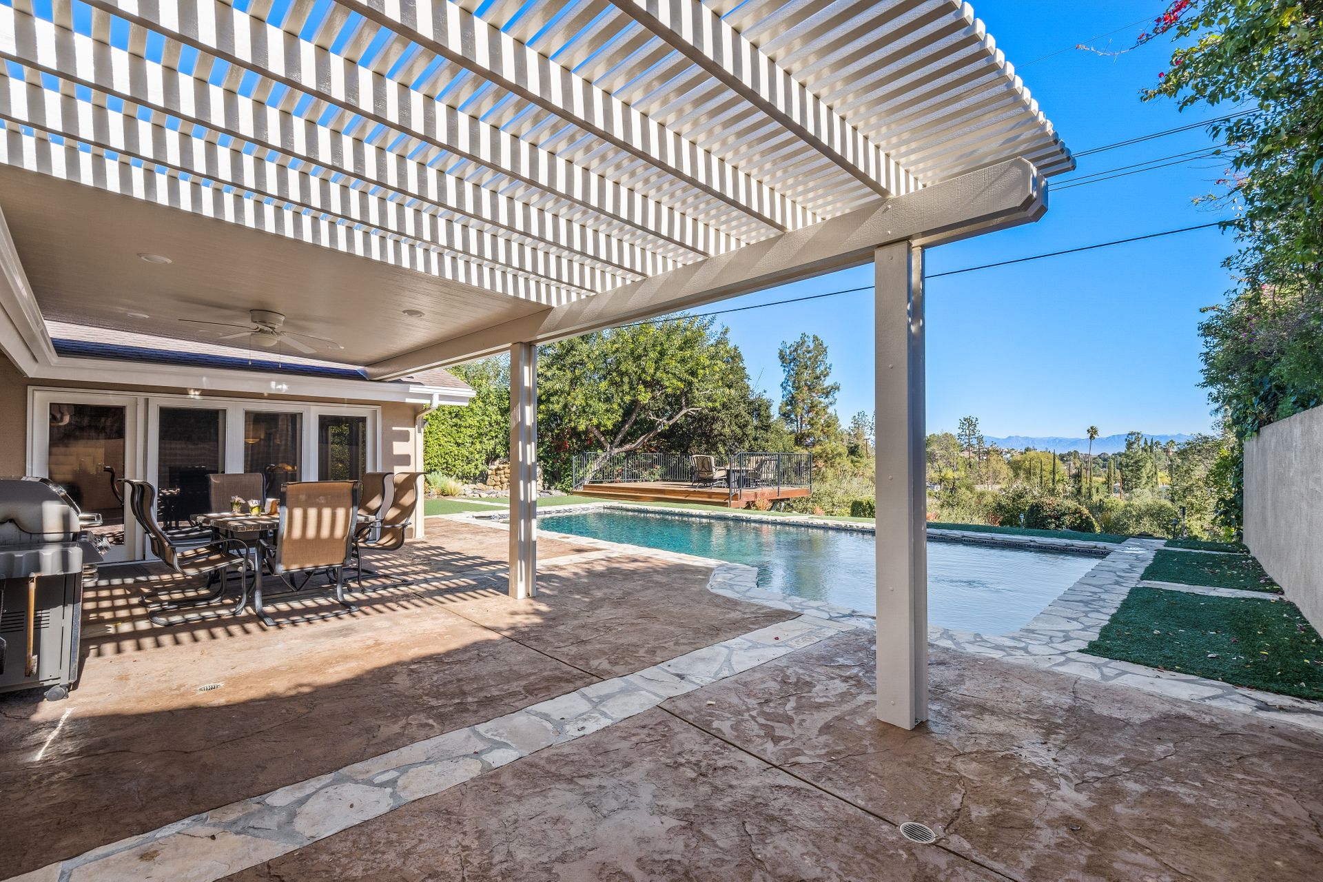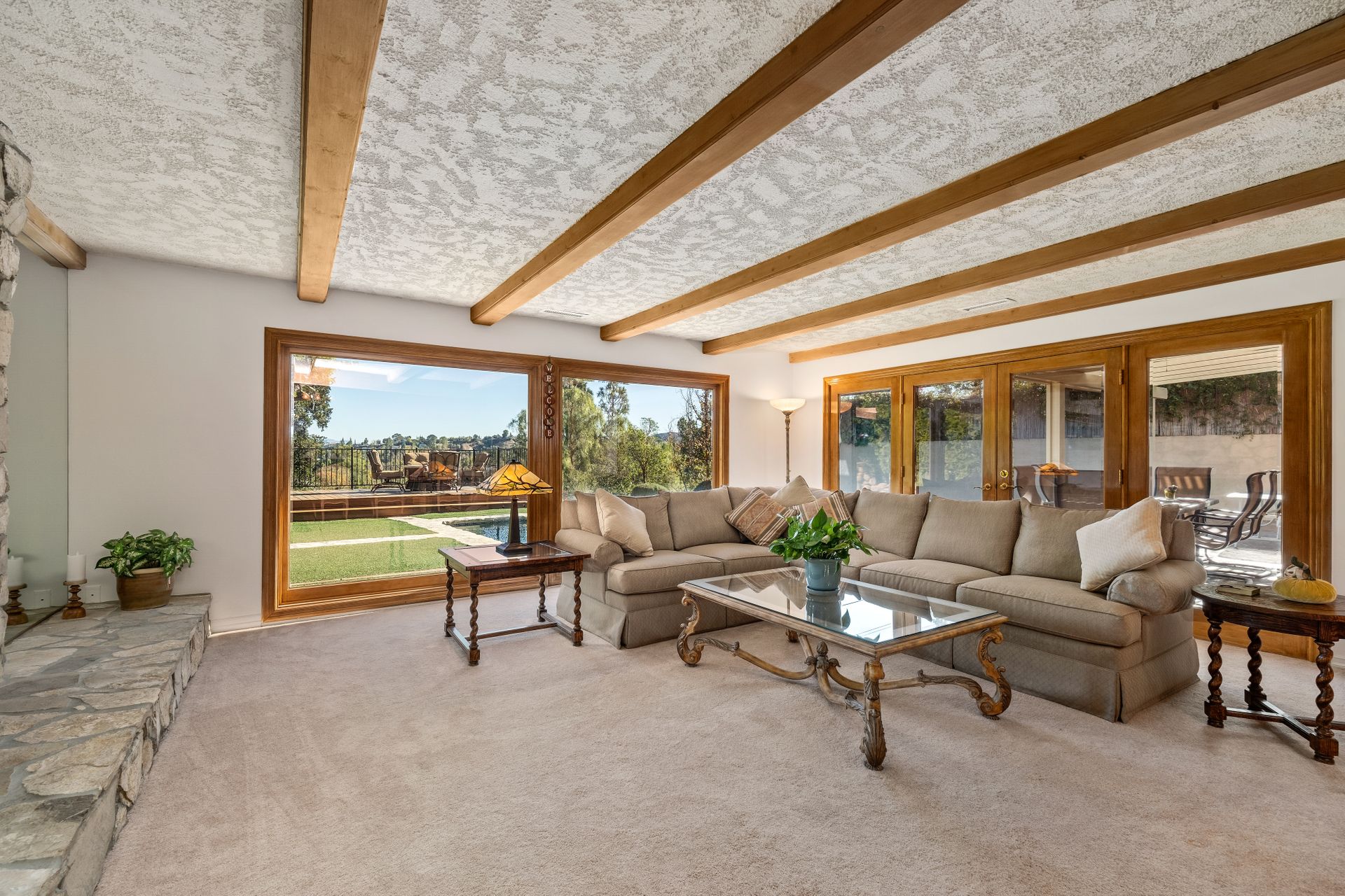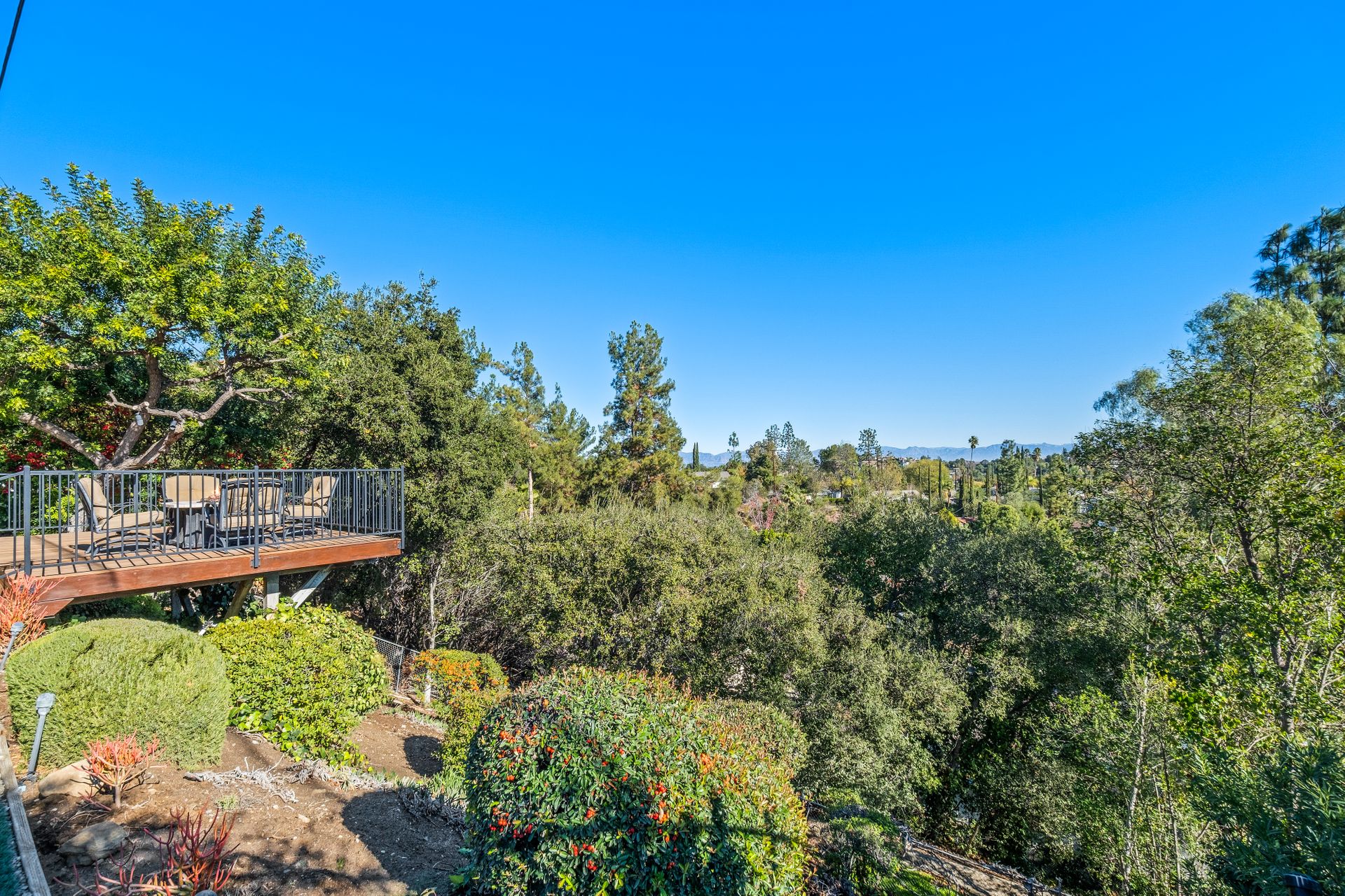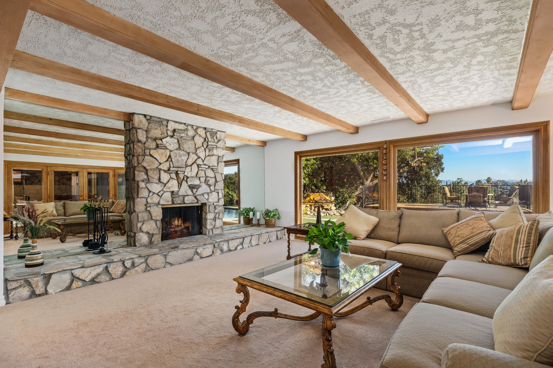Location , Location, Location is what they say about the most important rules of REAL ESTATE. This beautiful " mid century " a meticulous single story home located on a quiet cul-de-sac is on one of the most desirable streets in Woodland Hills. Featuring over 2100 sq. ft open floor plan with 3 bedrooms and 2 bathrooms on an entertainers VIEW lot. Newer patio overhang, electrical panel, roof, air and heating, water heater and textured ceilings , so many recent improvements to mention ! Upon entry from the foyer you will find a wall of windows allowing for an abundance amount of natural light to flow through and overlooking AREA VIEWS and the picturesque back yard and fountain and pool. The home has a spacious family room open to a beautiful remodeled gourmet chef's kitchen with large center island with counter seating ,viking stainless stove ,microwave, double oven, dishwasher and granite counters.On one side of the house are the 2 good sized auxiliary bedrooms and a redone bathroom/powder room with a custom vanity with a granite counter and picture like frame mirror to match adjacent to the huge walk in shower with sit down bench and inlays. The great room includes a dining area and fireplace with a rock facade, wood beams and that incredible view! Separated on the other side of the house is the generous sized master suite with lots of closet space and a big master bathroom with double sinks and sliding doors that exit to the yard. The entertainers yard has a shining recently plastered pool , grass area ,viewing deck and large patio with overhang for dining alfresco which all looks out to that VIEW!A pocket door separates the laundry room and the entry to the oversized 2 car garage. Centally located to schools , fwy and shopping . A well maintained home with lots of love.