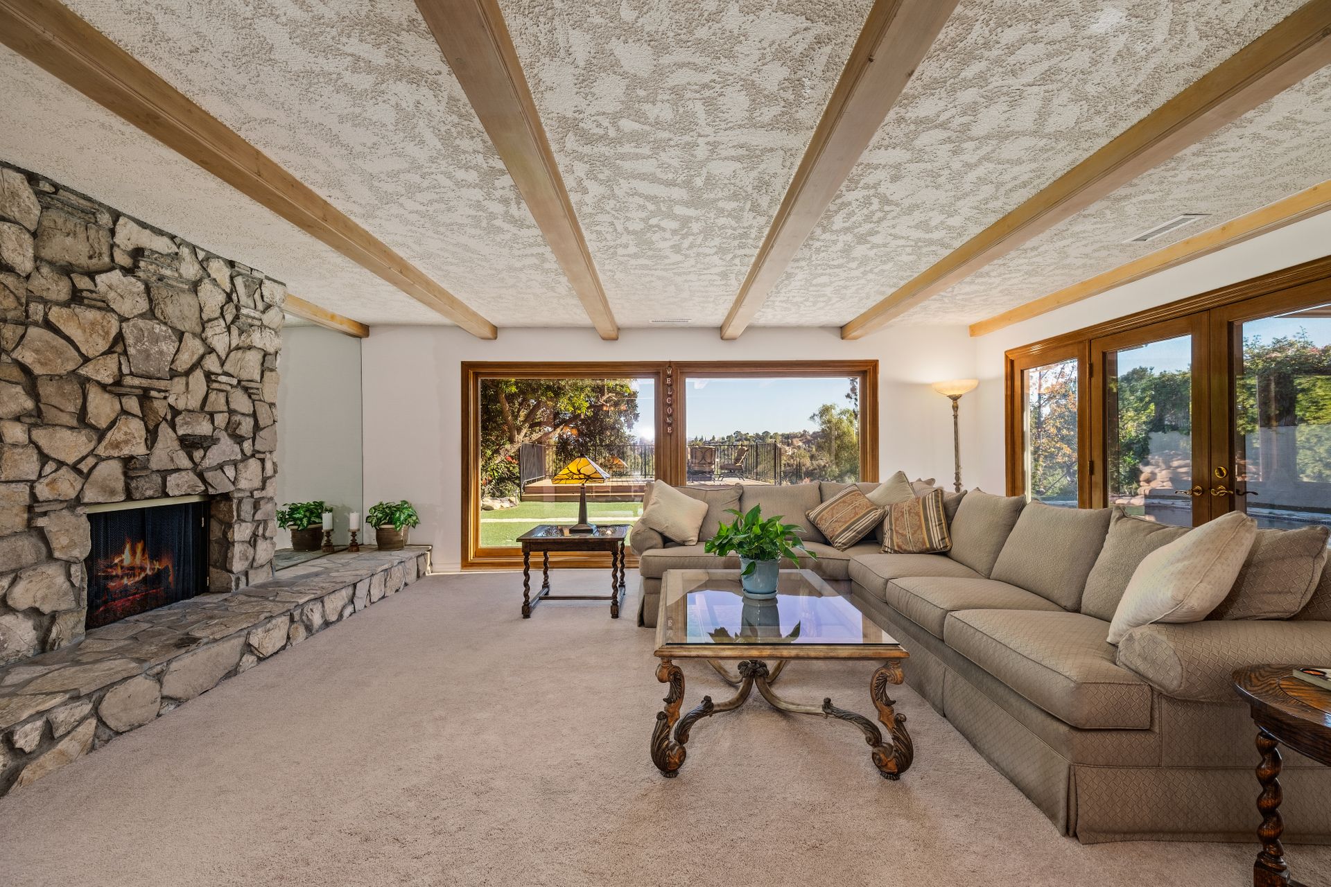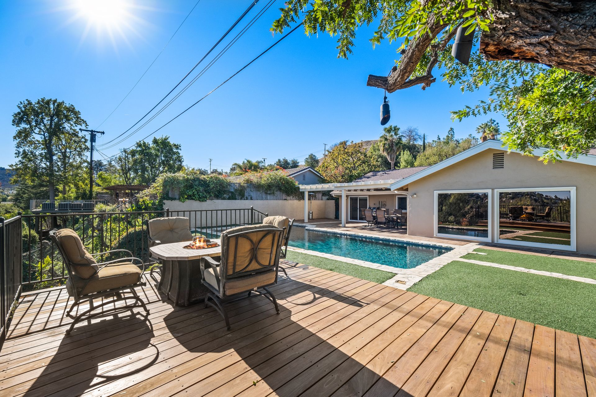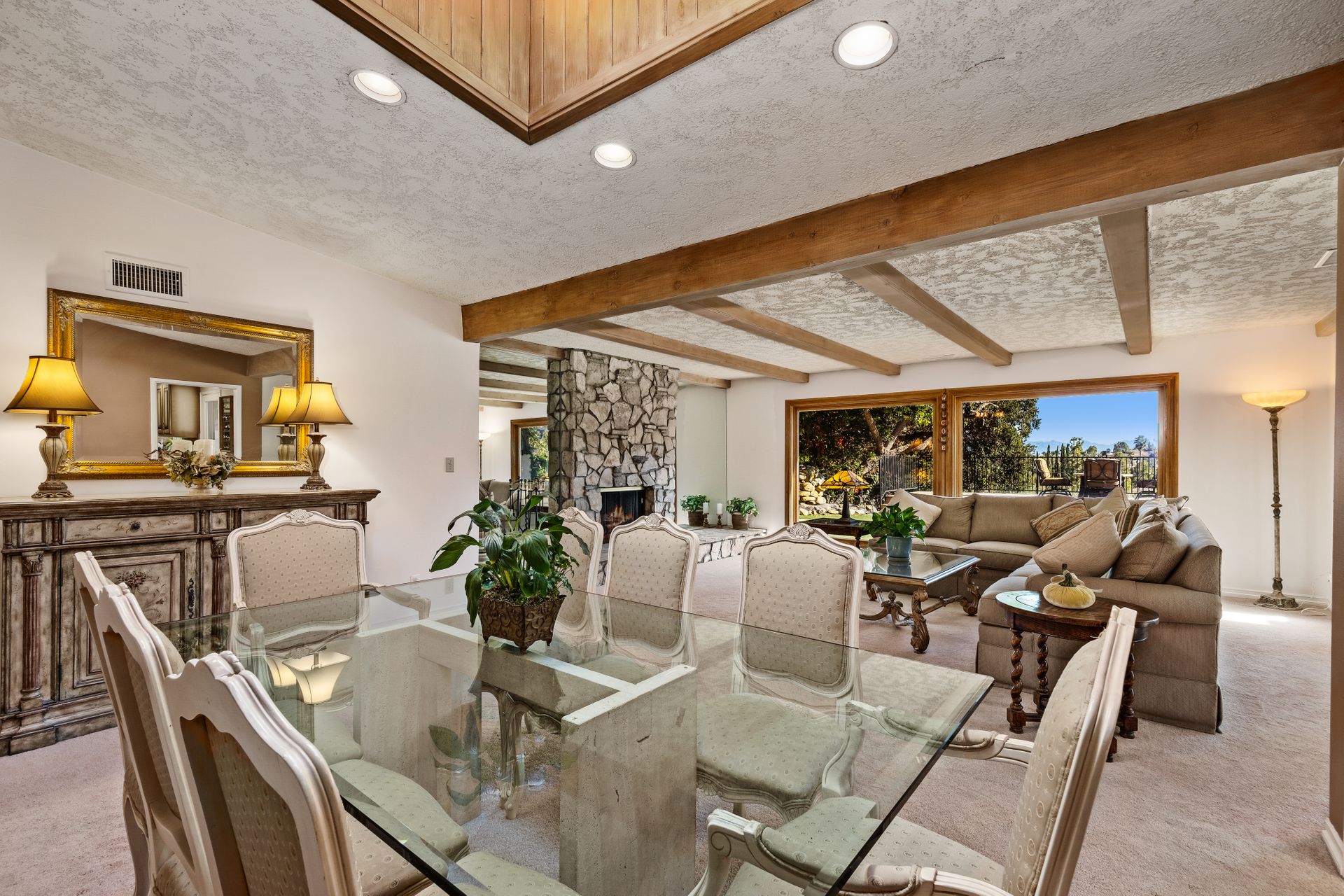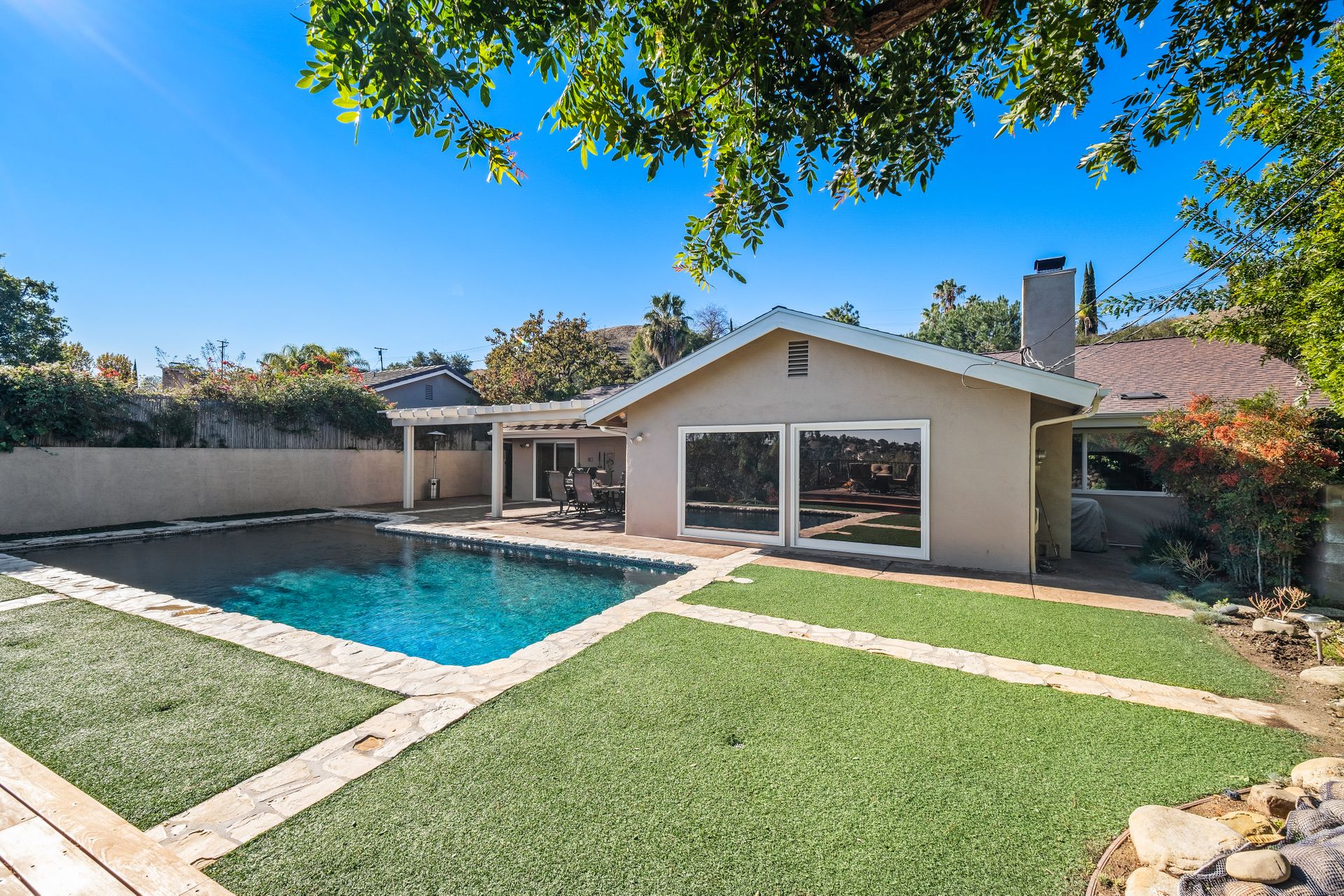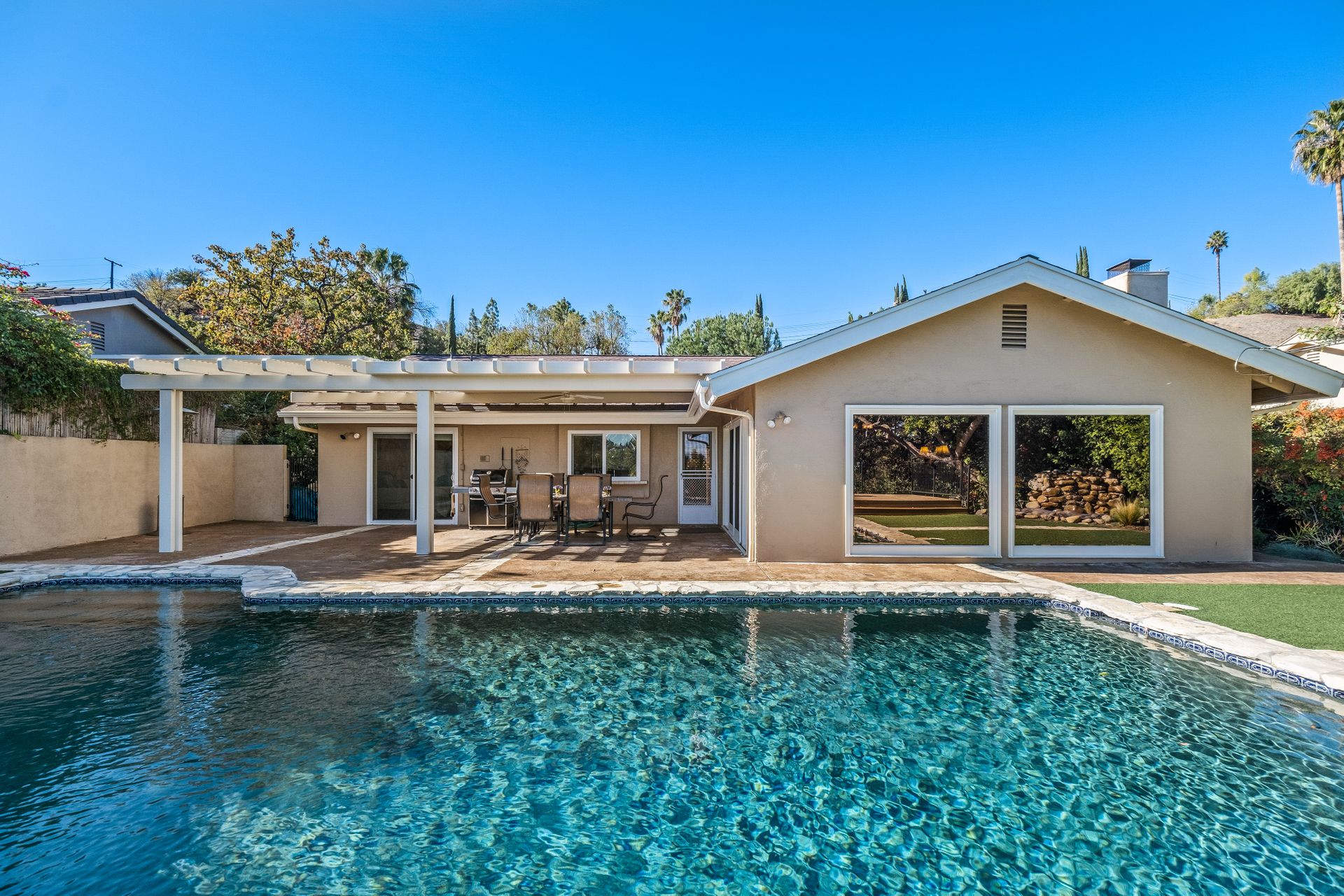 Location , Location, Location is what they say about the most important rules of REAL ESTATE. This beautiful " mid century " a meticulous single story home located on a quiet cul-de-sac is on one of the most desirable streets in Woodland Hills. Featuring over 2100 sq. ft open floor plan with 3 bedrooms and 2 bathrooms on an entertainers VIEW lot. Newer patio overhang, electrical panel, roof, air and heating, water heater and textured ceilings , so many recent improvements to mention ! Upon entry from the foyer you will find a wall of windows allowing for an abundance amount of natural light to flow through and overlooking AREA VIEWS and the picturesque back yard and fountain and pool. The home has a spacious family room open to a beautiful remodeled gourmet chef's kitchen with large center island with counter seating ,viking stainless stove ,microwave, double oven, dishwasher and granite counters.On one side of the house are the 2 good sized auxiliary bedrooms and a redone bathroom/powder room with a custom vanity with a granite counter and picture like frame mirror to match adjacent to the huge walk in shower with sit down bench and inlays. The great room includes a dining area and fireplace with a rock facade, wood beams and that incredible view! Separated on the other side of the house is the generous sized master suite with lots of closet space and a big master bathroom with double sinks and sliding doors that exit to the yard. The entertainers yard has a shining recently plastered pool , grass area ,viewing deck and large patio with overhang for dining alfresco which all looks out to that VIEW!A pocket door separates the laundry room and the entry to the oversized 2 car garage. Centally located to schools , fwy and shopping . A well maintained home with lots of love.
