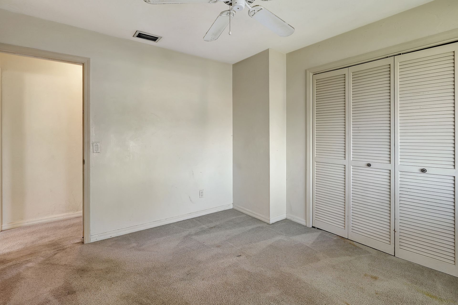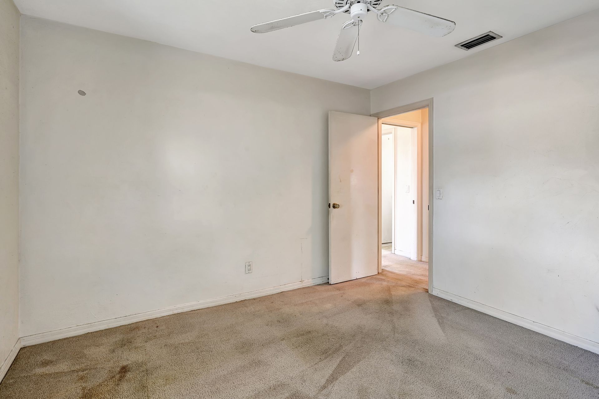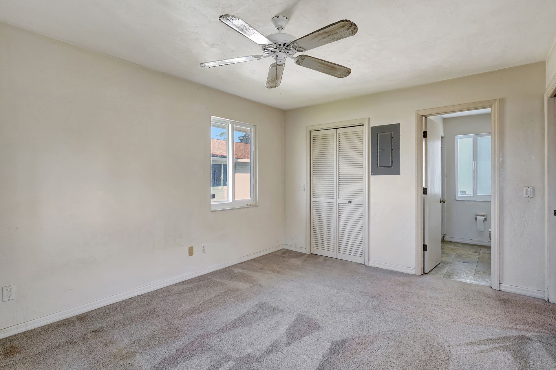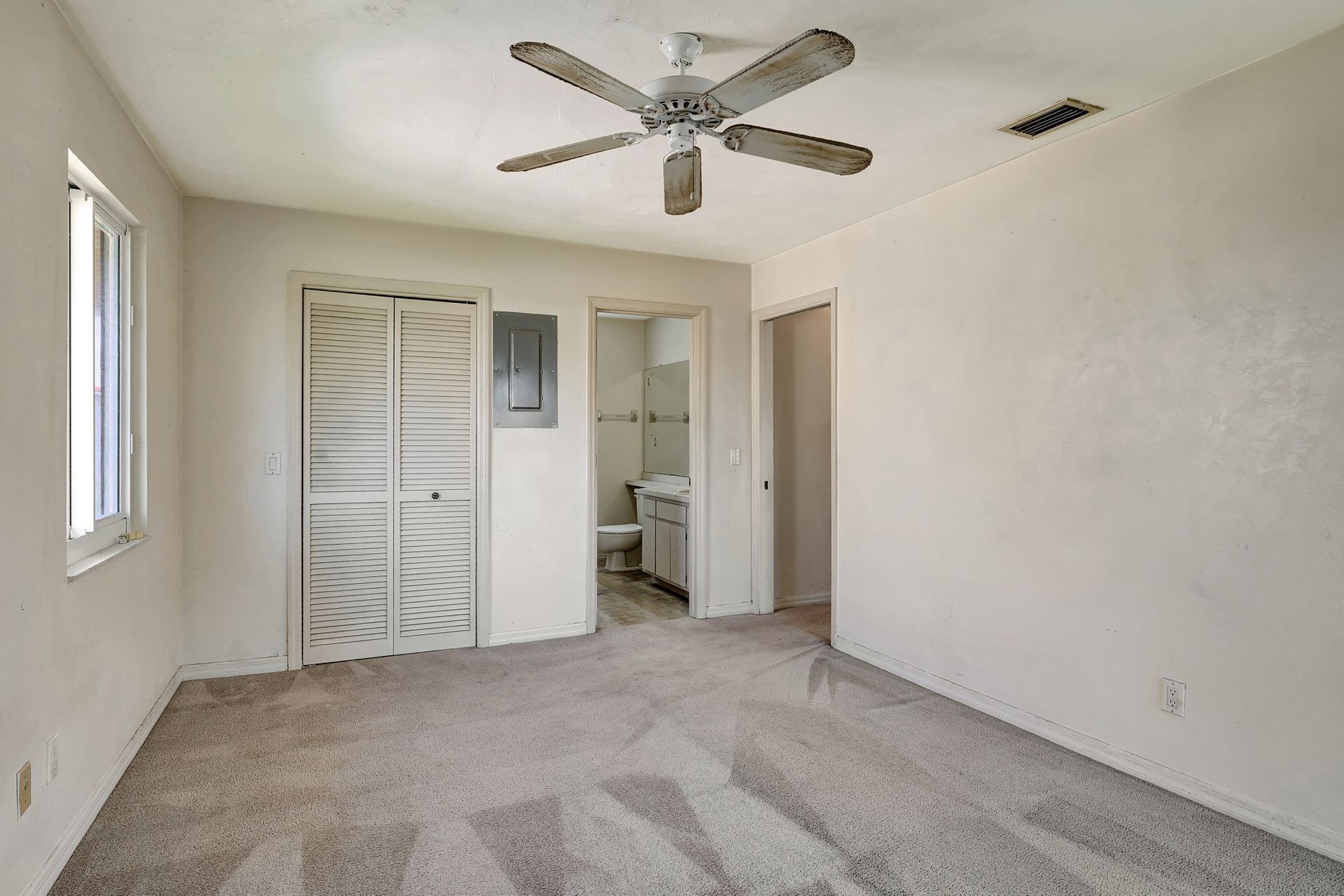 The guest bedroom is situated across from the guest bathroom, featuring a tub/shower combo. The primary suite includes a walk-in closet and an en-suite bathroom. Recent updates include a newer AC unit, and hurricane windows installed about a year ago, and a roof replacement in 2018.