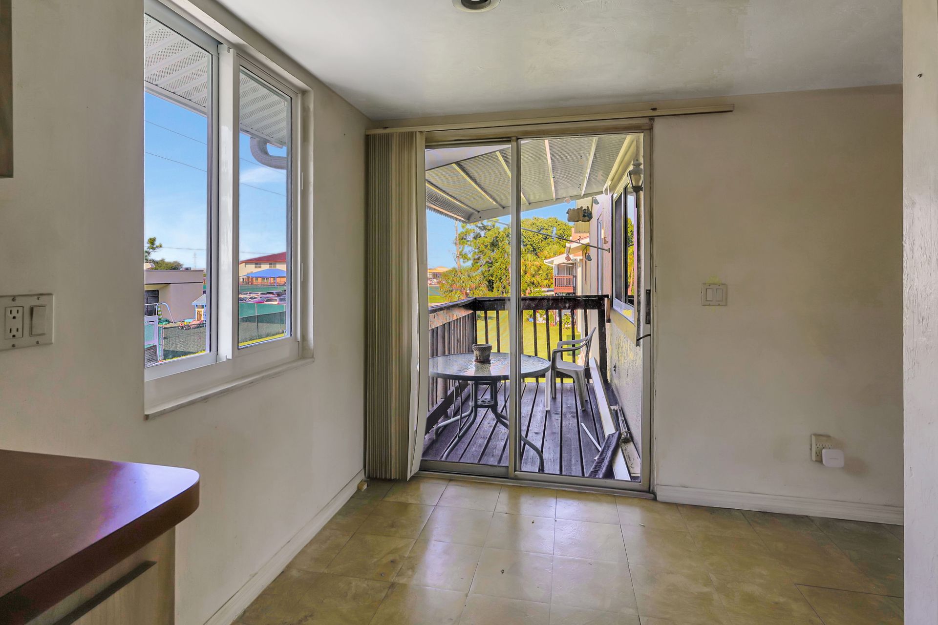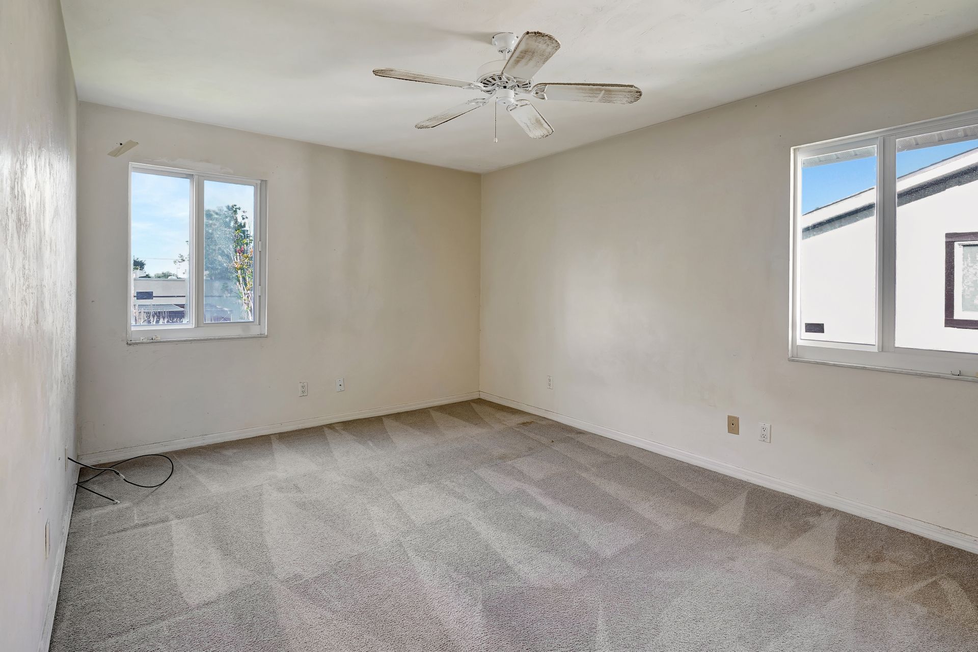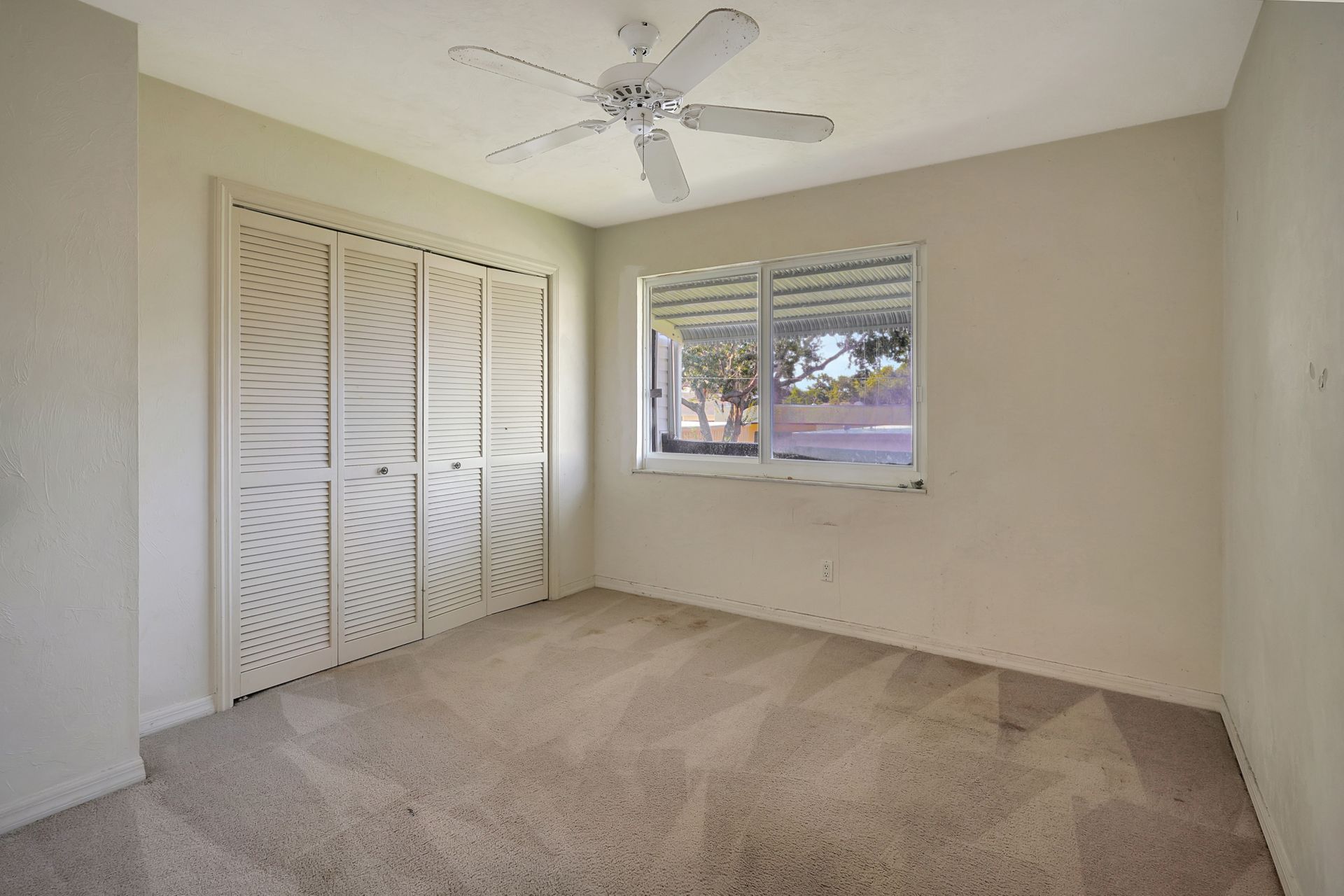The guest bedroom is situated across from the guest bathroom, featuring a tub/shower combo. The primary suite includes a walk-in closet and an en-suite bathroom. Recent updates include a newer AC unit, and hurricane windows installed about a year ago, and a roof replacement in 2018.