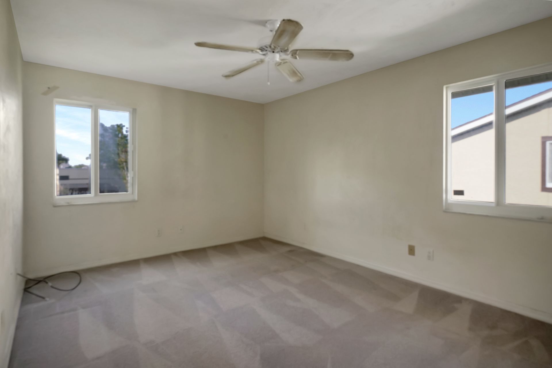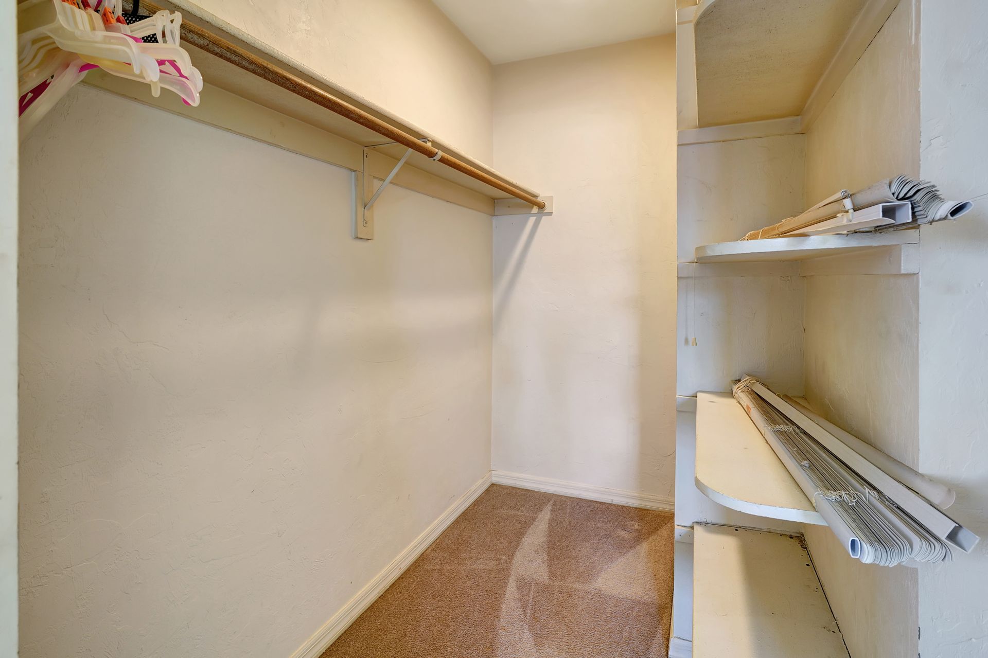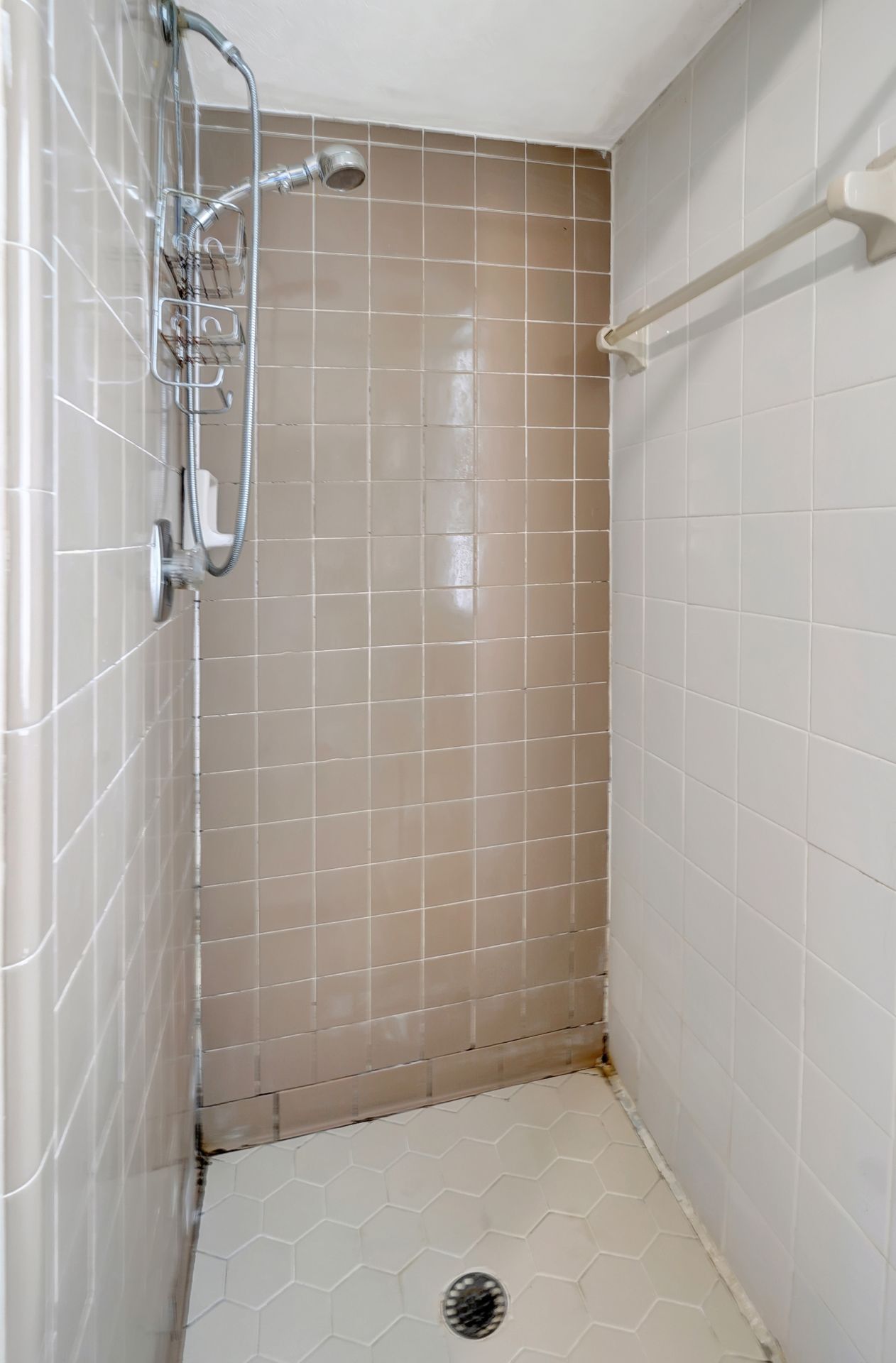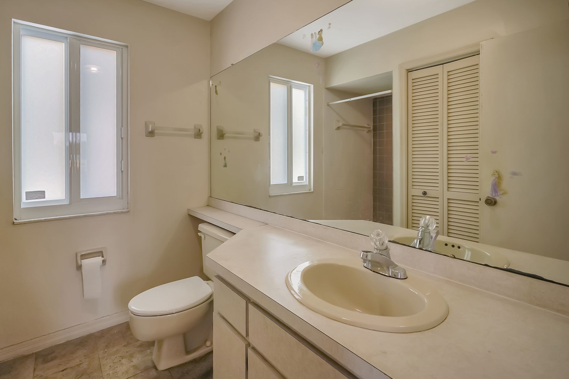 The guest bedroom is situated across from the guest bathroom, featuring a tub/shower combo. The primary suite includes a walk-in closet and an en-suite bathroom. Recent updates include a newer AC unit, and hurricane windows installed about a year ago, and a roof replacement in 2018.