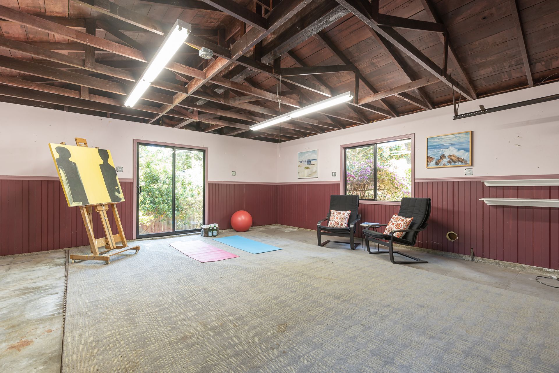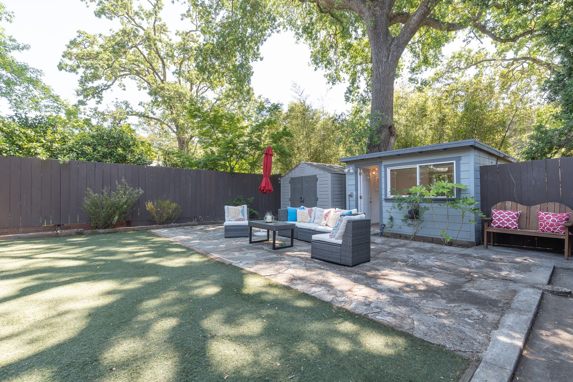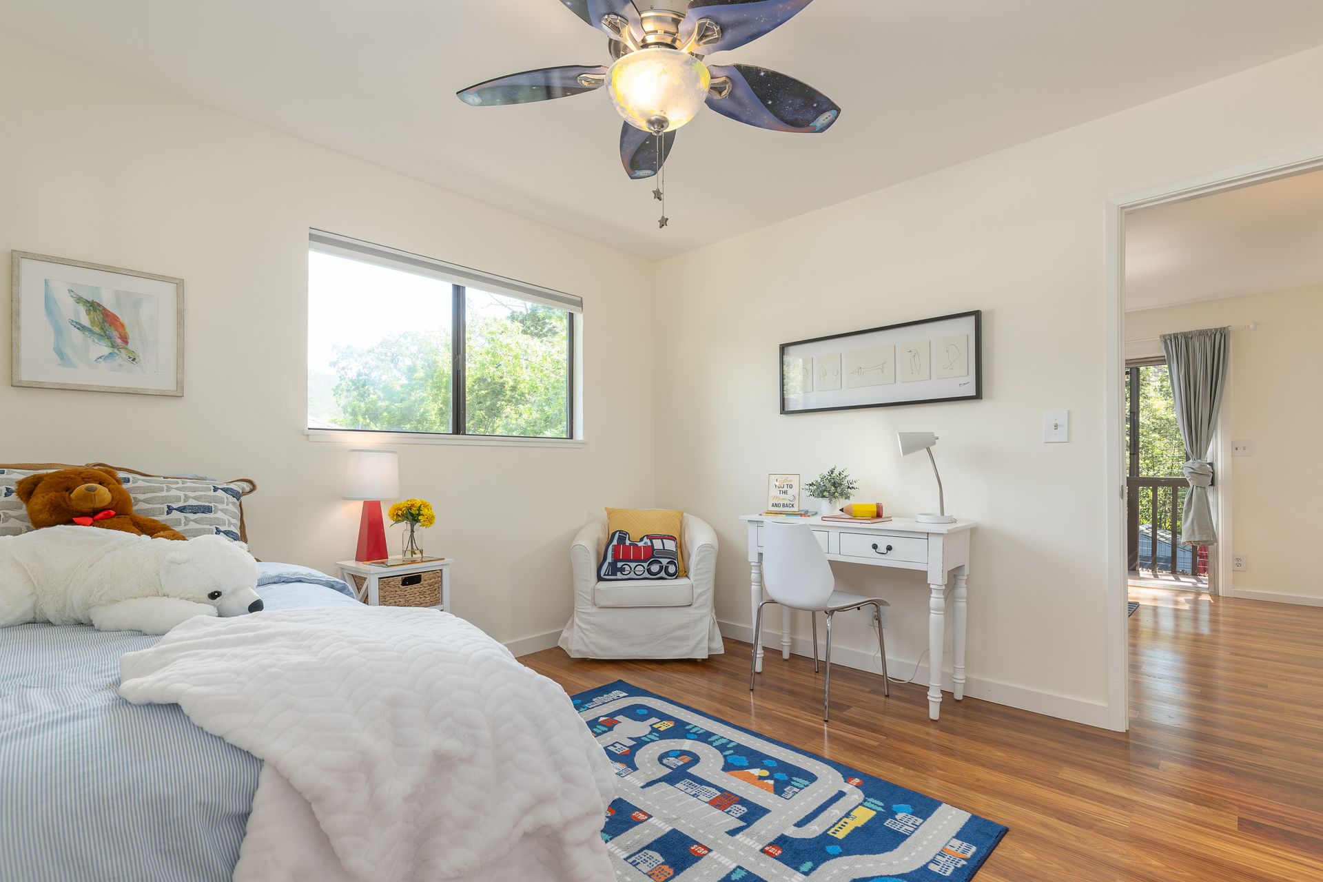 Unassuming in appearance from the front, this spacious family home opens up to an amazing compound. On a favorite street in San Anselmo close to Millennium Park, fabulous hiking and biking trails, Red Hill Shopping Center and transportation. The living room has a brick fireplace with a gas insert, there's a large family room with a wet bar, full bathroom and a master suite on the main level. Upstairs we have another full bathroom and 3 additional bedrooms, one being used as a den - ideal for a home office with an attached deck. Hardwood and Pergo floors, ceiling fans, tankless water heater plus lots of light and space. The large level yard has a detached studio and half bath, perfect for an art studio, workout room etc. There are several sheds on the property for maximum storage, one with power which could be another great office, and there's also a hot tub and large swim spa plus a 2-car tandem garage and lots of parking. Excellent location and school district!