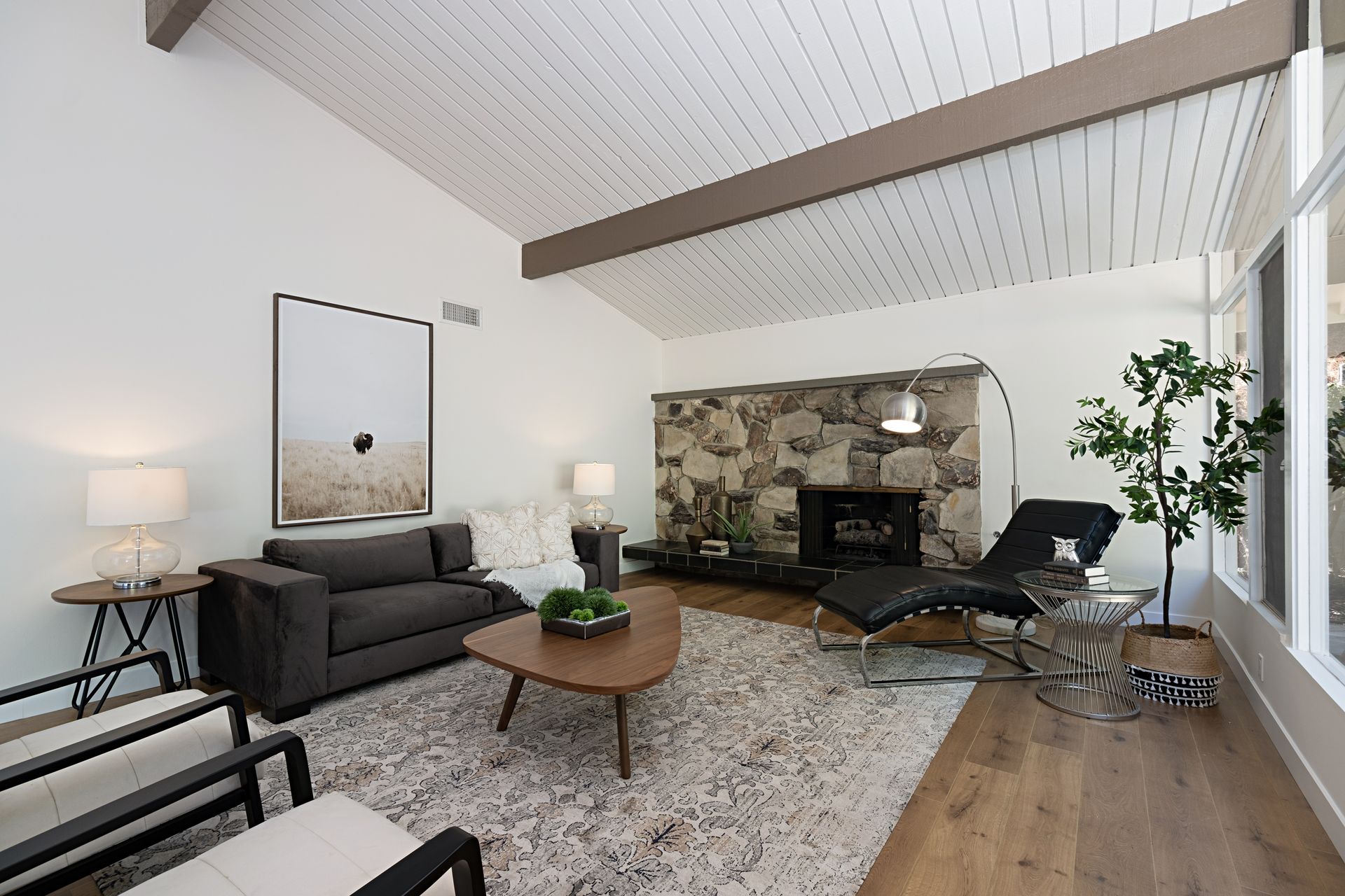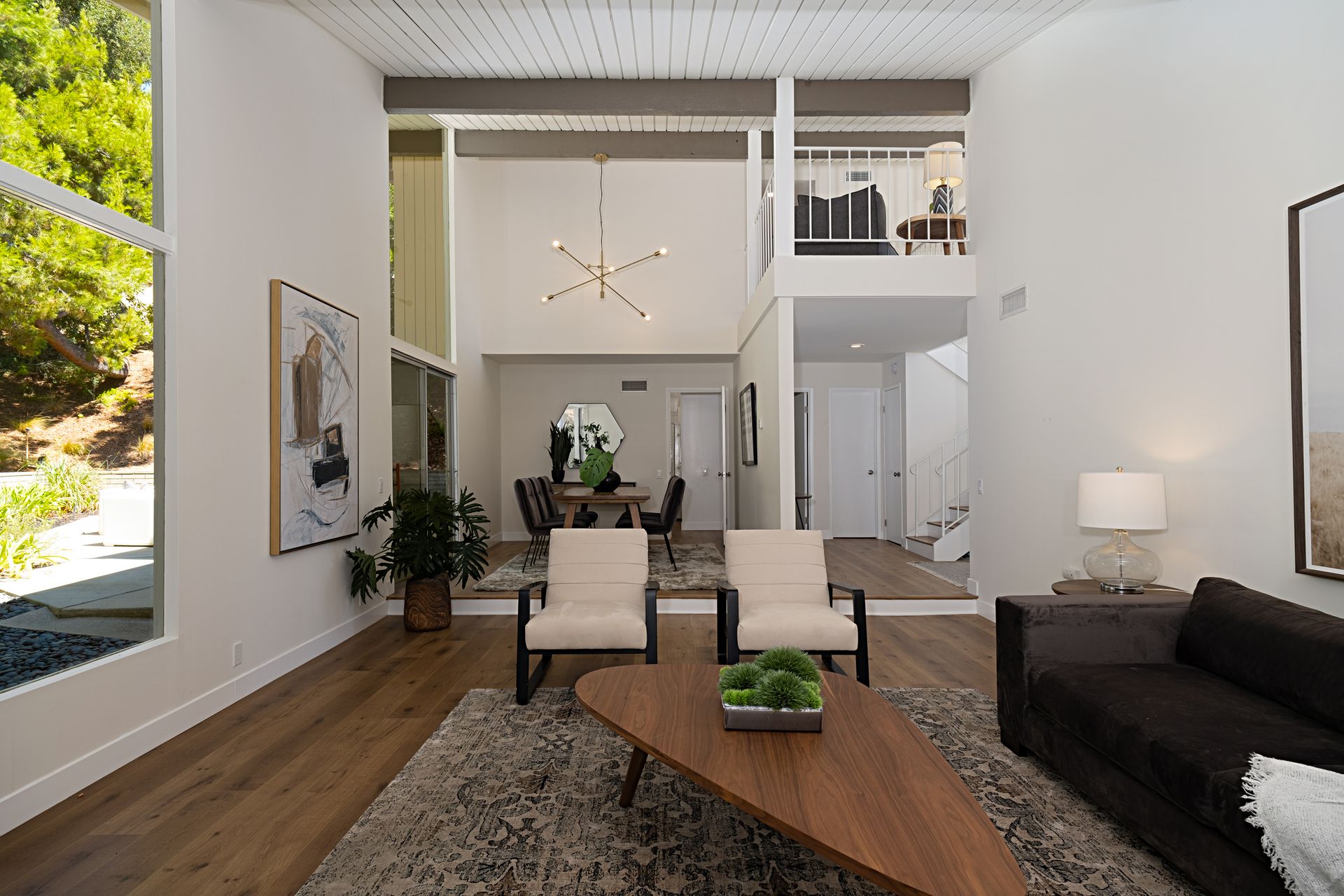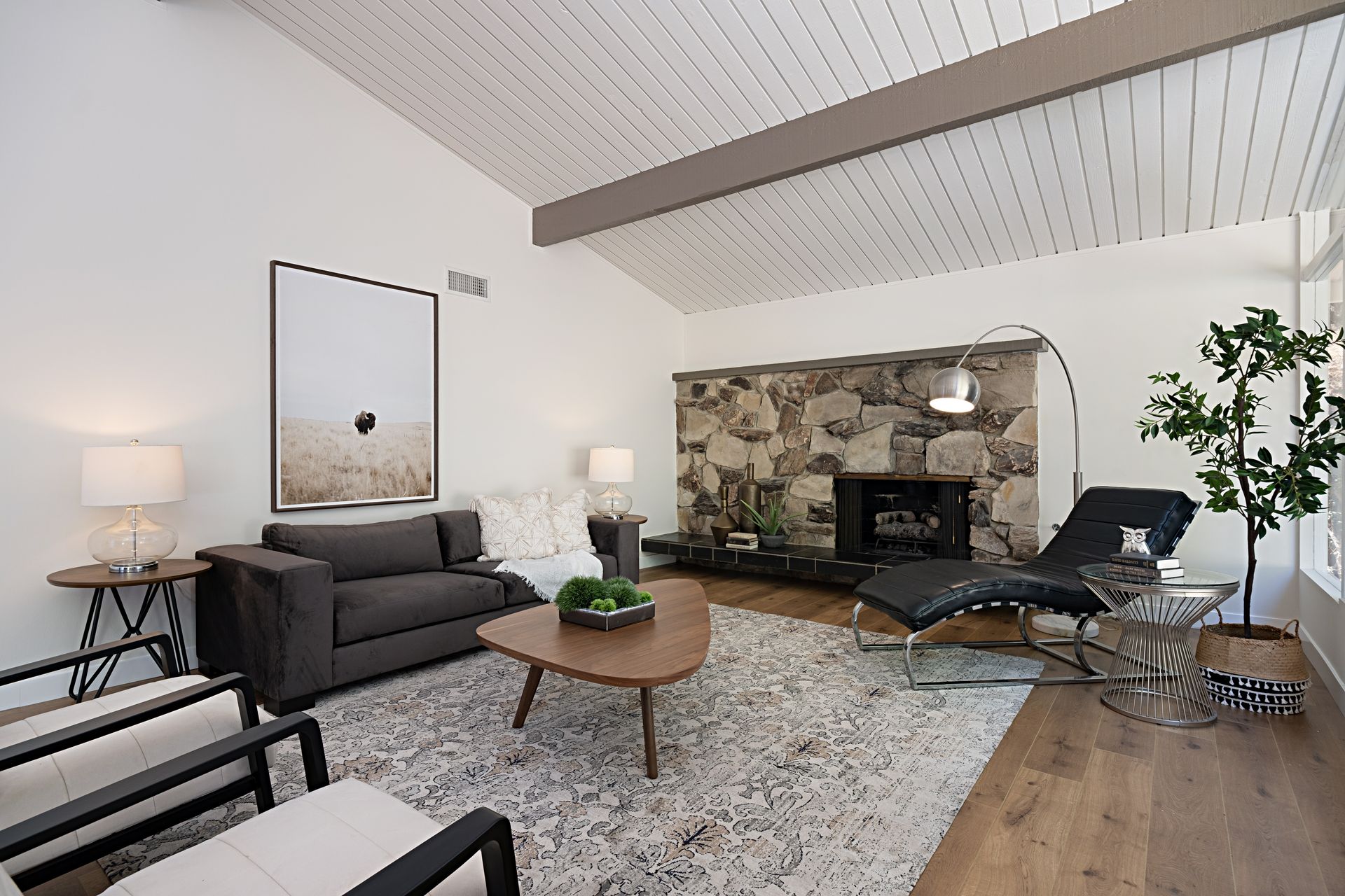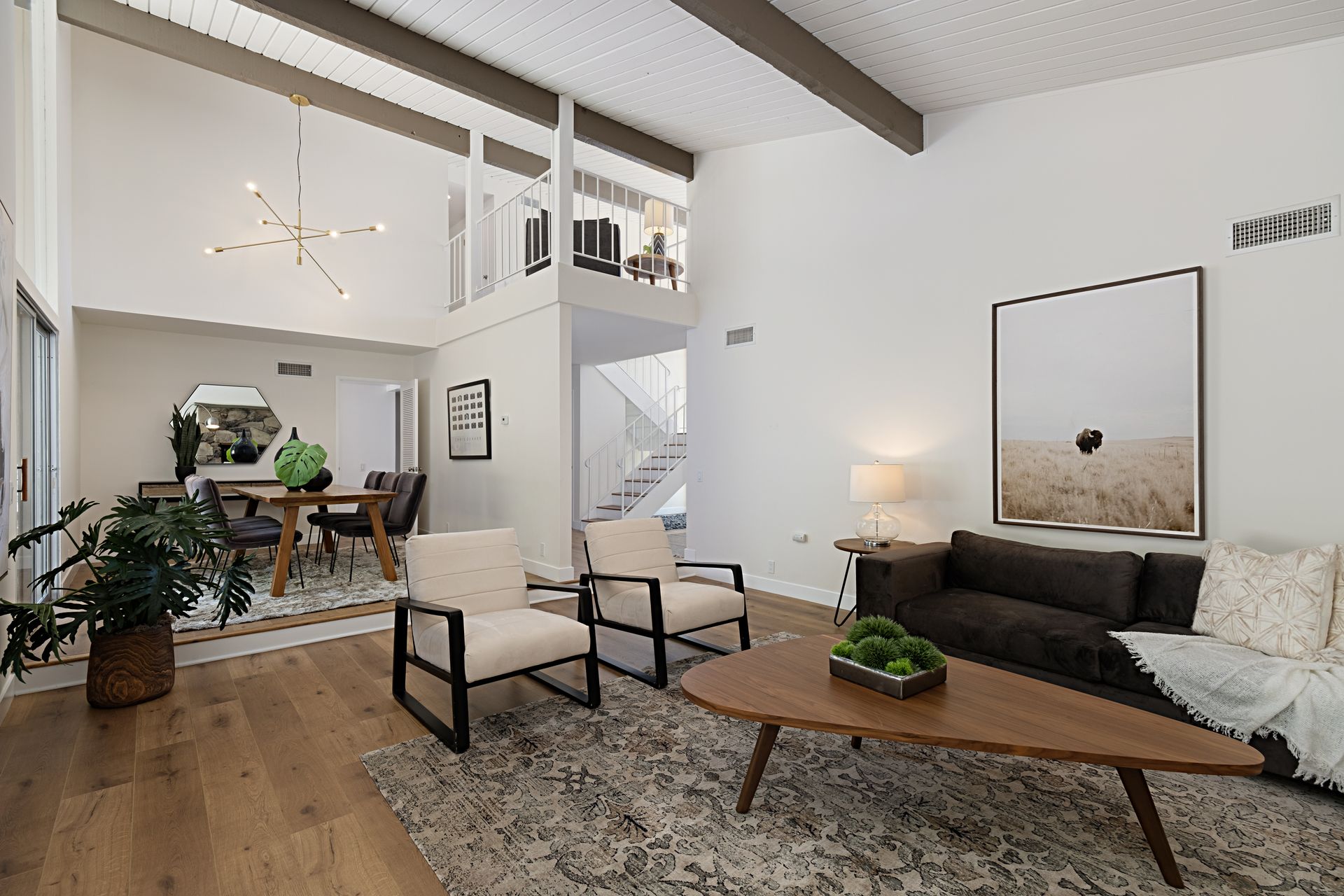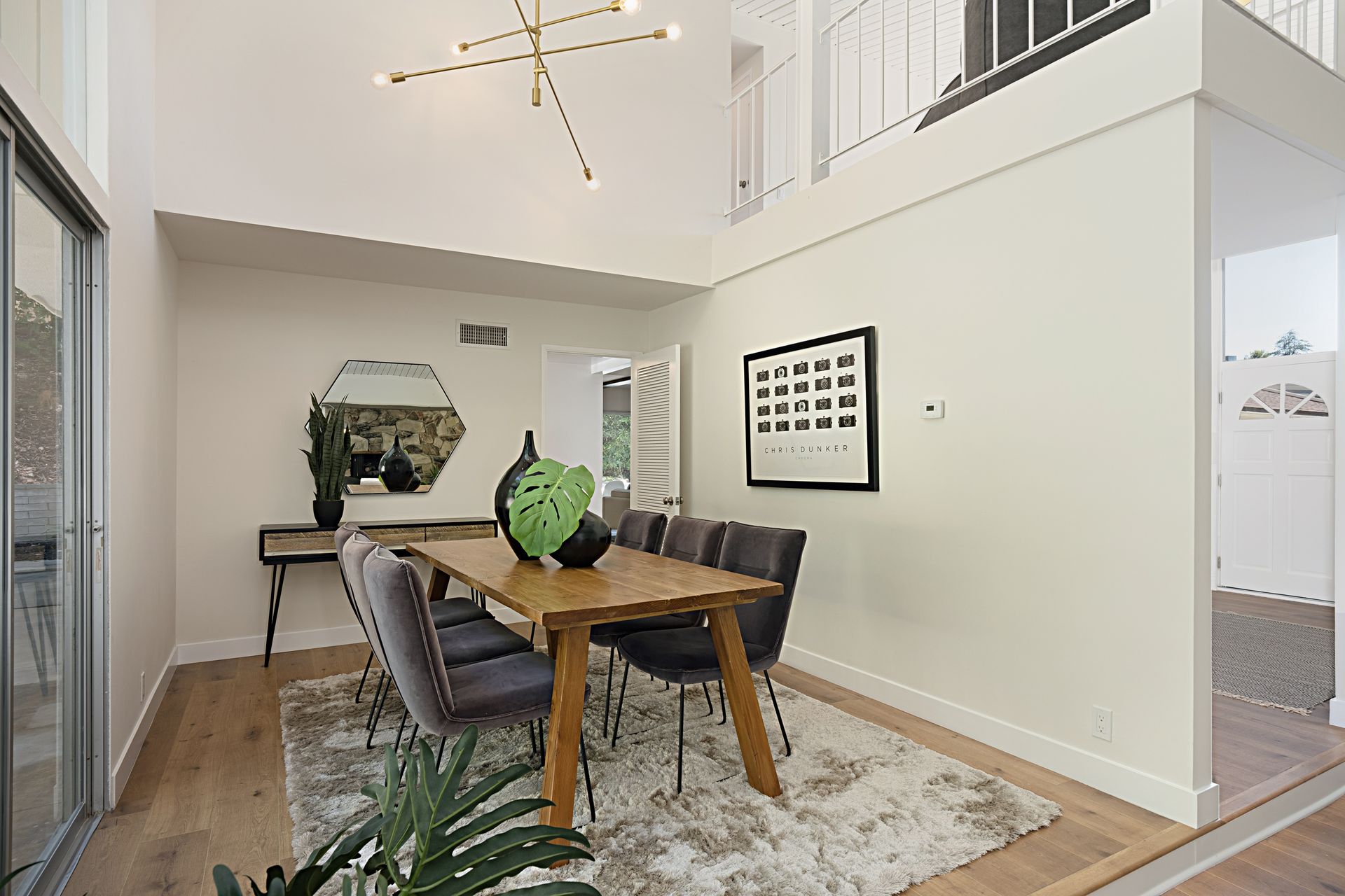 Located at the back of a peaceful cul-de-sac sits this newly re-imagined home. As you enter through the double doors you are welcomed into this very inspiring home. The two-story entrance has newer wood-like flooring throughout the downstairs and a Sputnik chandelier in the foyer. The main bedroom suite features expansive closets, a vaulted ceiling, a private enclosed patio and an updated bathroom. The large open living room has a real wood burning fireplace clad in Palisades Stone, substantial glass windows, soaring ceiling and an open dining room. The kitchen with clean lines includes a breakfast counter, double ovens, newer stove, newer sink and hardware. The adjacent family room has a sliding glass door to a spacious side yard ideal for outdoor dining. It also includes a laundry room adjacent as well as half bath. There is a separate powder room off of the foyer. Upstairs has three secondary bedrooms with a shared full bath plus a separate den/office and a bonus loft/sitting area. The backyard is private and tranquil with a large concrete patio and planters with black river rock. The two-car SxS garage has an updated door and direct access. Washer/dryer and refrigerator included. Professionally staged by Pampa Casa.
