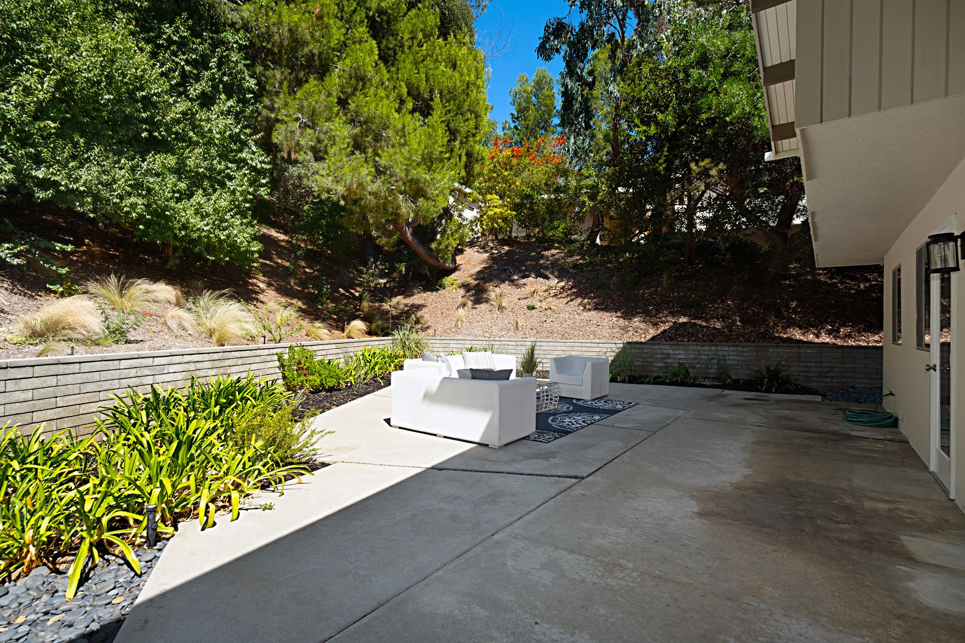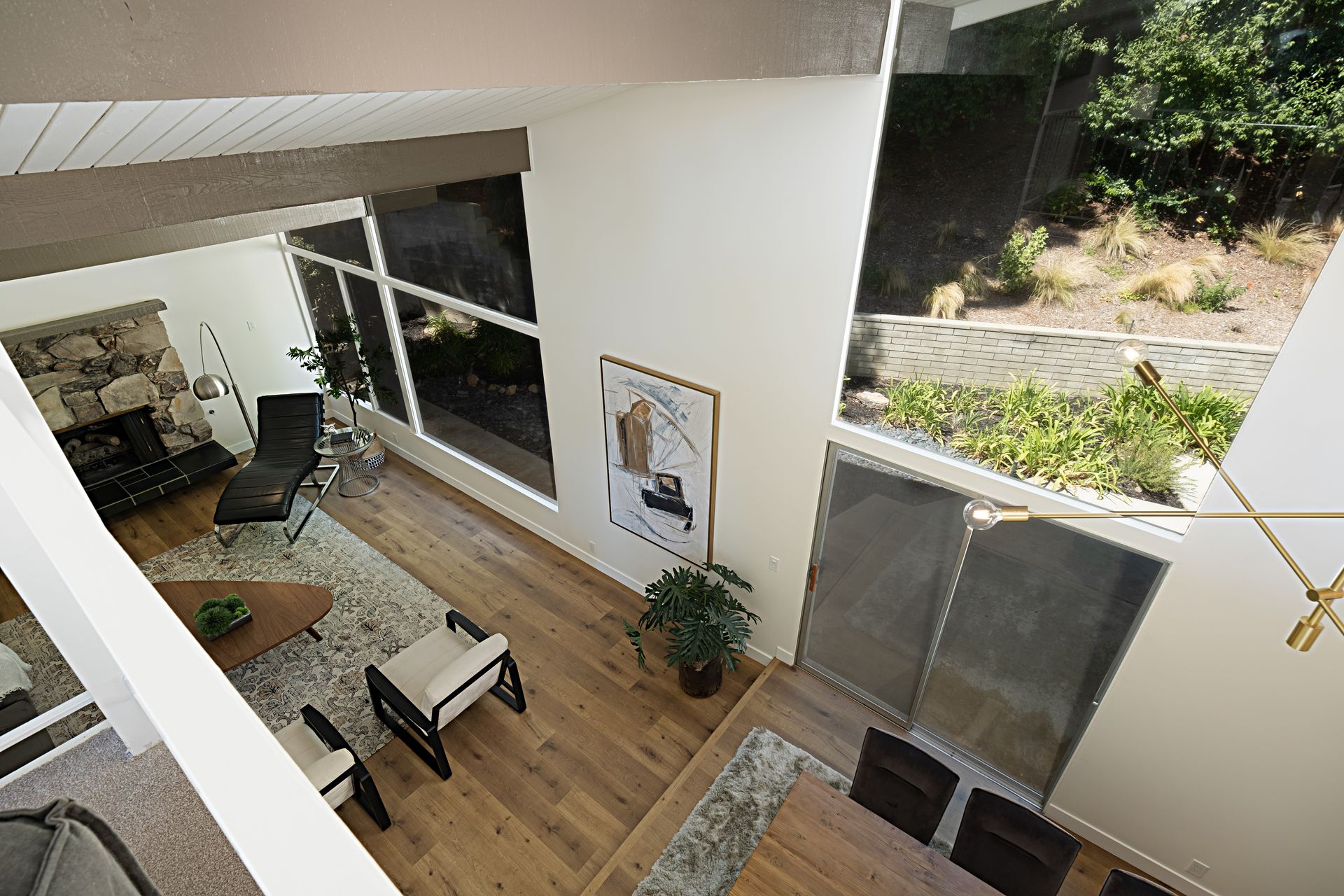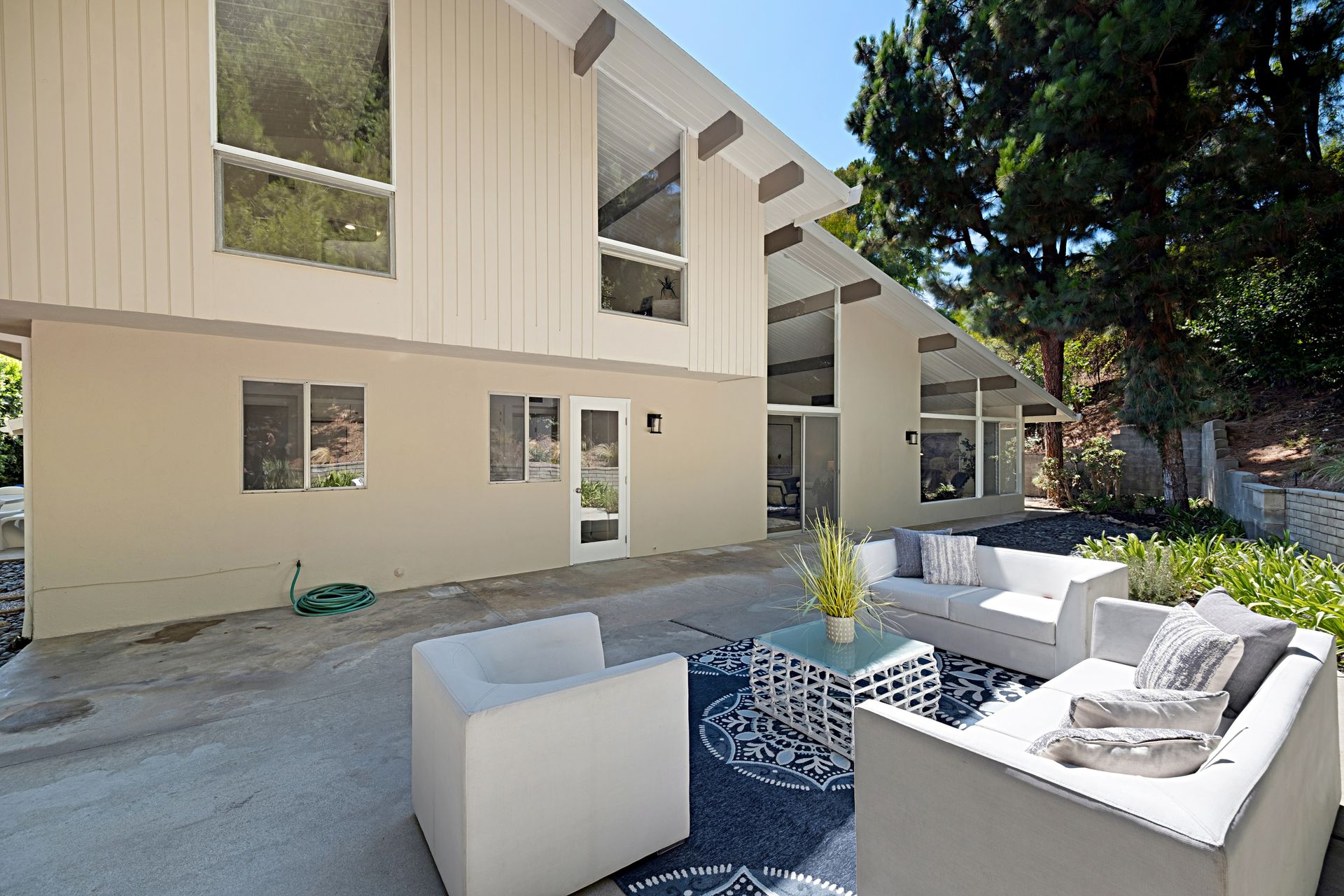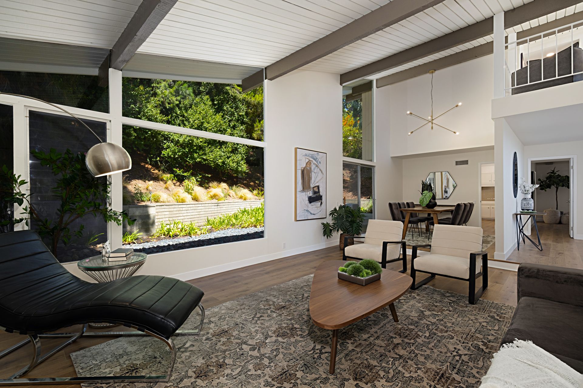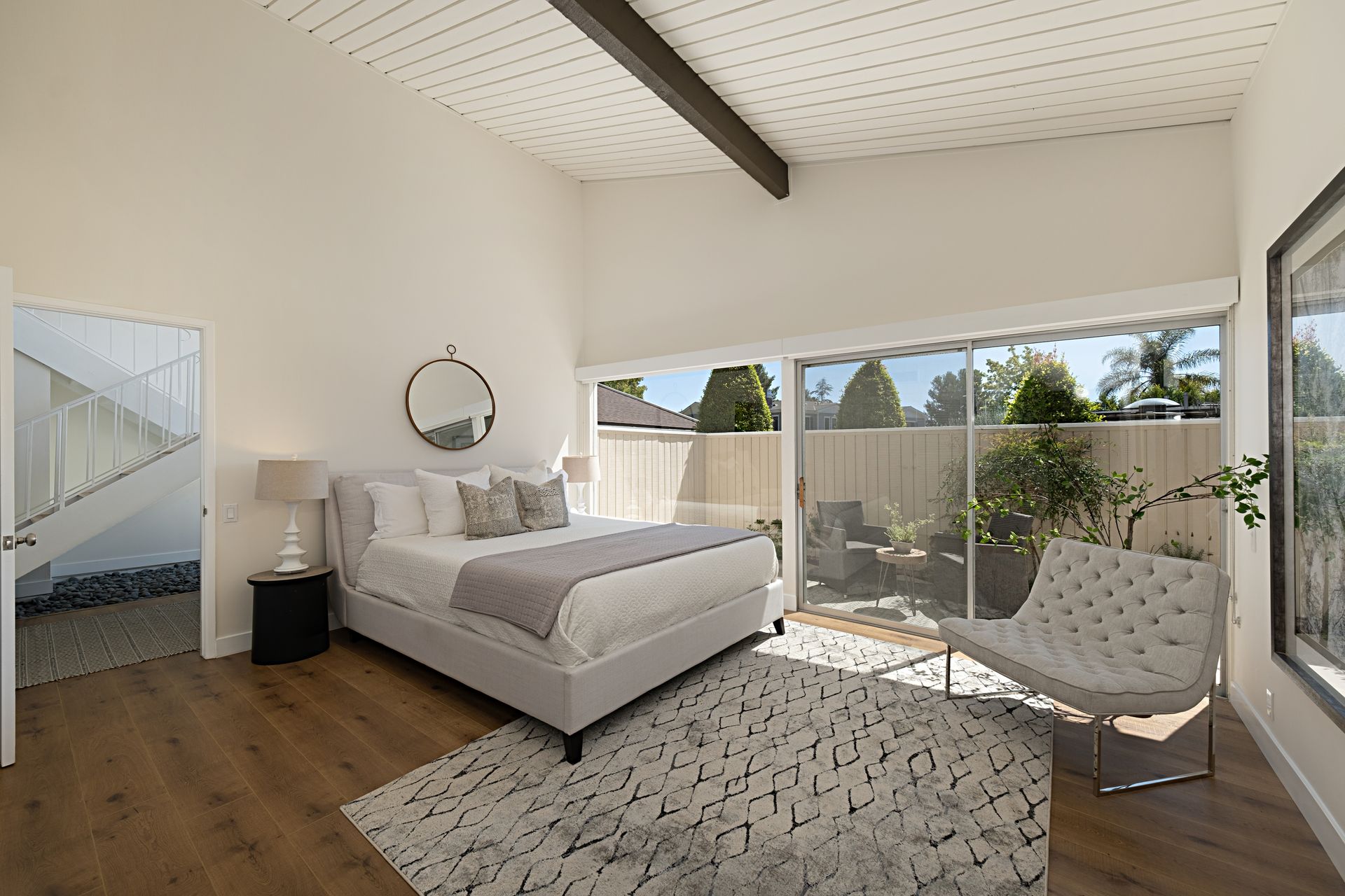 Located at the back of a peaceful cul-de-sac sits this newly re-imagined home. As you enter through the double doors you are welcomed into this very inspiring home. The two-story entrance has newer wood-like flooring throughout the downstairs and a Sputnik chandelier in the foyer. The main bedroom suite features expansive closets, a vaulted ceiling, a private enclosed patio and an updated bathroom. The large open living room has a real wood burning fireplace clad in Palisades Stone, substantial glass windows, soaring ceiling and an open dining room. The kitchen with clean lines includes a breakfast counter, double ovens, newer stove, newer sink and hardware. The adjacent family room has a sliding glass door to a spacious side yard ideal for outdoor dining. It also includes a laundry room adjacent as well as half bath. There is a separate powder room off of the foyer. Upstairs has three secondary bedrooms with a shared full bath plus a separate den/office and a bonus loft/sitting area. The backyard is private and tranquil with a large concrete patio and planters with black river rock. The two-car SxS garage has an updated door and direct access. Washer/dryer and refrigerator included. Professionally staged by Pampa Casa.