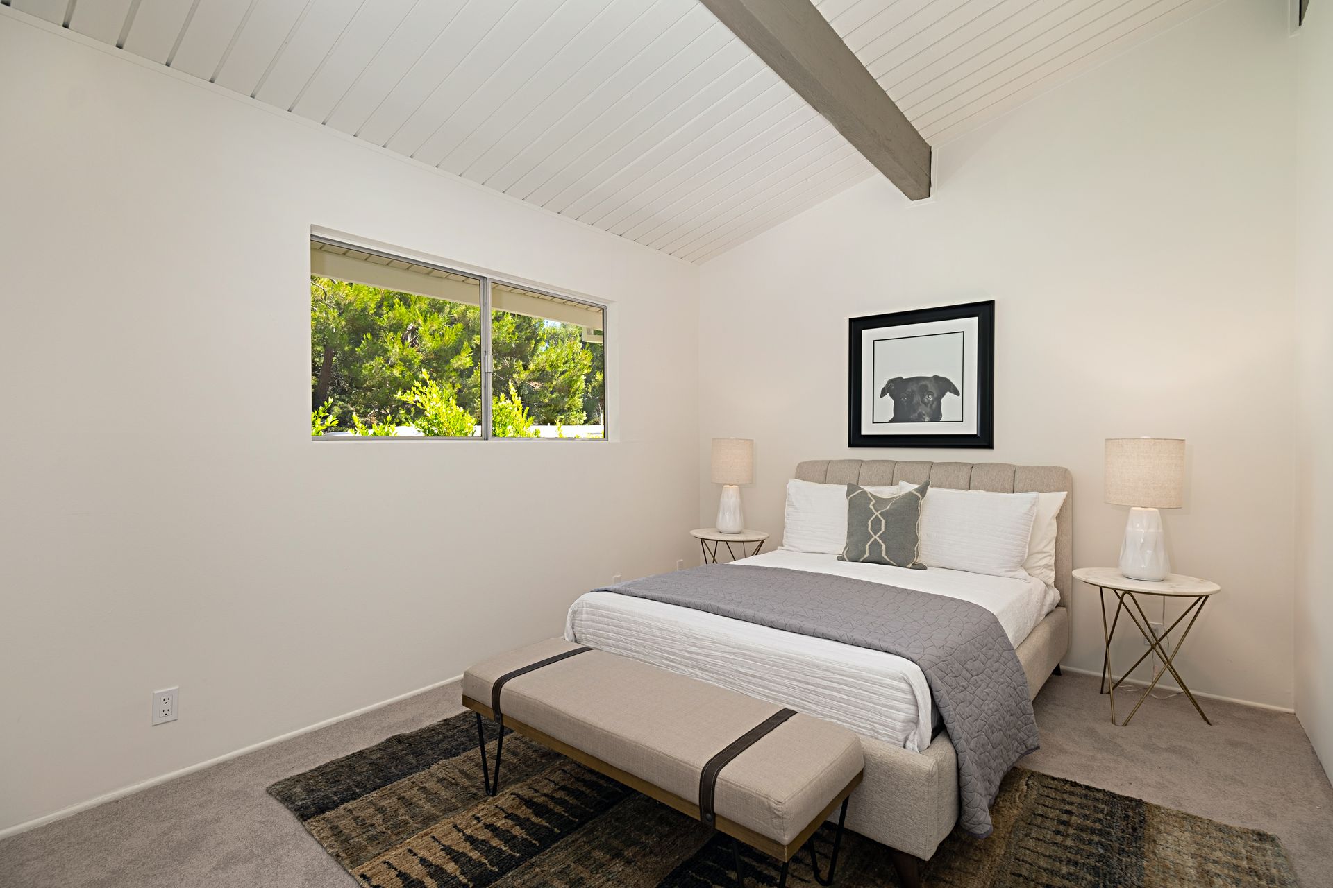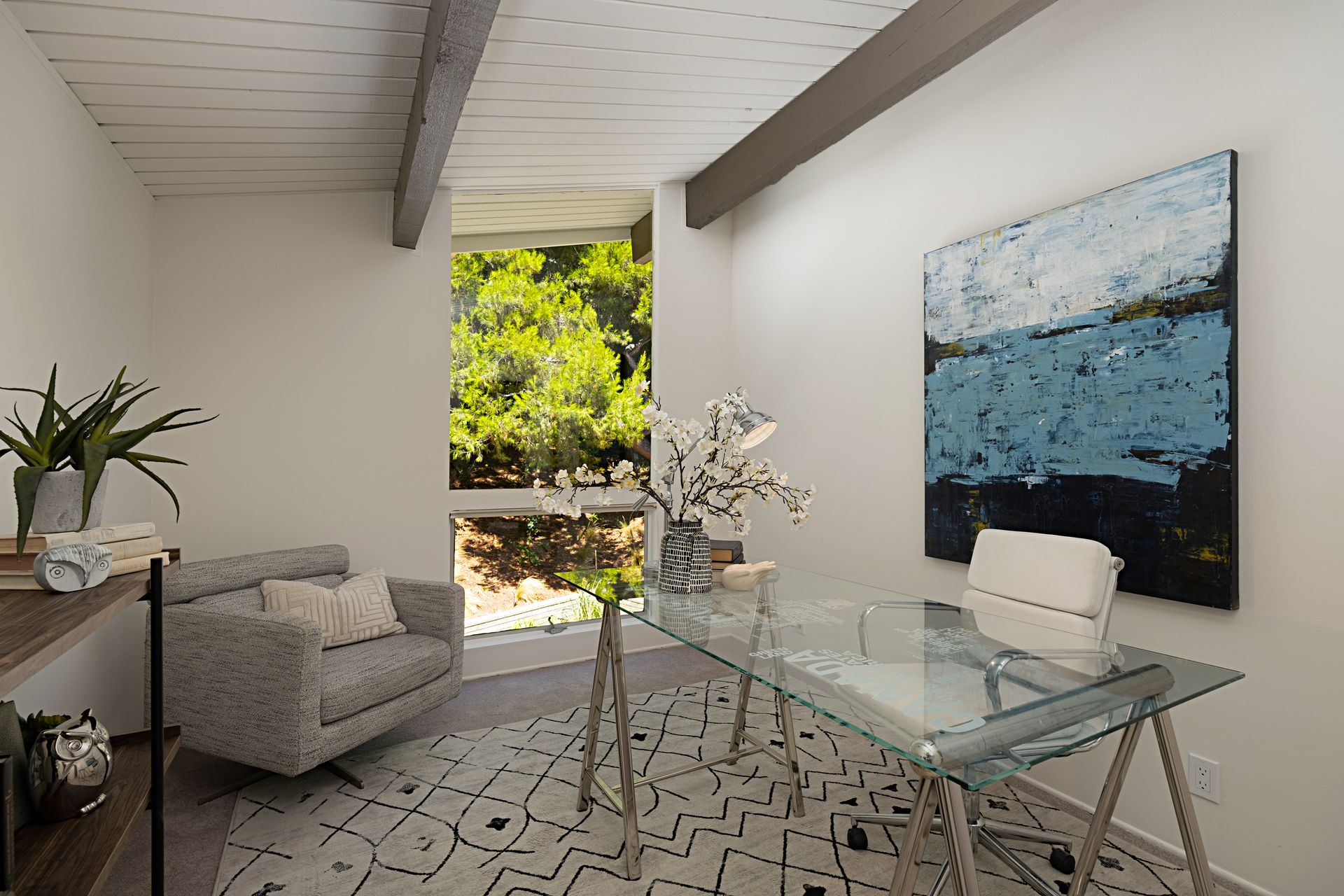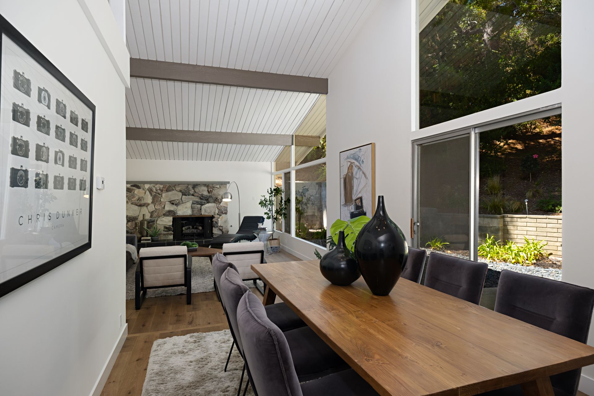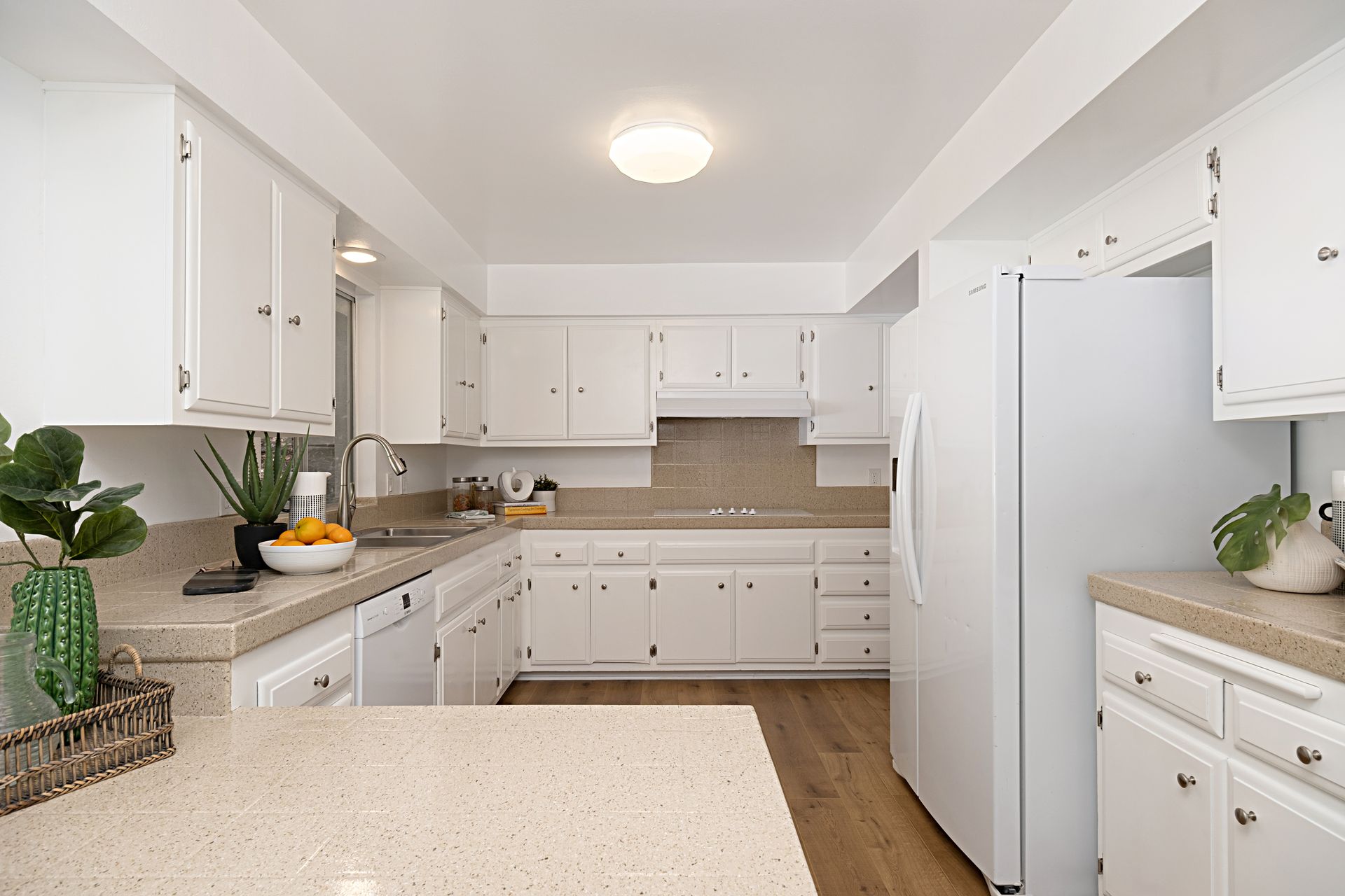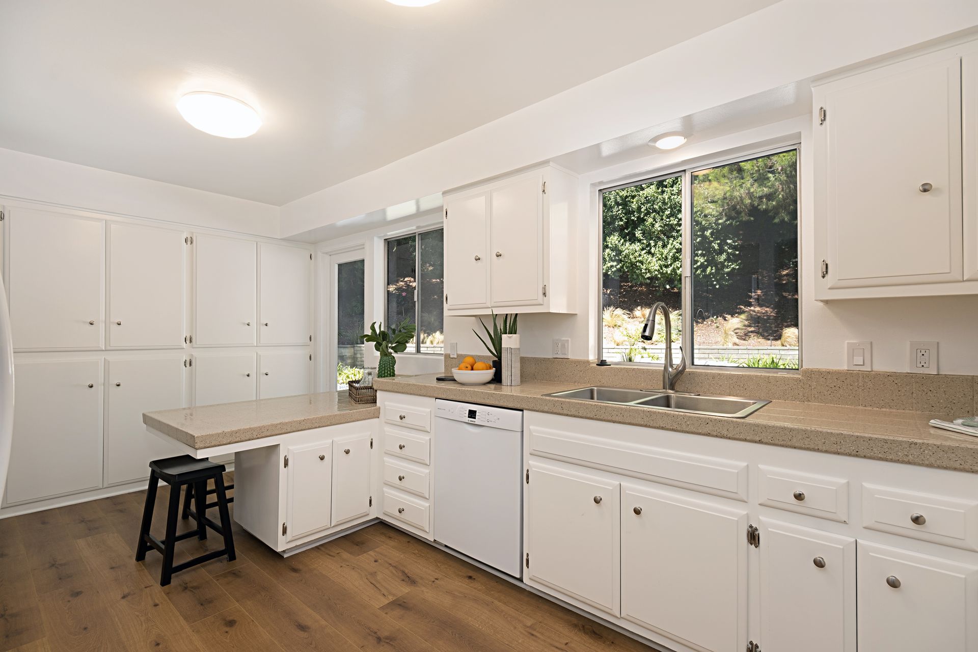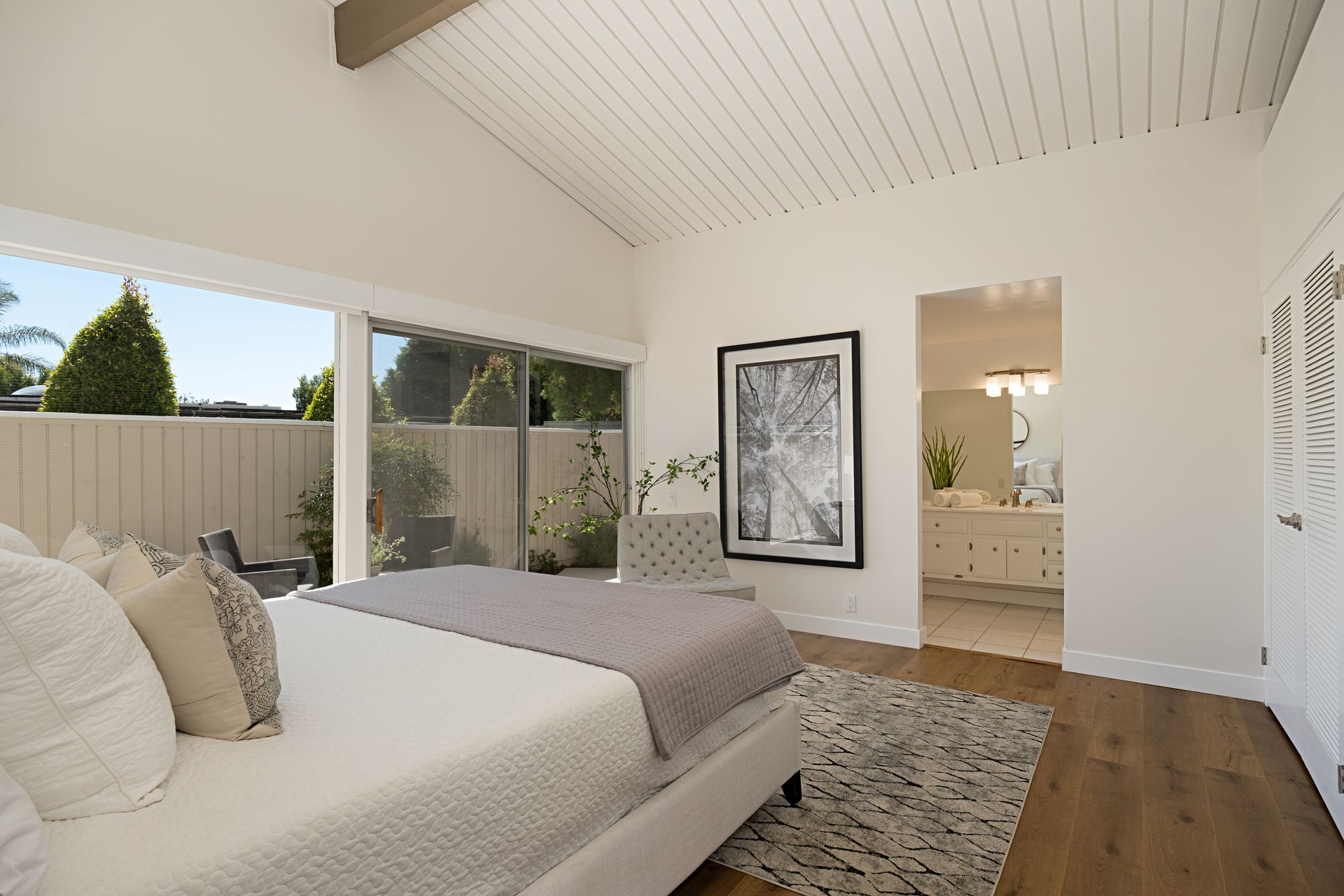 Located at the back of a peaceful cul-de-sac sits this newly re-imagined home. As you enter through the double doors you are welcomed into this very inspiring home. The two-story entrance has newer wood-like flooring throughout the downstairs and a Sputnik chandelier in the foyer. The main bedroom suite features expansive closets, a vaulted ceiling, a private enclosed patio and an updated bathroom. The large open living room has a real wood burning fireplace clad in Palisades Stone, substantial glass windows, soaring ceiling and an open dining room. The kitchen with clean lines includes a breakfast counter, double ovens, newer stove, newer sink and hardware. The adjacent family room has a sliding glass door to a spacious side yard ideal for outdoor dining. It also includes a laundry room adjacent as well as half bath. There is a separate powder room off of the foyer. Upstairs has three secondary bedrooms with a shared full bath plus a separate den/office and a bonus loft/sitting area. The backyard is private and tranquil with a large concrete patio and planters with black river rock. The two-car SxS garage has an updated door and direct access. Washer/dryer and refrigerator included. Professionally staged by Pampa Casa.