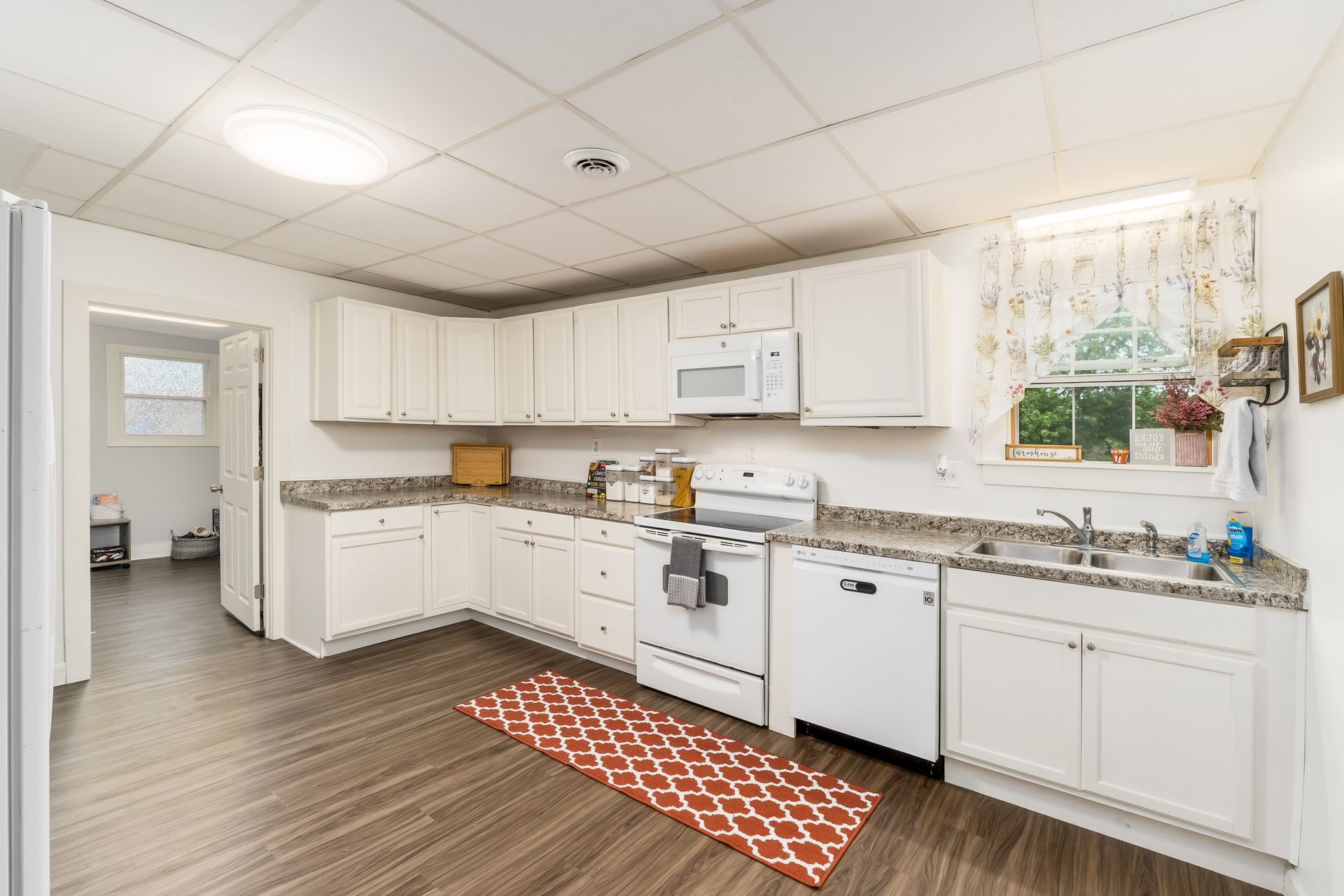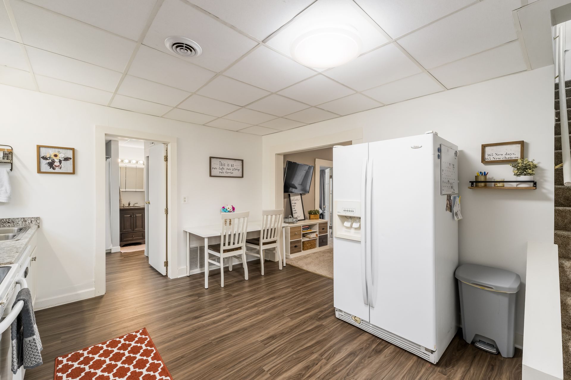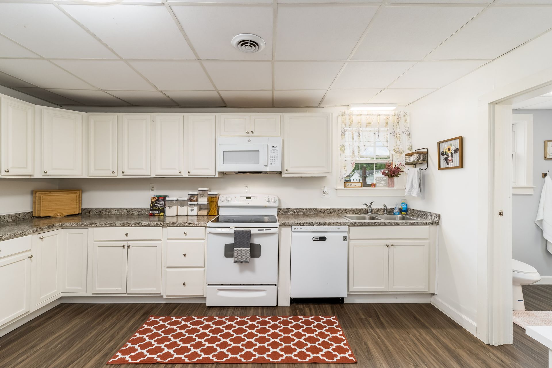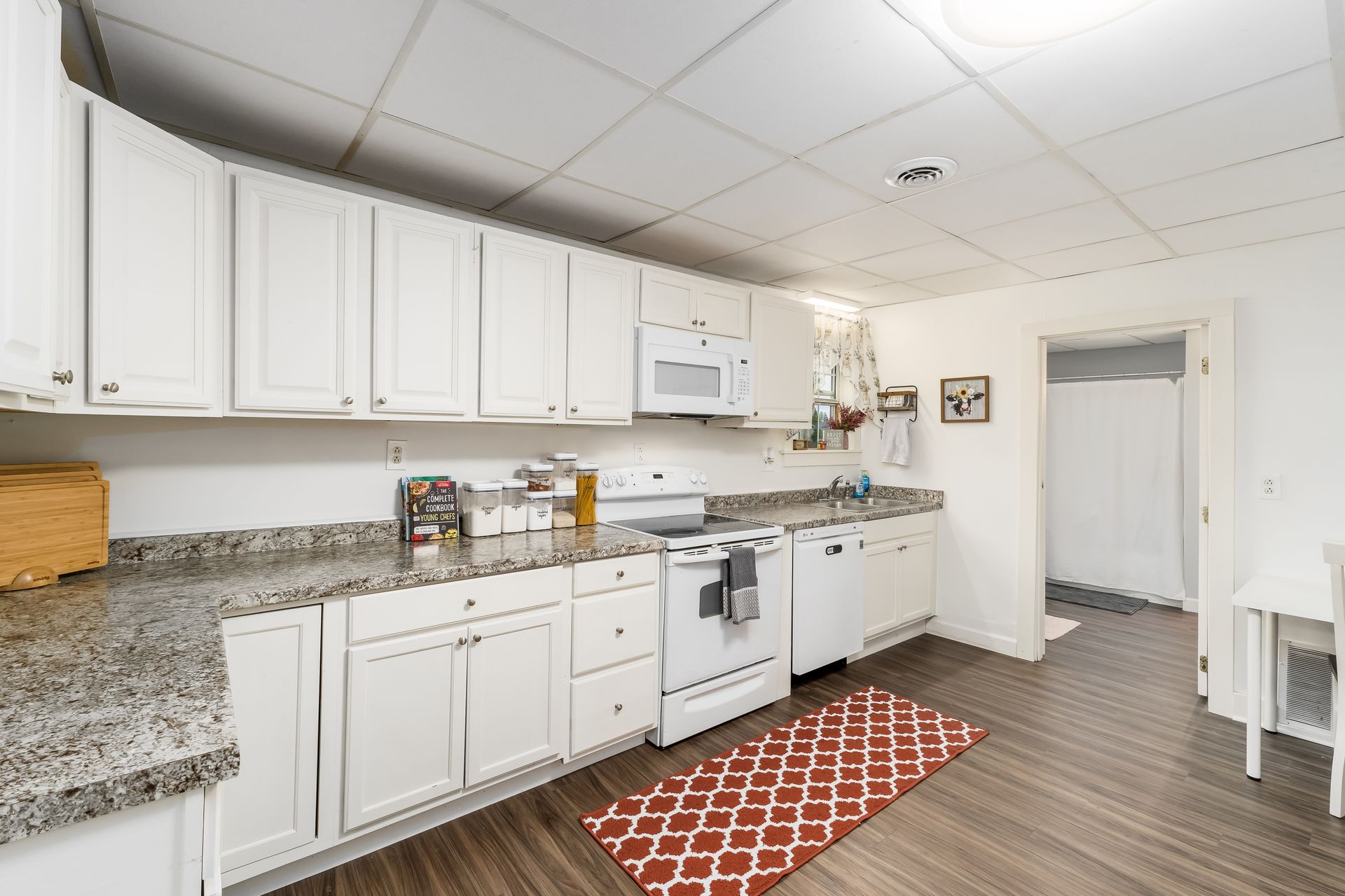 offers a large kitchen with updated cabinets, new counter tops, new flooring throughout, fresh paint, new hot water tank, and both full baths