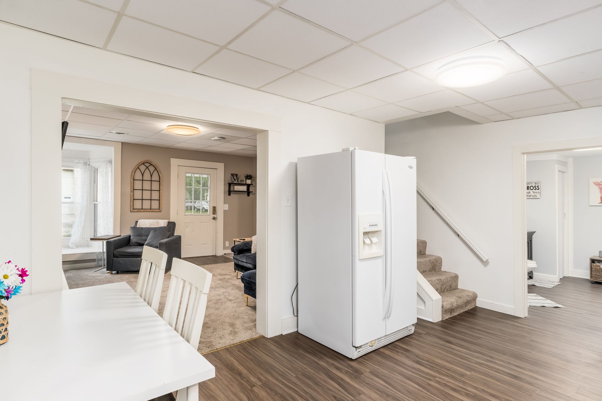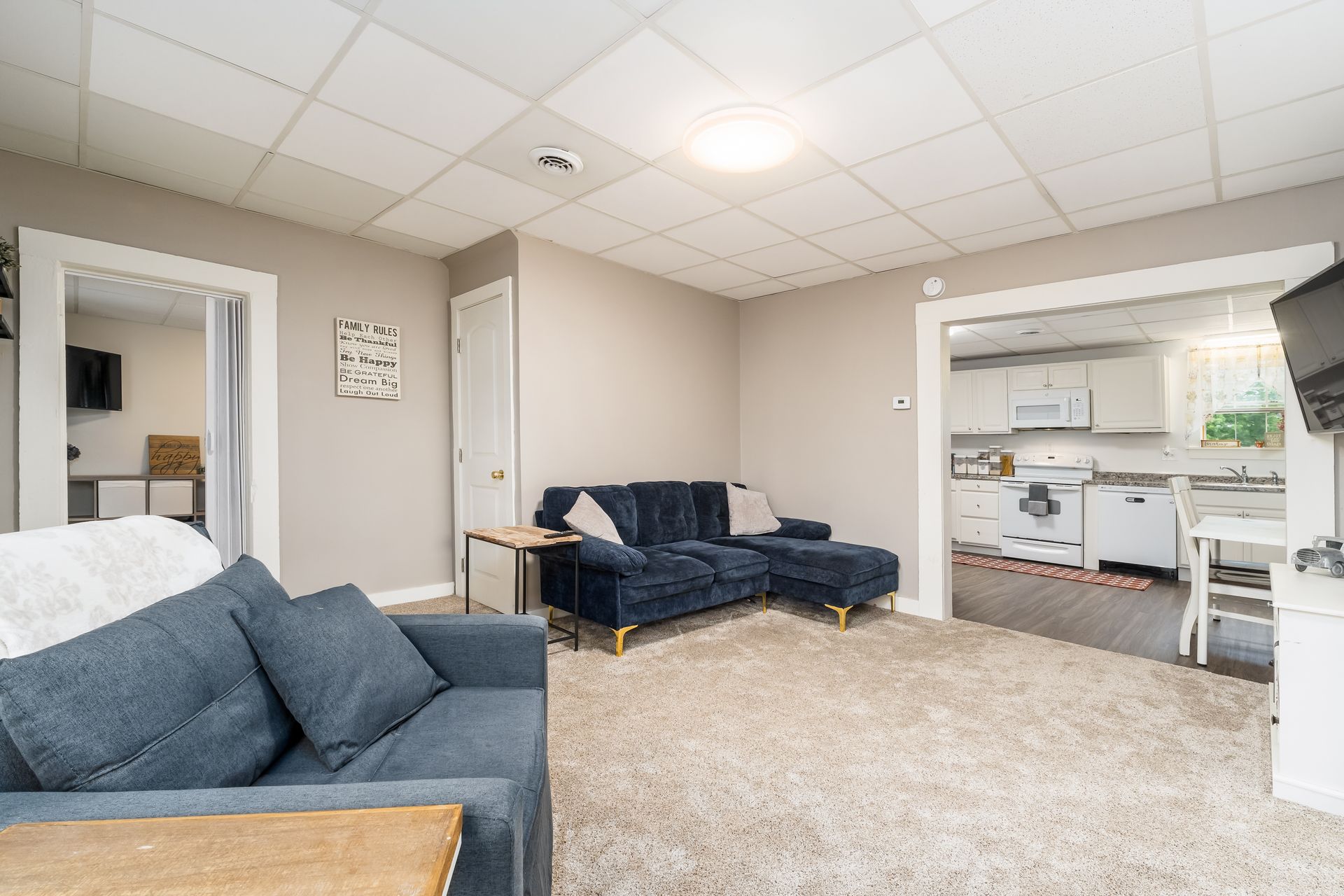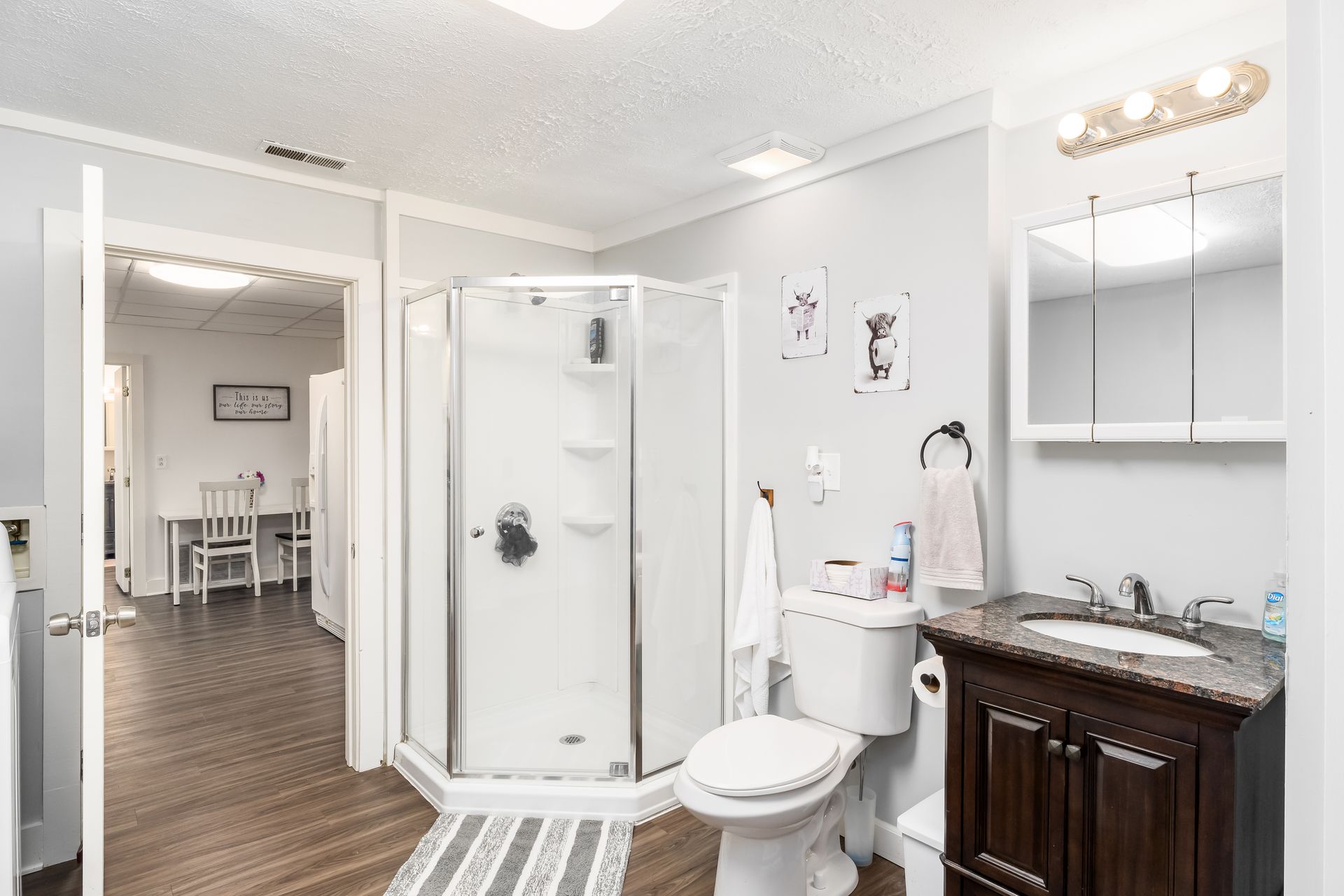 offers a large kitchen with updated cabinets, new counter tops, new flooring throughout, fresh paint, new hot water tank, and both full baths