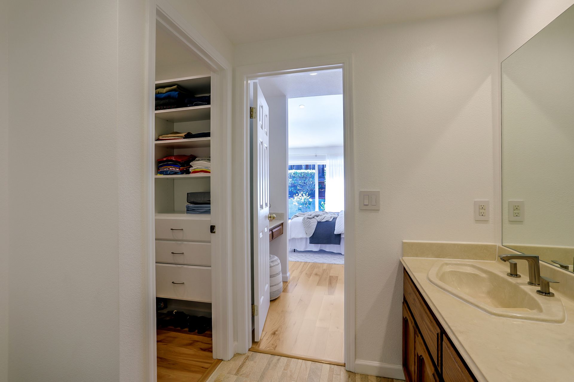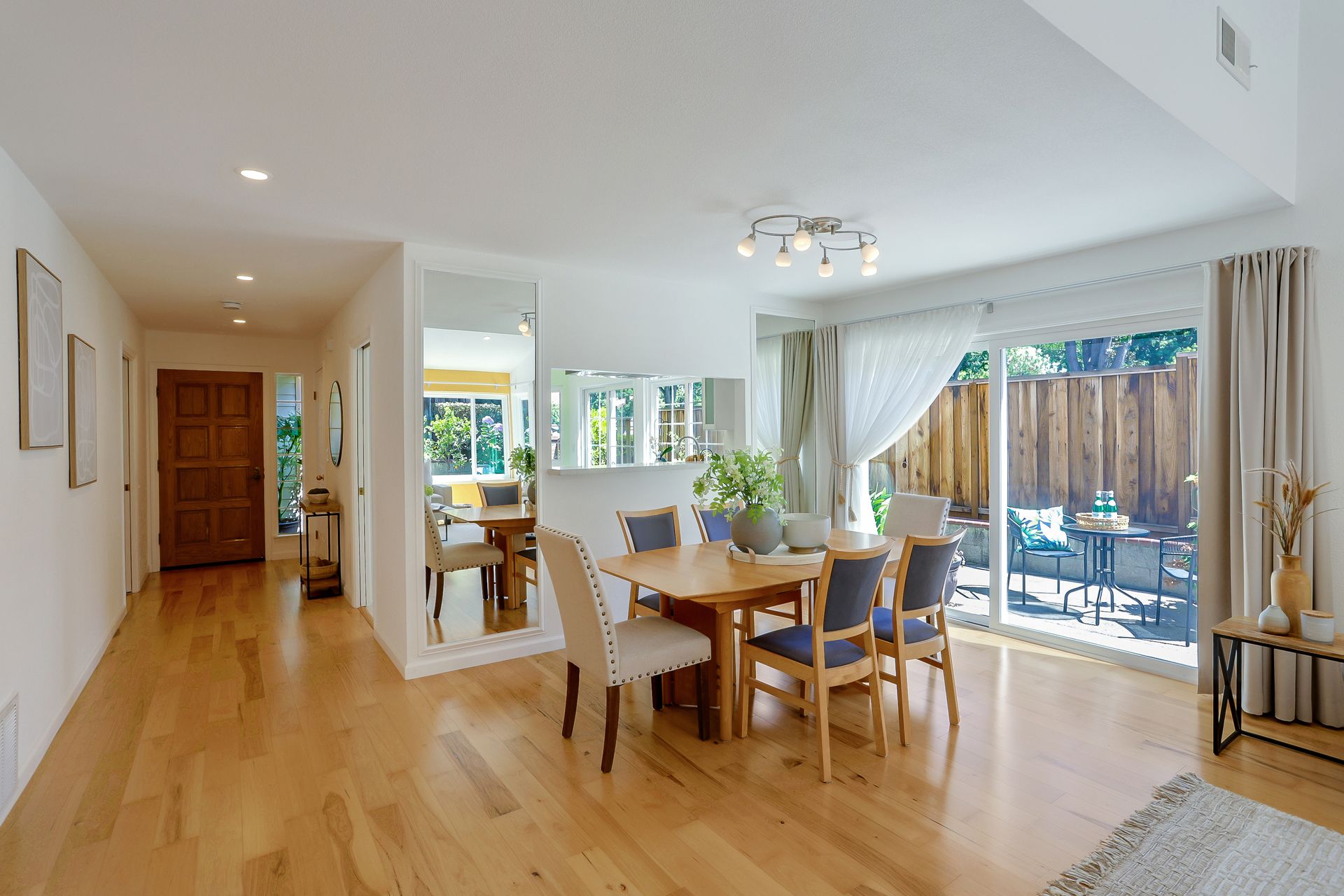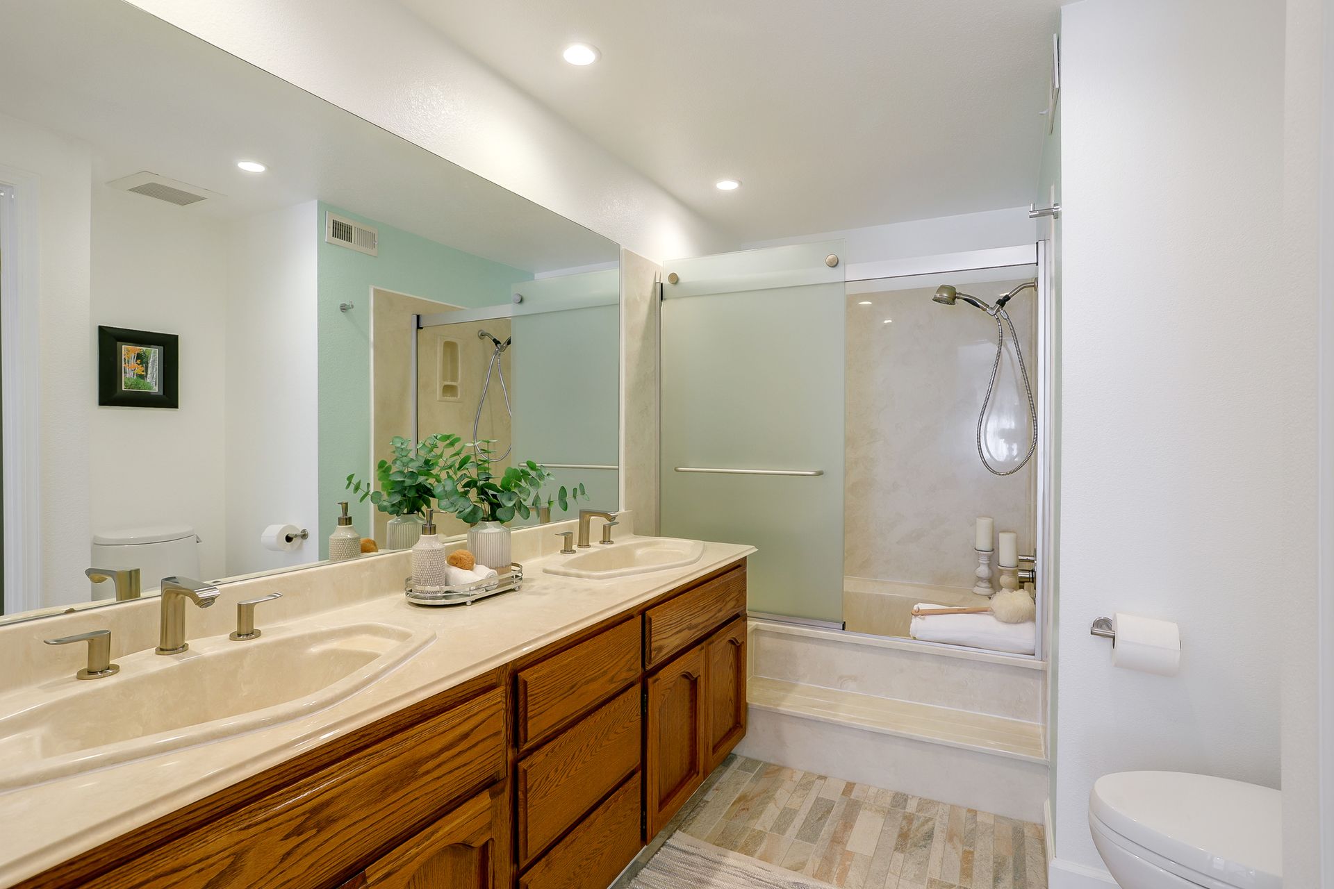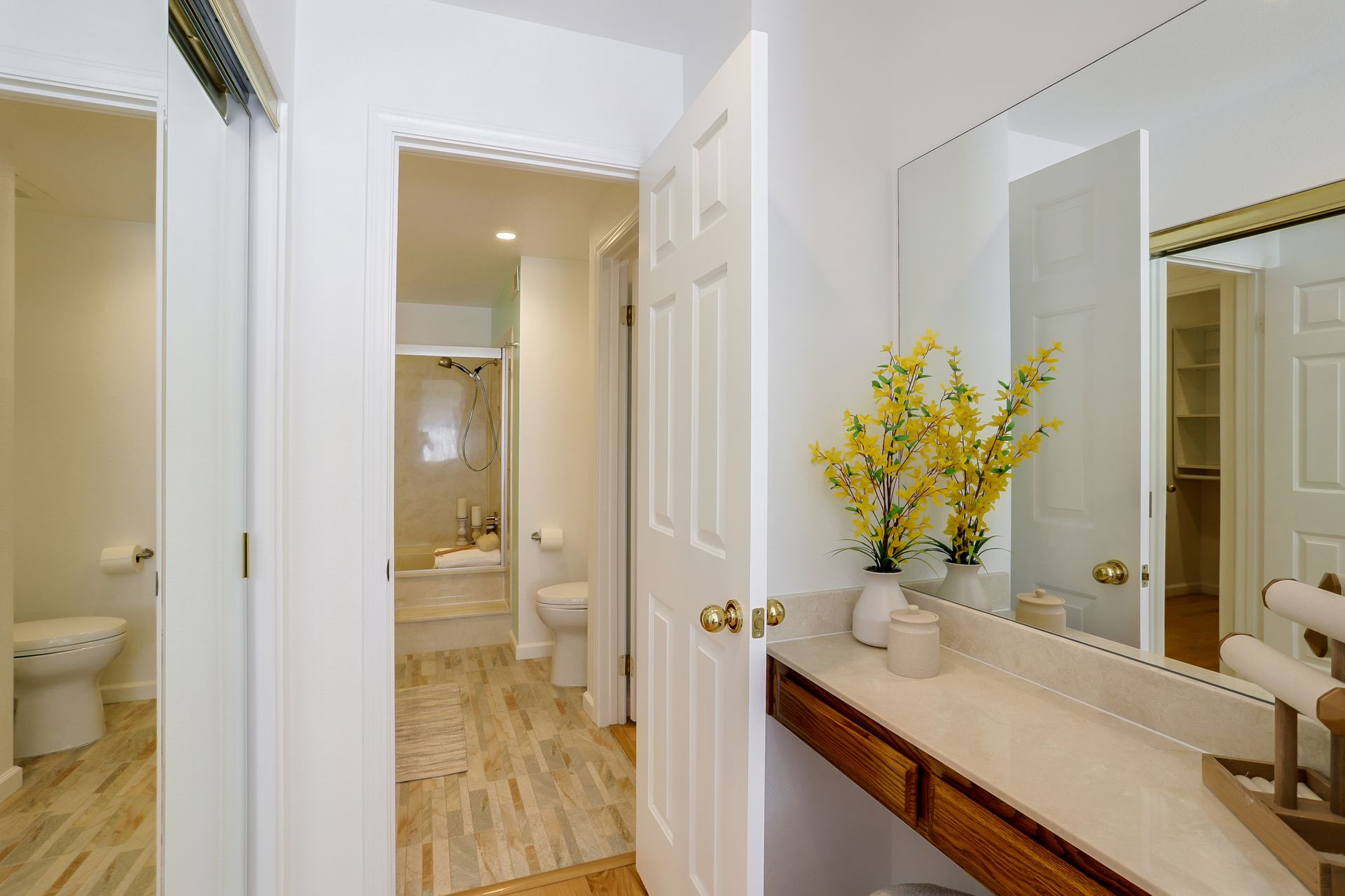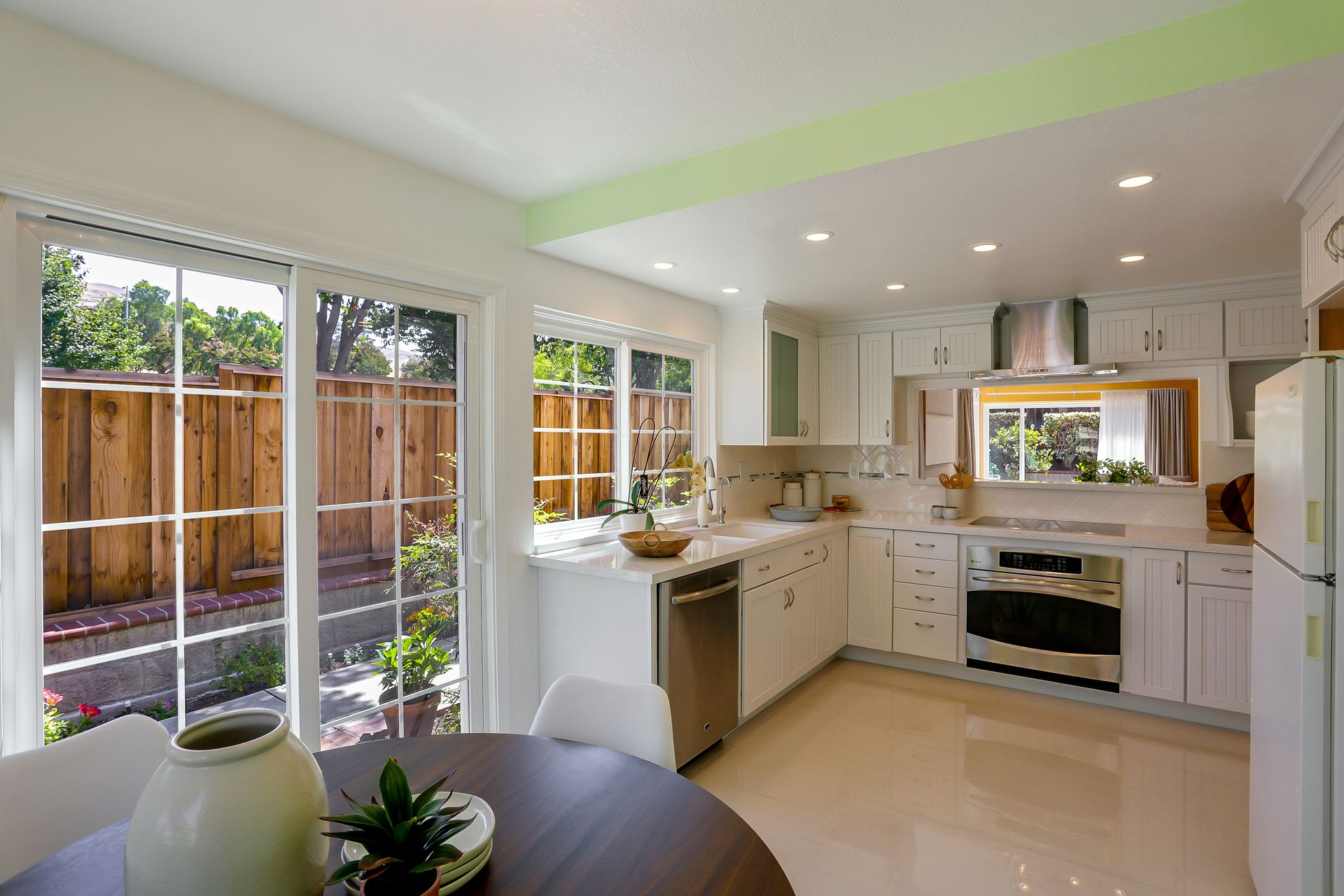 Welcome to this bright and beautiful home nestled near the foothills in the wonderful Hillcrest Villas community. This single-level home has been updated throughout including Hickory and tile flooring, recessed lighting, fabulous eat-in kitchen with lovely white cabinetry, ECO green rated counters, GE Profile Series oven, LG Radiant cooktop, Maytag JetClean Plus dishwasher and gleaming tile floors. The spacious dining and living room area with vaulted ceilings and gas starter fireplace is awash with natural light and connected to the peaceful outside space via sliding glass doors. Bathrooms include updated fixtures, lighting, newer tile flooring and a stunning shower in the hall bath. The primary suite boasts vaulted ceilings, two closets – one with mirrored doors, as well as a walk-in closet with organizers and a luxurious soaking tub. The waterwise garden wraps around three sides of the home with raised beds and numerous fruit trees, creating a tranquil setting for morning coffee or relaxing evenings. Enjoy use of the community pool and barbeque area, nearby Hillcrest Park, as well as highly rated Sinnott Elementary and Rancho Milpitas Middle Schools all in under a mile, Stratford School, The Great Mall and Bart all within two miles from this exceptional home.