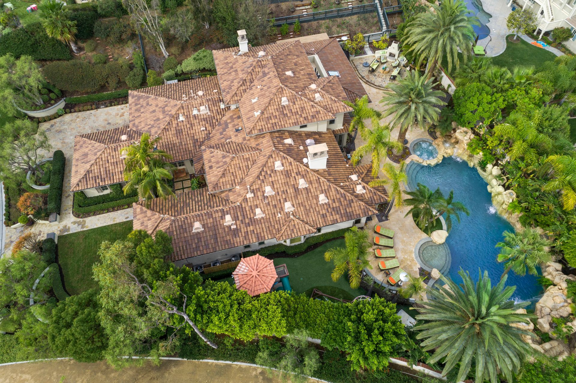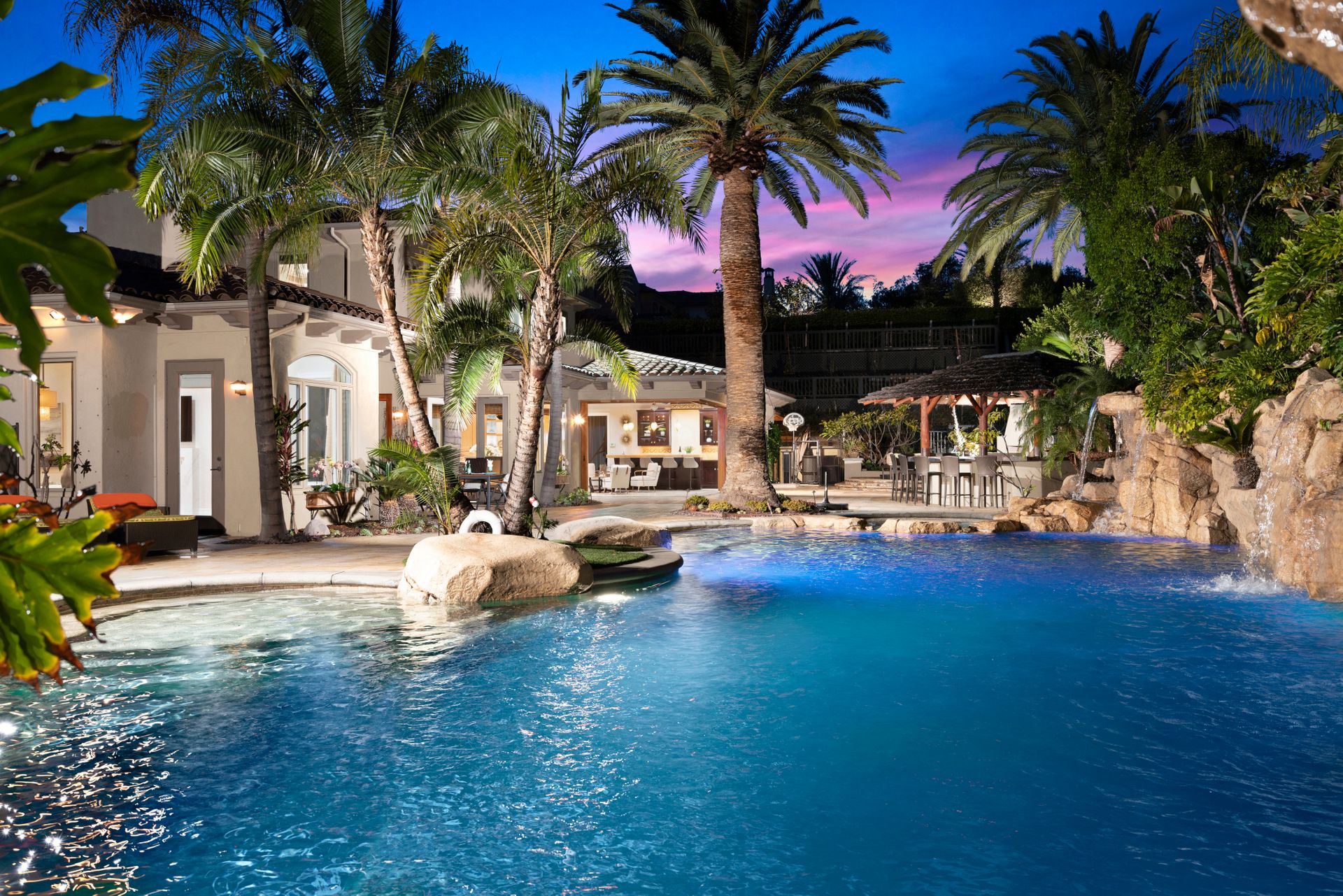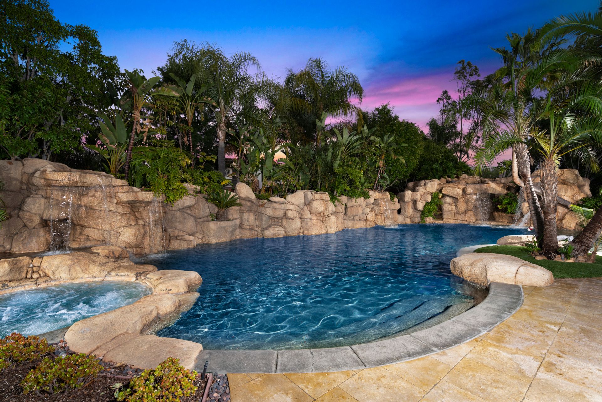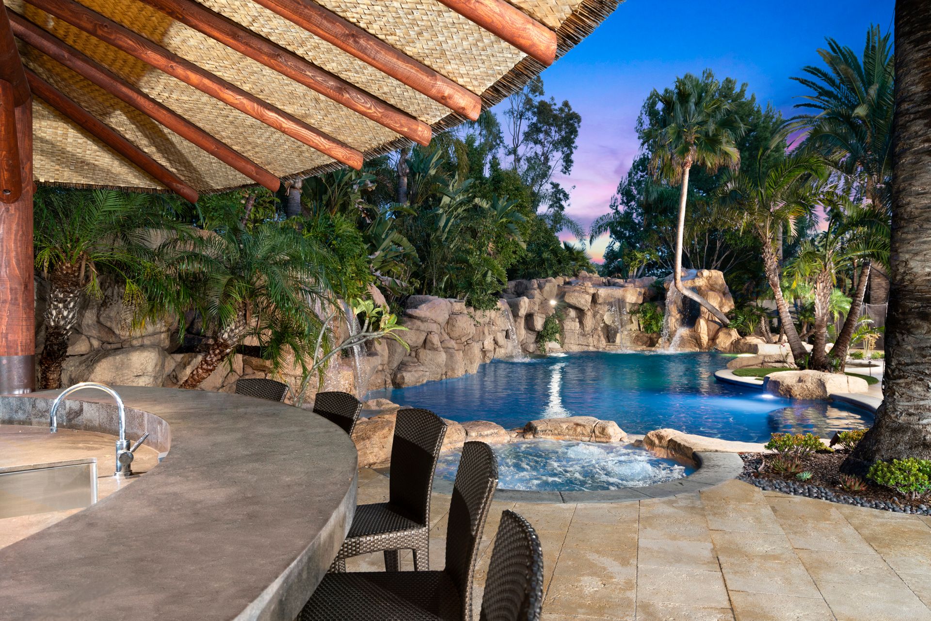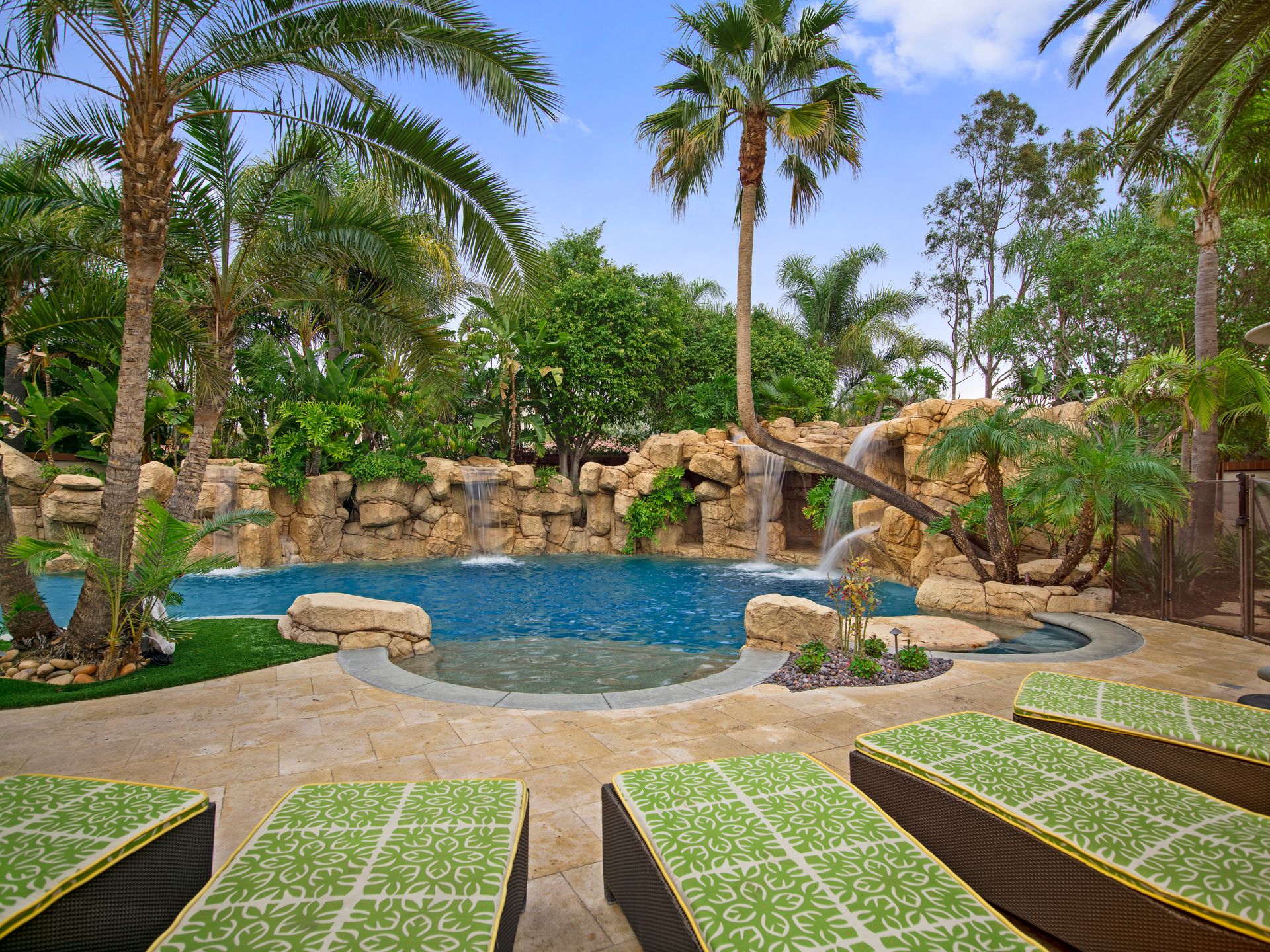 The crown jewel of Tustin Ranch Estates set atop an expansive 29,054 square foot corner lot, this slice of paradise exudes extravagance throughout! Rich in sophistication, this coastal contemporary sanctuary offers views of the spectacular backyard from every room. Chef-inspired kitchen & grand living space open to multiple entertaining areas, most notably an open-air lanai adorned w/Sapele wood ceilings & full custom bar offering unobstructed views through disappearing pocket glass doors that blend the home into its outdoor paradise of lush tropical gardens and cascading waterfalls. 4 bedrooms, including the master, are on the main level for a single-story feel, along w/ 4.5 baths, music room & office. 2nd-story great room offers panoramic views from adjacent viewing deck, plus 2 bedrooms and a full bath with a steam shower and dual towel warmers for the most discerning guests. Crafted as a seamless extension of the estate’s natural surroundings, every inch of outdoor space is complemented by lavish amenities, including mature Canary Island palms, private grotto, thatched-roof palapa bar, outdoor kitchen & fireplace, cavernous waterfalls, salt water pool & spa, 20-ft slide, sunning deck & charming child’s treehouse. This home’s desirable corner location and masterful resort-style craftsmanship make this a rare opportunity to purchase your own piece of paradise in the highly sought after, guard-gated community of Tustin Ranch Estates.