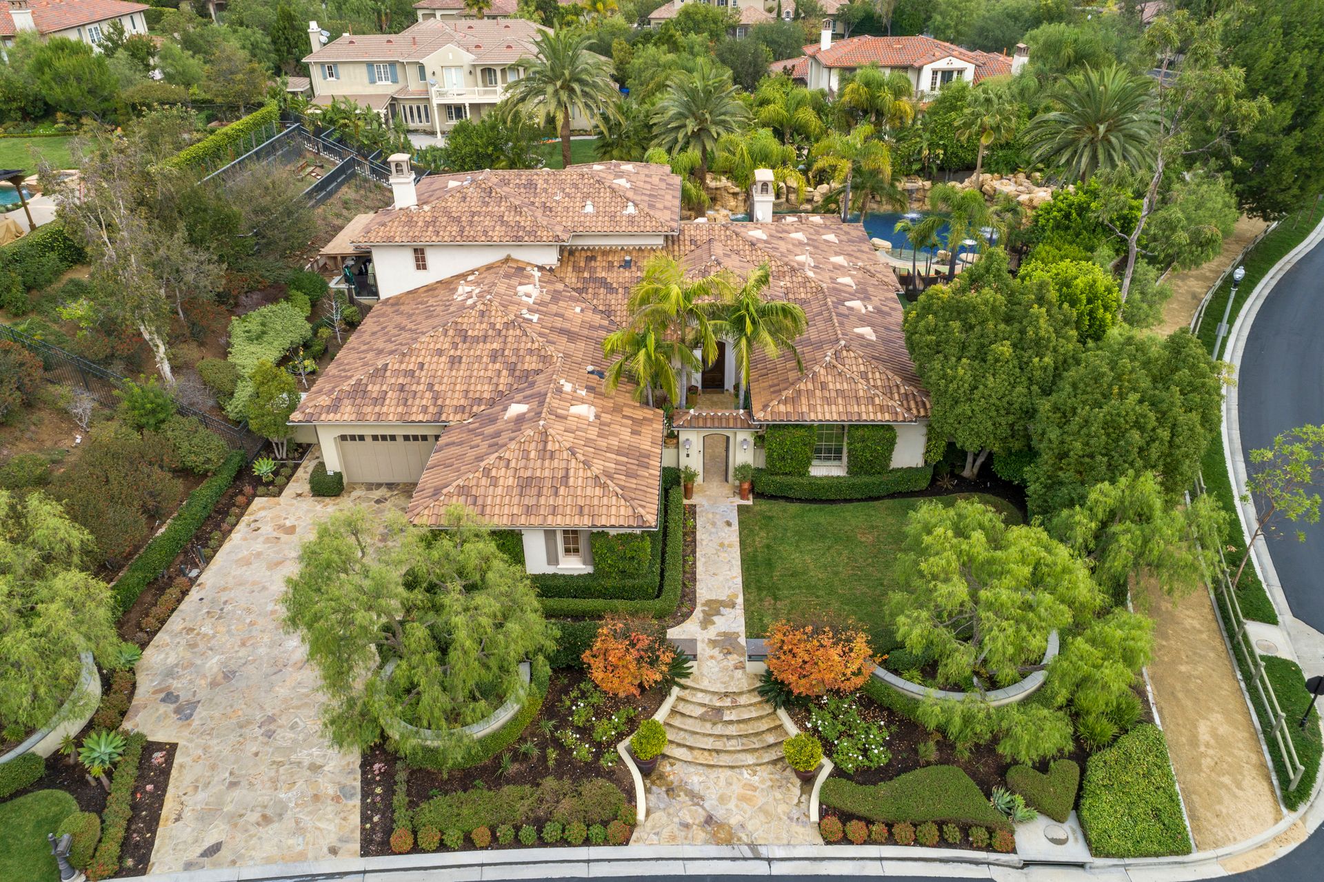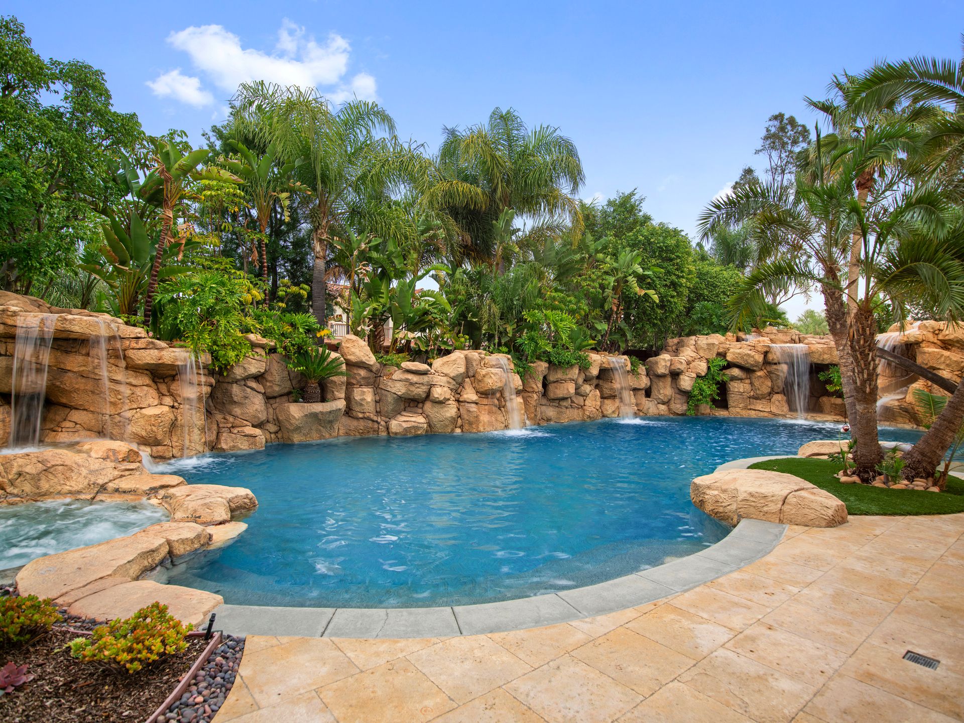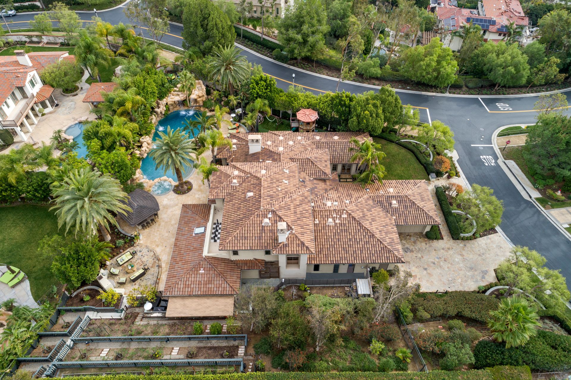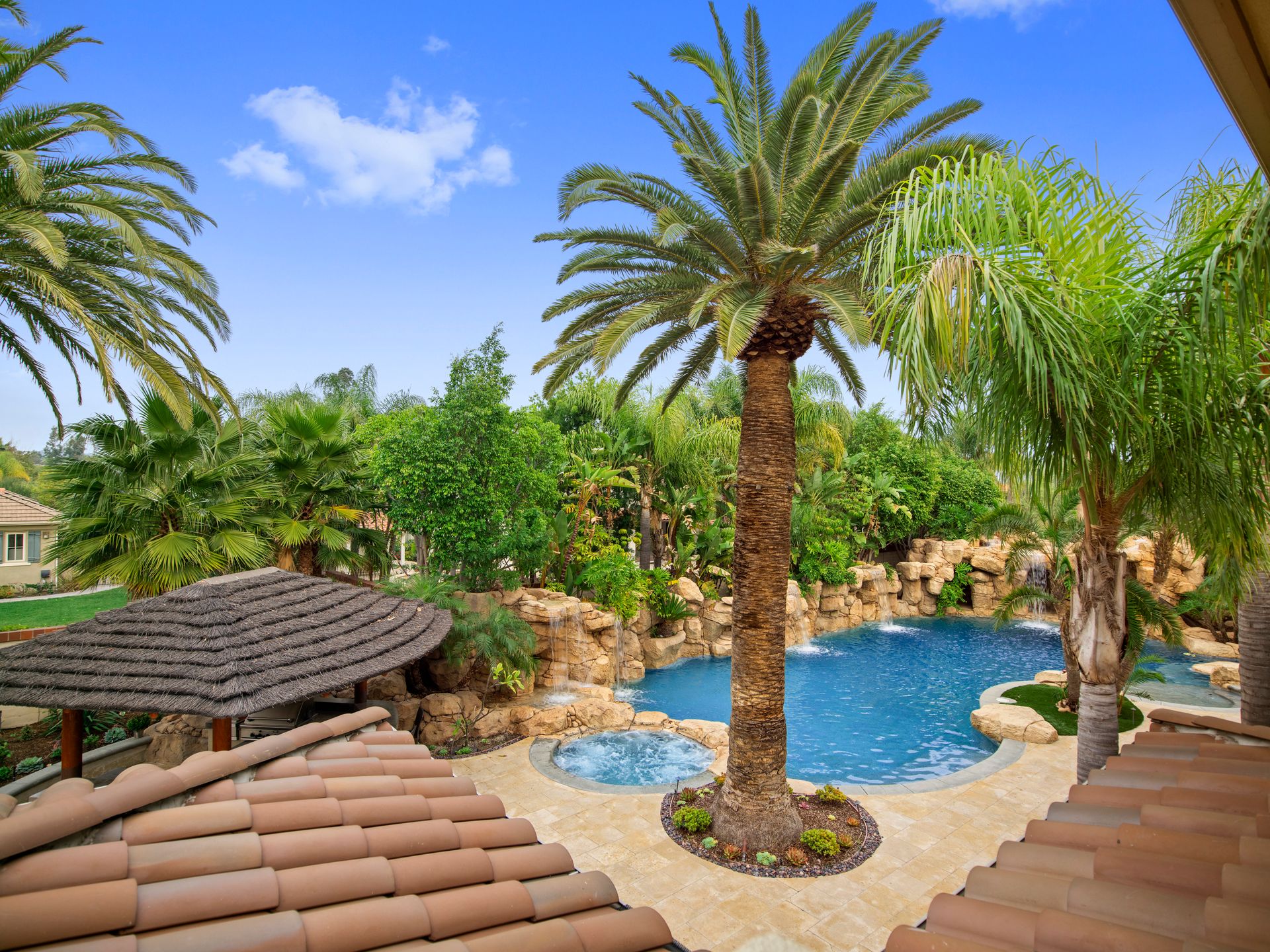 The crown jewel of Tustin Ranch Estates set atop an expansive 29,054 square foot corner lot, this slice of paradise exudes extravagance throughout! Rich in sophistication, this coastal contemporary sanctuary offers views of the spectacular backyard from every room. Chef-inspired kitchen & grand living space open to multiple entertaining areas, most notably an open-air lanai adorned w/Sapele wood ceilings & full custom bar offering unobstructed views through disappearing pocket glass doors that blend the home into its outdoor paradise of lush tropical gardens and cascading waterfalls. 4 bedrooms, including the master, are on the main level for a single-story feel, along w/ 4.5 baths, music room & office. 2nd-story great room offers panoramic views from adjacent viewing deck, plus 2 bedrooms and a full bath with a steam shower and dual towel warmers for the most discerning guests. Crafted as a seamless extension of the estate’s natural surroundings, every inch of outdoor space is complemented by lavish amenities, including mature Canary Island palms, private grotto, thatched-roof palapa bar, outdoor kitchen & fireplace, cavernous waterfalls, salt water pool & spa, 20-ft slide, sunning deck & charming child’s treehouse. This home’s desirable corner location and masterful resort-style craftsmanship make this a rare opportunity to purchase your own piece of paradise in the highly sought after, guard-gated community of Tustin Ranch Estates.
