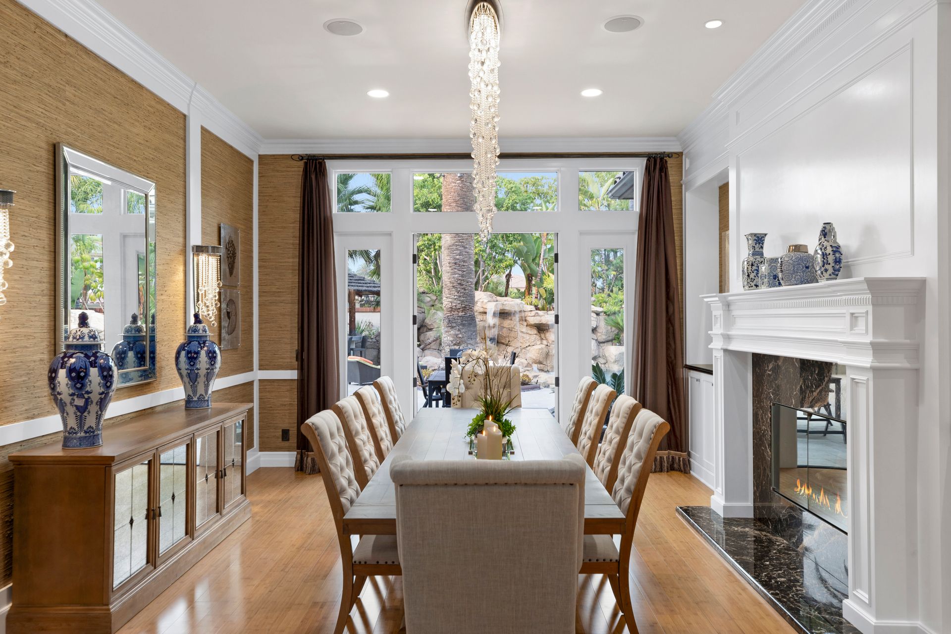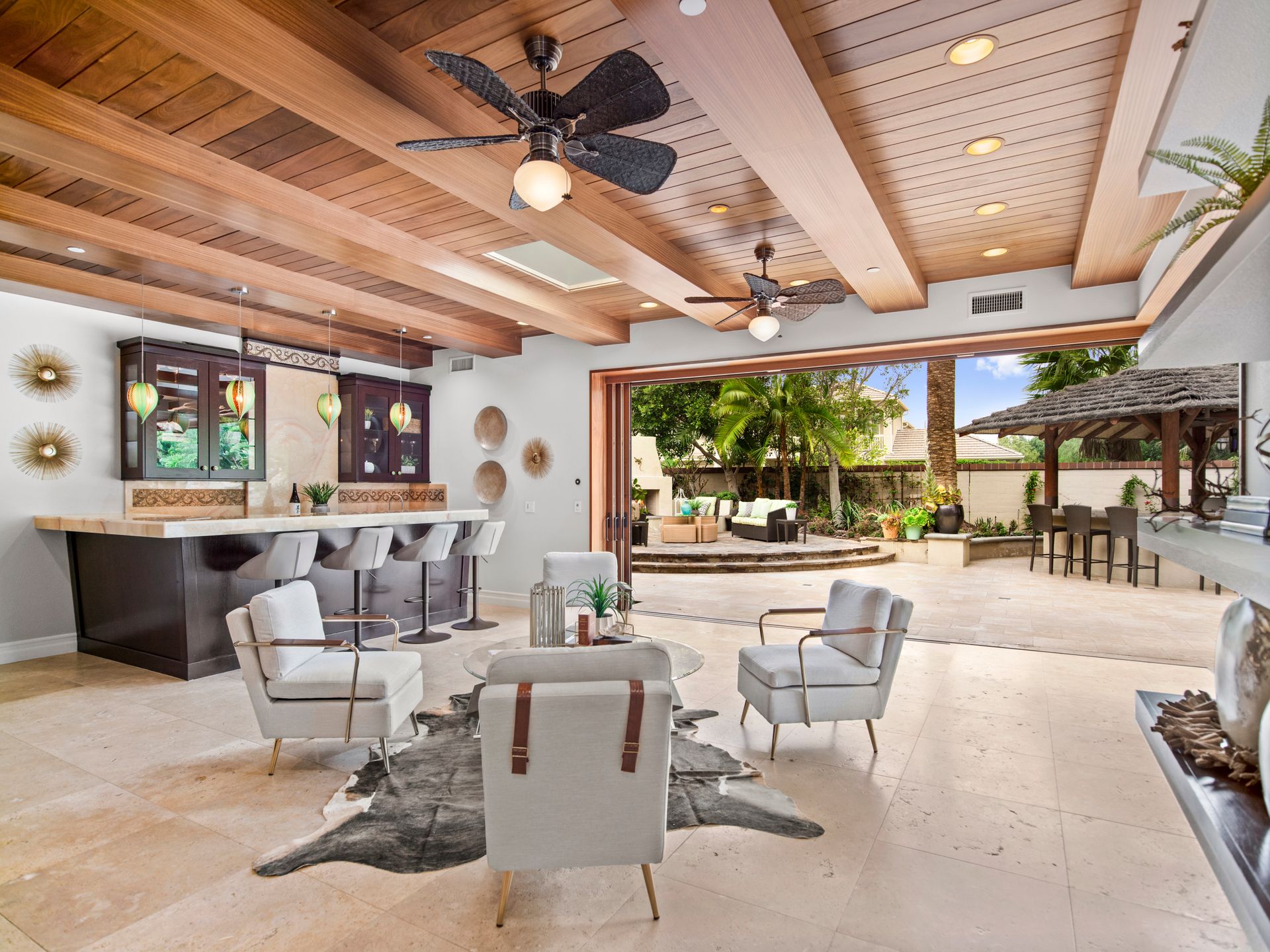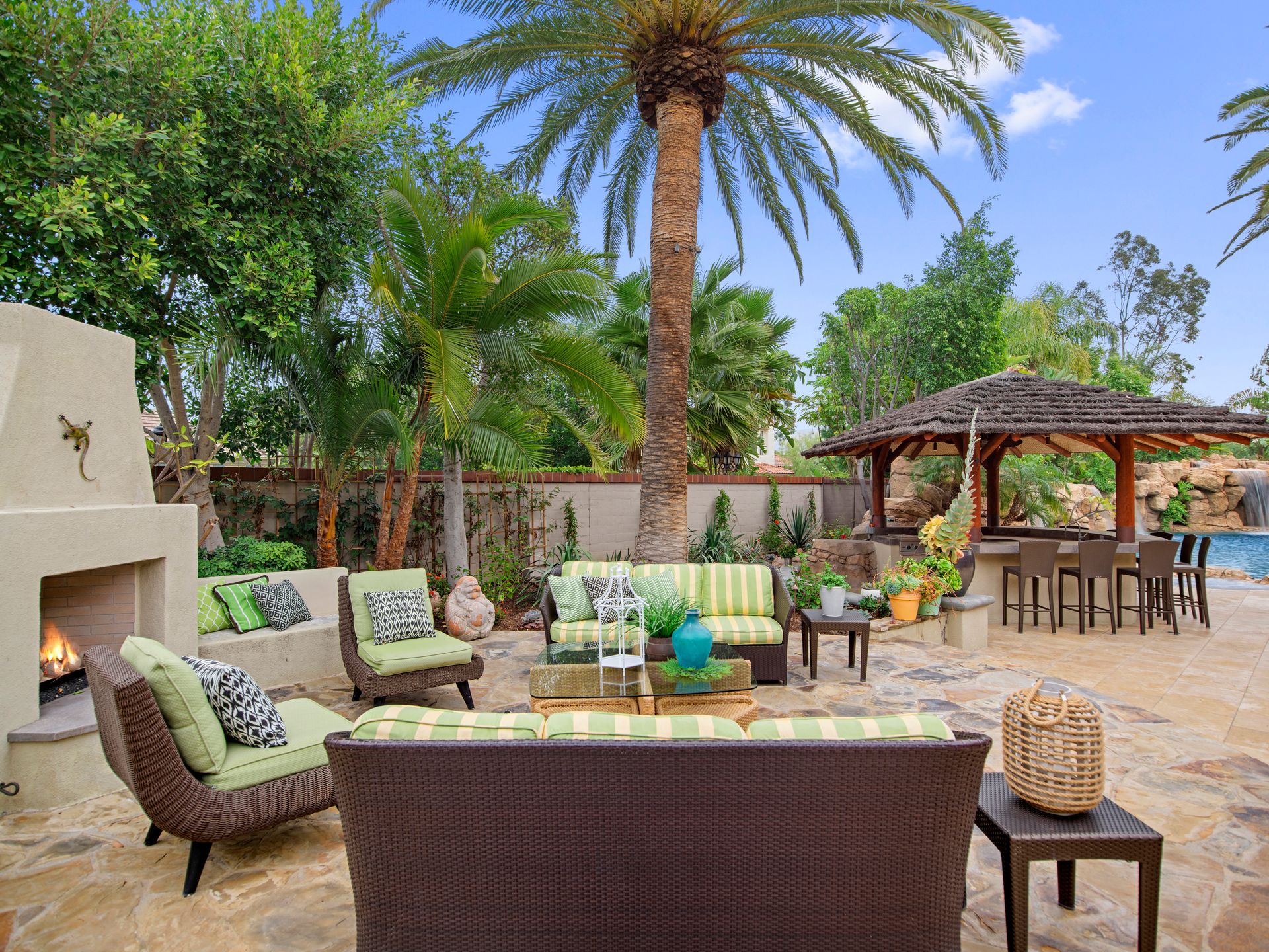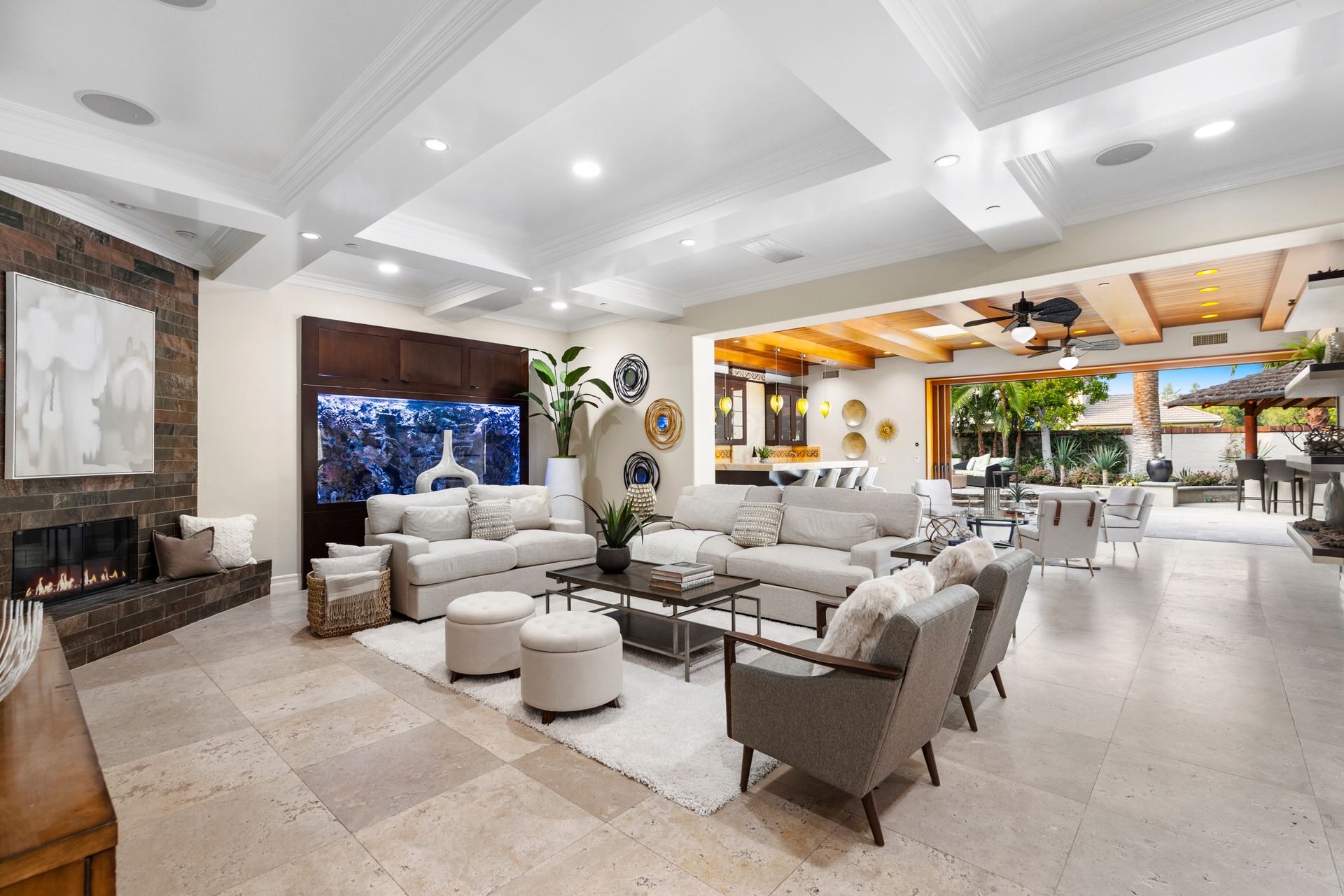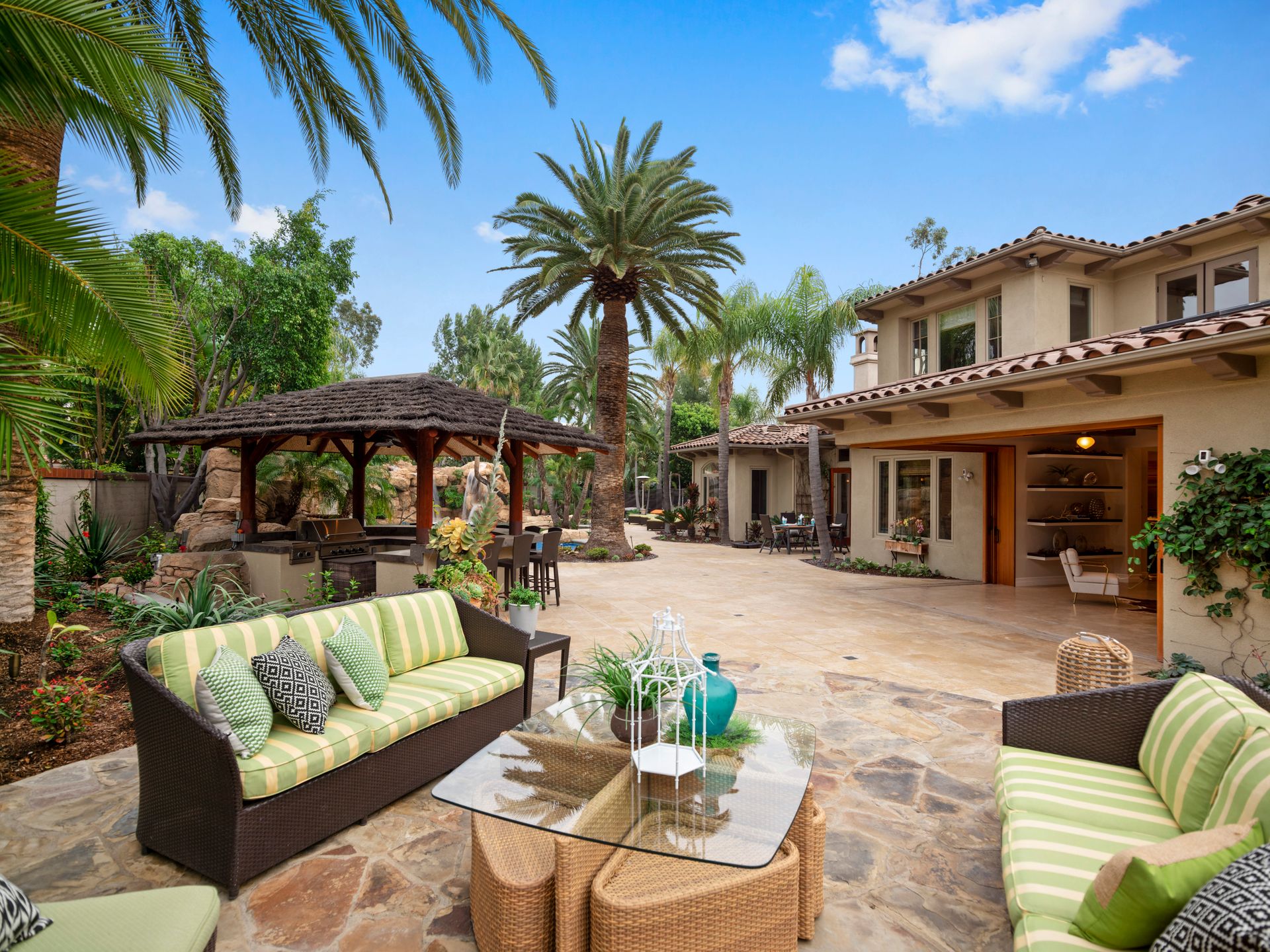 The crown jewel of Tustin Ranch Estates set atop an expansive 29,054 square foot corner lot, this slice of paradise exudes extravagance throughout! Rich in sophistication, this coastal contemporary sanctuary offers views of the spectacular backyard from every room. Chef-inspired kitchen & grand living space open to multiple entertaining areas, most notably an open-air lanai adorned w/Sapele wood ceilings & full custom bar offering unobstructed views through disappearing pocket glass doors that blend the home into its outdoor paradise of lush tropical gardens and cascading waterfalls. 4 bedrooms, including the master, are on the main level for a single-story feel, along w/ 4.5 baths, music room & office. 2nd-story great room offers panoramic views from adjacent viewing deck, plus 2 bedrooms and a full bath with a steam shower and dual towel warmers for the most discerning guests. Crafted as a seamless extension of the estate’s natural surroundings, every inch of outdoor space is complemented by lavish amenities, including mature Canary Island palms, private grotto, thatched-roof palapa bar, outdoor kitchen & fireplace, cavernous waterfalls, salt water pool & spa, 20-ft slide, sunning deck & charming child’s treehouse. This home’s desirable corner location and masterful resort-style craftsmanship make this a rare opportunity to purchase your own piece of paradise in the highly sought after, guard-gated community of Tustin Ranch Estates.